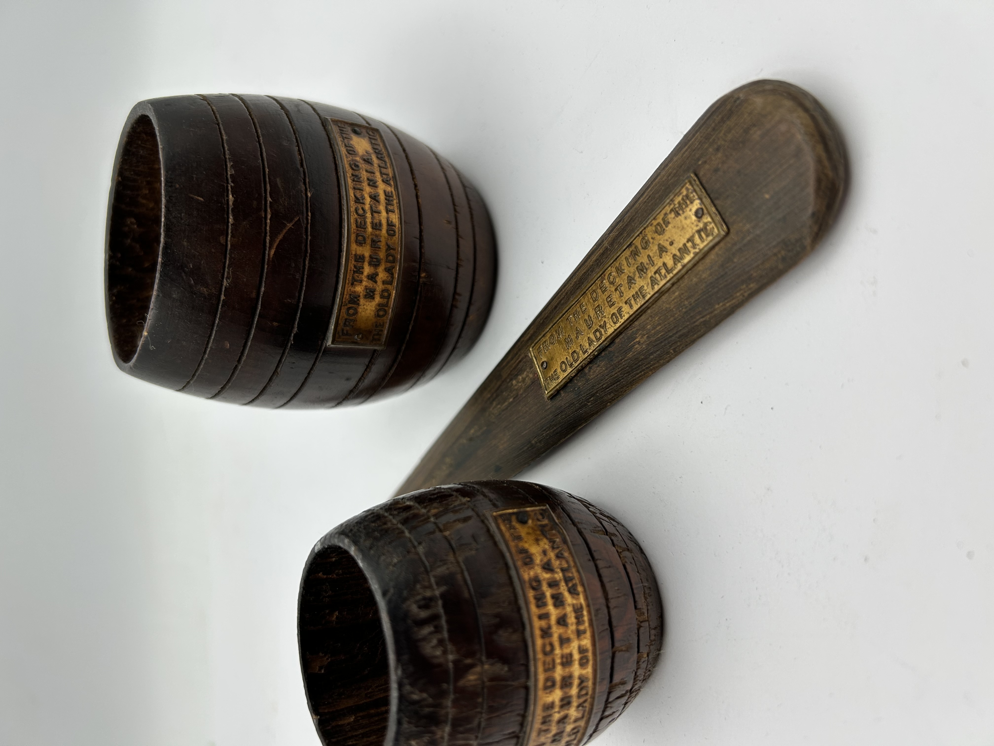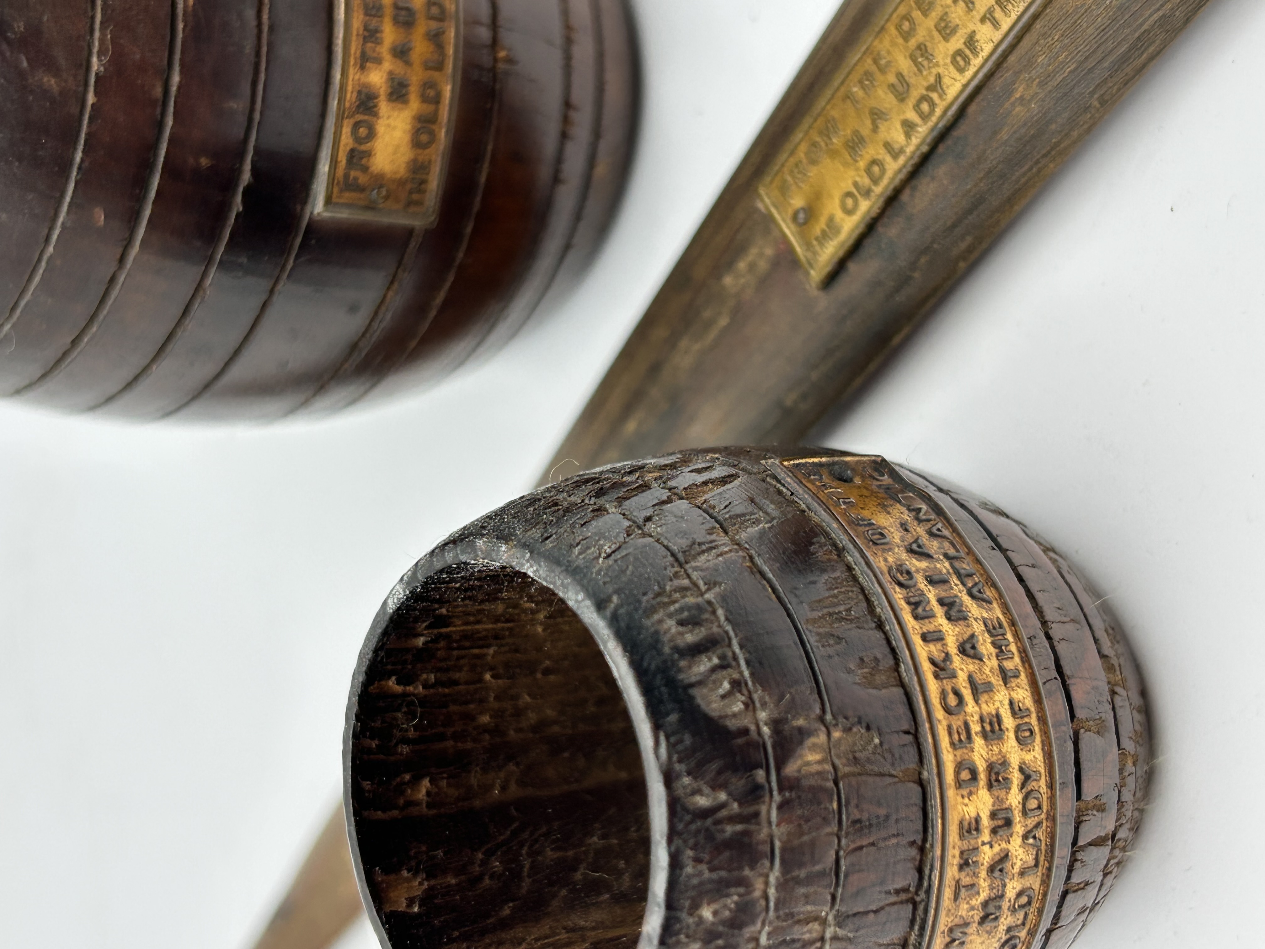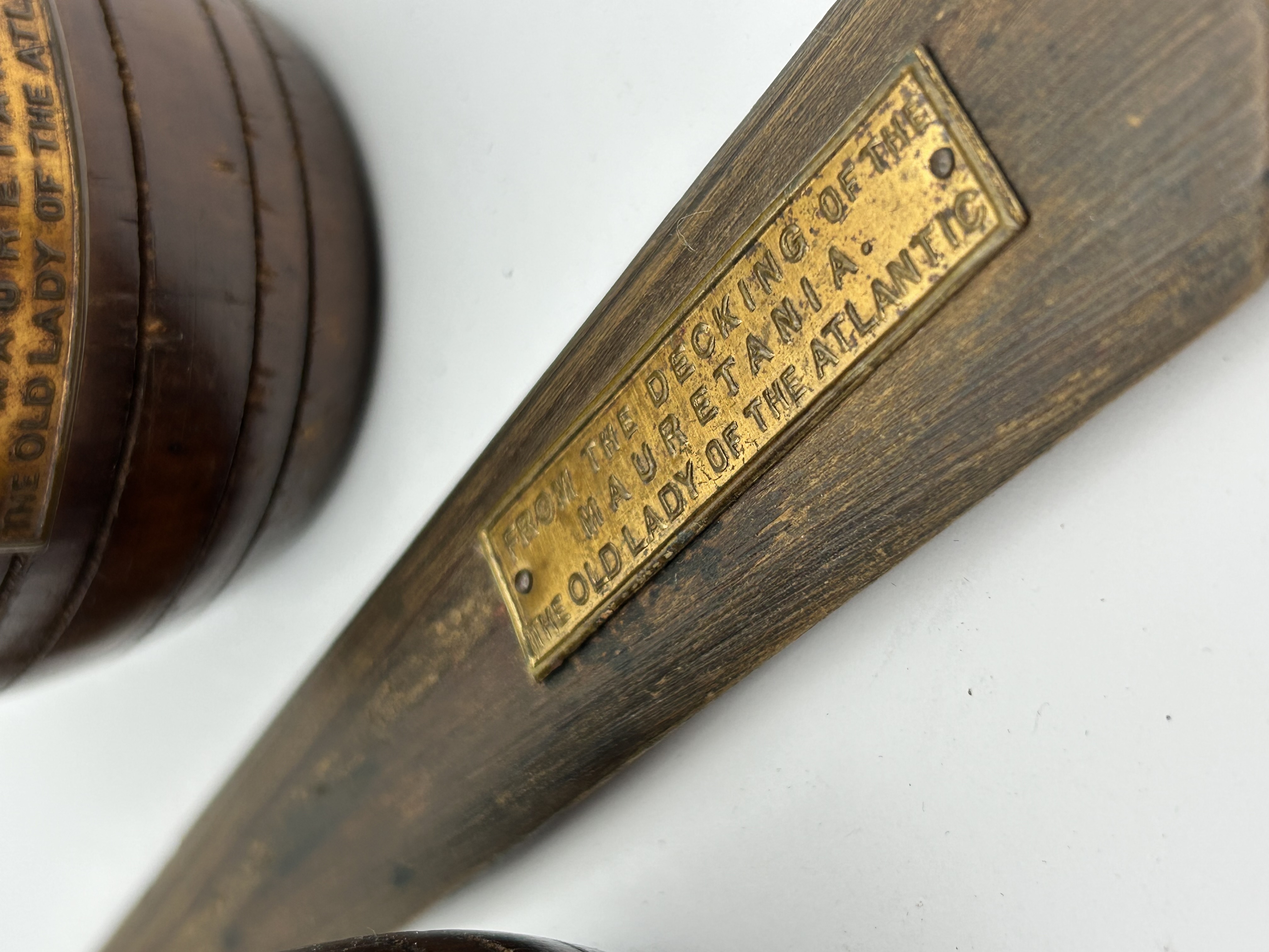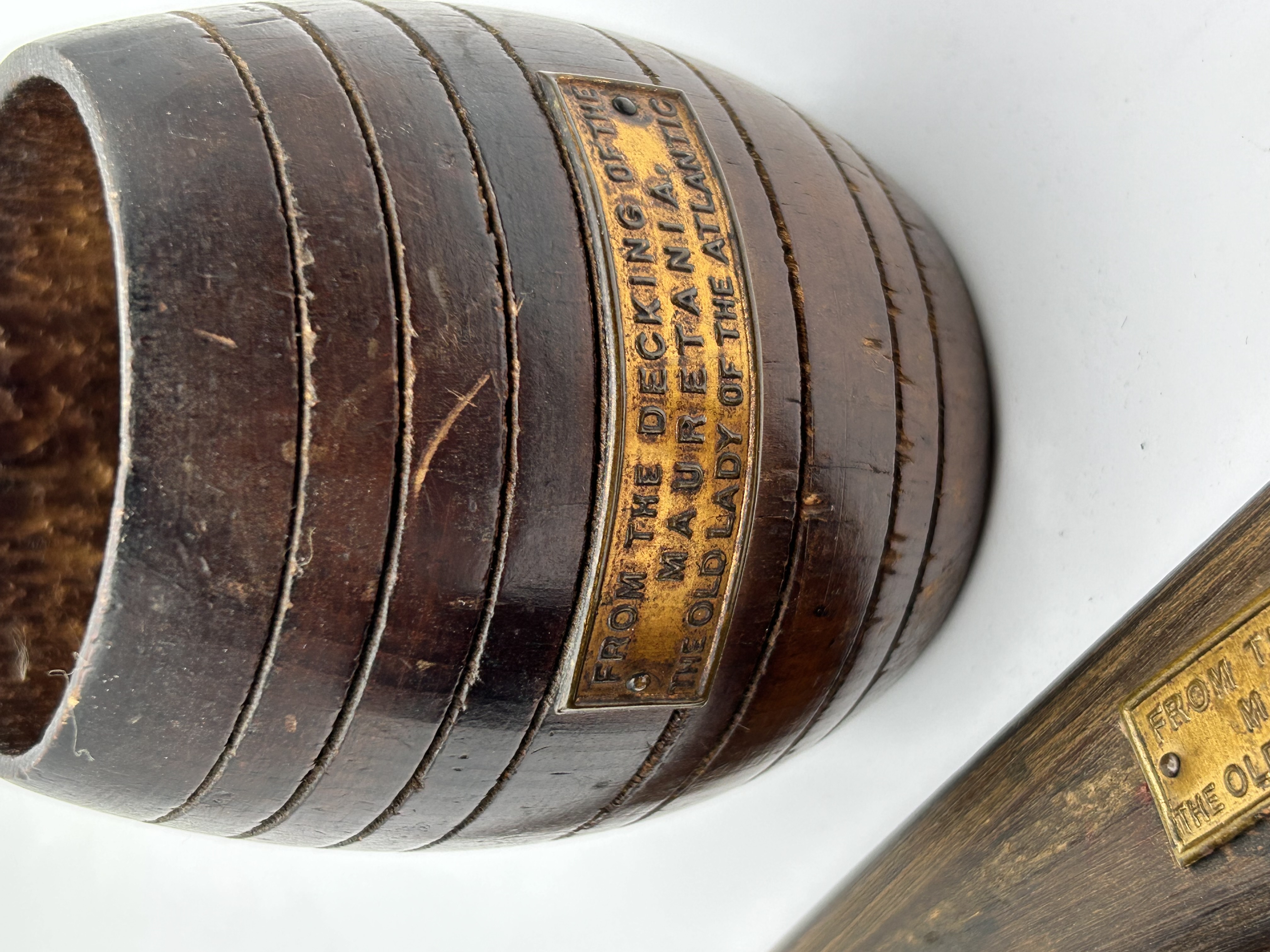 This collection consists of three items manufactured from reclaimed wood salvaged from the ocean liner RMS Mauretania. The group includes two barrel-shaped vessels and a tapered letter opener. Each item features an affixed brass plaque embossed with the inscription: FROM THE DECKING OF THE MAURETANIA – THE OLD LADY OF THE ATLANTIC. The wooden components are finished in a dark stain and exhibit turned details, with the barrels featuring horizontal ribbing to simulate staves. The brass plaques are secured with small metal pins and show a natural aged patina.