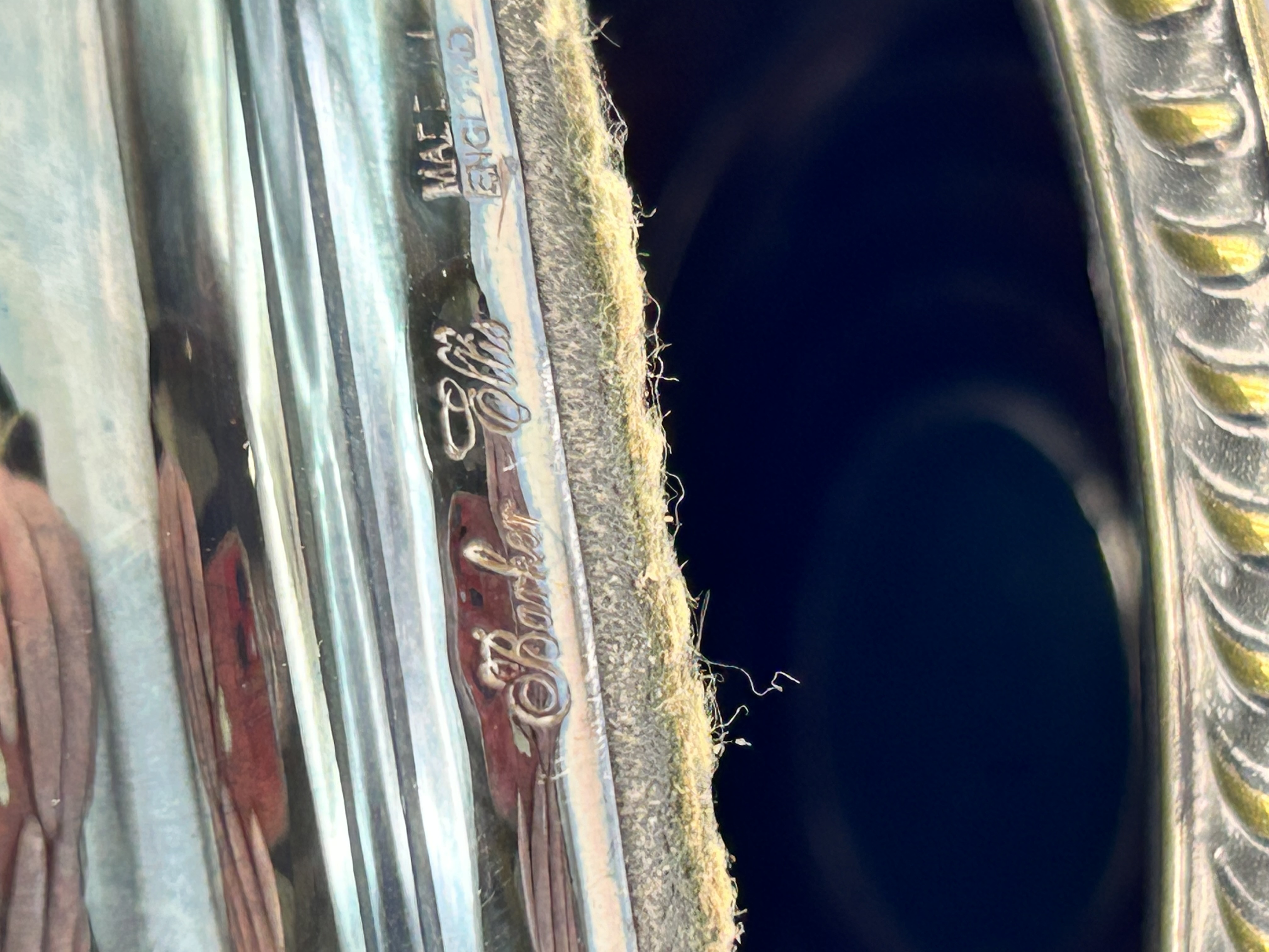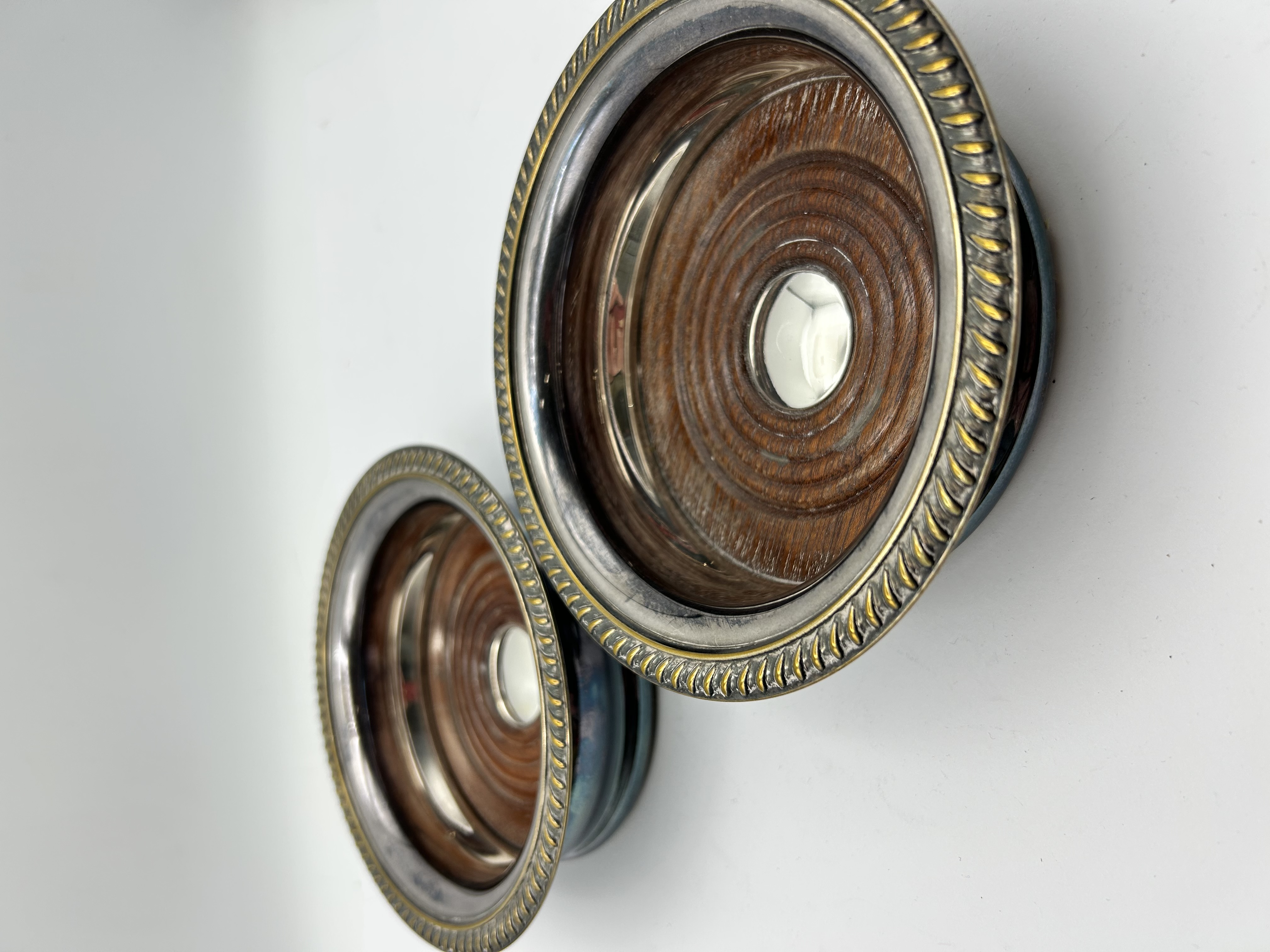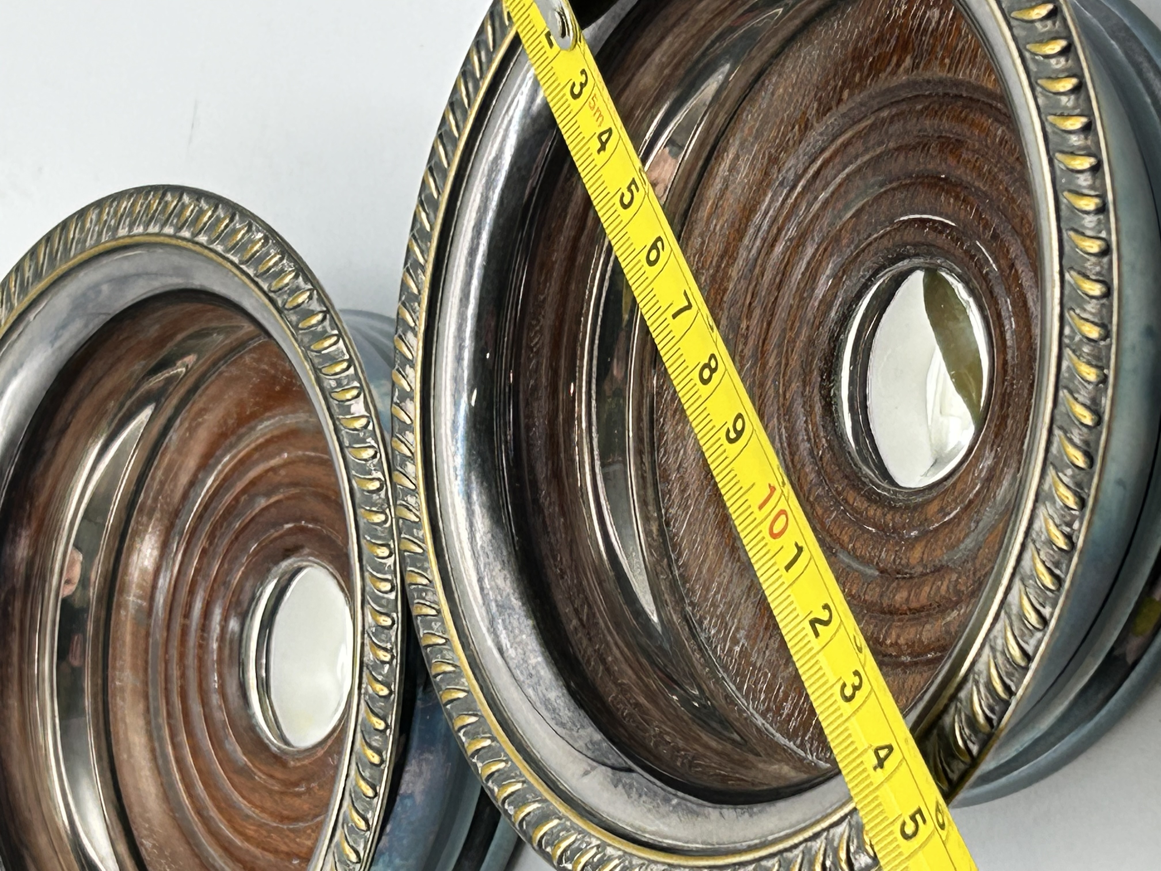 A pair of silver plated wine bottle coasters manufactured by Barker Ellis in Birmingham, England. Each coaster features a turned wood base with concentric ring detailing and a central circular metal boss. The wood is enclosed by a silver plated rim decorated with a gadrooned border. The metal rims are stamped with the maker mark Barker Ellis and MADE IN ENGLAND along with additional hallmarks.