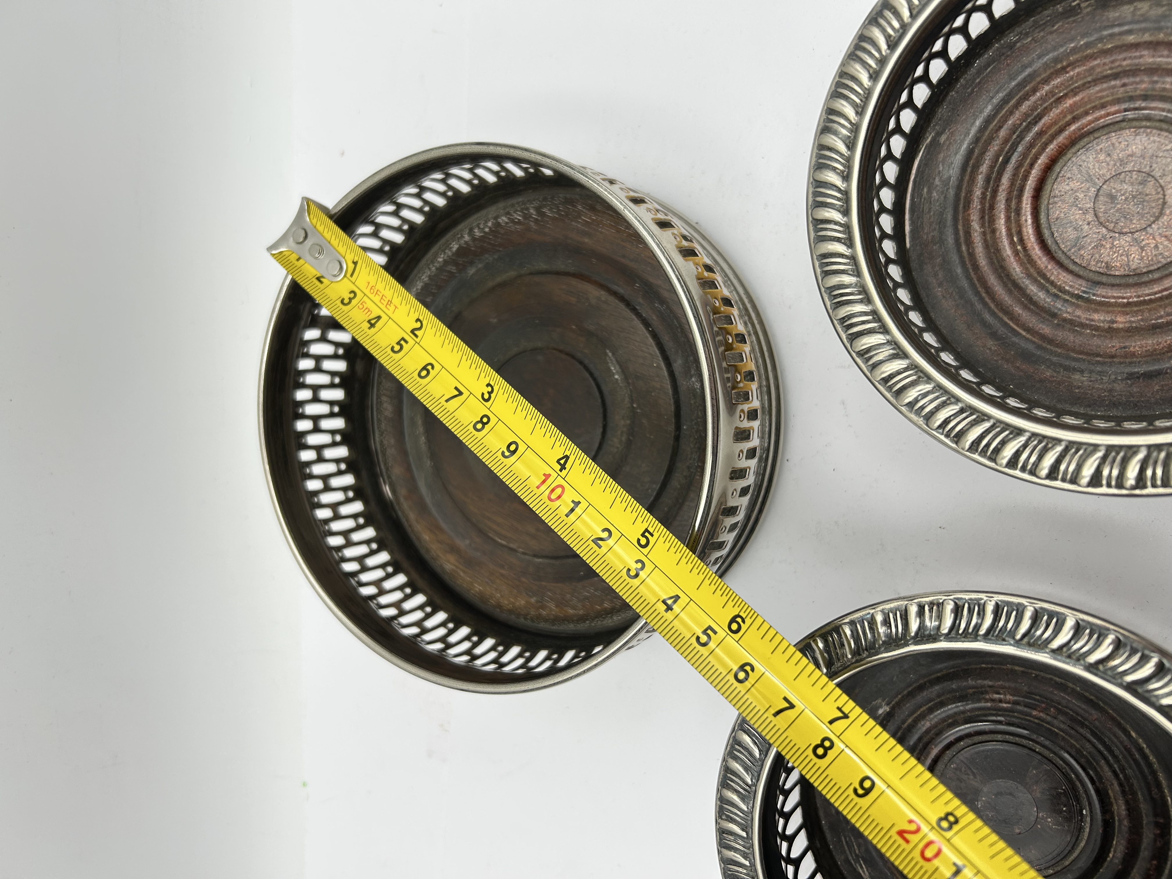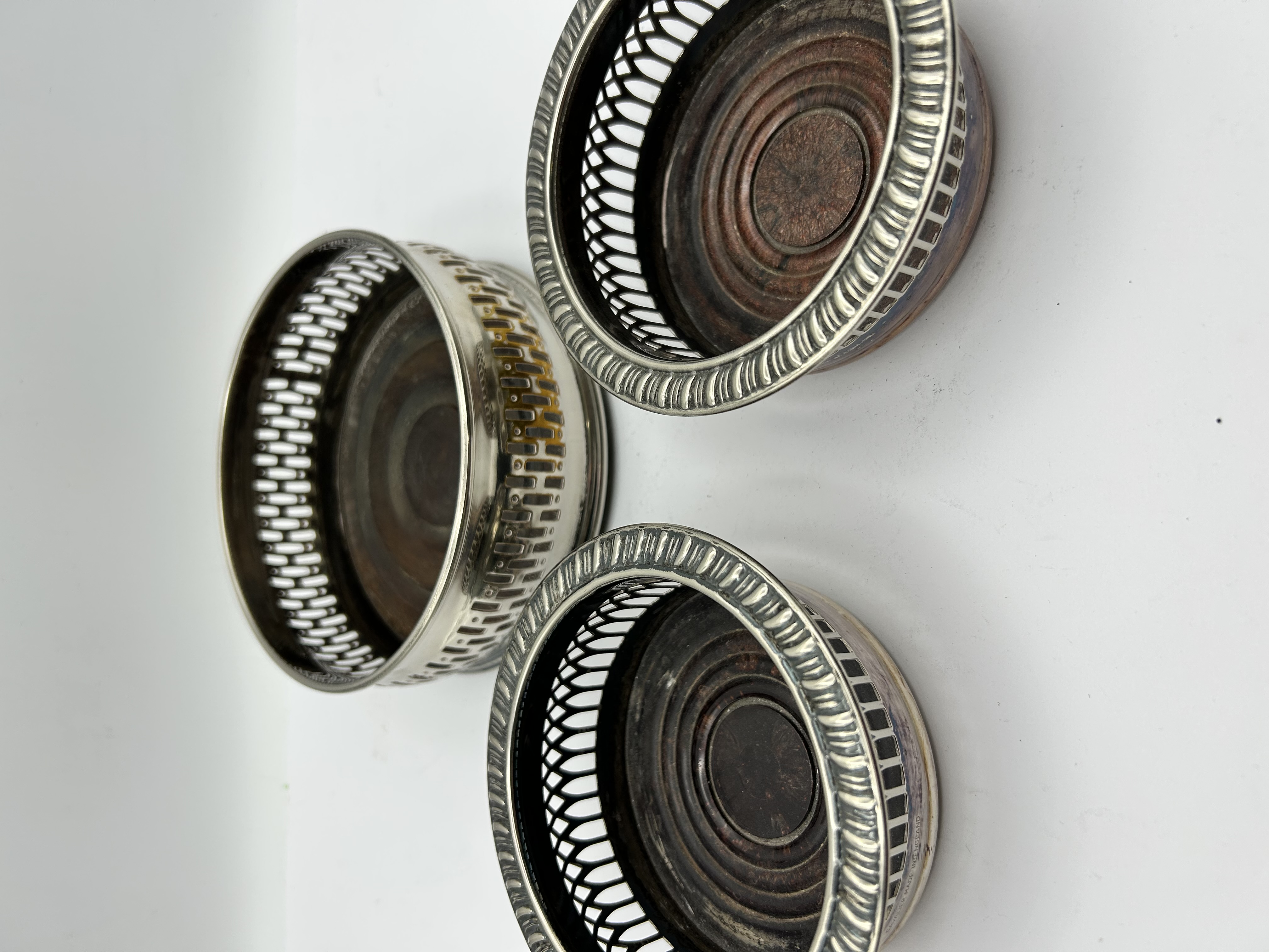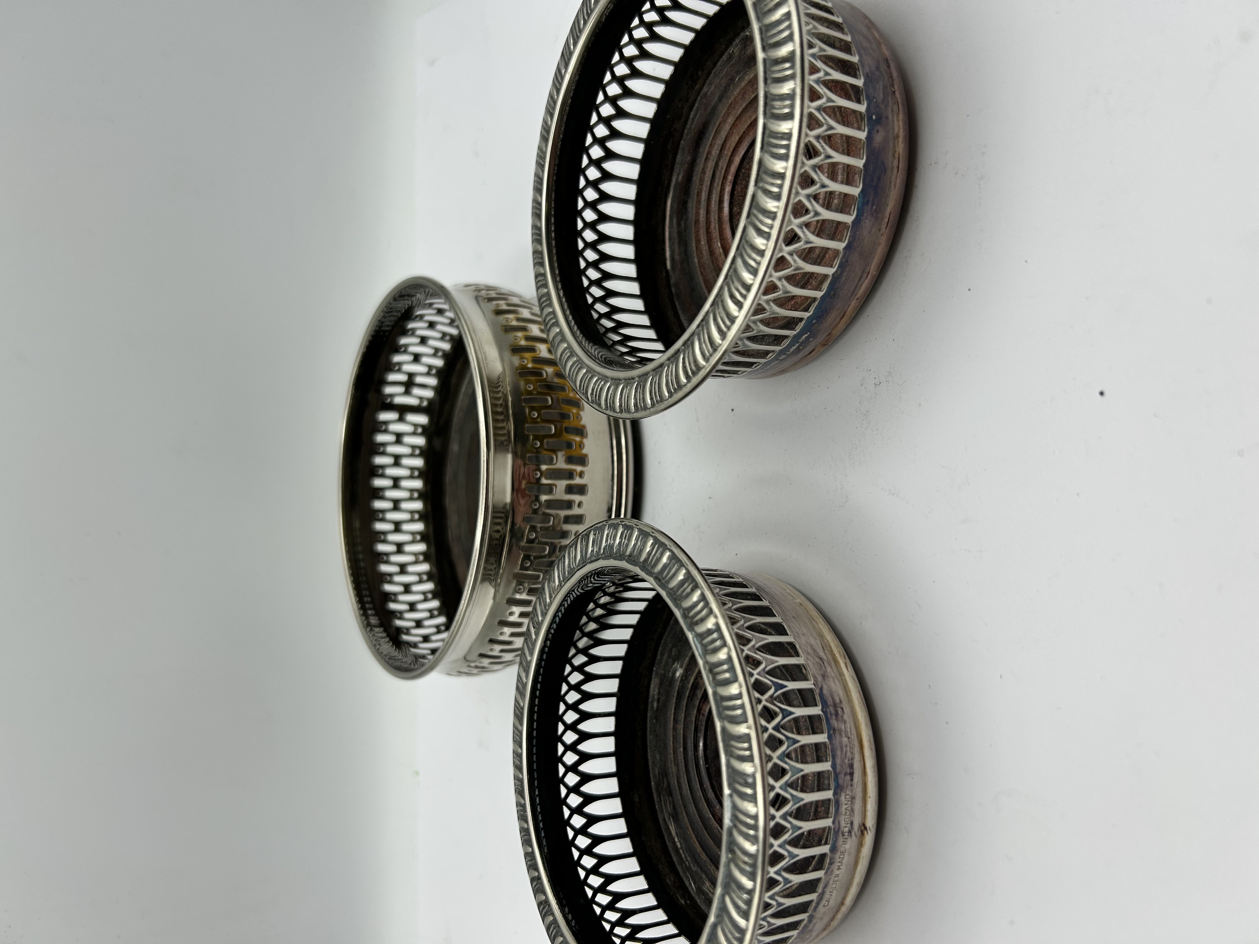 A trio of silver plated wine coasters, including a matching pair and a single coordinating example. One item is stamped CAVALIER MADE IN ENGLAND along the lower exterior edge. The matching pair features gadrooned rims above lattice-style pierced galleries. The third coaster exhibits a gallery with a rectangular pierced pattern. All three coasters are constructed with turned wooden bases featuring concentric circular detailing.