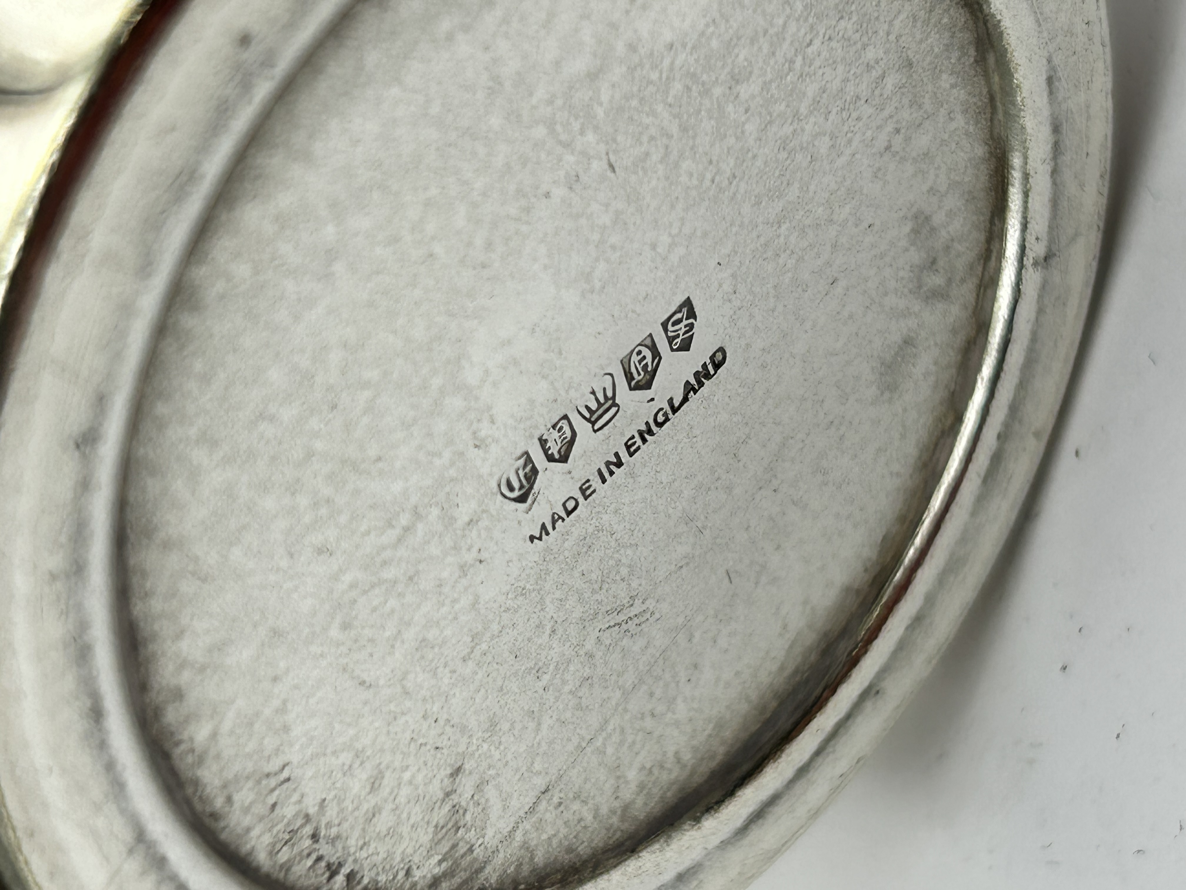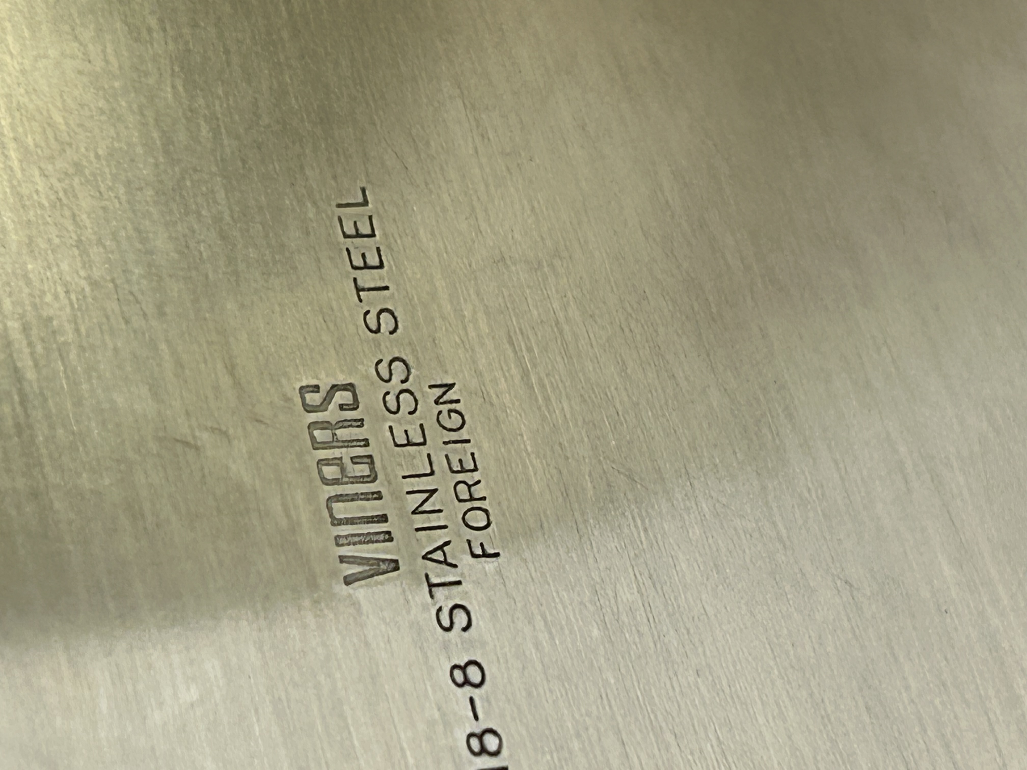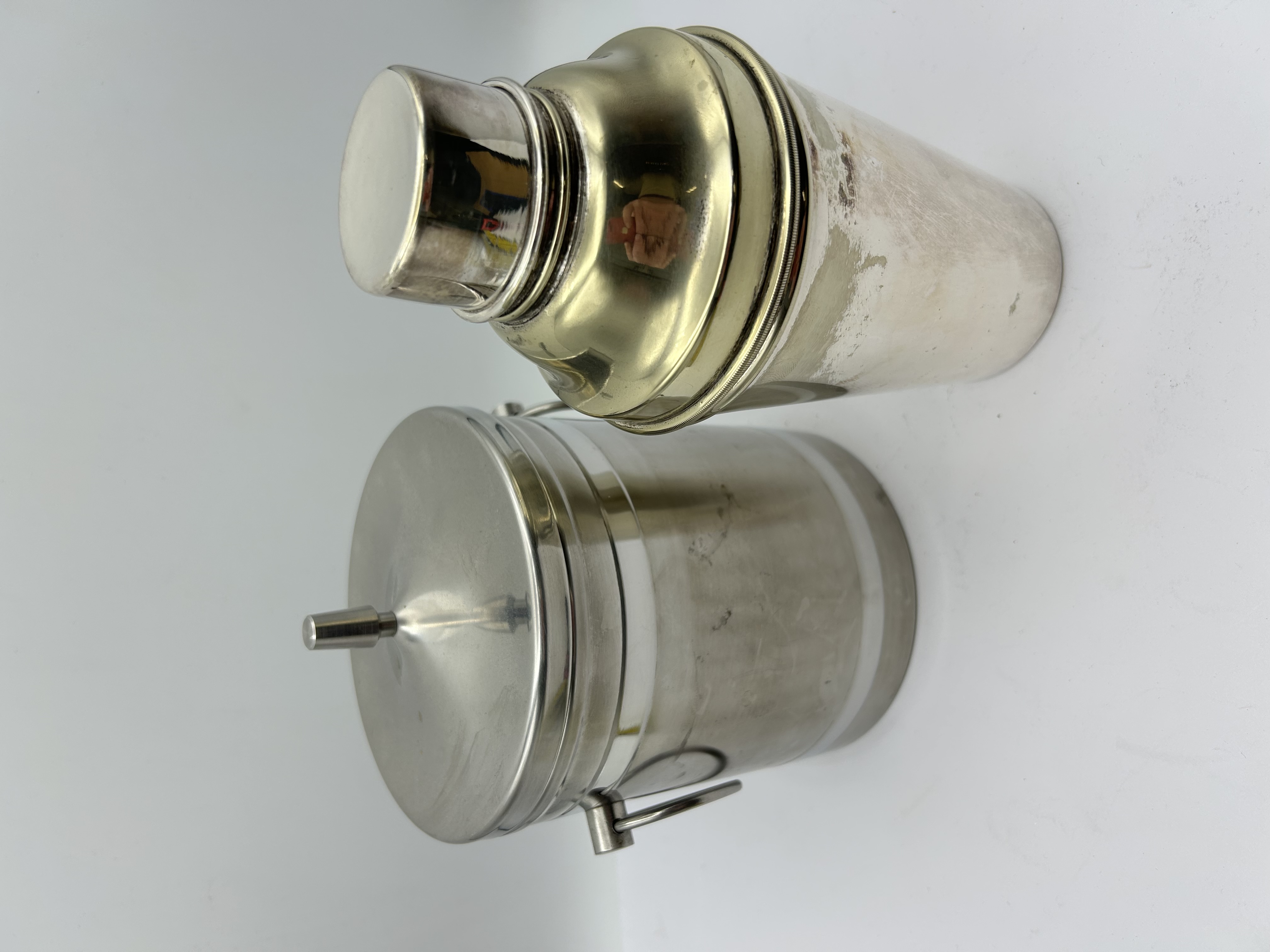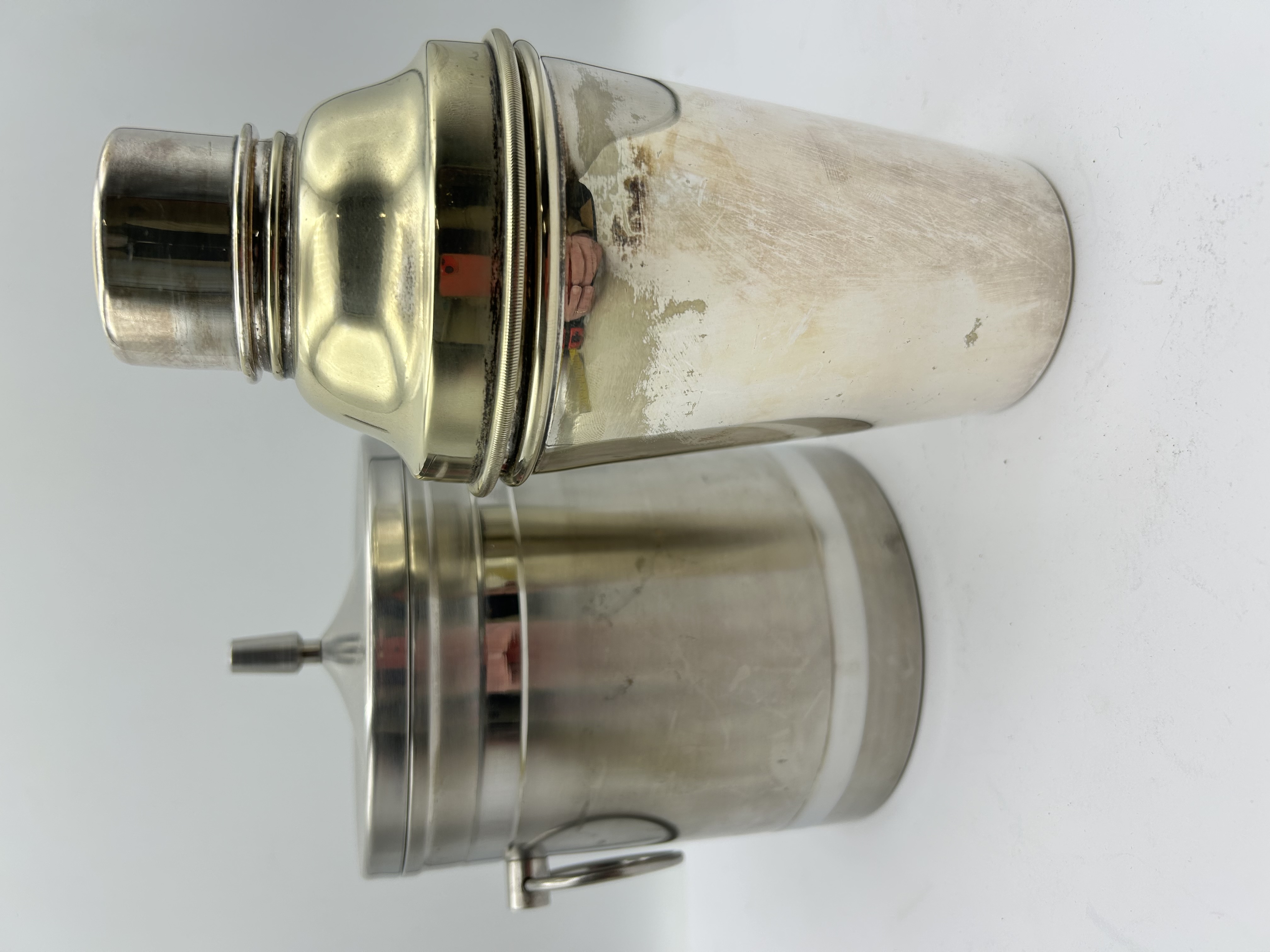 A collection of two vintage metal barware items. The first is a three-piece silver-plated cocktail shaker of traditional tapered form. The underside is stamped with the mark MADE IN ENGLAND alongside a series of pseudo-hallmarks. The second item is a cylindrical ice bucket constructed from stainless steel with a brushed finish. It features a fitted lid topped with a center peg-style knob and a wire swing handle. The base of the ice bucket is marked VINERS 18-8 STAINLESS STEEL FOREIGN. Both pieces date to the mid-20th century.