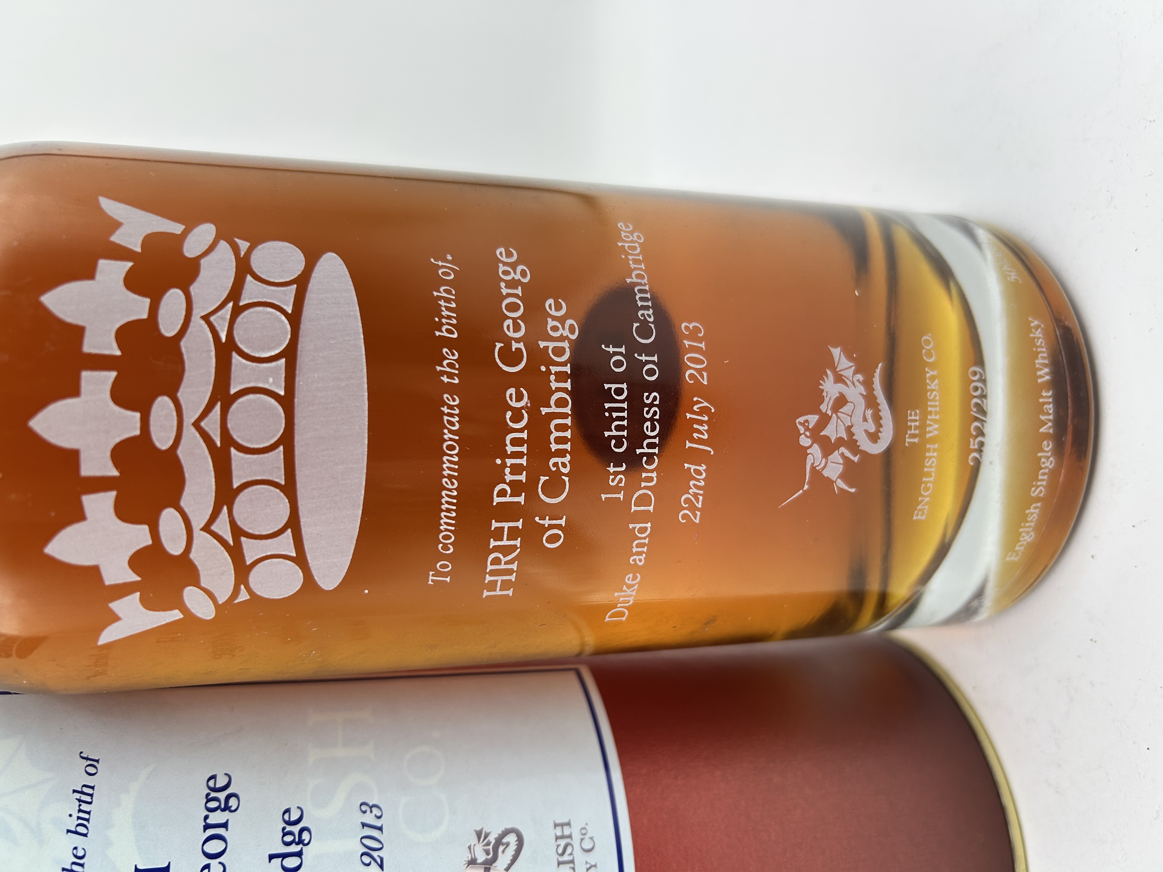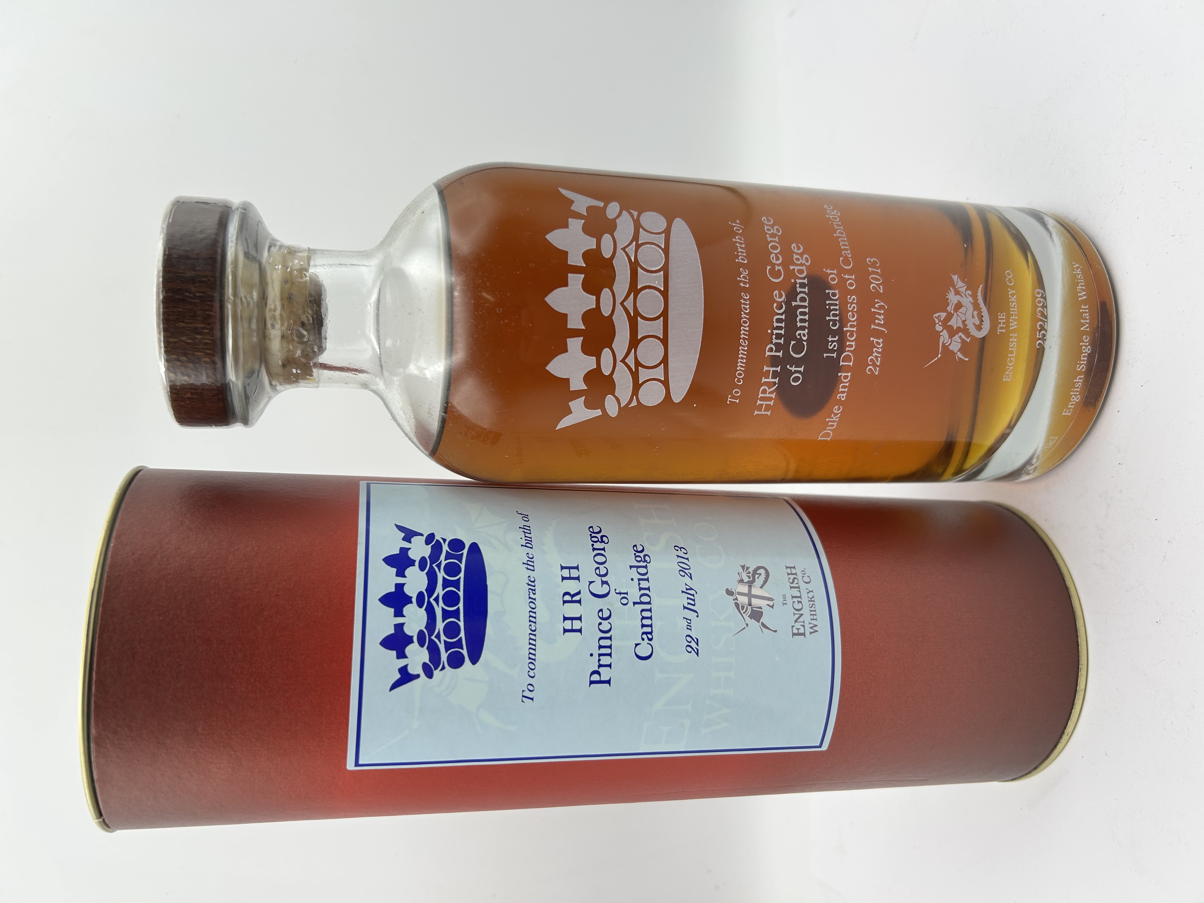 A 50cl bottle of English Single Malt Whisky produced by The English Whisky Co. to commemorate the birth of HRH Prince George of Cambridge on July 22, 2013. This limited edition release is identified as bottle number 252 of 299. The clear glass bottle features white etched or printed text and graphics, including a crown and the St. George and the Dragon emblem. The text reads: To commemorate the birth of HRH Prince George of Cambridge 1st child of Duke and Duchess of Cambridge 22nd July 2013. The bottle is sealed with a wood-topped cork and is accompanied by its original red cylindrical presentation tube with a light blue commemorative label.
