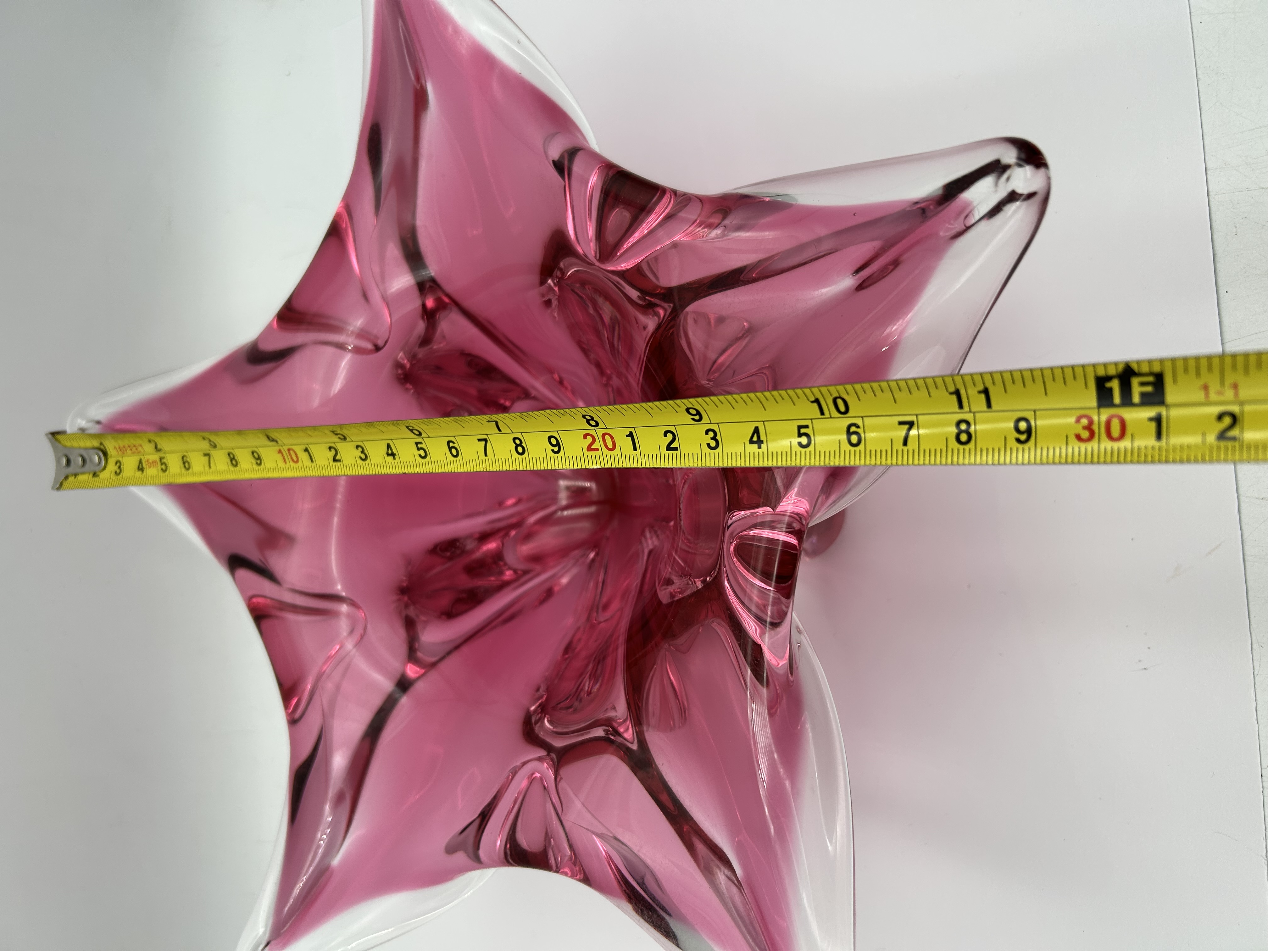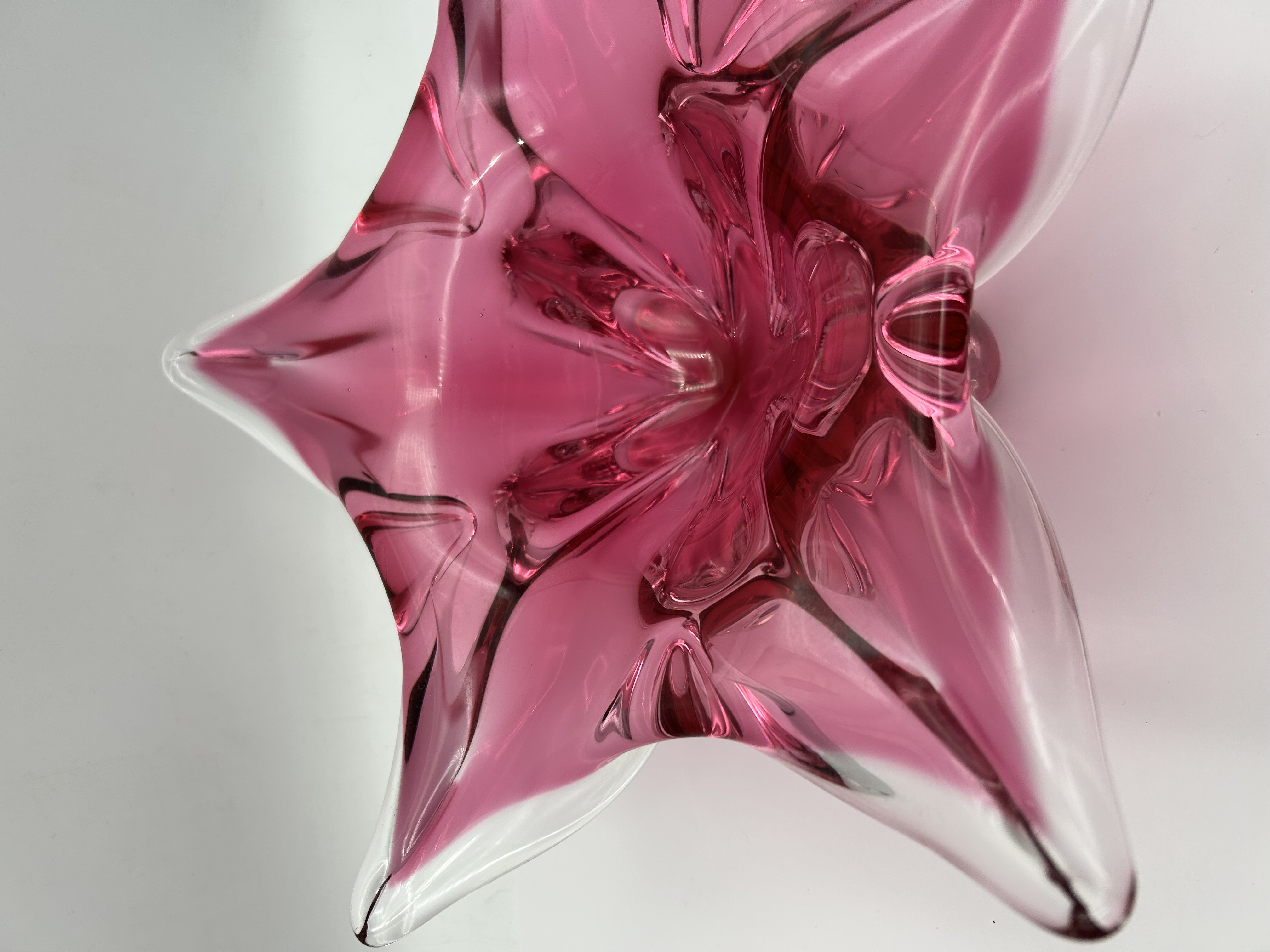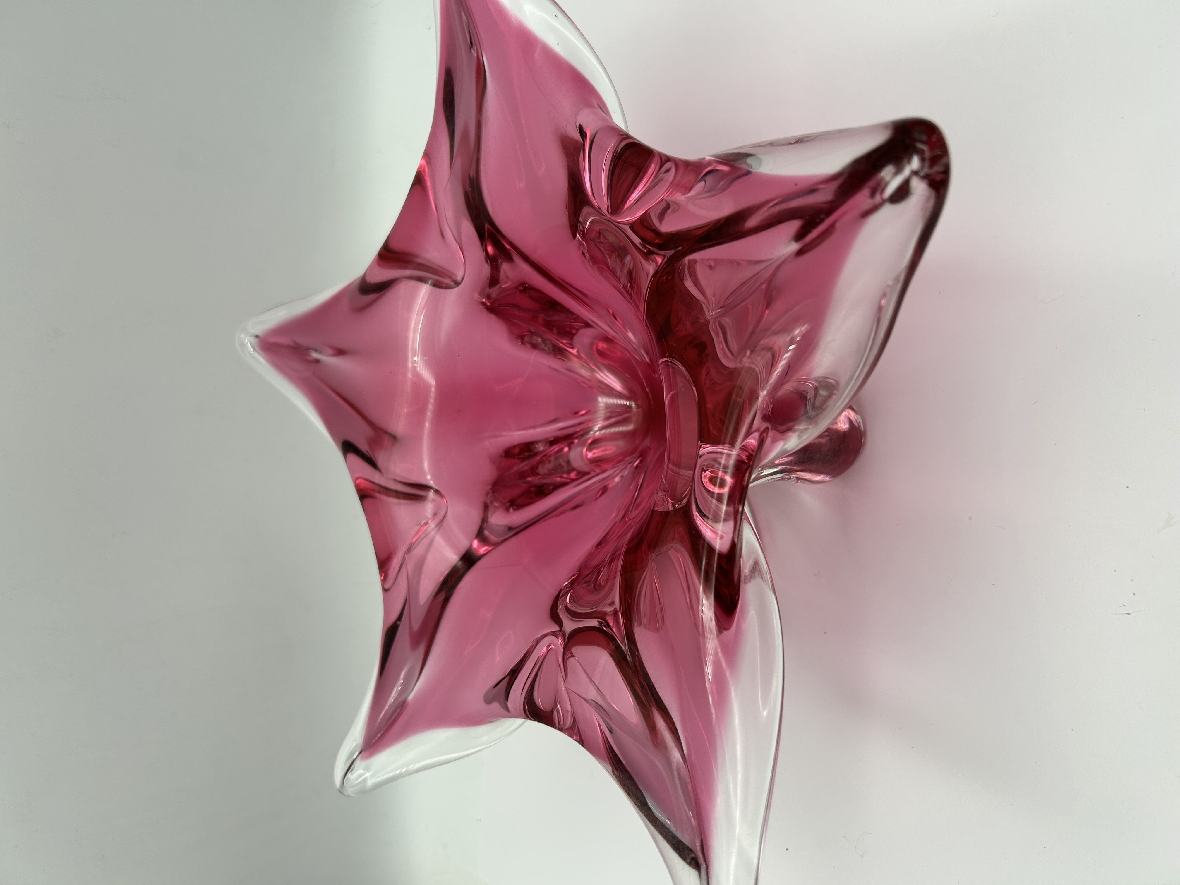 This mid-century modern art glass bowl is attributed to Josef Hospodka for Chribska Glassworks, Czechoslovakia. The piece is constructed using a cased glass technique, featuring a vibrant cranberry or deep pink interior encased within a thick, clear glass exterior. The form is a dynamic, multi-pointed star or flower with an organic, pulled aesthetic characteristic of mid-20th-century Bohemian glass production. No manufacturer markings or signatures are visible.