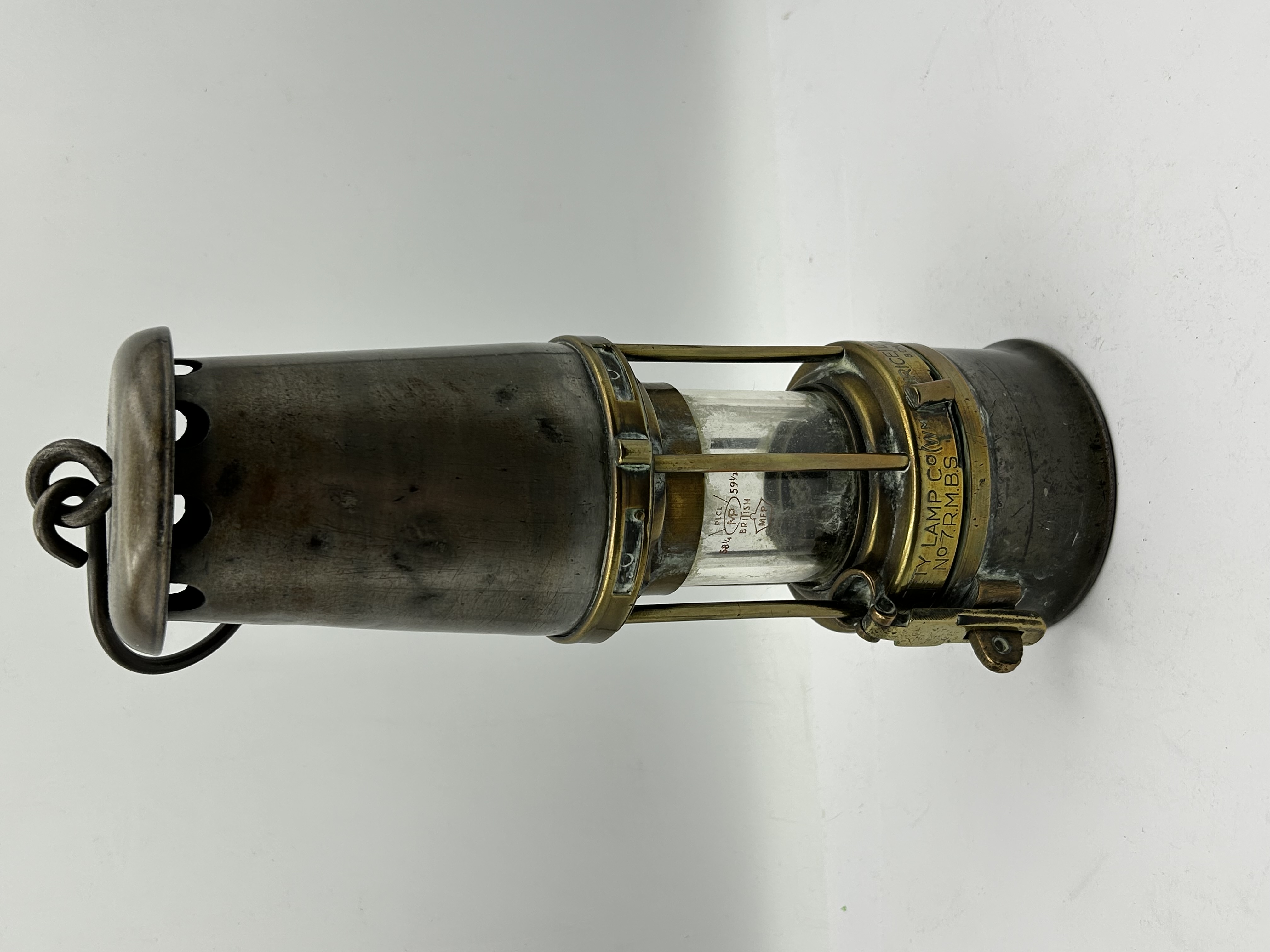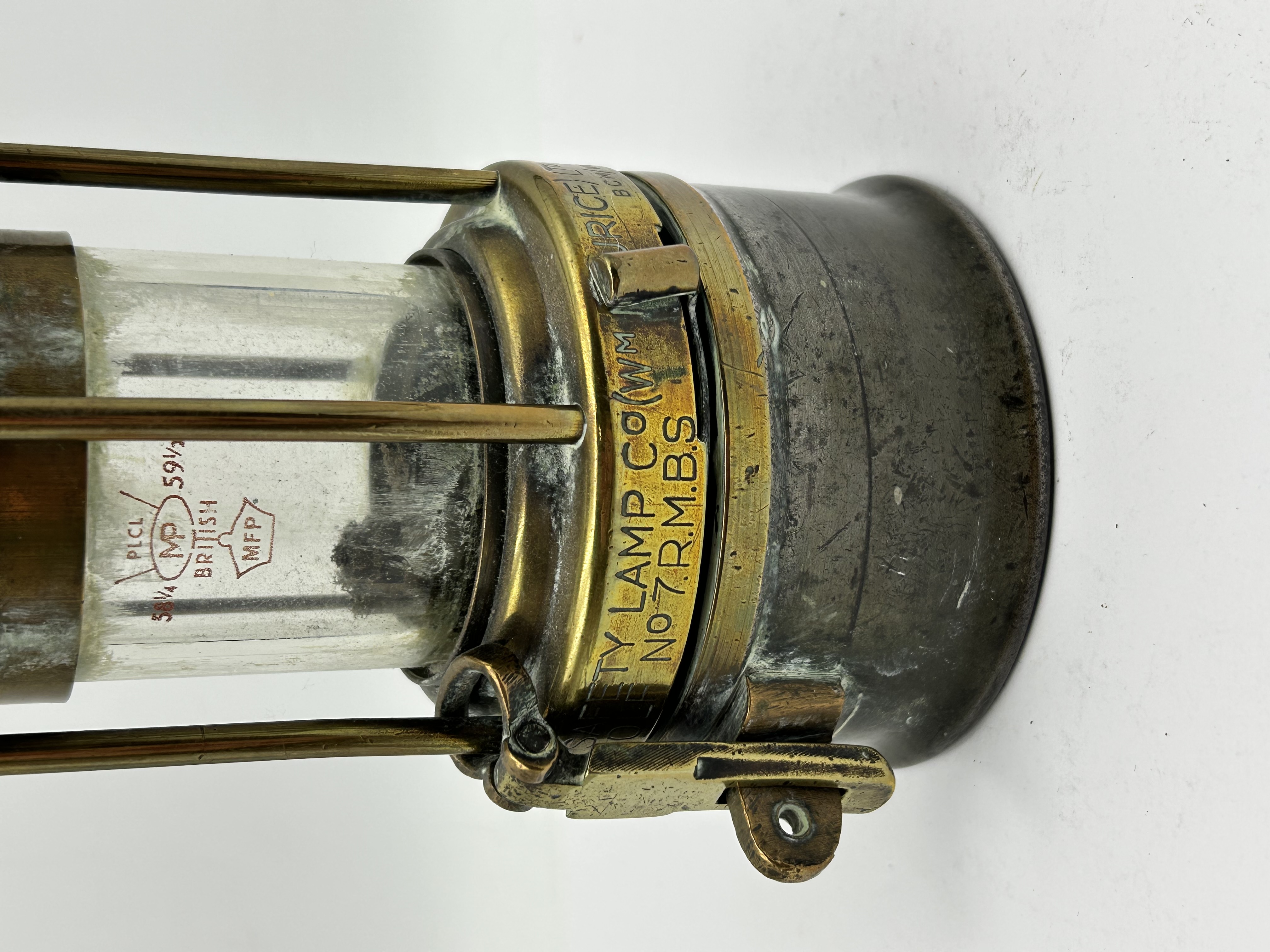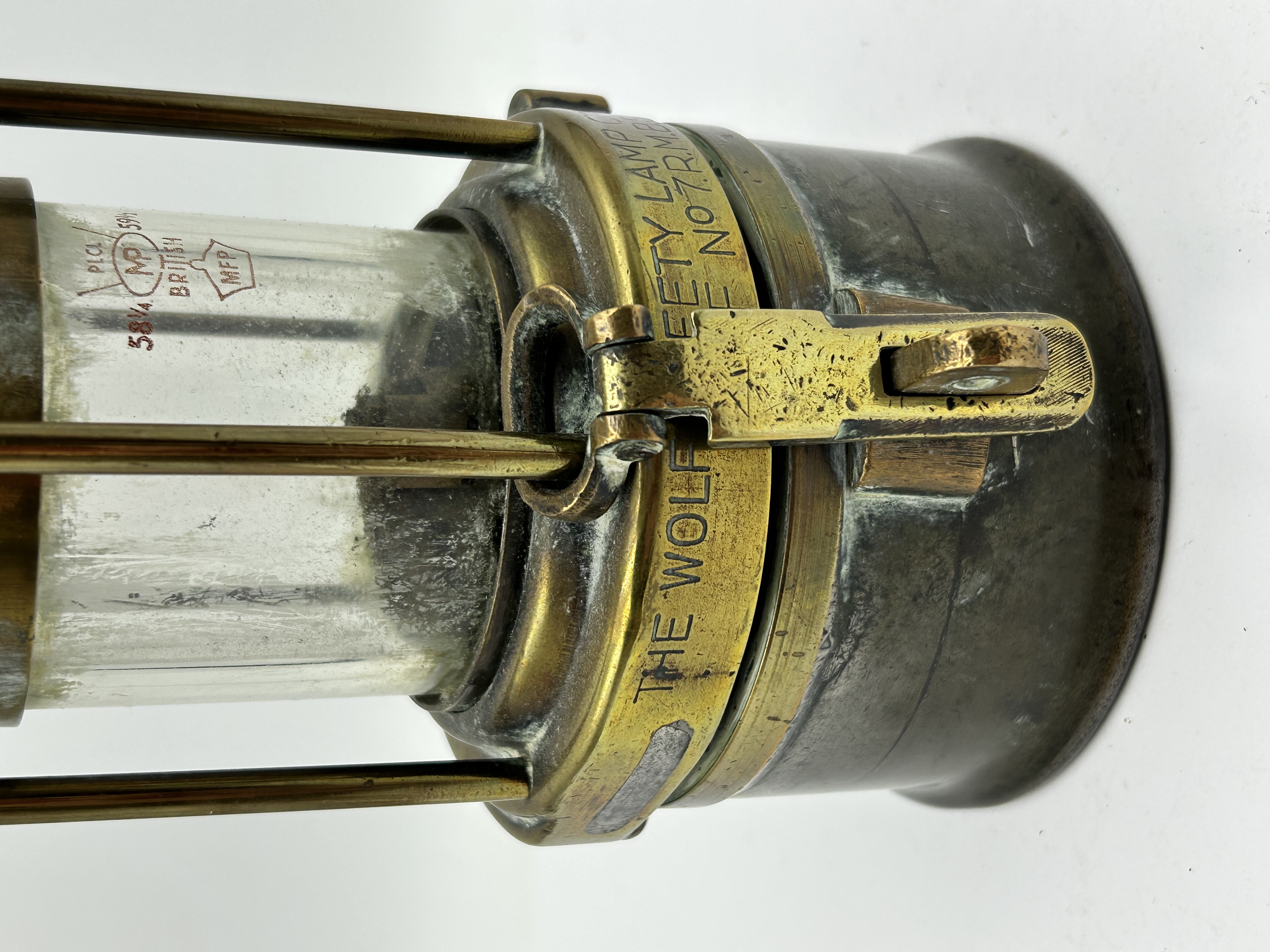 A brass and steel miners safety lamp produced by The Wolf Safety Lamp Co. (Wm. Maurice) Ltd. in Sheffield. The lamp is constructed with a central glass chimney secured by a brass cage and a steel upper bonnet. The brass collar is stamped with the manufacturer name and model No. 7 R.M.B.S. The glass chimney features etched markings including the word British and MFP within a hexagonal border, alongside numerical stamps 58 1/4 and 59 1/2. The lamp is topped with a metal suspension ring and hook.