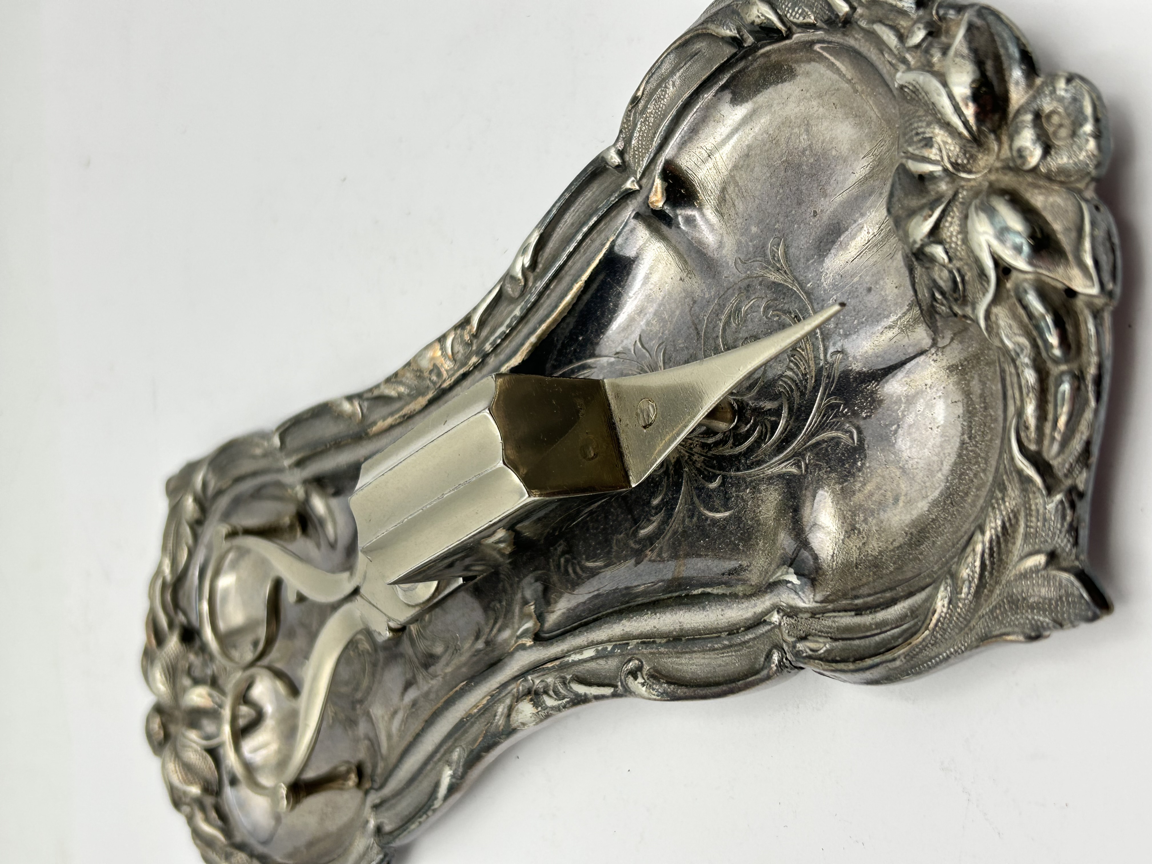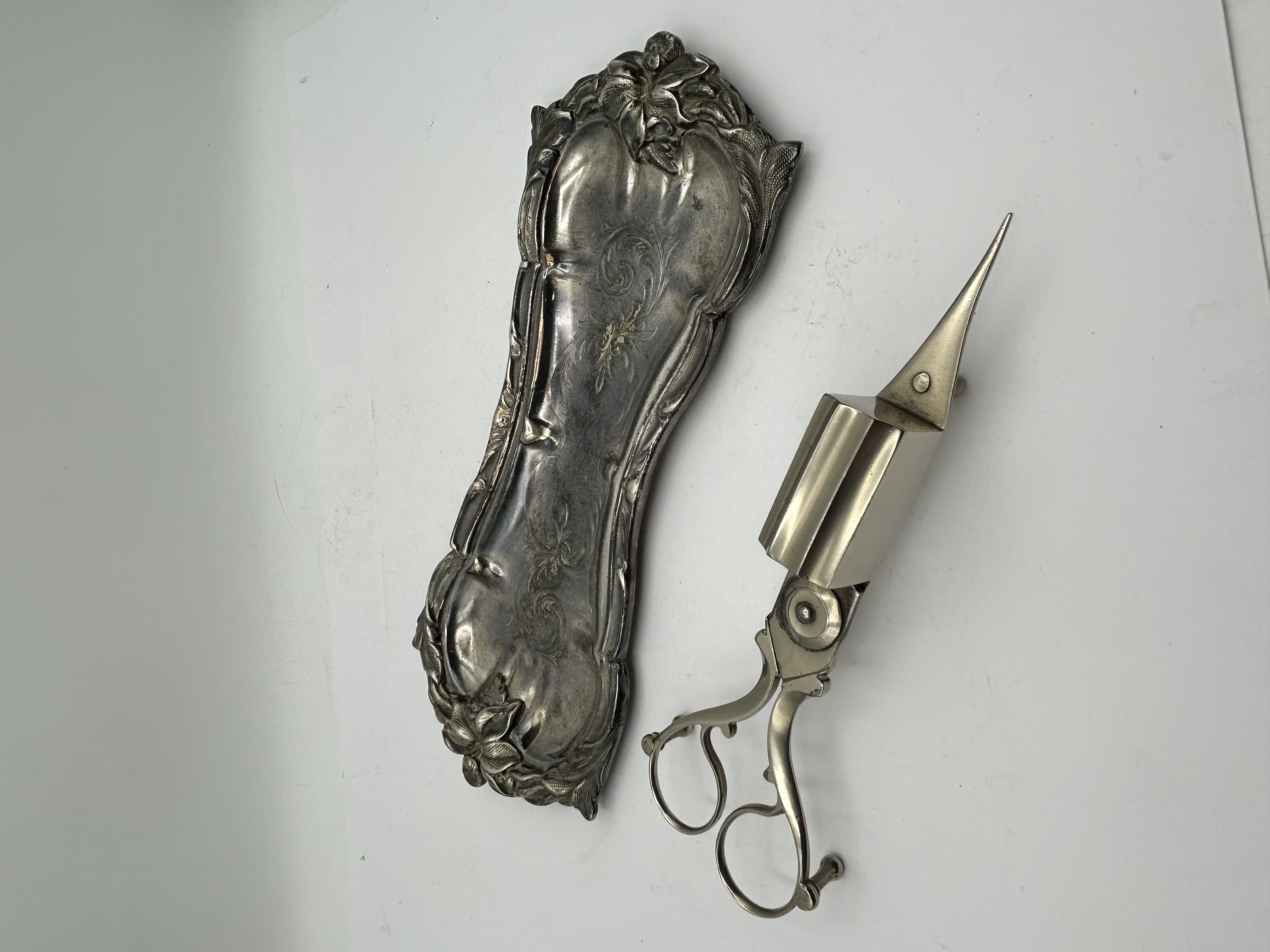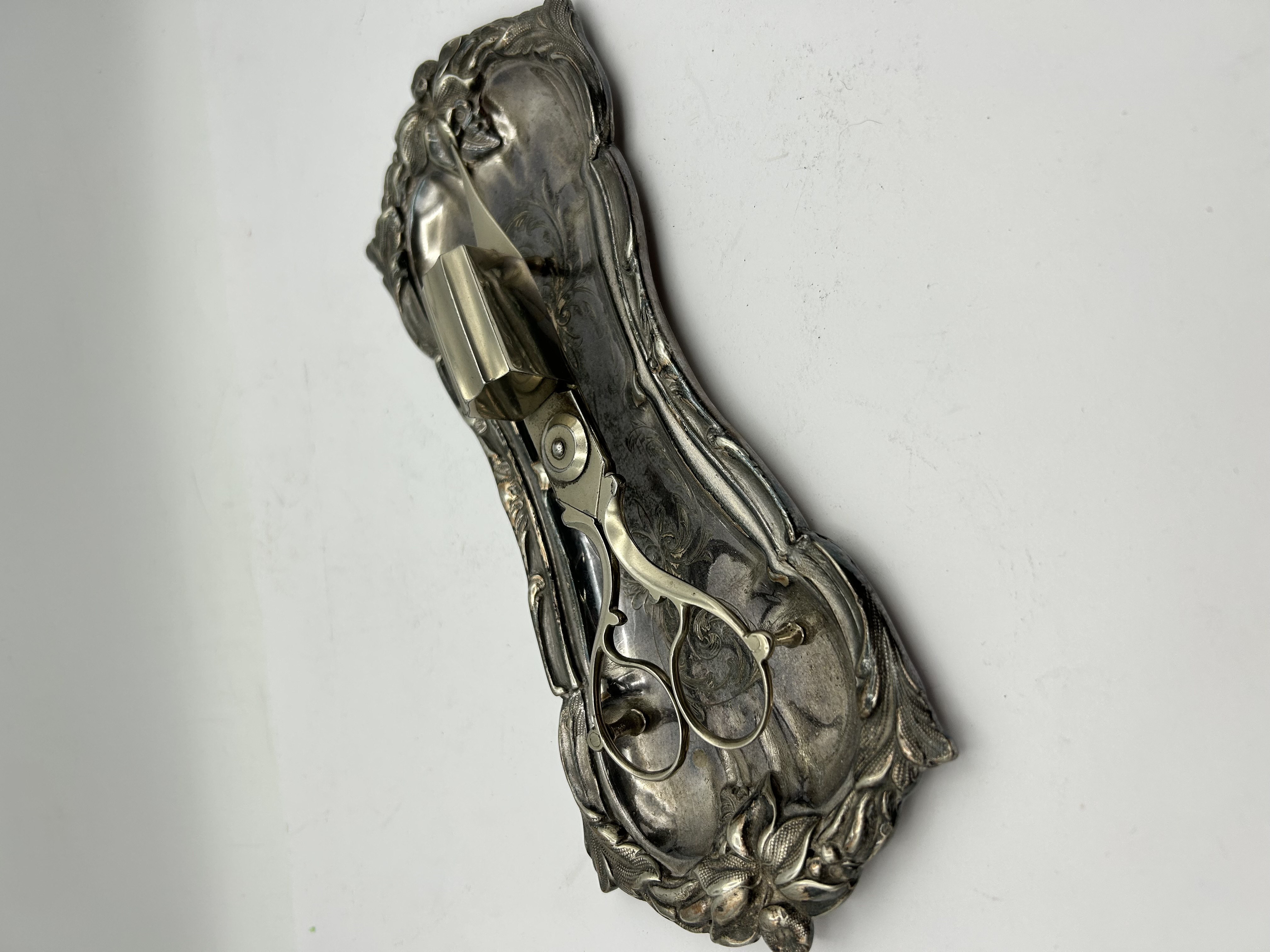This set consists of a candle wick trimmer and a matching underplate, both of silver-plated construction. The elongated tray is decorated in the Rococo style, featuring high-relief floral and scrollwork borders and a central engraved foliate motif. The accompanying trimmer includes a box-style wick catcher, three small peg feet, and a pointed tip for wick maintenance. No visible hallmarks or maker’s marks are present on either piece.