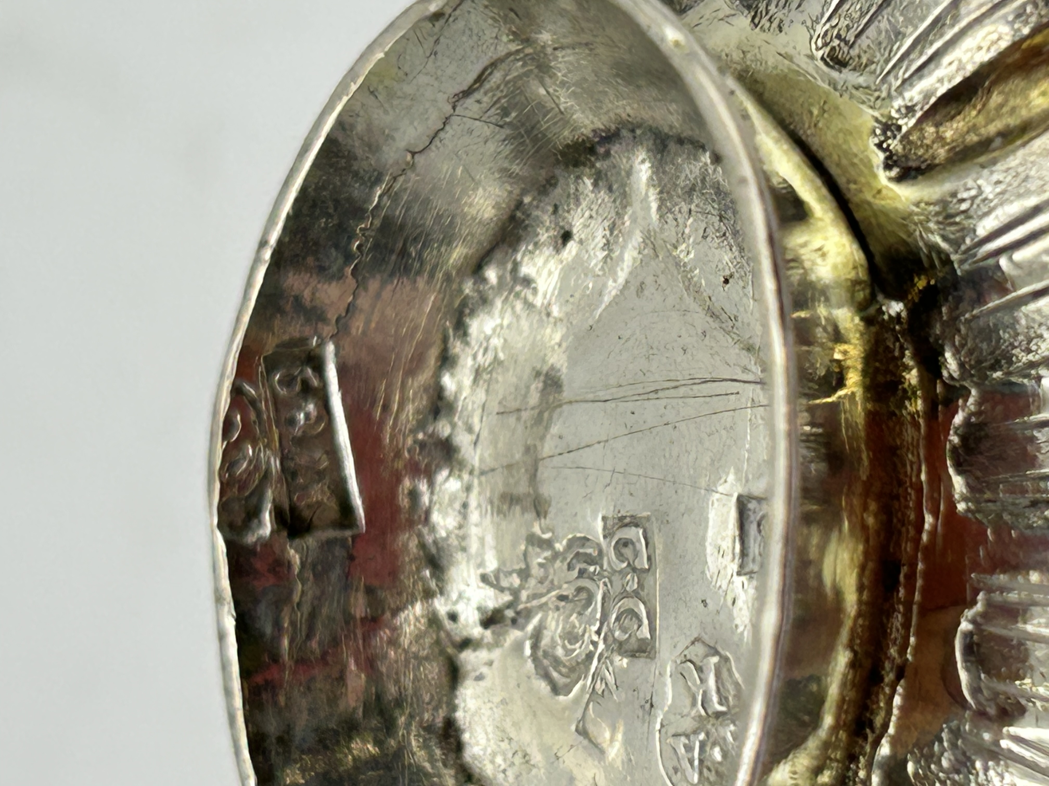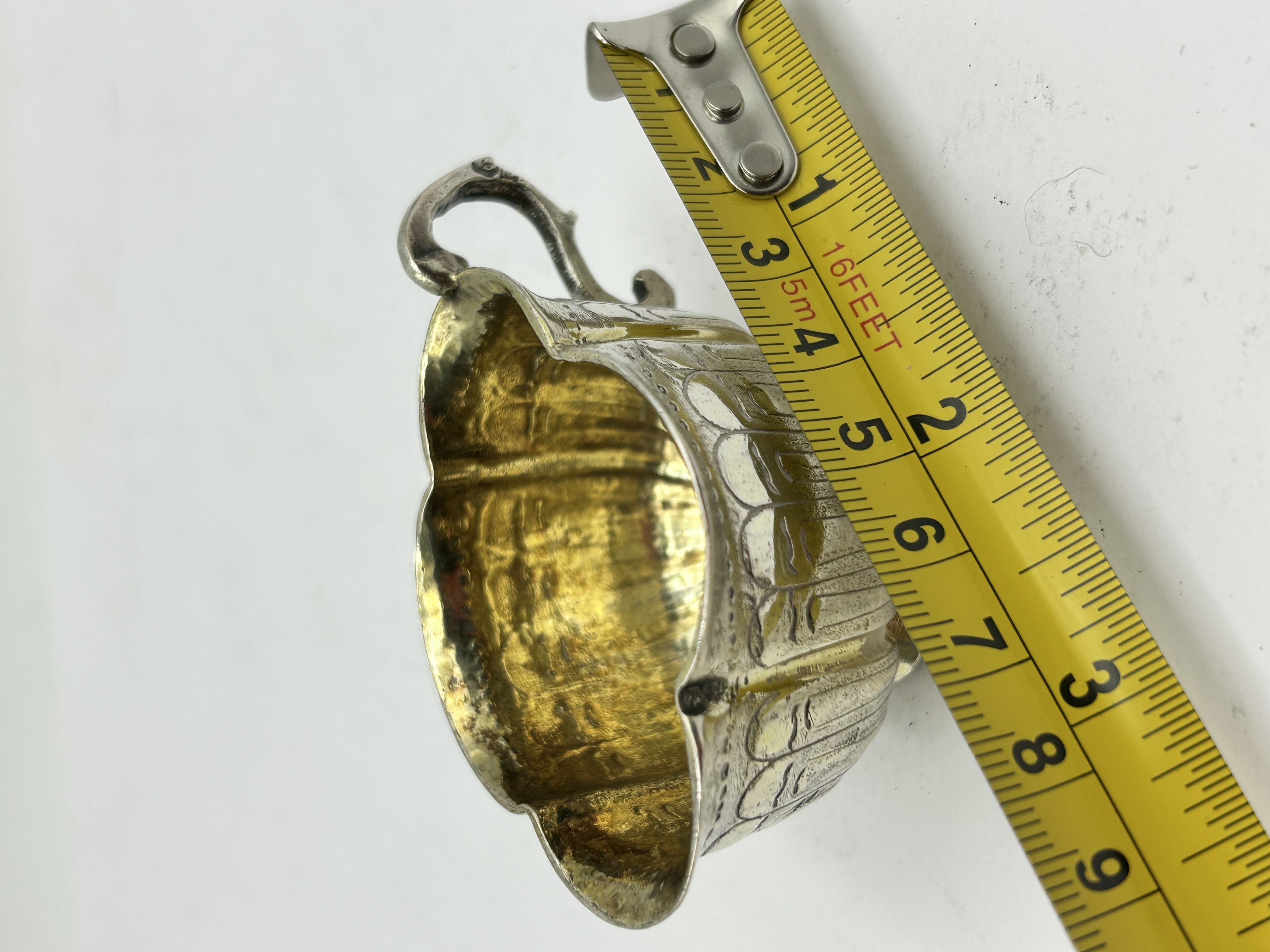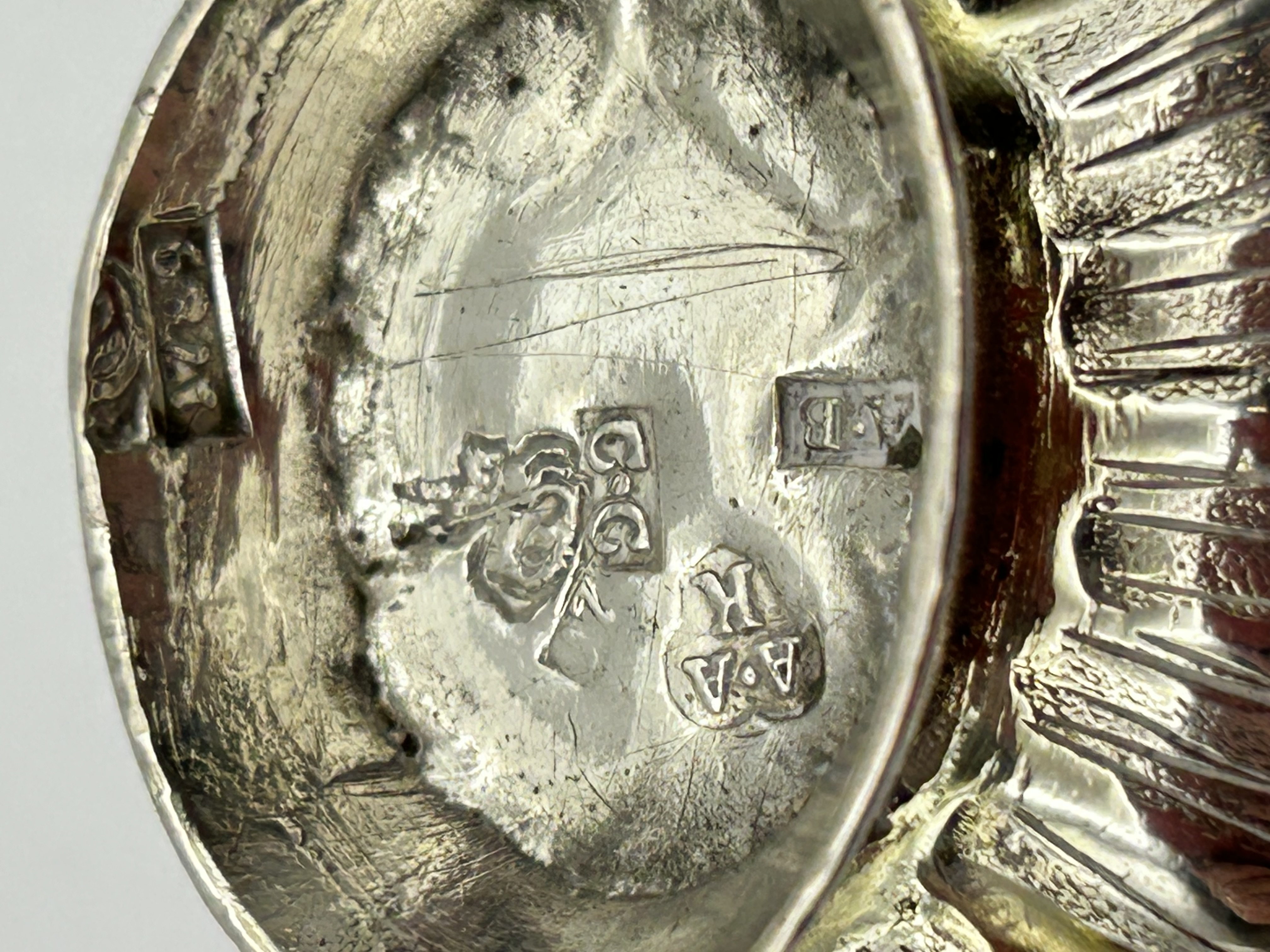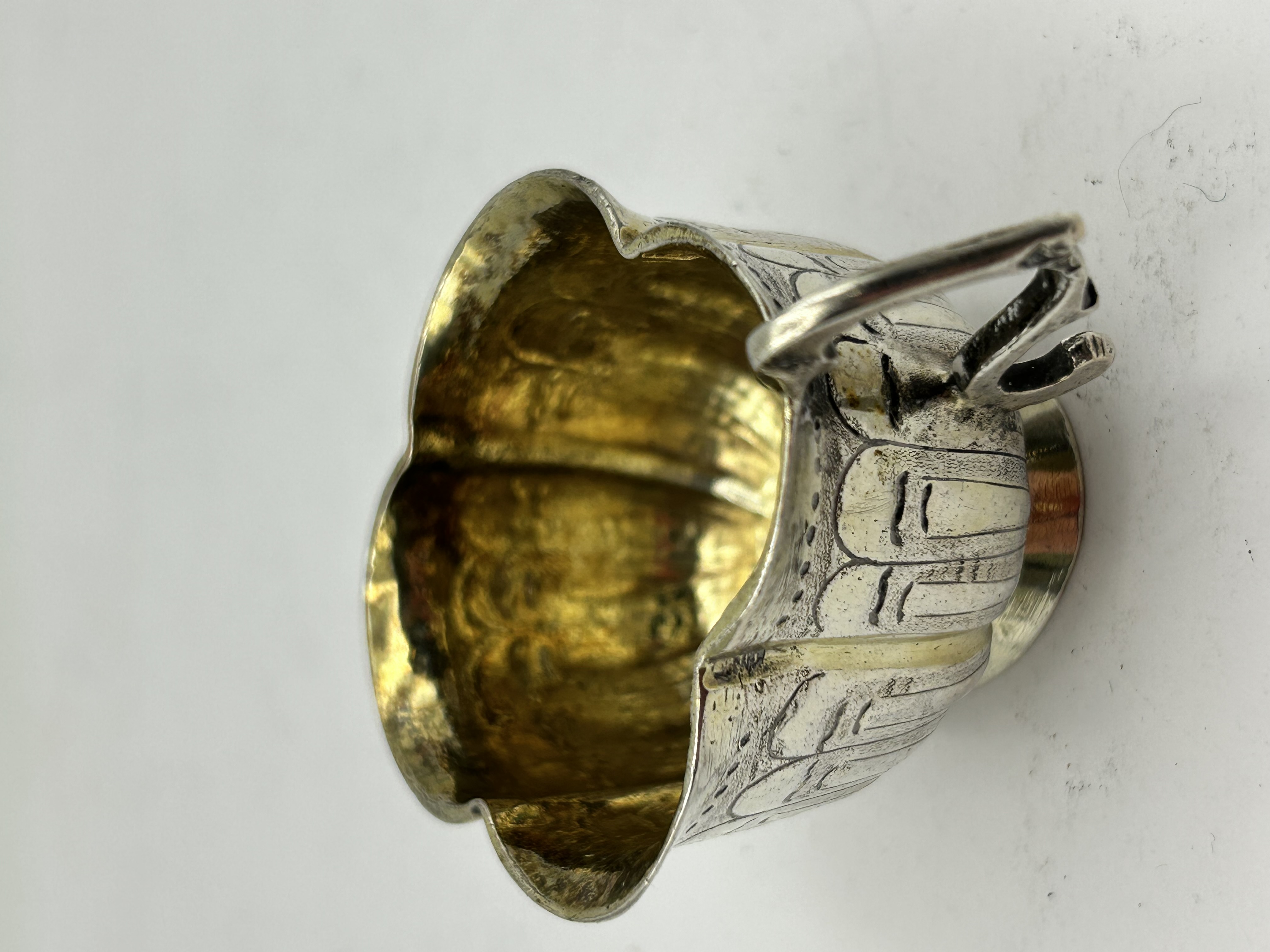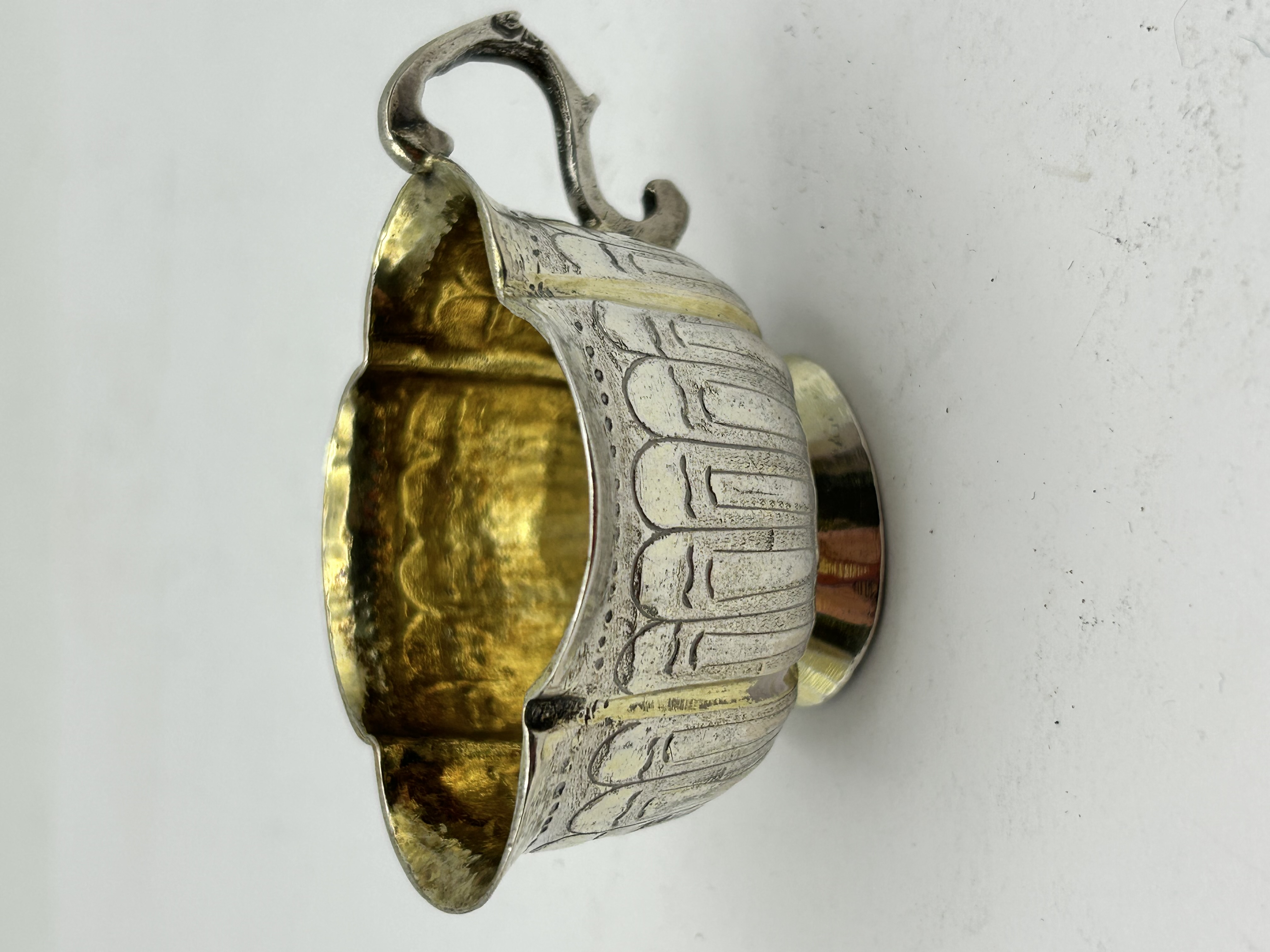A Russian silver charka, or vodka cup, featuring a lobed rim and a body decorated with engraved arched panels. The piece is crafted with a gold-washed vermeil interior and a single ornate scroll handle, all supported by a low circular pedestal foot. The underside of the foot bears several clear hallmarks, including the 84 zolotnik silver standard mark and the Moscow city mark depicting St. George and the Dragon. The assay master mark A.A is struck above the date 1791, alongside the maker mark A.B.