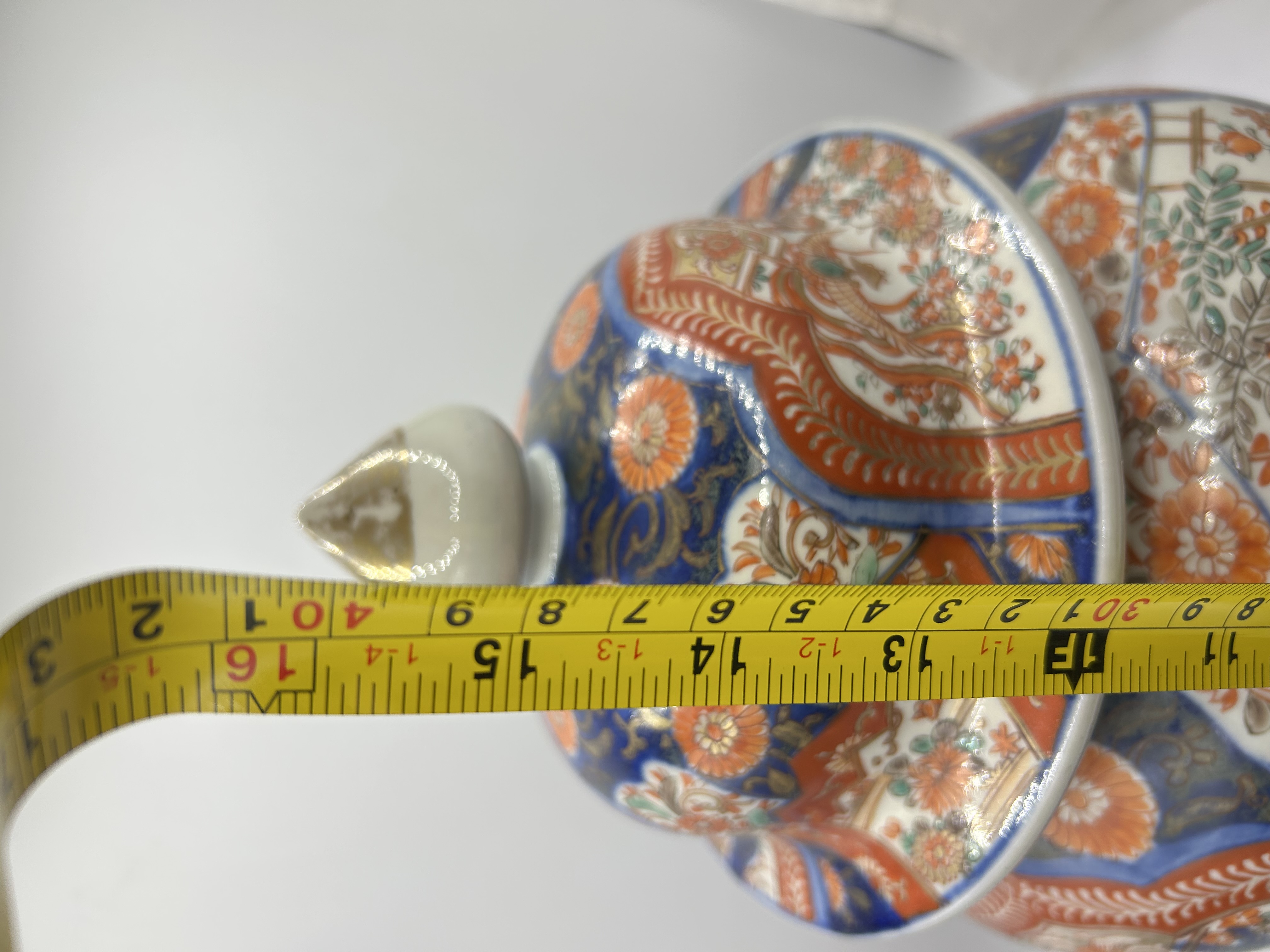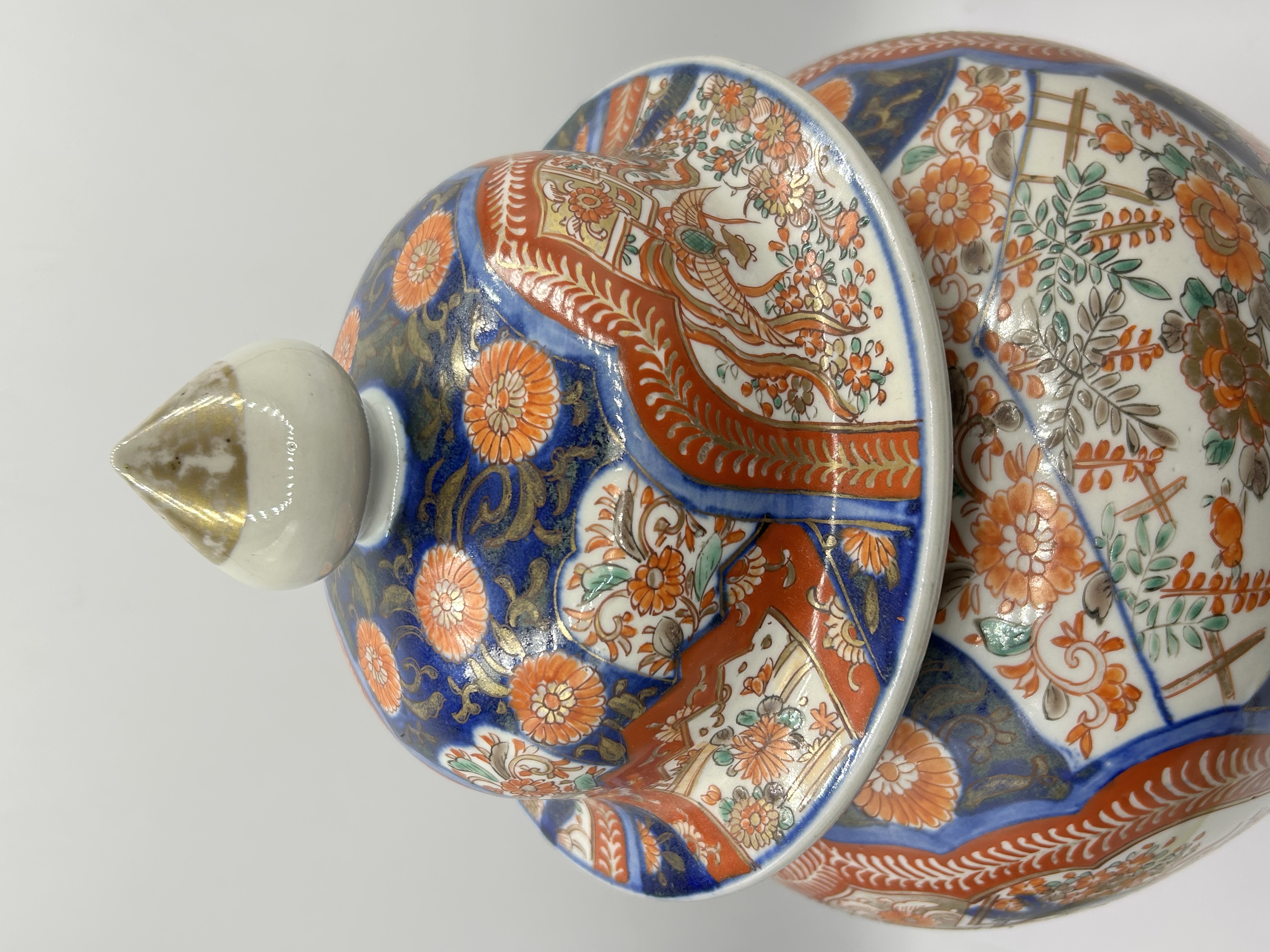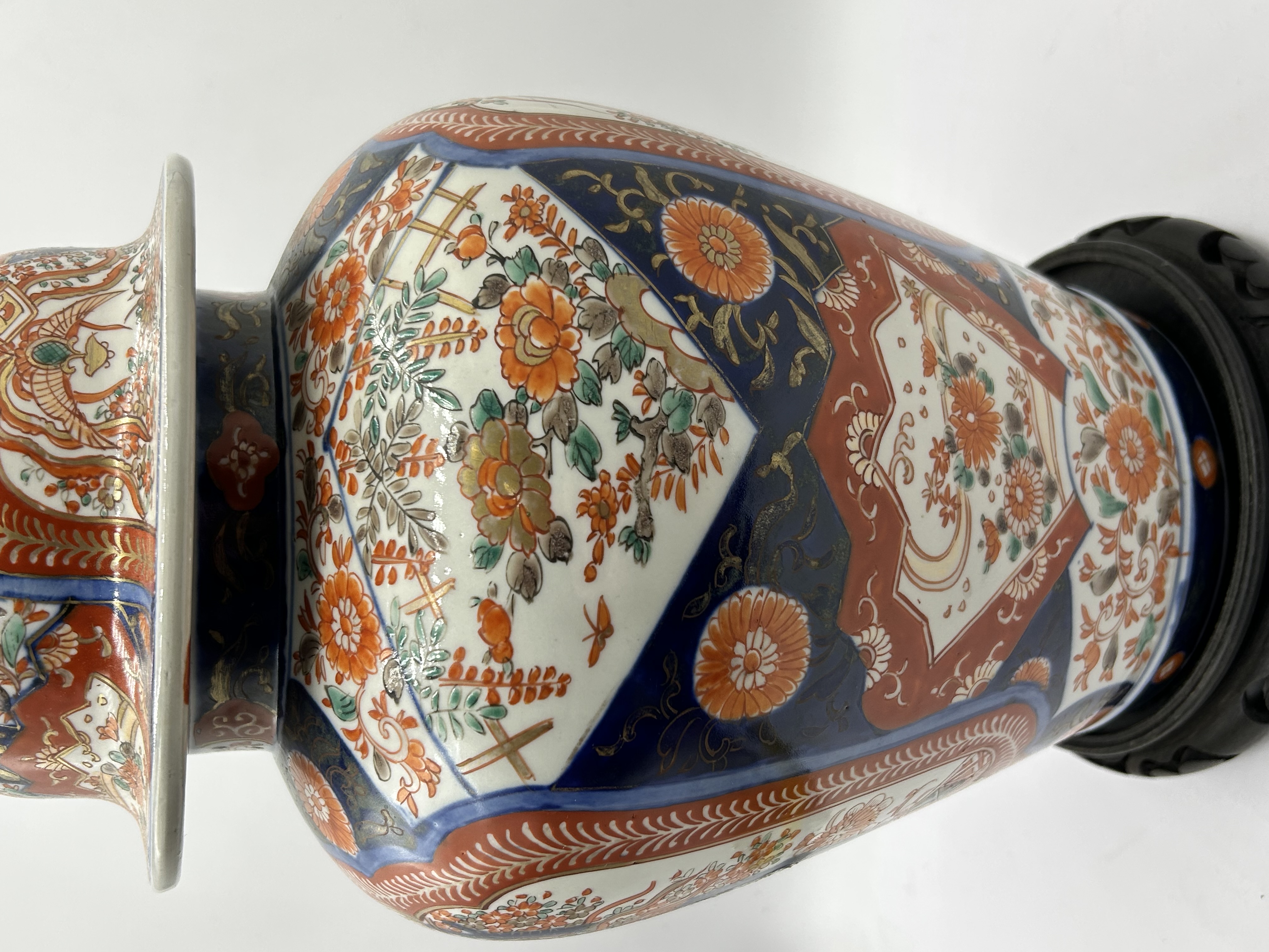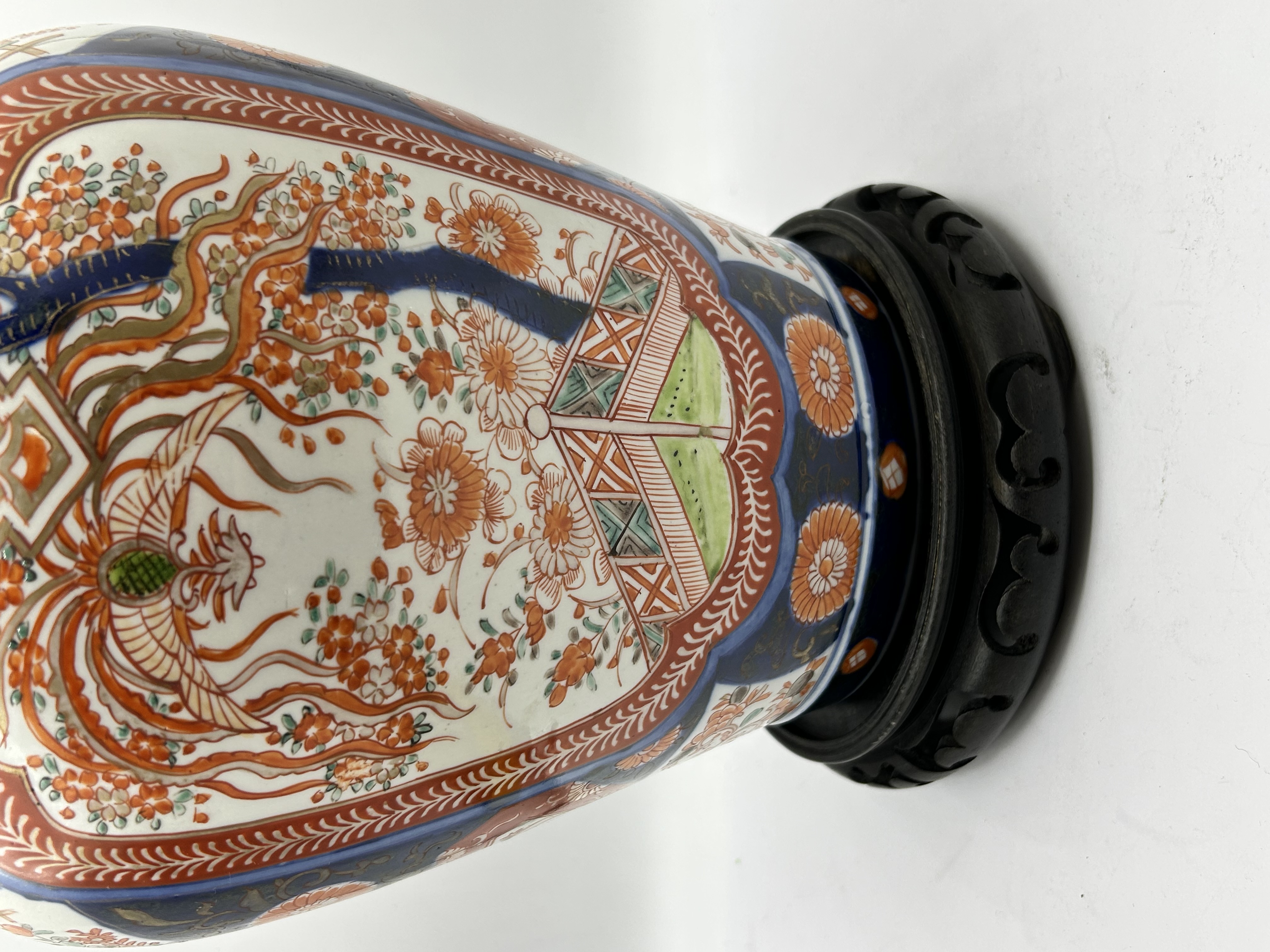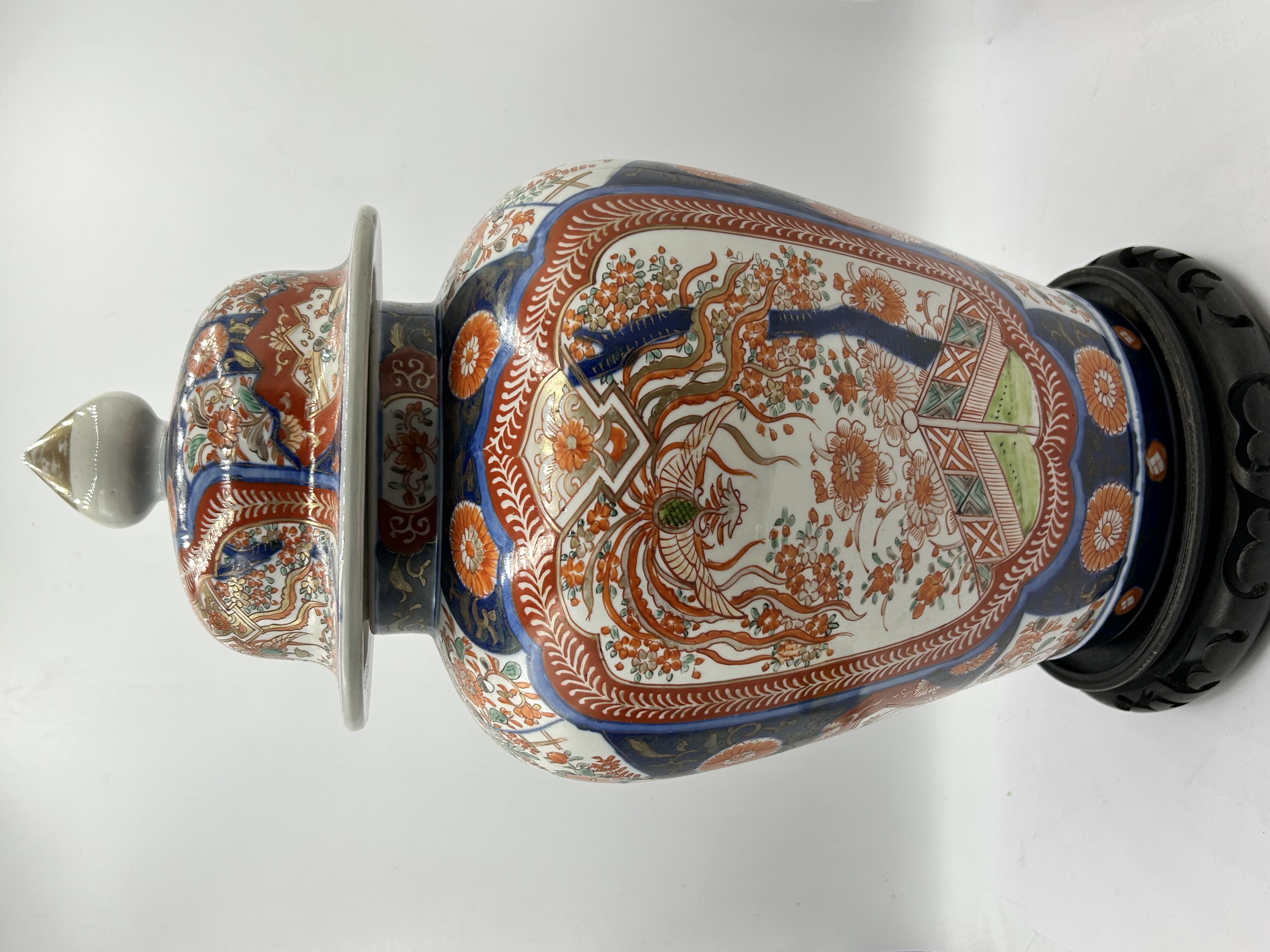 A Japanese Imari porcelain temple jar with a matching cover. The piece features hand-painted decoration in underglaze cobalt blue, overglaze iron red, and gilt. The body is designed with large reserves depicting a phoenix amidst blossoming branches and floral sprays, interspersed with geometric patterns and chrysanthemum motifs. The matching domed lid is similarly decorated and surmounted by a pointed finial with gilded accents. The jar is presented on a carved dark wood circular base.