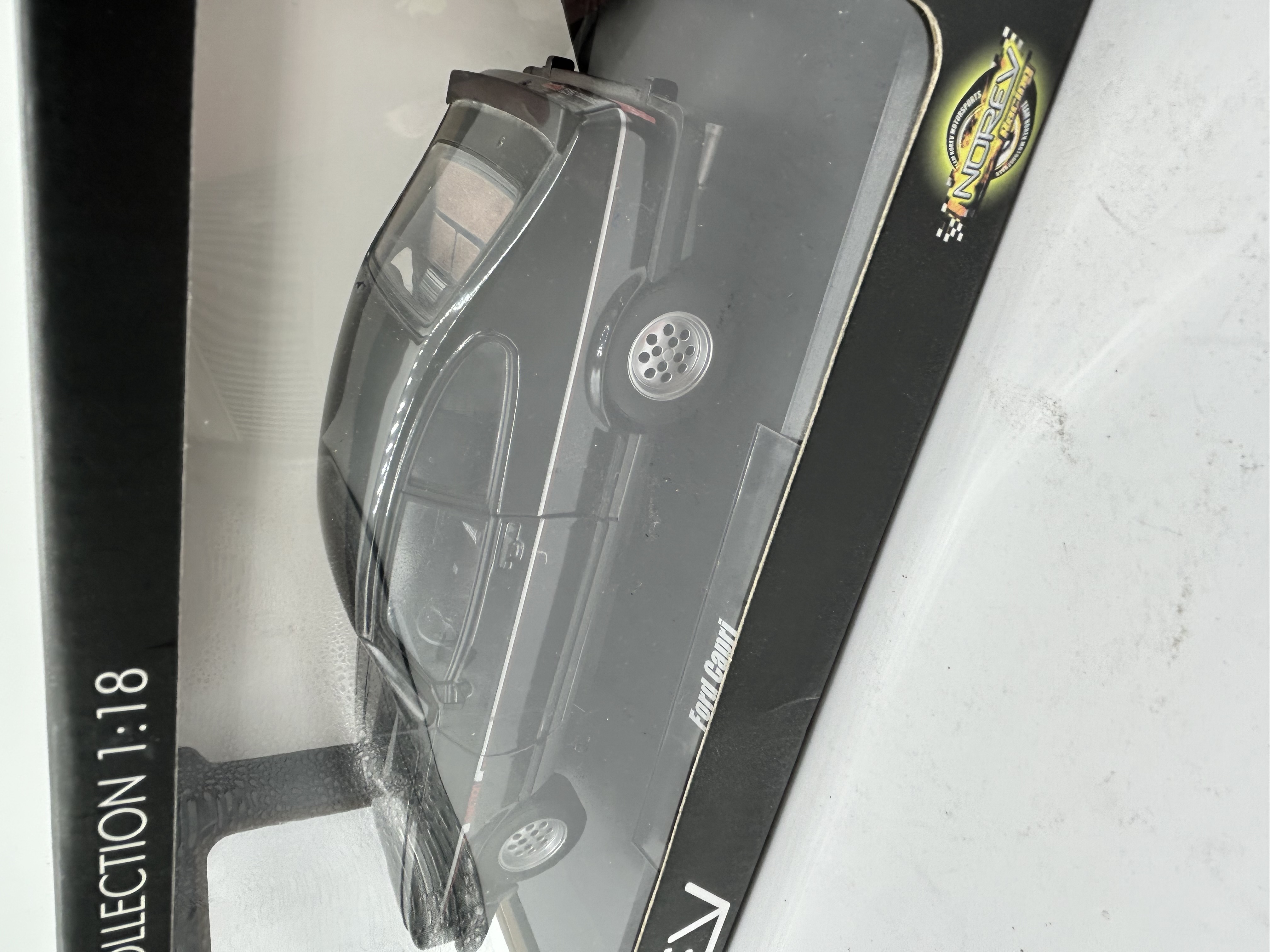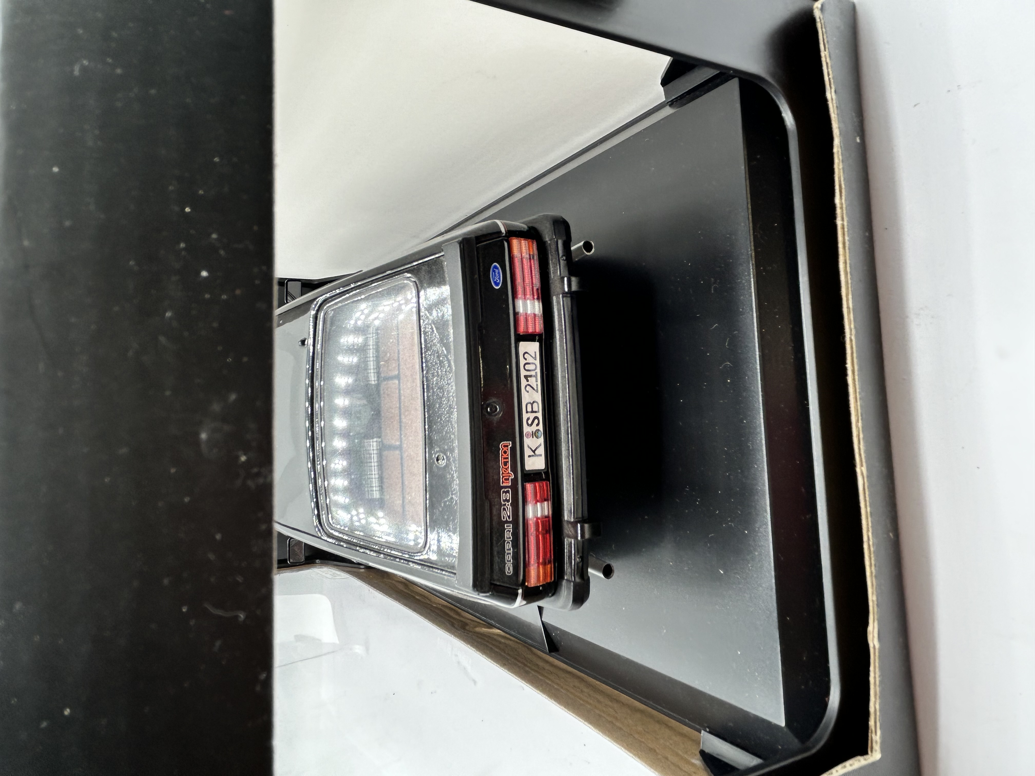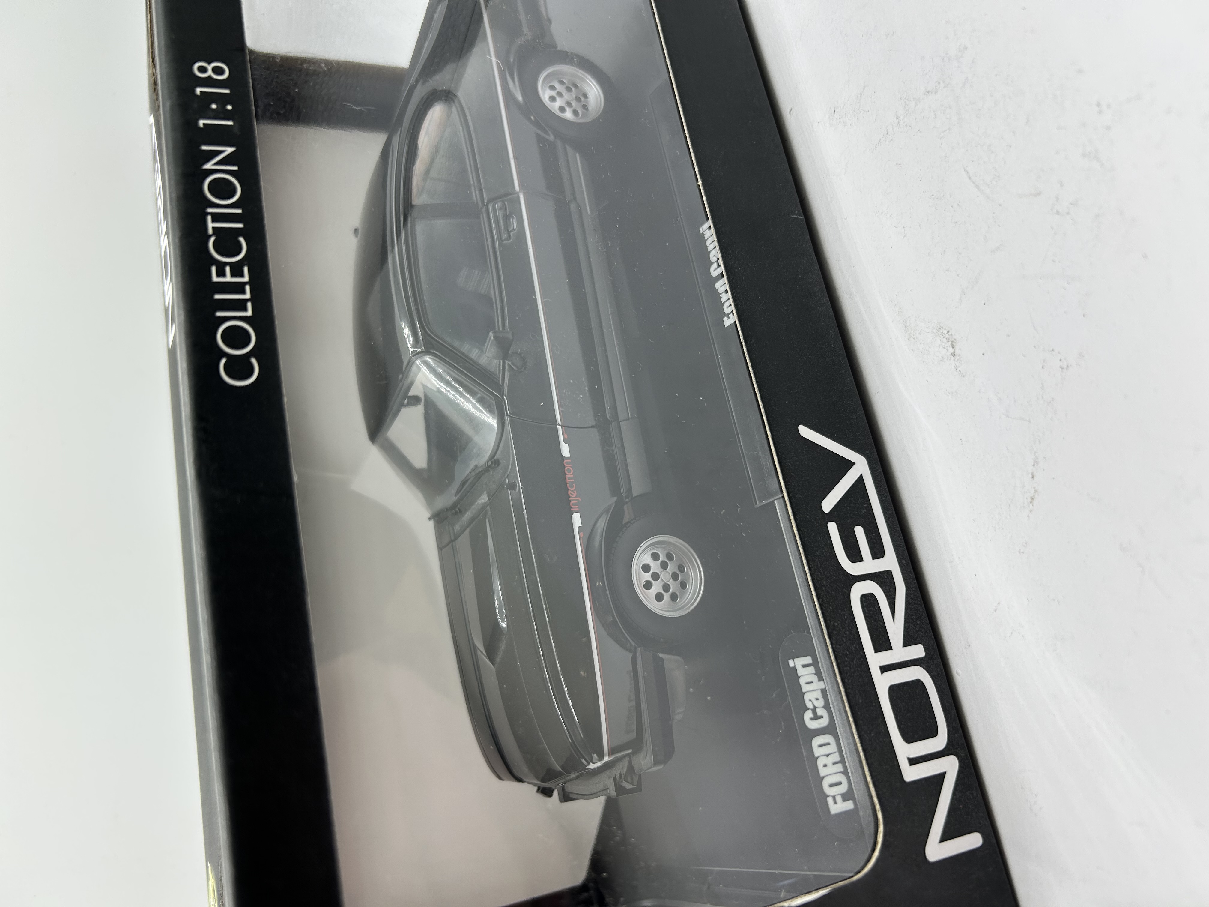 A 1:18 scale die-cast model of a Ford Capri 2.8 Injection produced by Norev. The vehicle is finished in black with a thin red accent stripe and red injection side graphics. Technical features include silver-tone multi-hole wheels, a rear spoiler, dual exhaust pipes, and a visible tan interior. External markings include the Ford emblem, Capri 2.8 injection badging, and a German-style license plate reading K SB 2102. The model is housed in its original black and white Norev Collection window box.