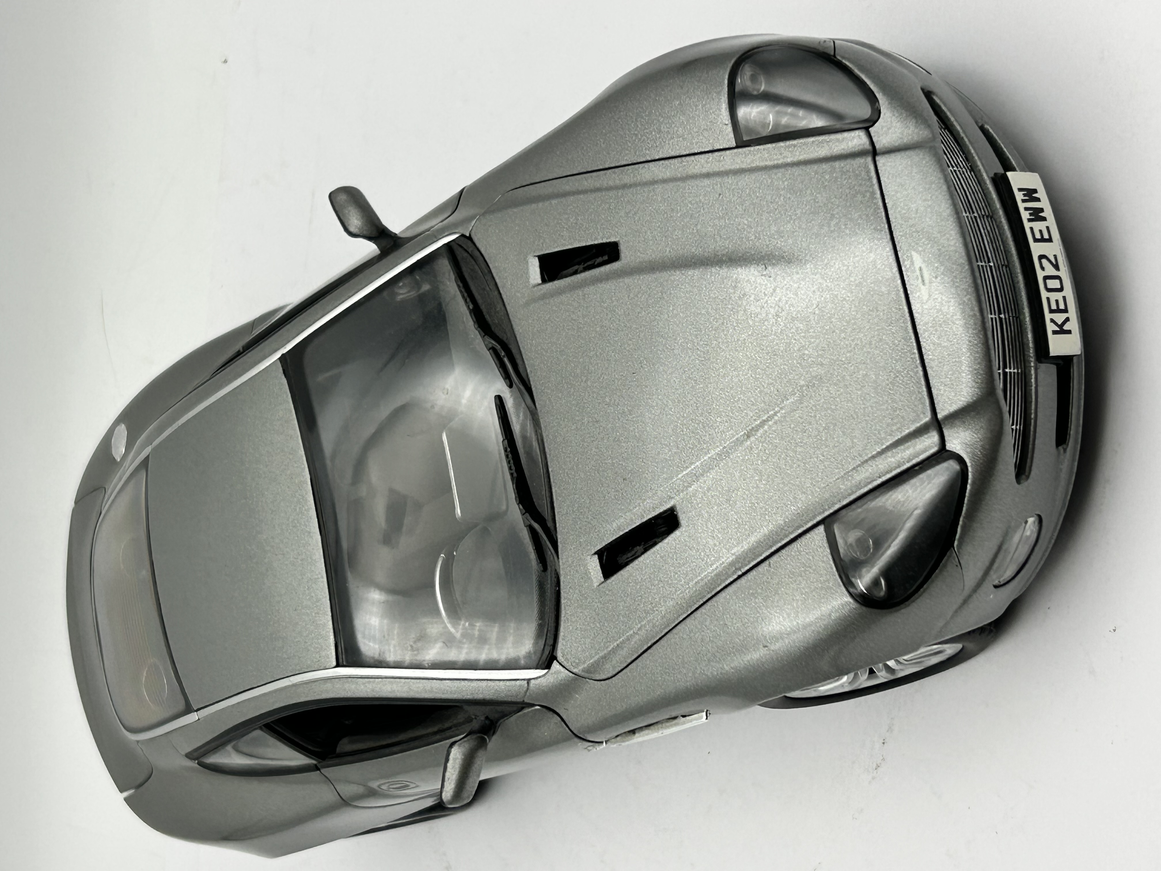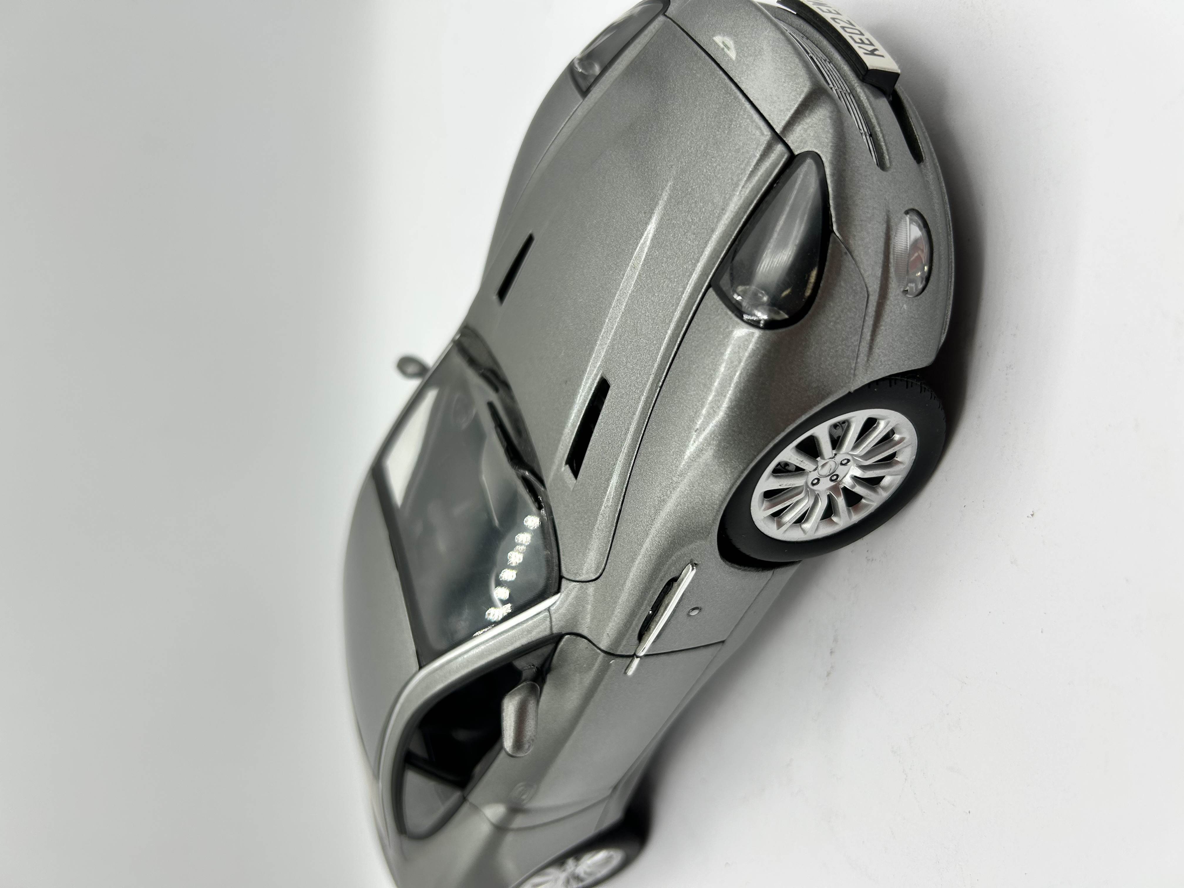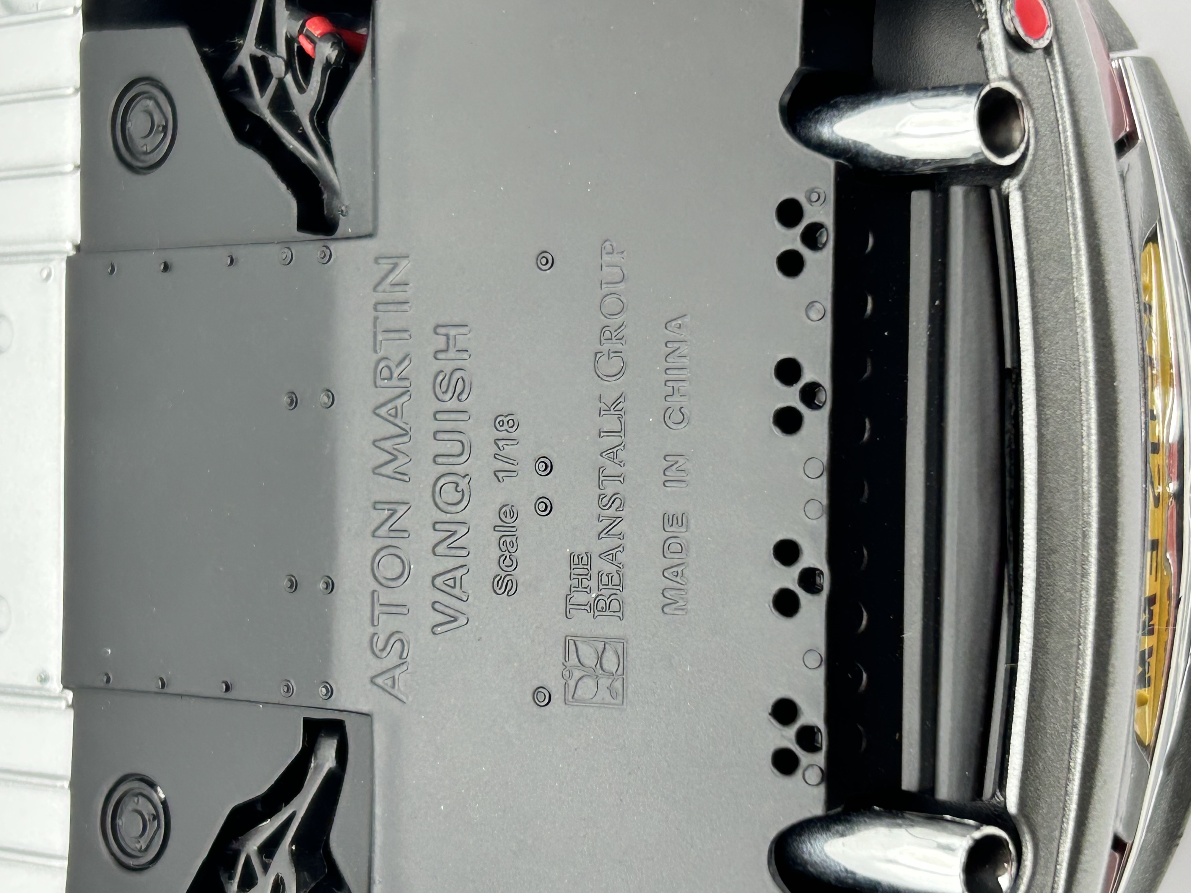 A 1/18 scale die-cast model of an Aston Martin Vanquish finished in metallic silver. Manufactured by The Beanstalk Group, the model features detailed exterior styling including hood and side vents, clear lenses for the headlights and taillights, and multi-spoke silver-tone wheels. The interior is visible through clear glazing. The vehicle displays a United Kingdom-style license plate reading KE02 EWW. The black plastic underside is embossed with ASTON MARTIN VANQUISH, Scale 1/18, THE BEANSTALK GROUP, and MADE IN CHINA.