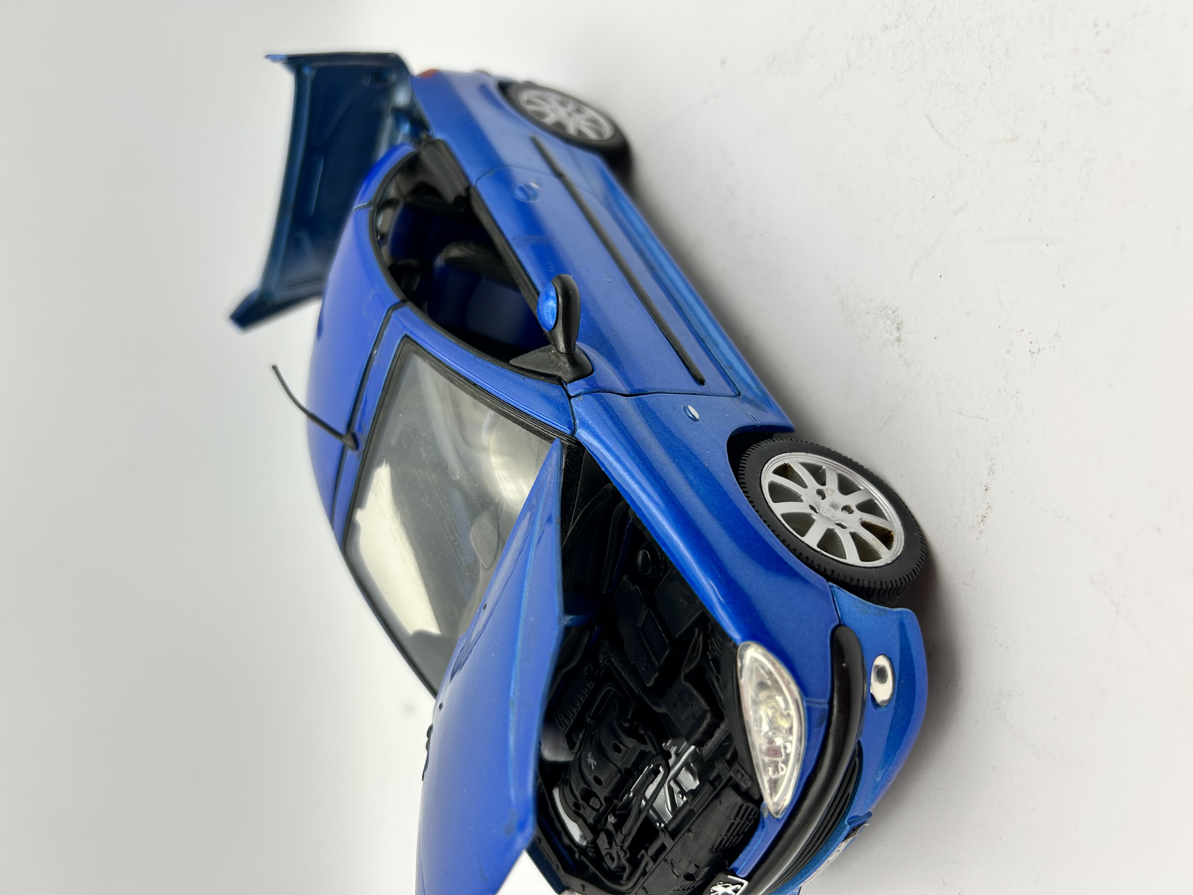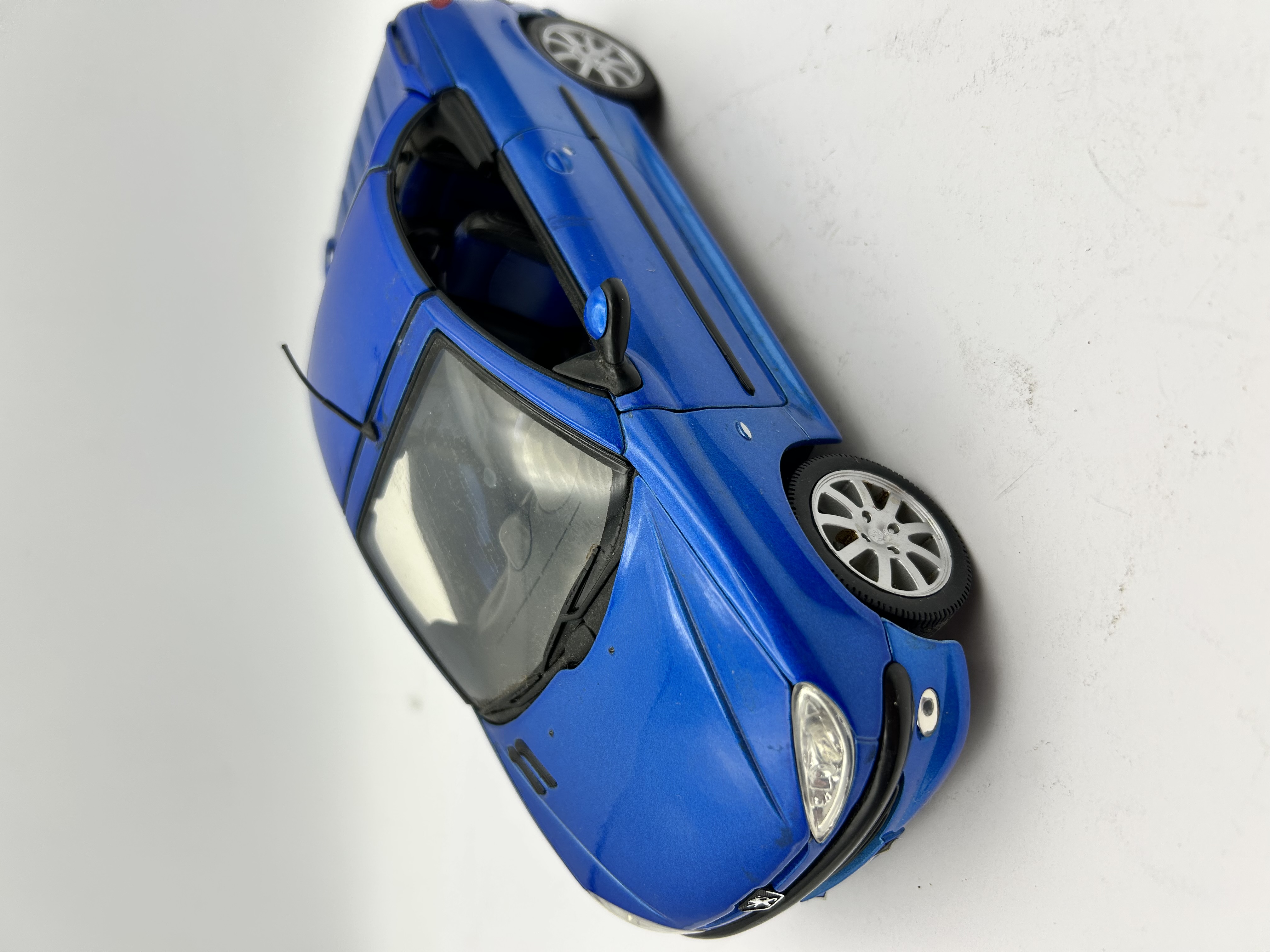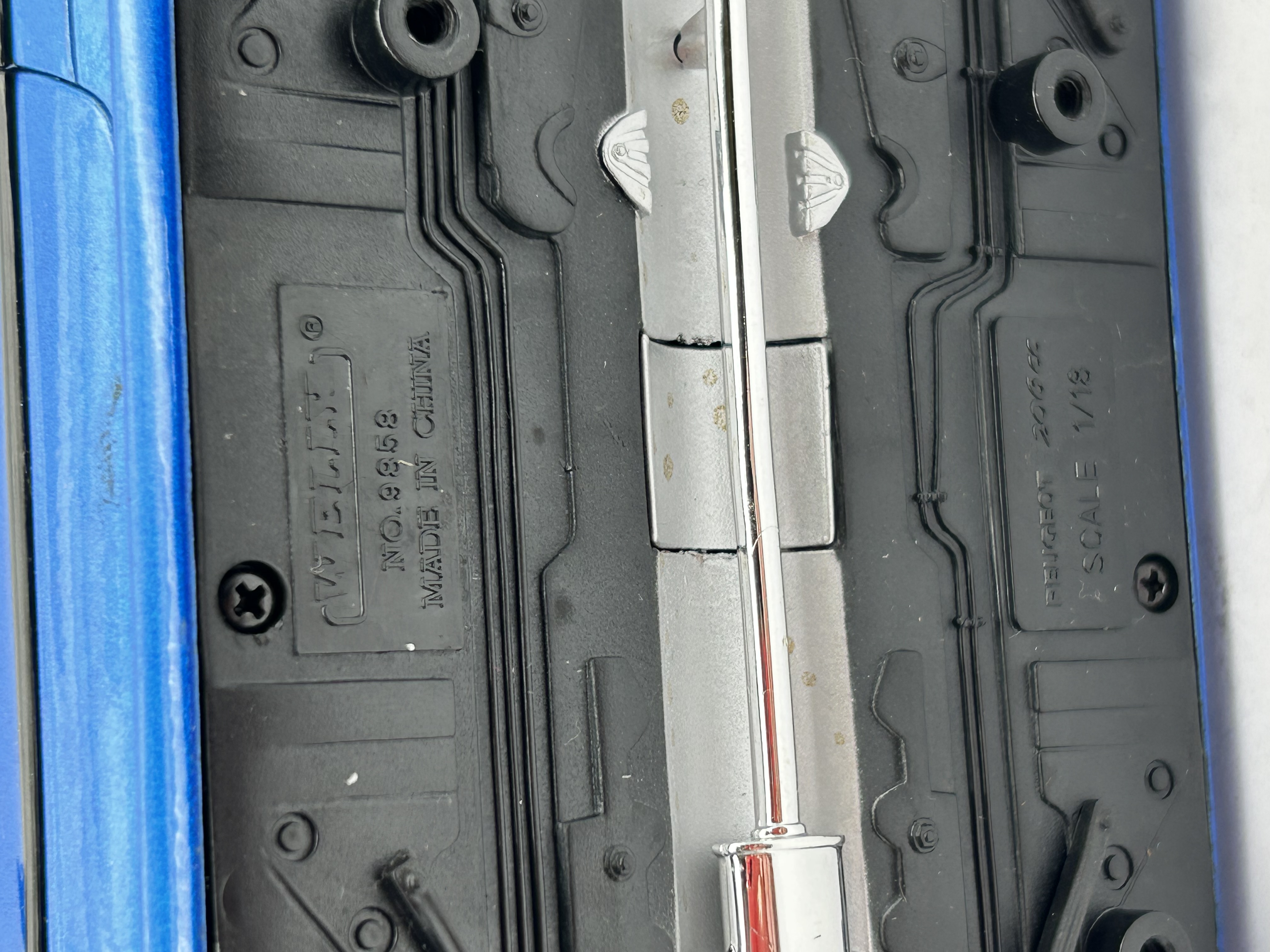A 1/18 scale die-cast model of a Peugeot 206cc manufactured by Welly, model number 9858. The vehicle is finished in a metallic blue paint with a black interior. The model features several opening components, including the hood, doors, and a retractable-style trunk lid that reveals internal mechanisms. The undercarriage is constructed of molded black plastic and bears the manufacturer name, the model name, Scale 1/18, and Made in China. Additional details include silver-tone multi-spoke wheels, rubber tires, and a roof-mounted antenna.