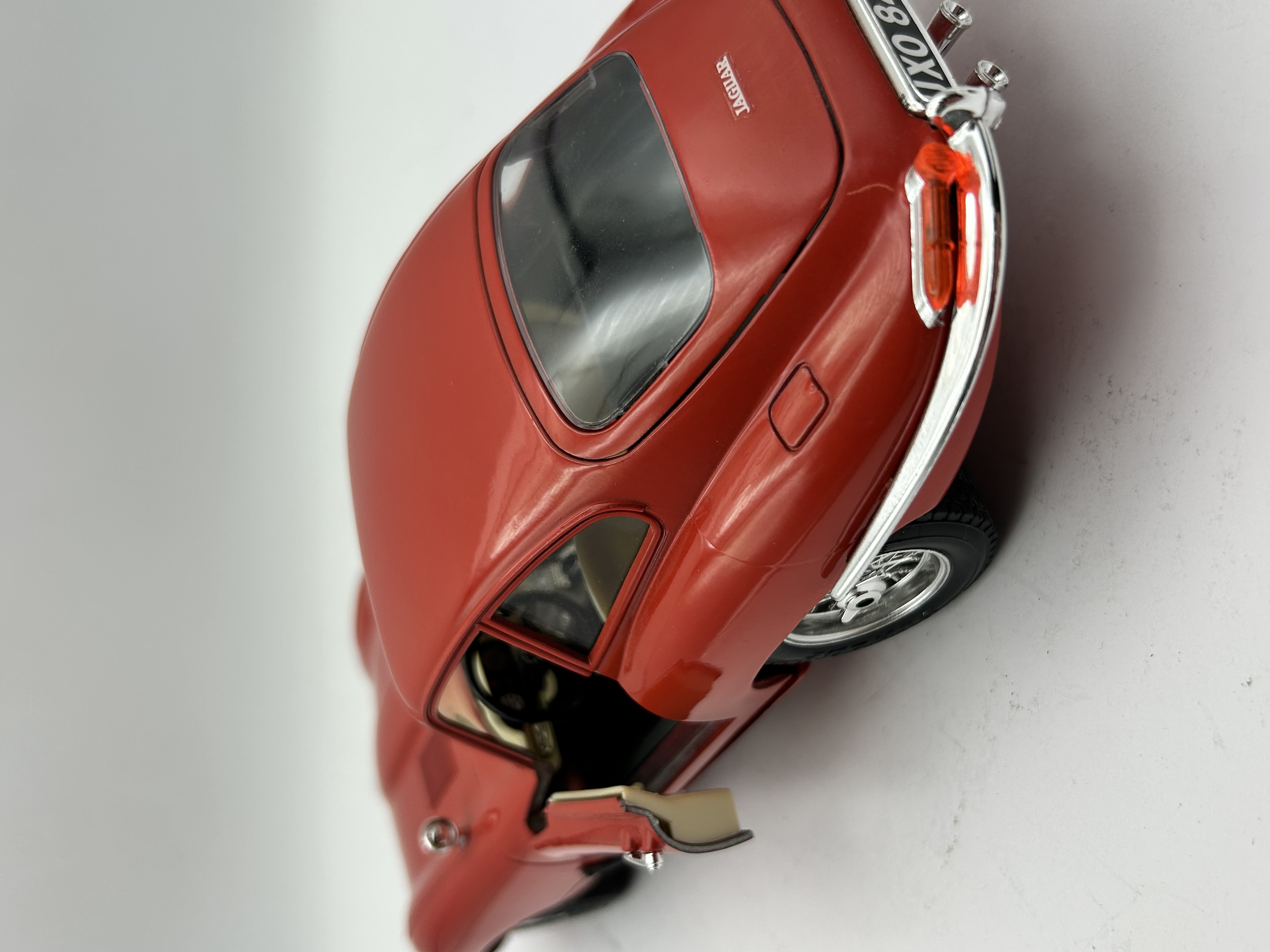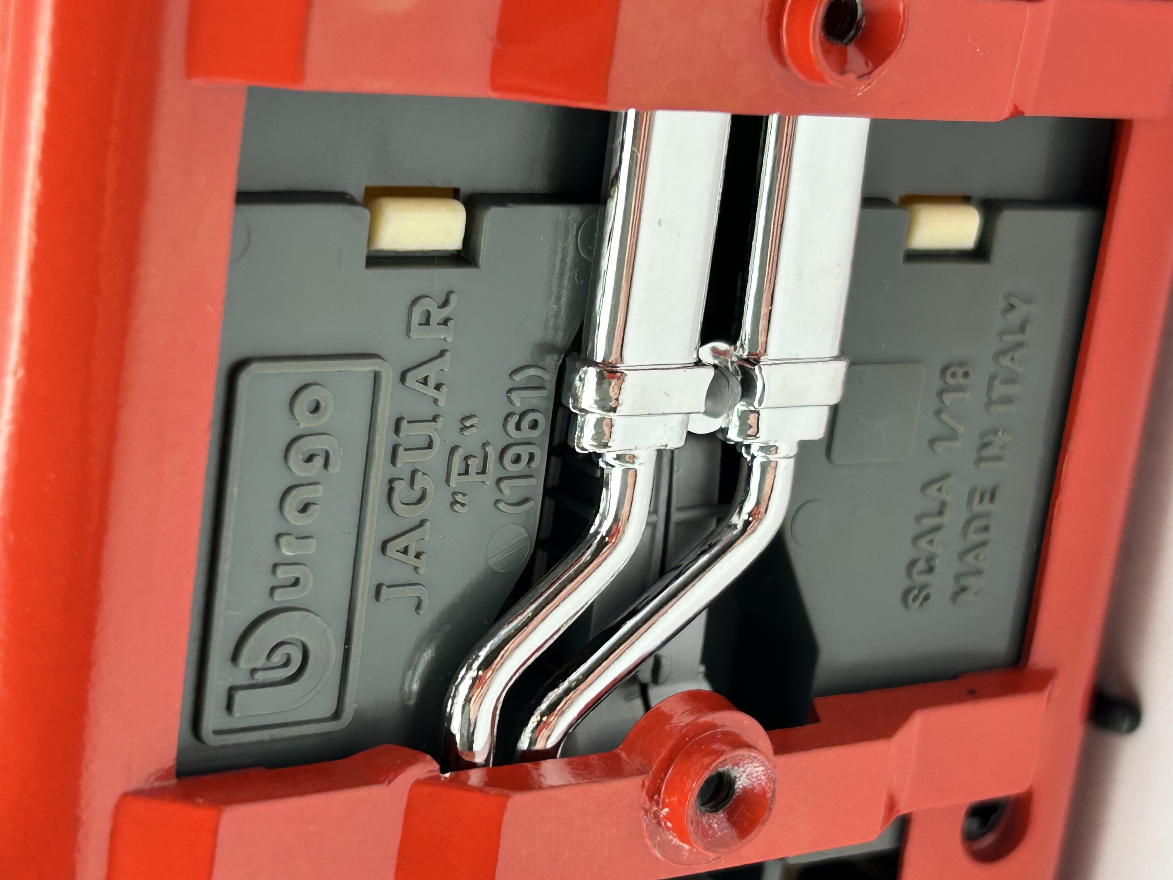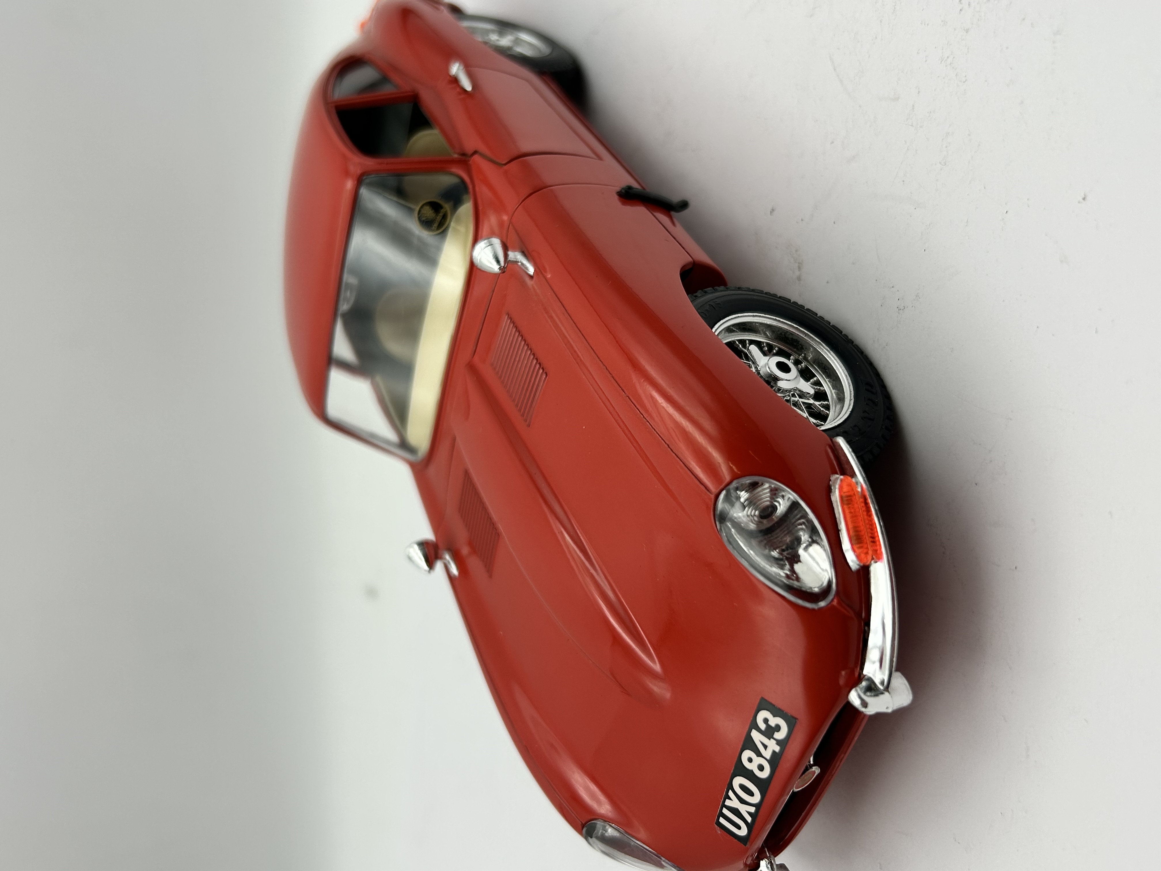 A 1/18 scale die-cast model produced by Burago in Italy, representing a 1961 Jaguar E-Type coupe. The vehicle is finished in red paint with a tan-colored interior. Construction includes a metal body with plastic detailing. Functional features include opening doors and rotating wire-spoke wheels. The exterior is detailed with chrome-finished bumpers, side mirrors, and a dual exhaust system. Identification markings include license plates reading UXO 843 and a rear-mounted JAGUAR emblem. The underside of the chassis is embossed with the manufacturer name burago, the model designation JAGUAR E (1961), the scale SCALA 1/18, and the origin MADE IN ITALY.