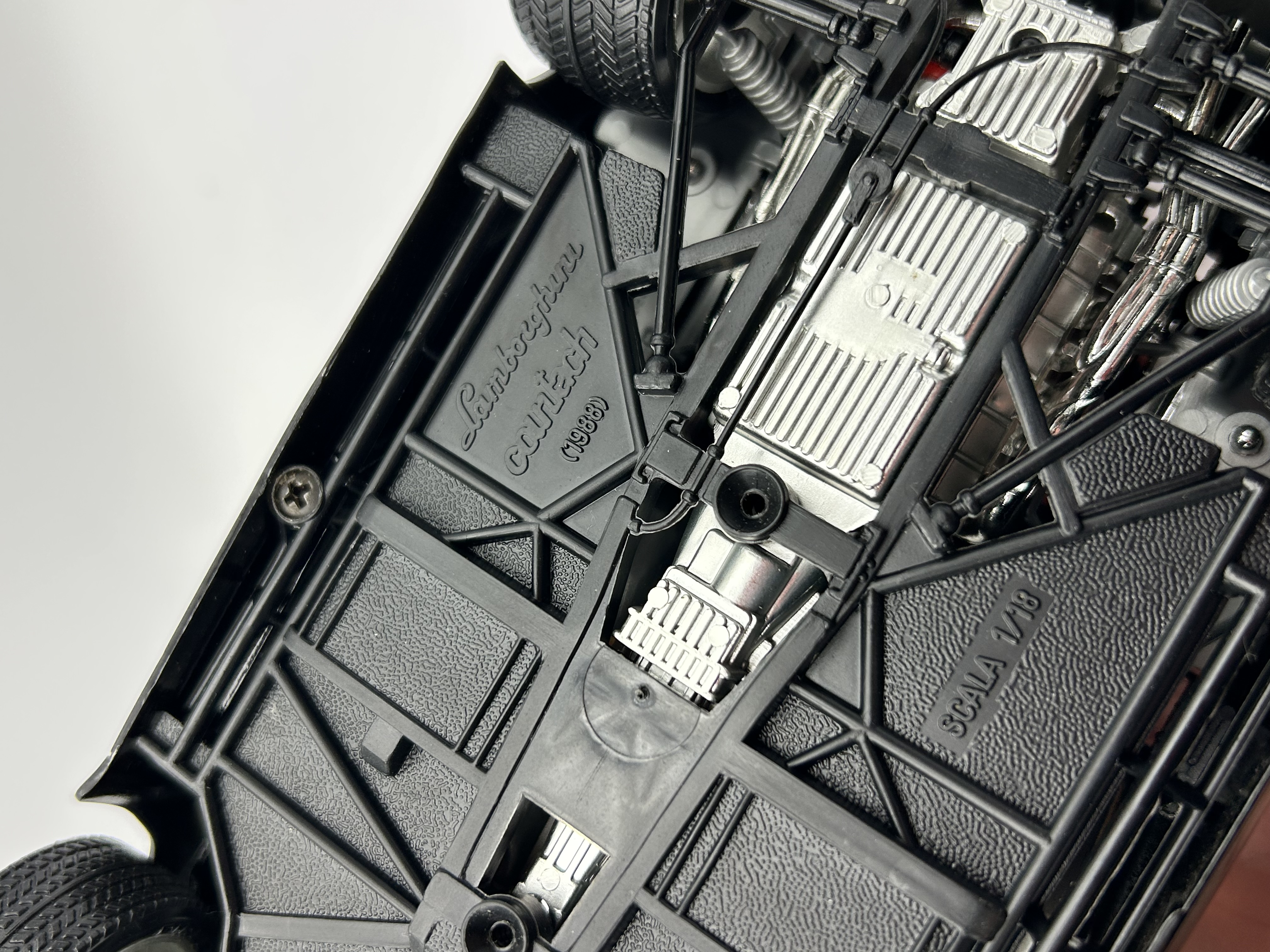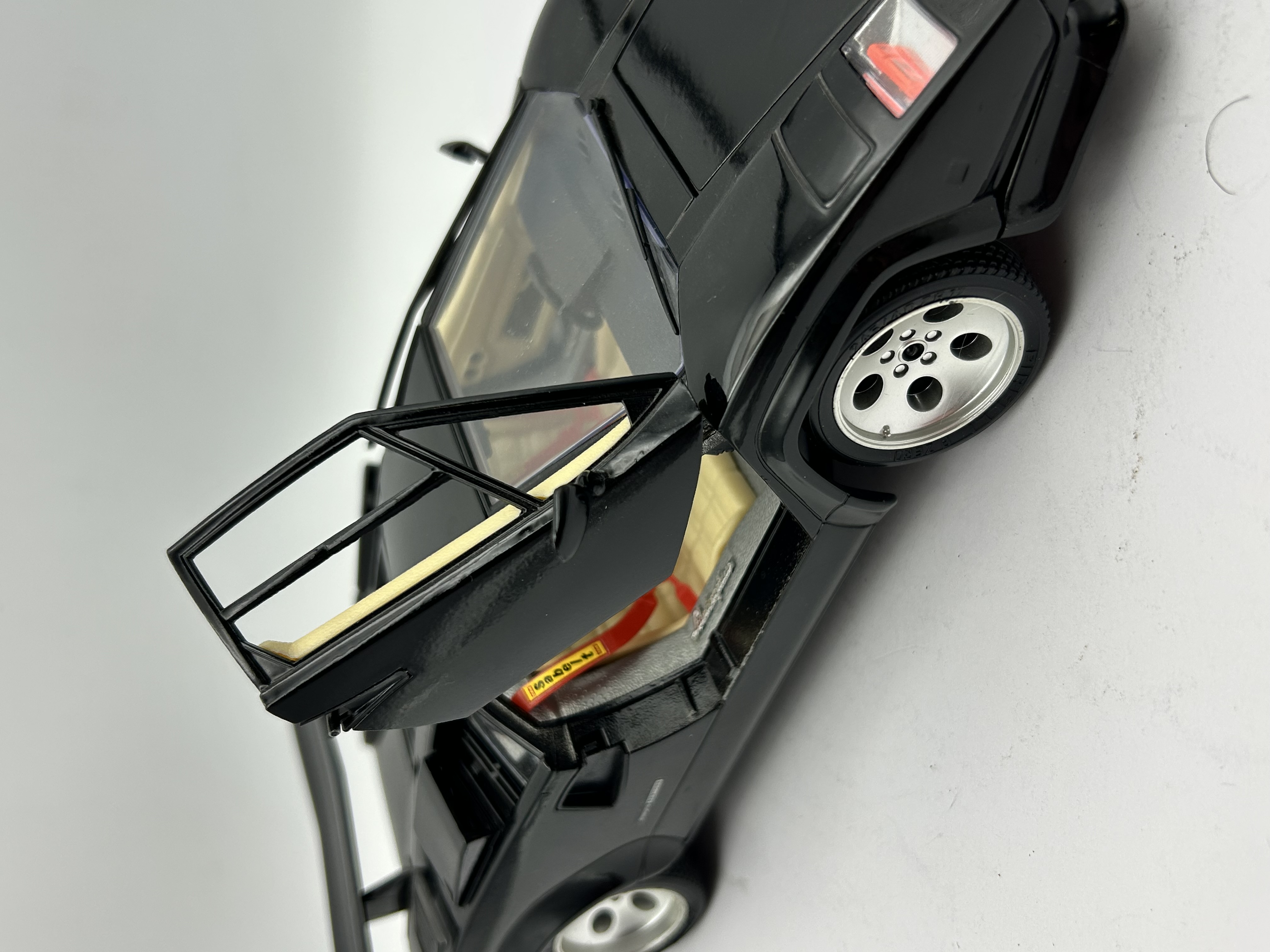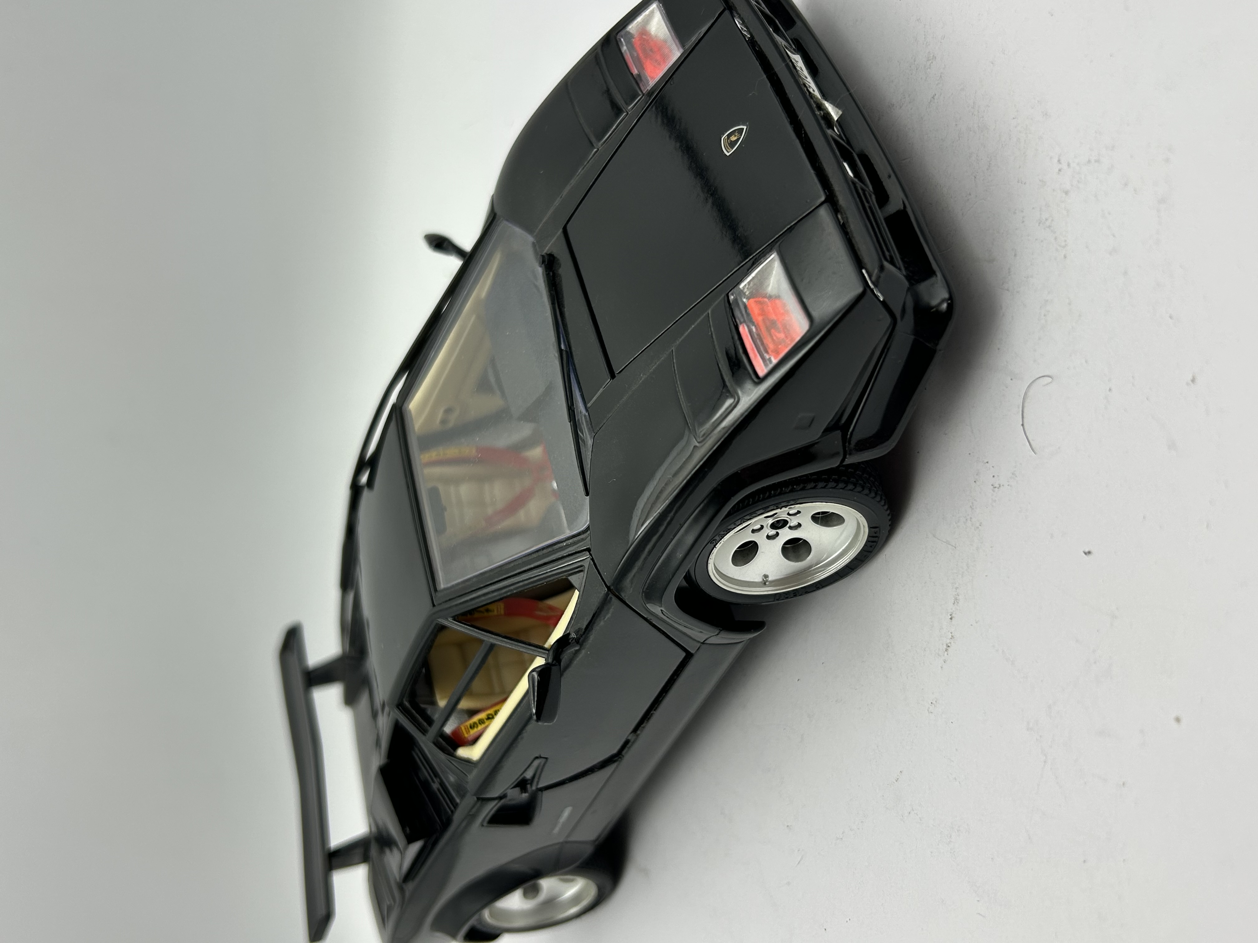 A 1/18 scale die-cast model of a 1988 Lamborghini Countach 5000 Quattrovalvole by Bburago. The model is constructed from die-cast metal and plastic components, featuring a gloss black exterior finish and a contrasting tan interior. It is equipped with functional opening scissor doors, a large rear wing, and five-hole silver-tone wheels. The interior includes detailed components such as red safety harnesses and a dashboard. The underside of the chassis is molded in black and silver-toned plastic, displaying mechanical details and embossed text that reads Lamborghini Countach (1988) and SCALA 1/18.
