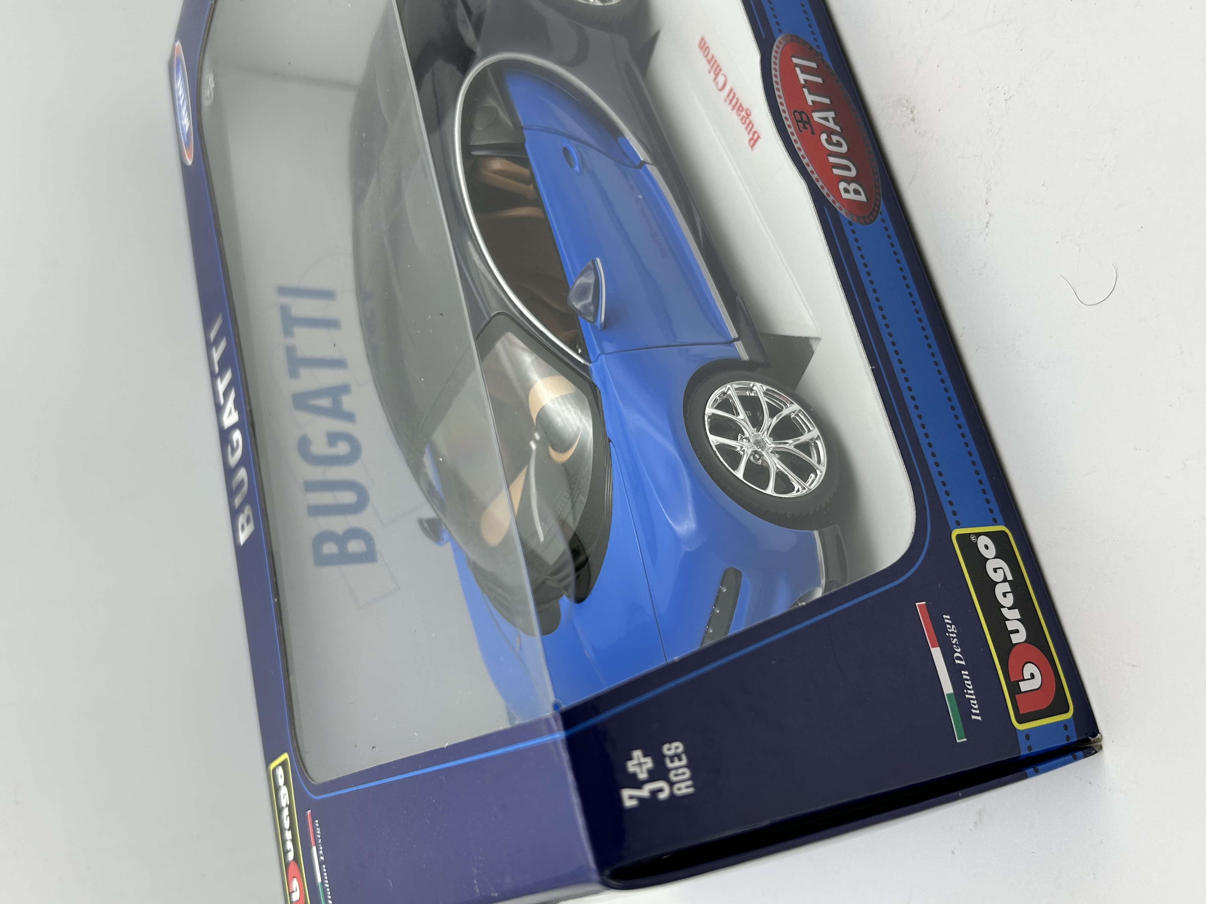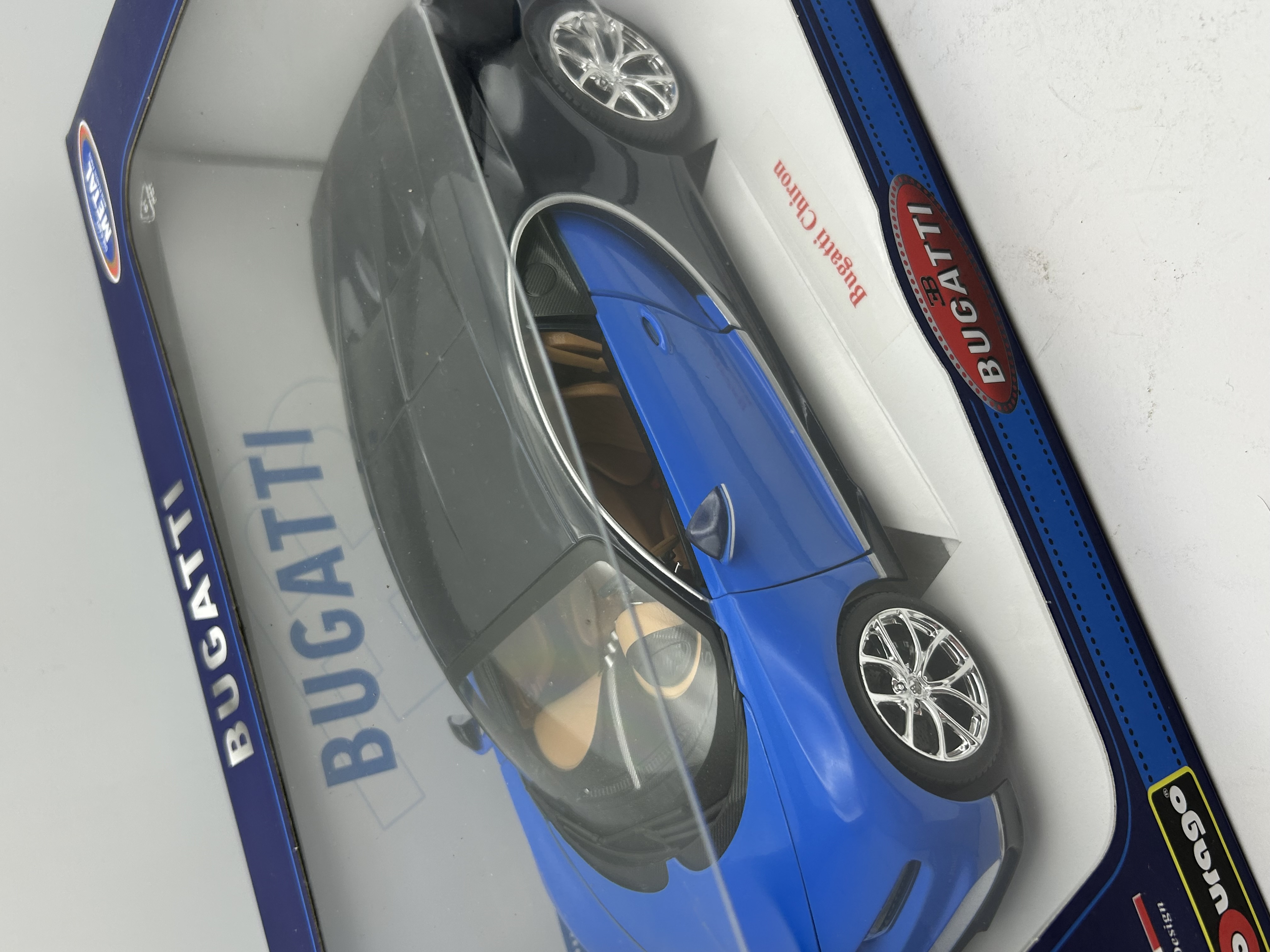 A Maisto Special Edition die-cast model of a Bugatti Chiron, presented in its original retail window display box. The model features a two-tone blue and black exterior finish with multi-spoke silver-tone wheels and a visible tan interior. The packaging includes prominent BUGATTI branding, the Bugatti Chiron model name, and an Italian Design label. The box displays both Maisto and Bburago branding, reflecting the manufacturer’s dual-brand packaging. The model is constructed of die-cast metal with plastic components. The item is securely fastened within its original, unopened retail packaging.