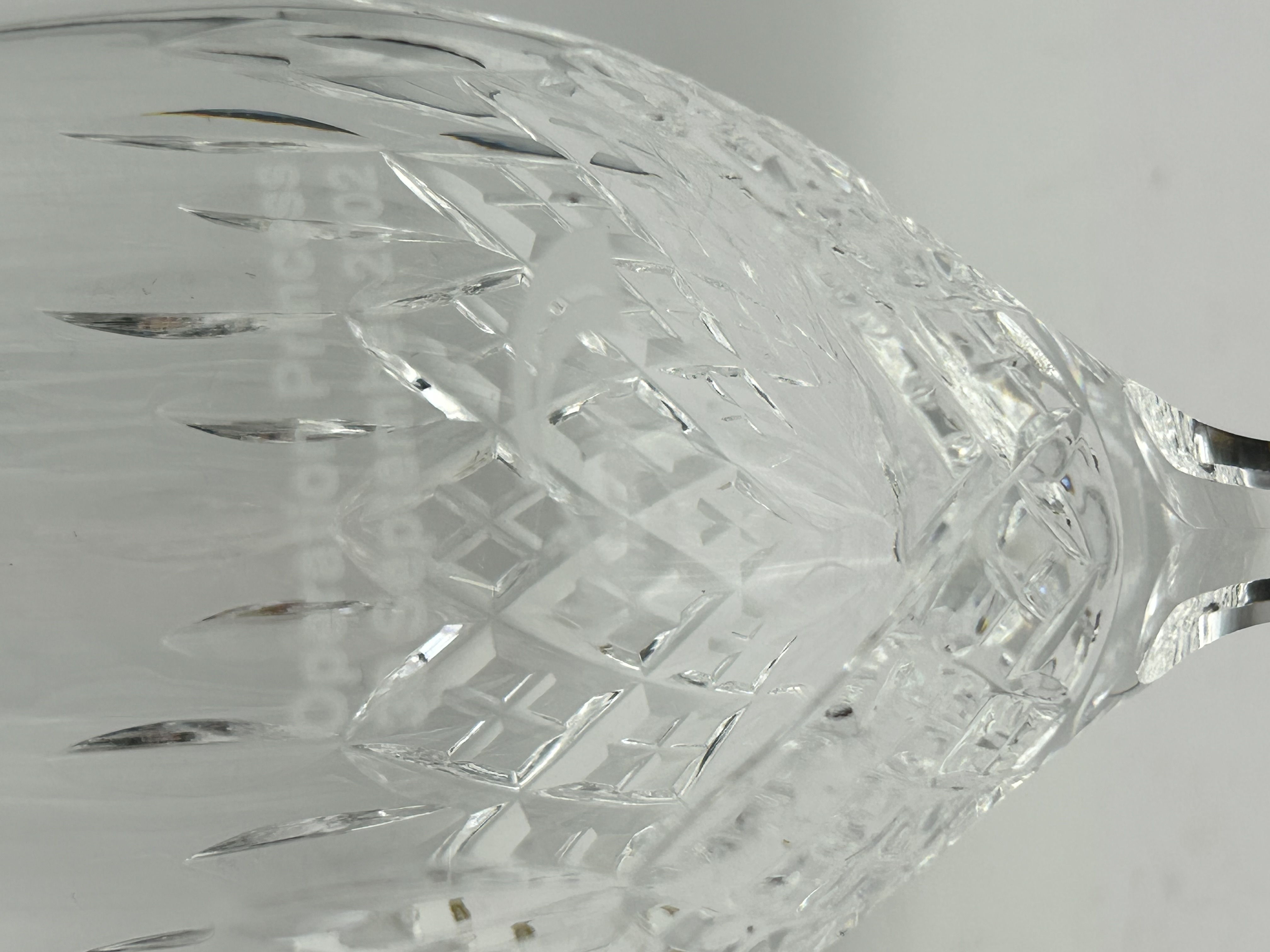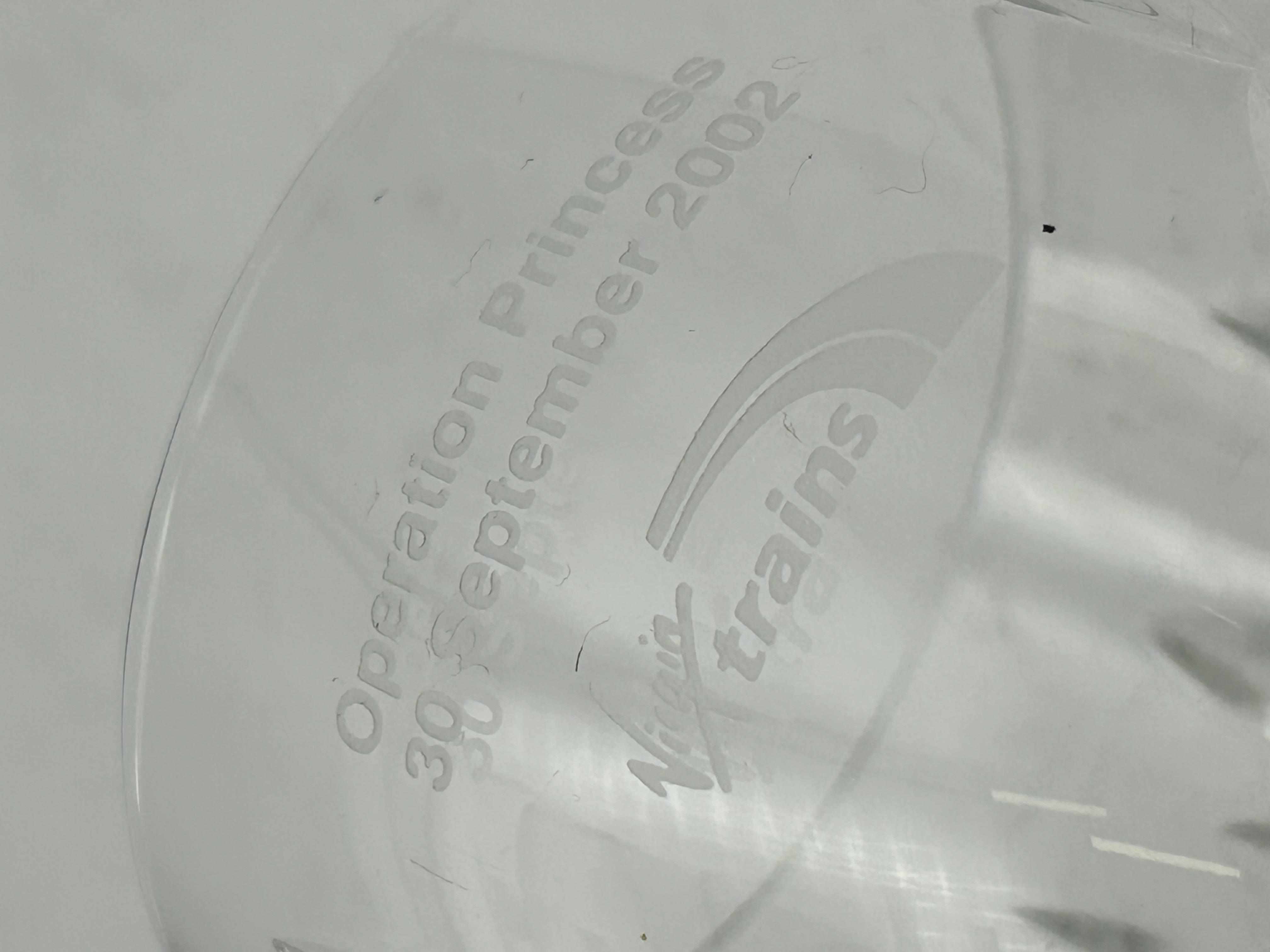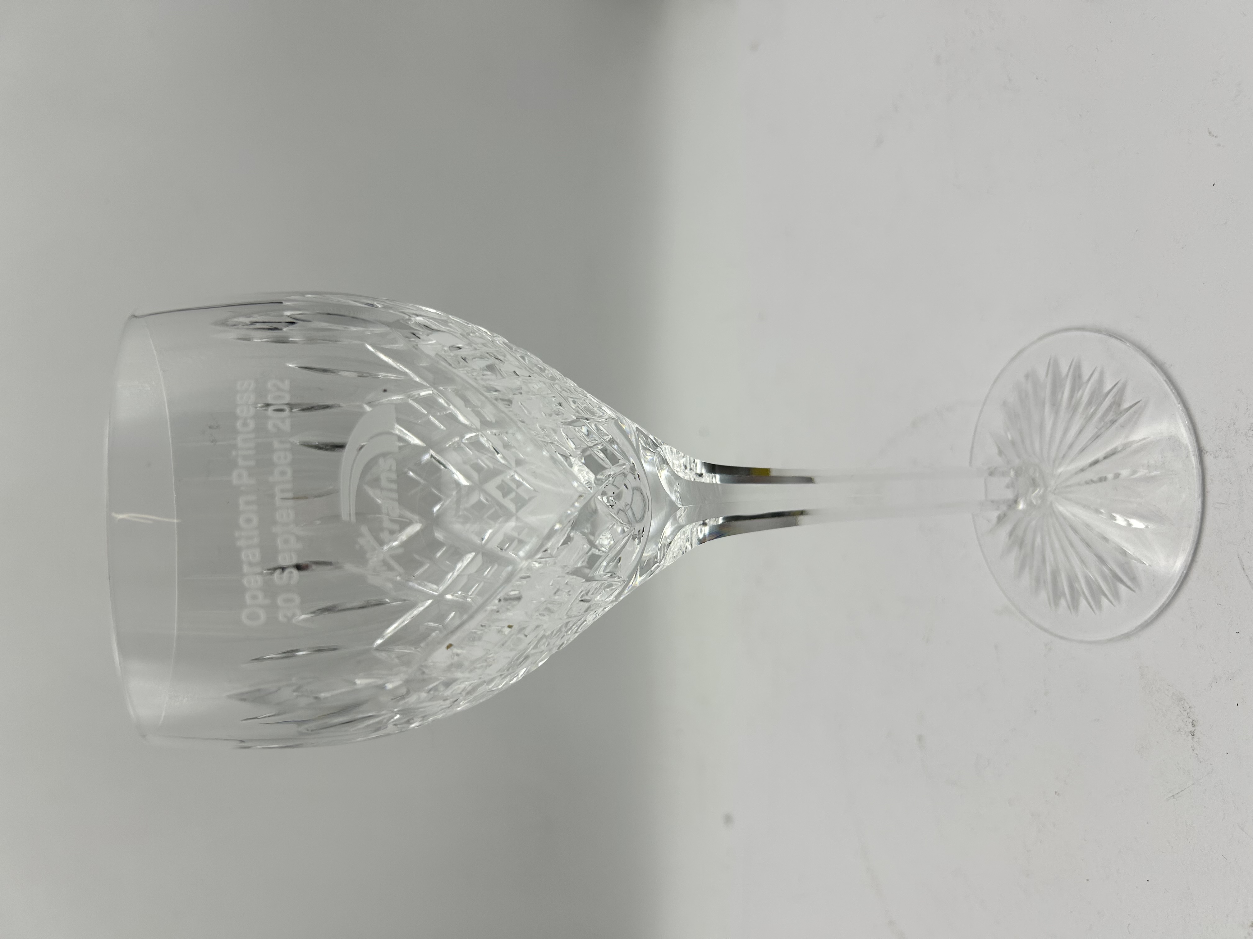 A single stemmed wine glass crafted from clear cut crystal in the Lismore pattern by Waterford. The bowl features the signature design of diamond and vertical wedge cuts. The circular foot is finished with a multi-point starburst motif. The upper portion of the bowl is etched with commemorative text reading Operation Princess / 30 September 2002 and includes the Virgin Trains corporate logo.