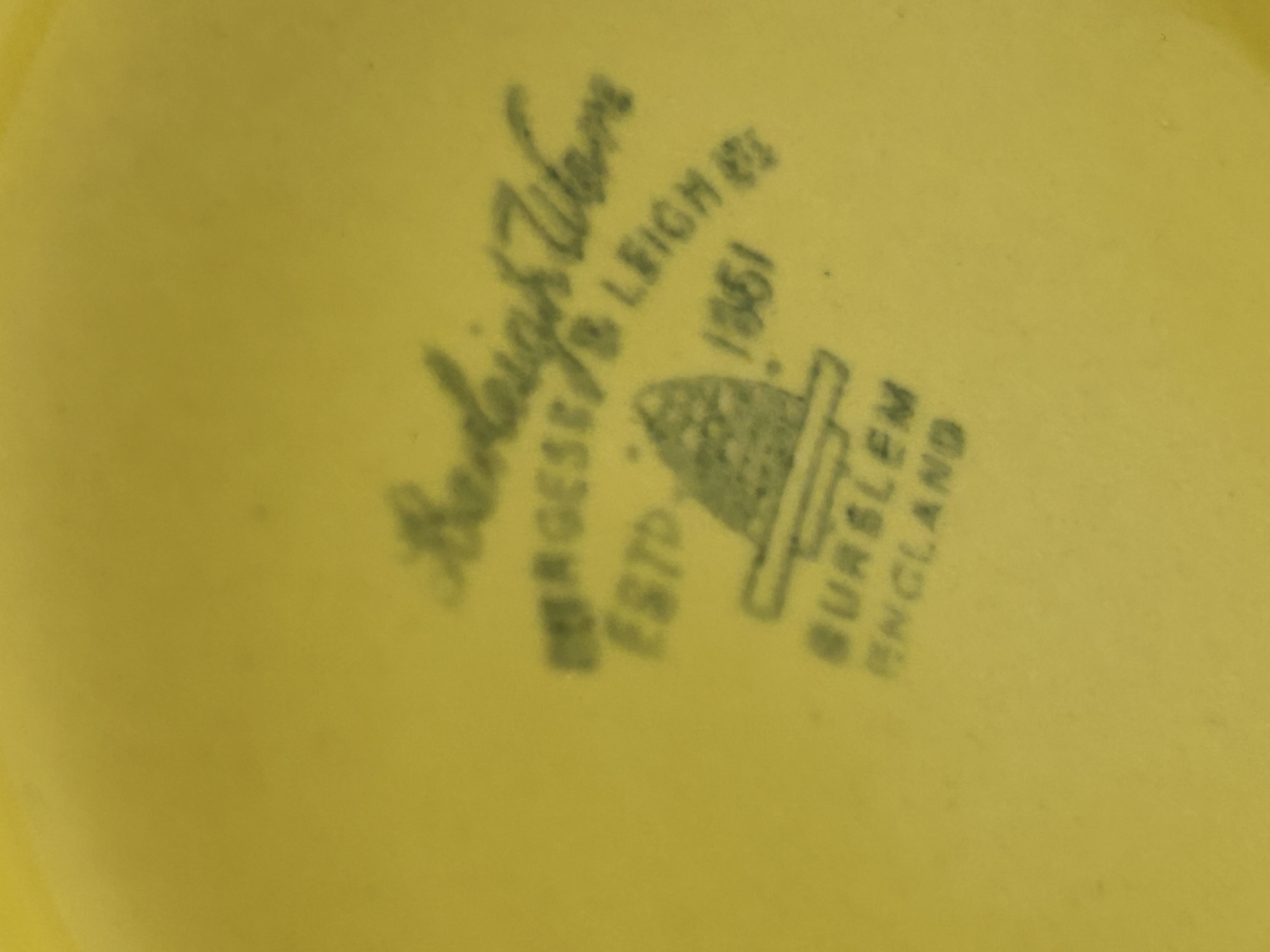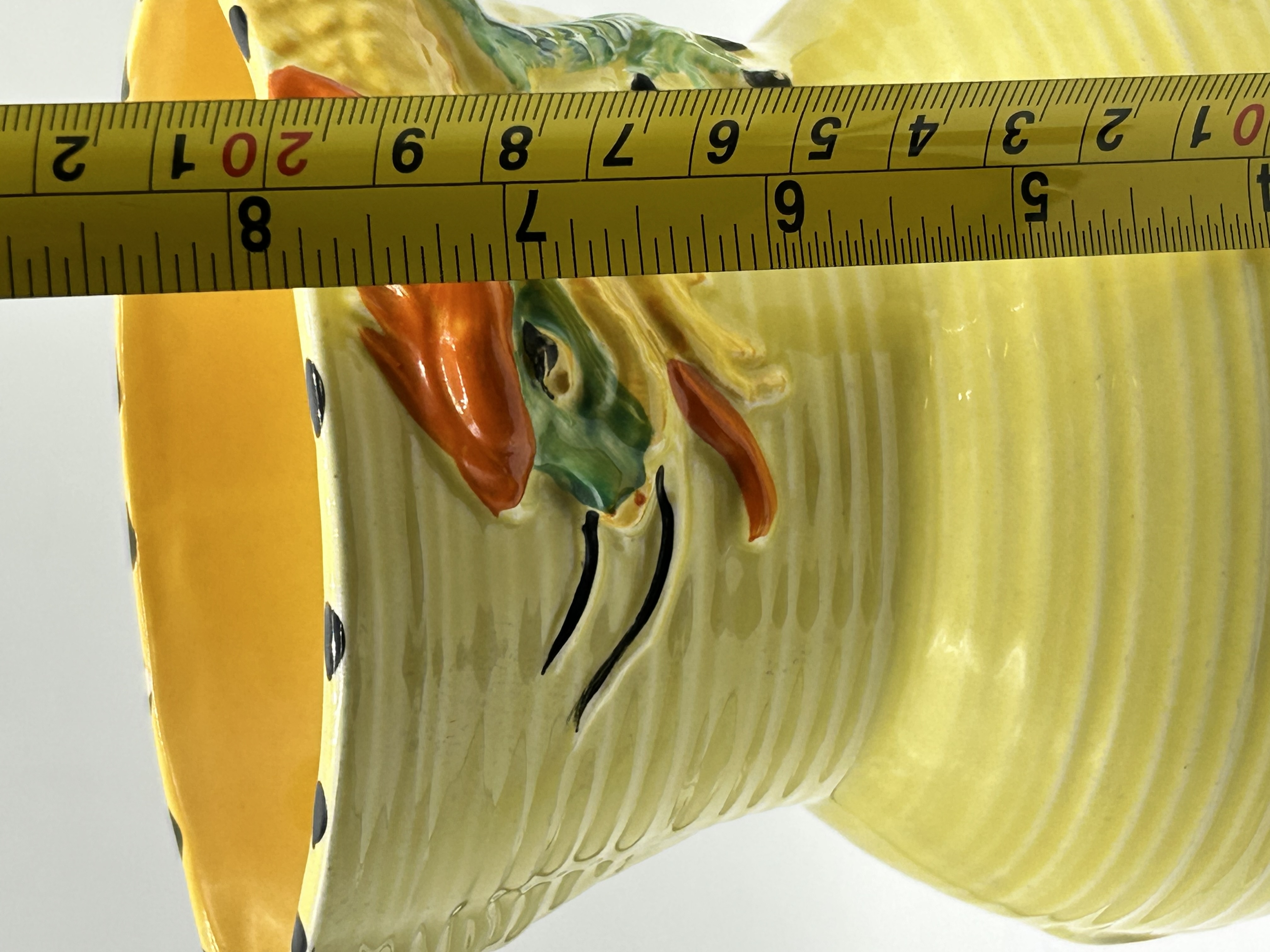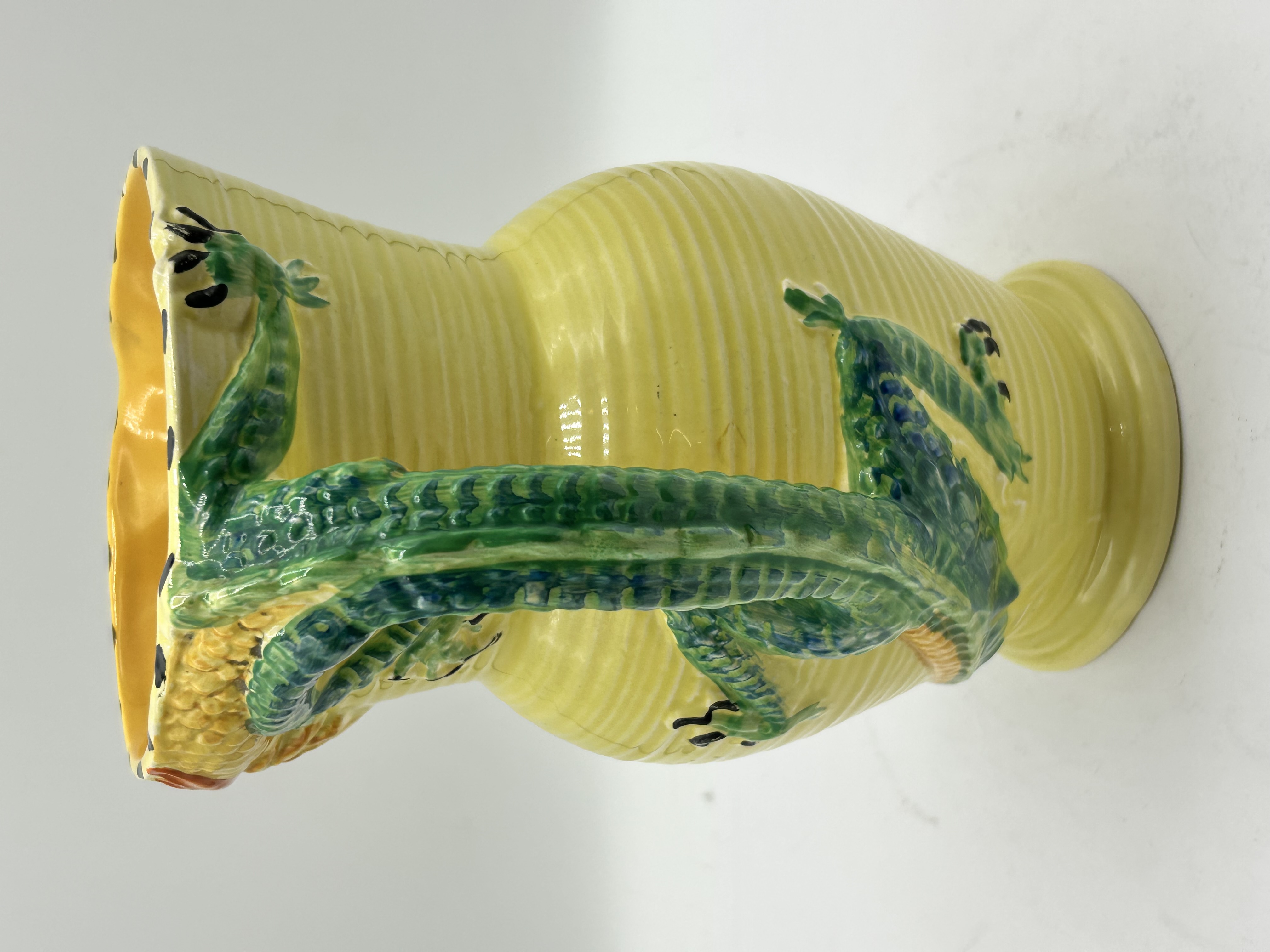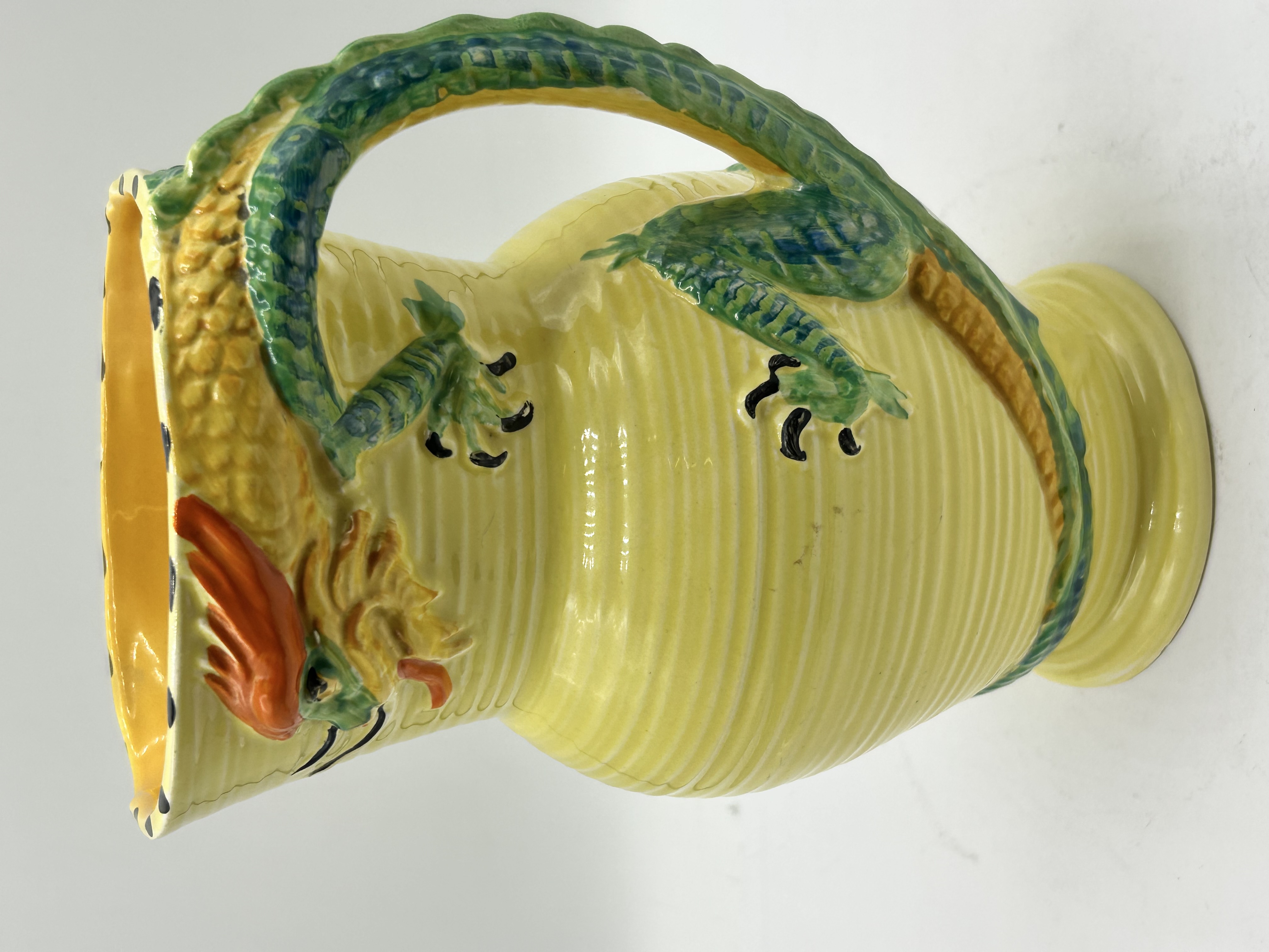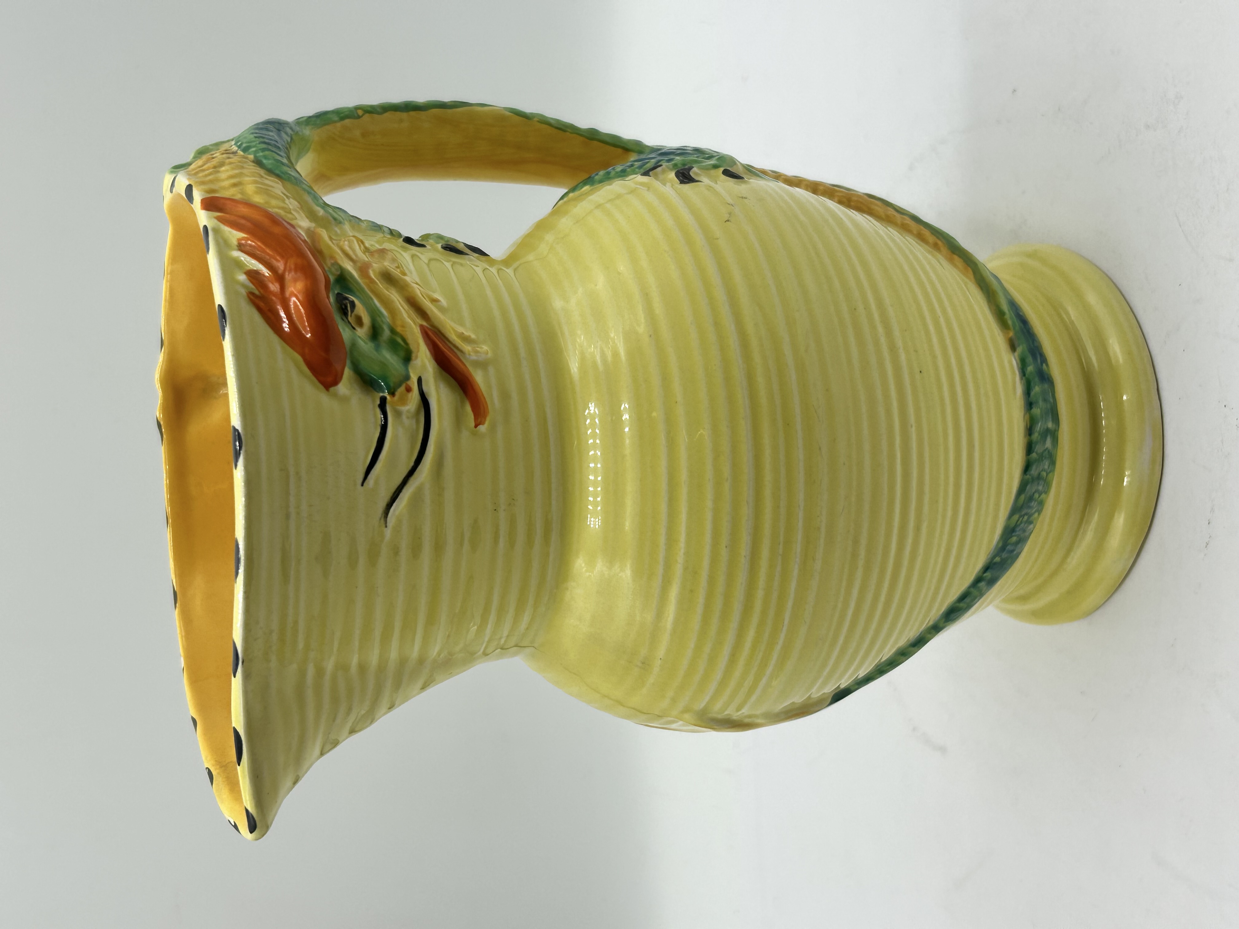 A Burleigh Ware Art Deco ceramic pitcher produced by Burgess and Leigh Ltd. of Burslem, England. The vessel features a horizontally ribbed body finished in a vibrant yellow glaze. A relief-molded dragon forms the handle and coils around the shoulder of the jug, decorated in polychrome glazes of green, orange, and yellow with black highlights. The interior rim is accented with a series of black spots. The underside is marked with a green printed beehive logo reading Burleigh Ware, Burgess and Leigh Ltd, ESTD 1851, Burslem England.
