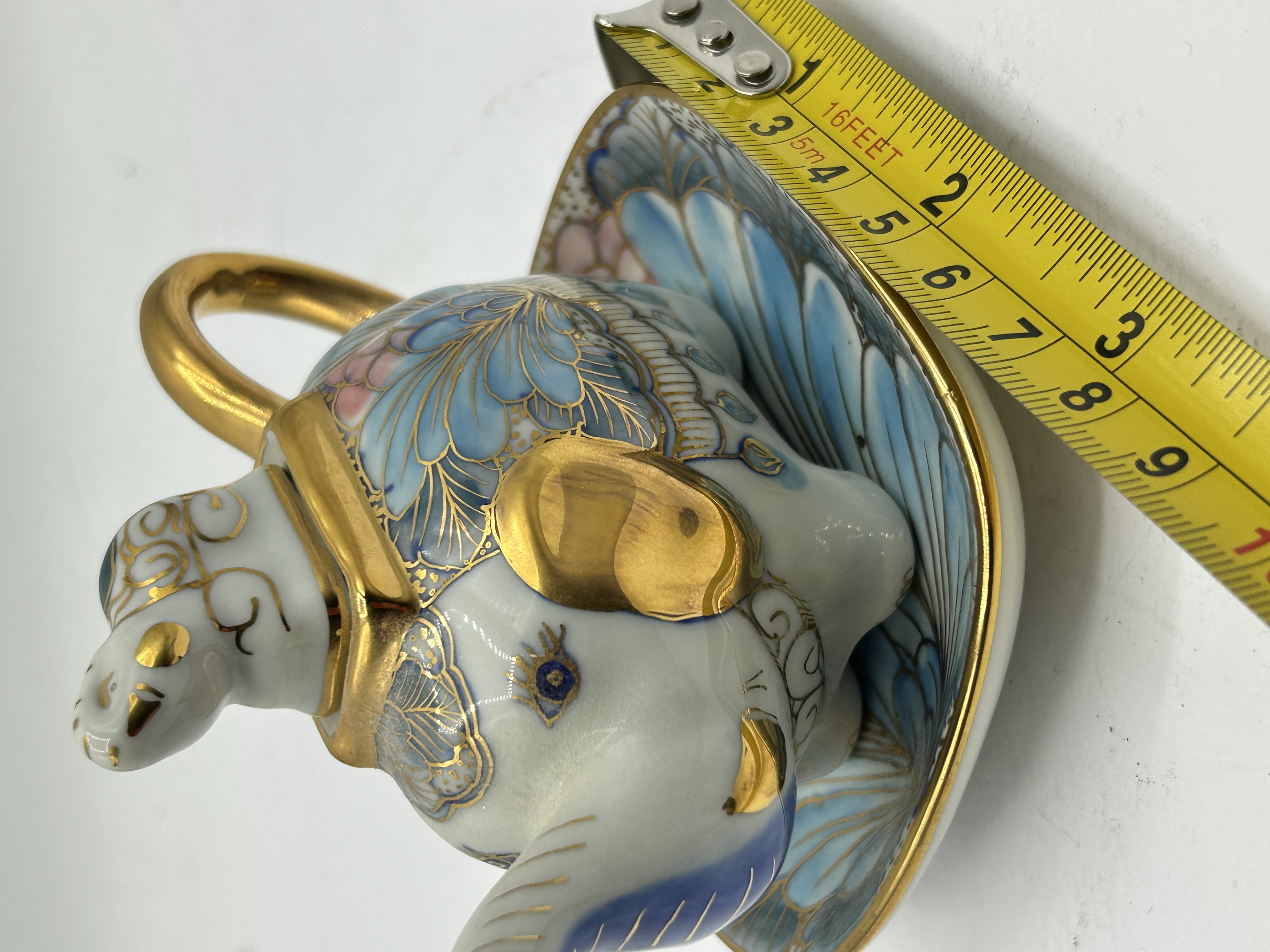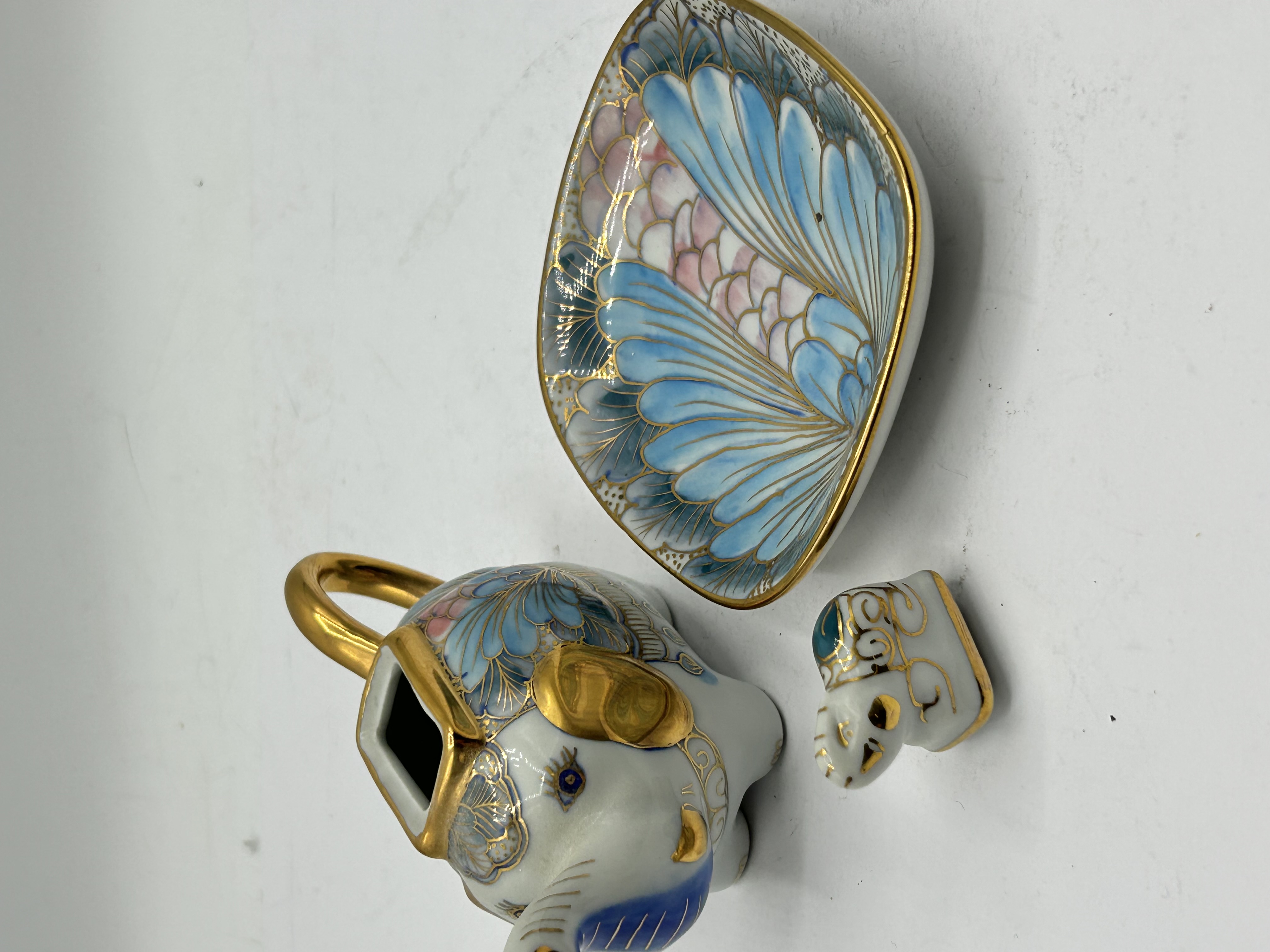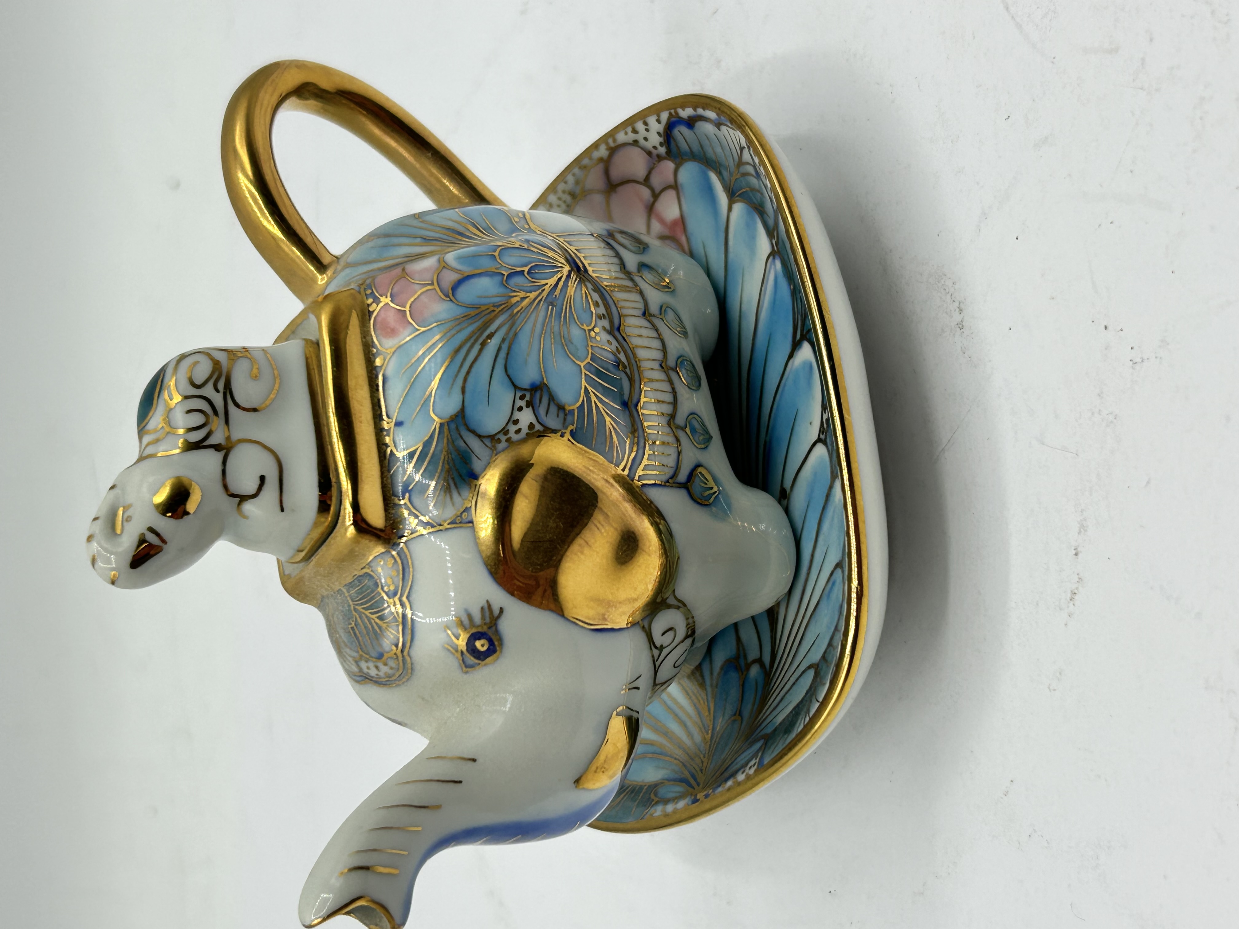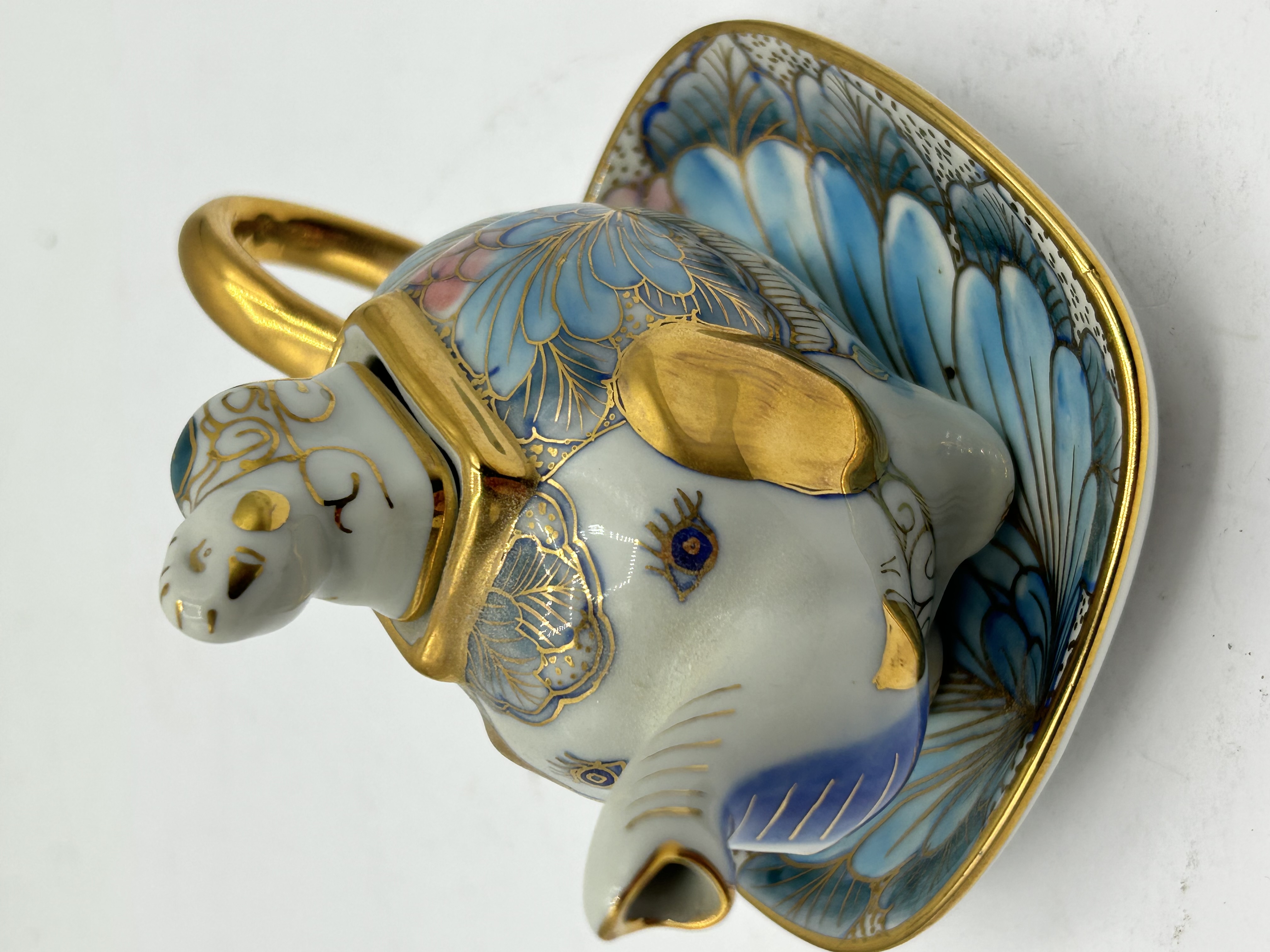 This miniature porcelain novelty teapot and matching saucer set is modeled in the form of a stylized elephant. The teapot is constructed with a trunk-form spout, a gilded loop handle, and a removable lid comprising the elephant head. The body and lid are decorated with hand-painted fan-shaped and floral motifs in shades of blue and pink, accented by gold-tone gilding. The accompanying saucer is designed in a complementary fan shape with matching decorative patterns and a gilded rim. No maker marks are visible on the underside of either piece.