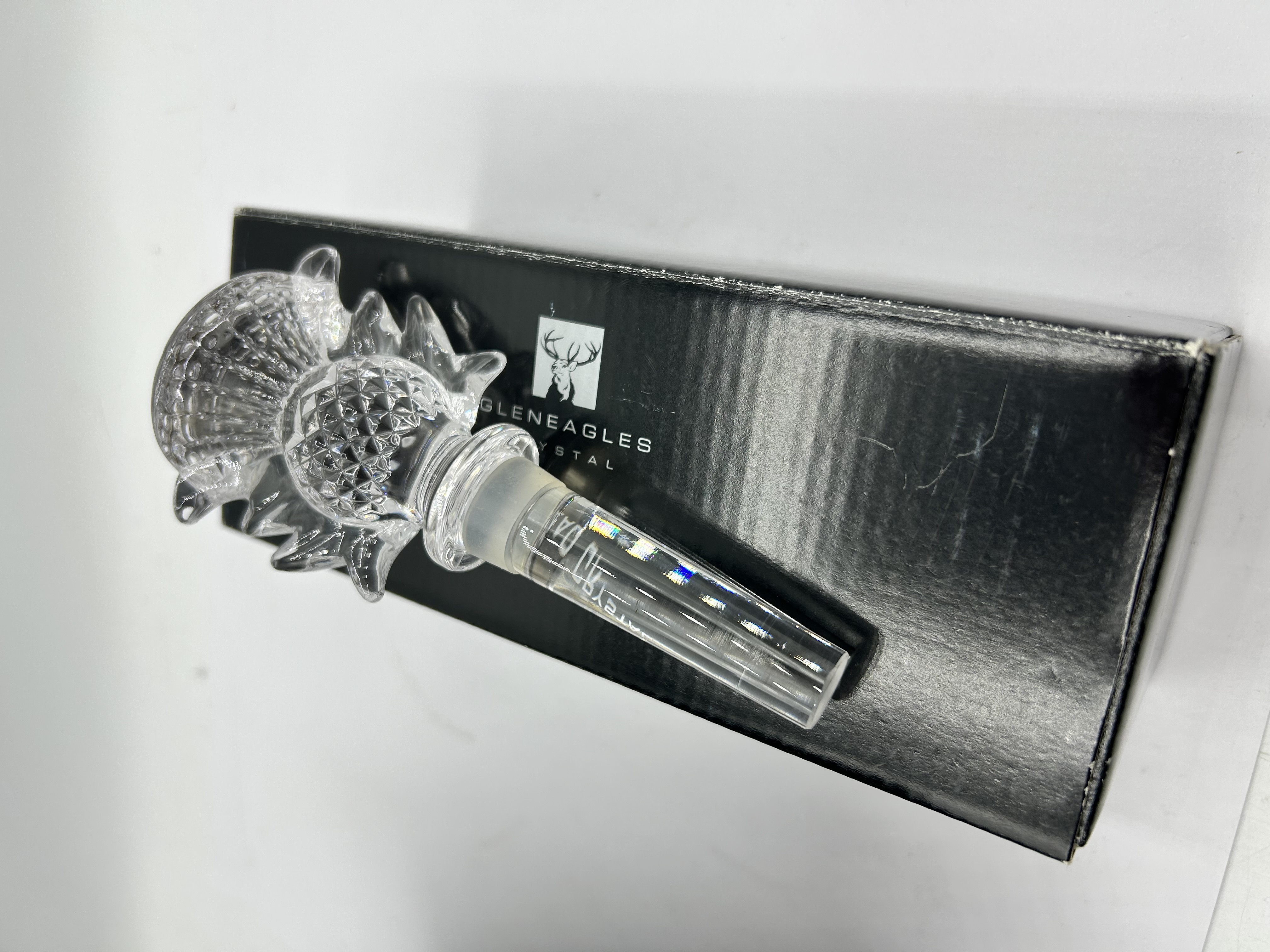 A Gleneagles Crystal bottle stopper featuring a decorative finial in the form of a Scottish thistle. The piece is constructed from 24 percent lead crystal and exhibits diamond-cut and fluted detailing. The stopper retains its original holographic label on the stem reading GLENEAGLES CRYSTAL SCOTLAND. It is accompanied by its original black presentation box featuring the company stag logo and text specifying the lead crystal content.