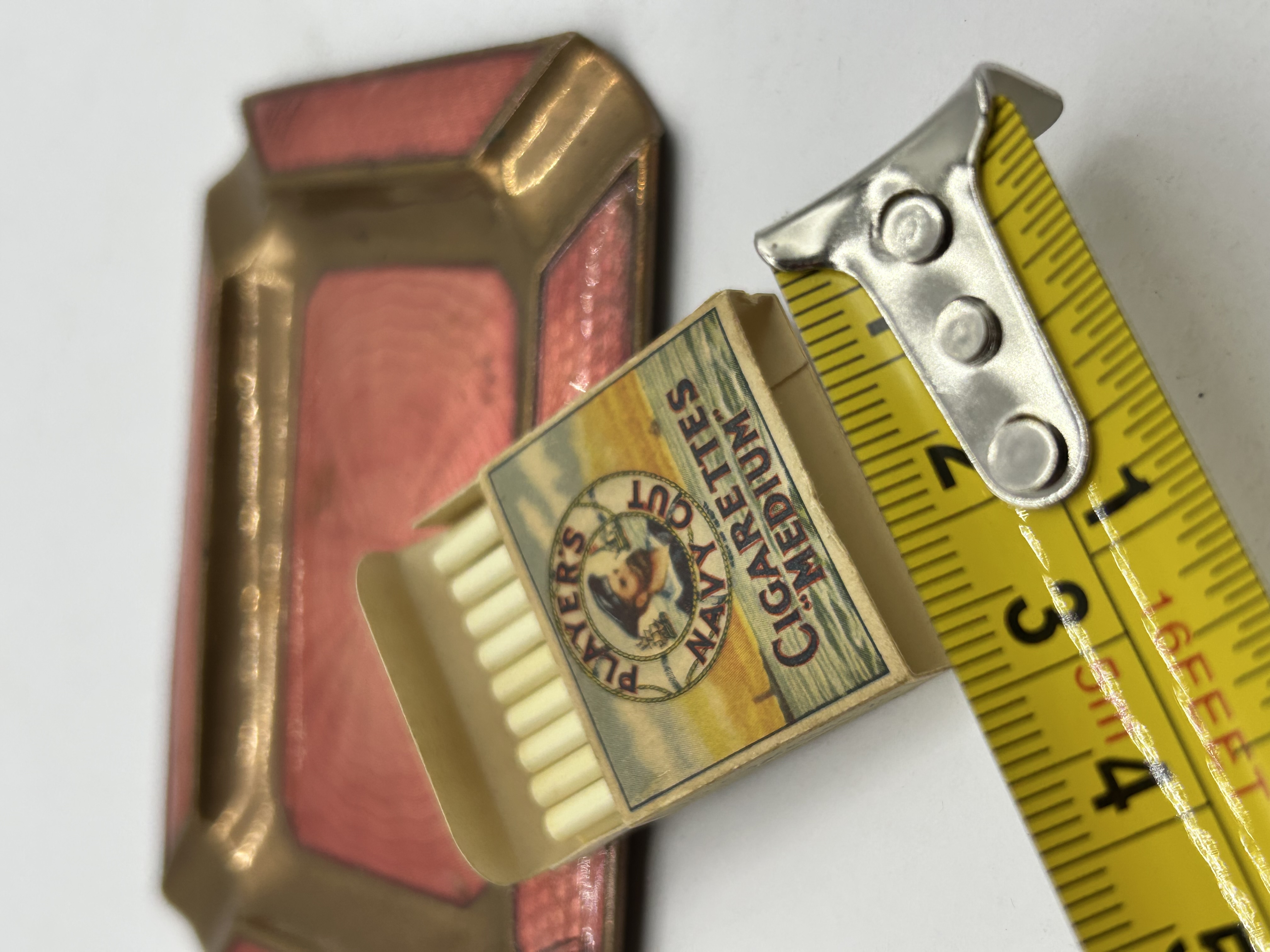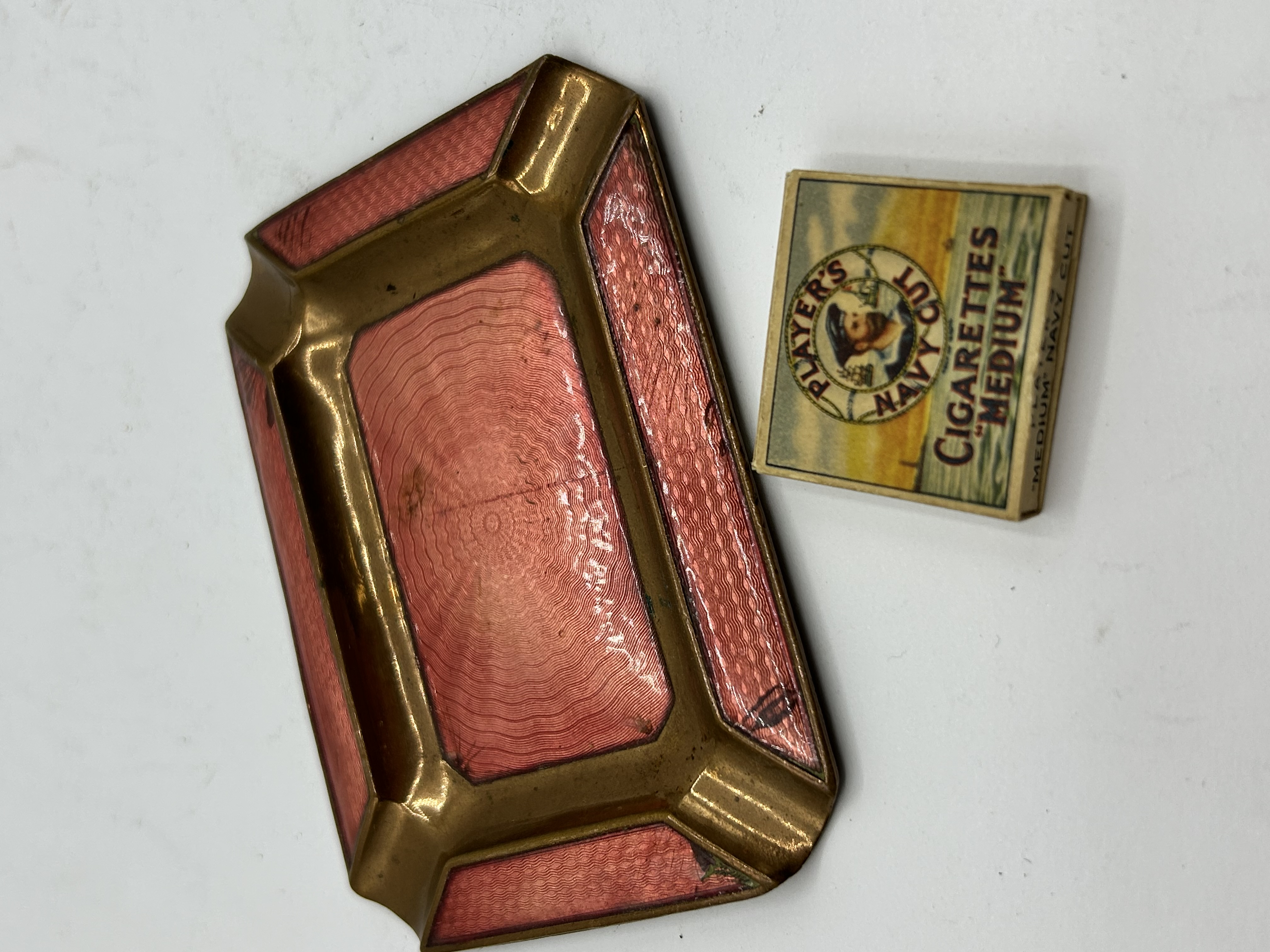 A collection of two smoking accessories. The first is a rectangular ashtray constructed from gold-toned metal with inset panels of pink guilloché enamel. The enamel features a circular engine-turned pattern. The ashtray features four cigarette rests, one at each corner. The second item is a miniature replica cigarette pack for Player’s Navy Cut Medium cigarettes, featuring the brand’s sailor logo and containing several off-white replica cigarettes.