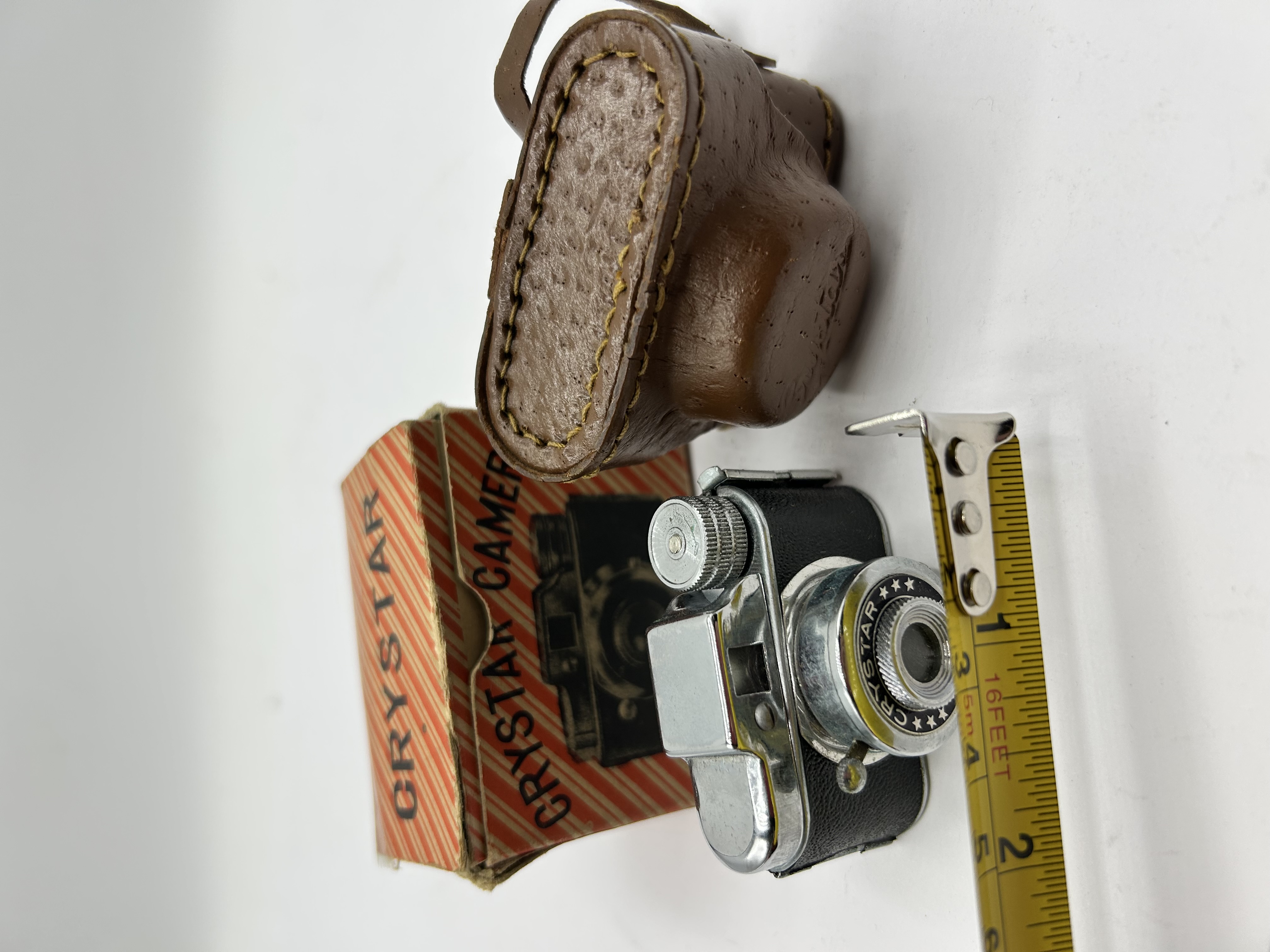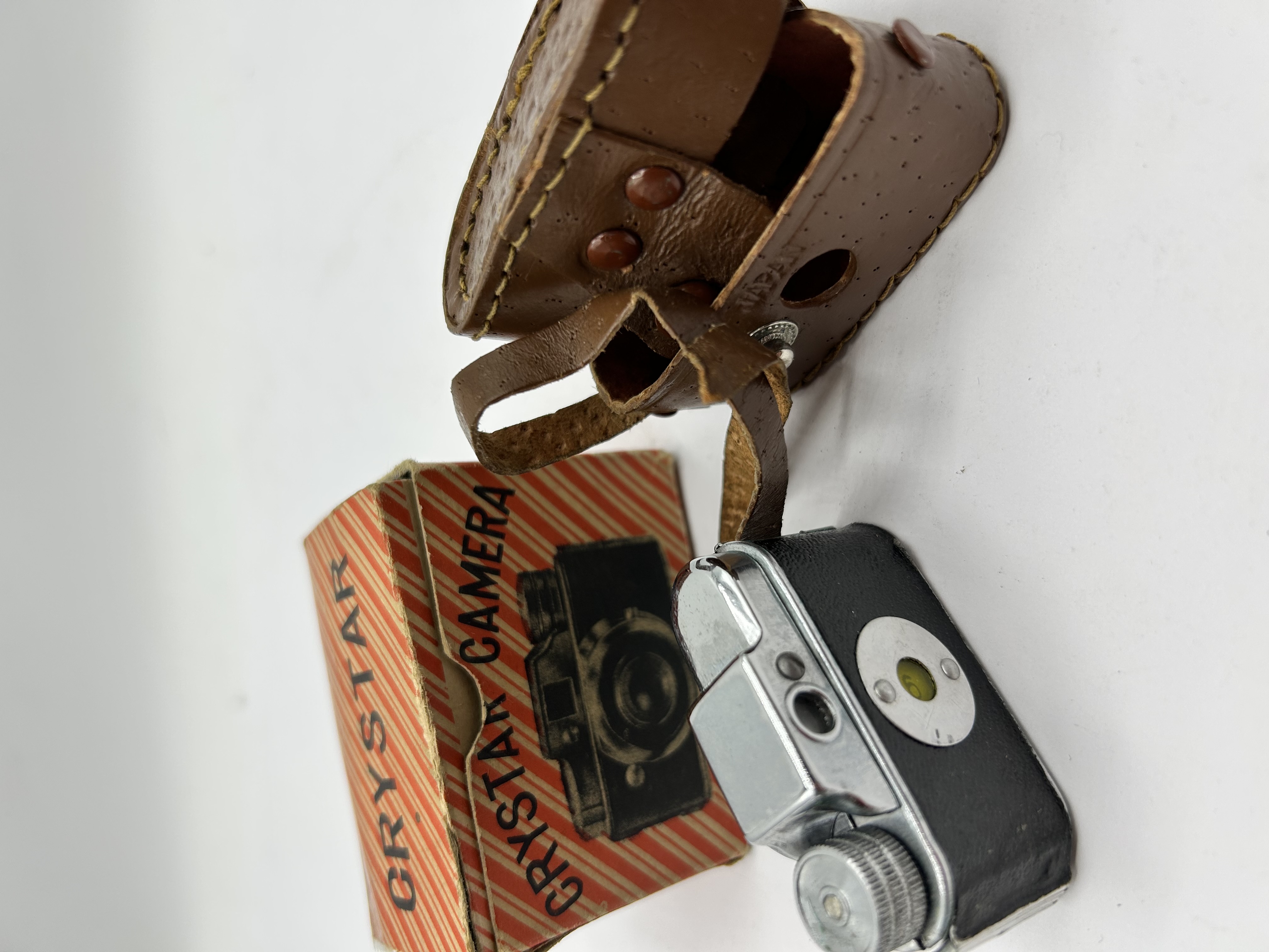 A Crystar hit-type subminiature spy camera. This Japanese-made camera features a chrome-finished metal body with black leatherette panels. The lens barrel is prominently marked CRYSTAR and accented with a series of stars. The camera is accompanied by its original textured brown leather carrying case, which is embossed with JAPAN on the base. Also included is the original red and white striped cardboard box featuring the Crystar branding and an illustration of the camera.