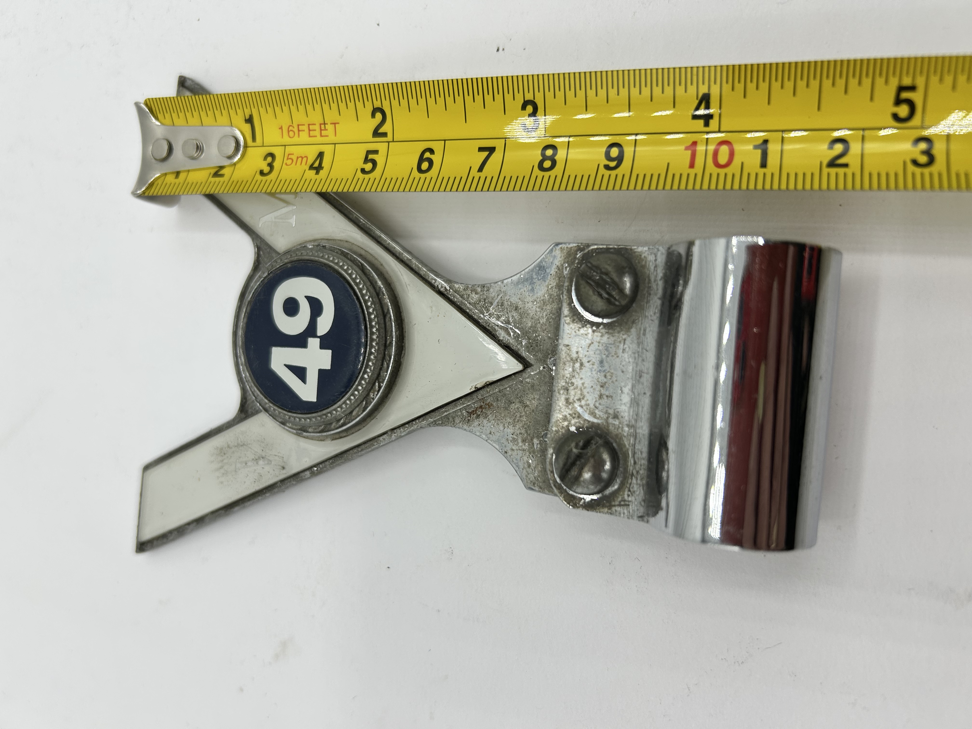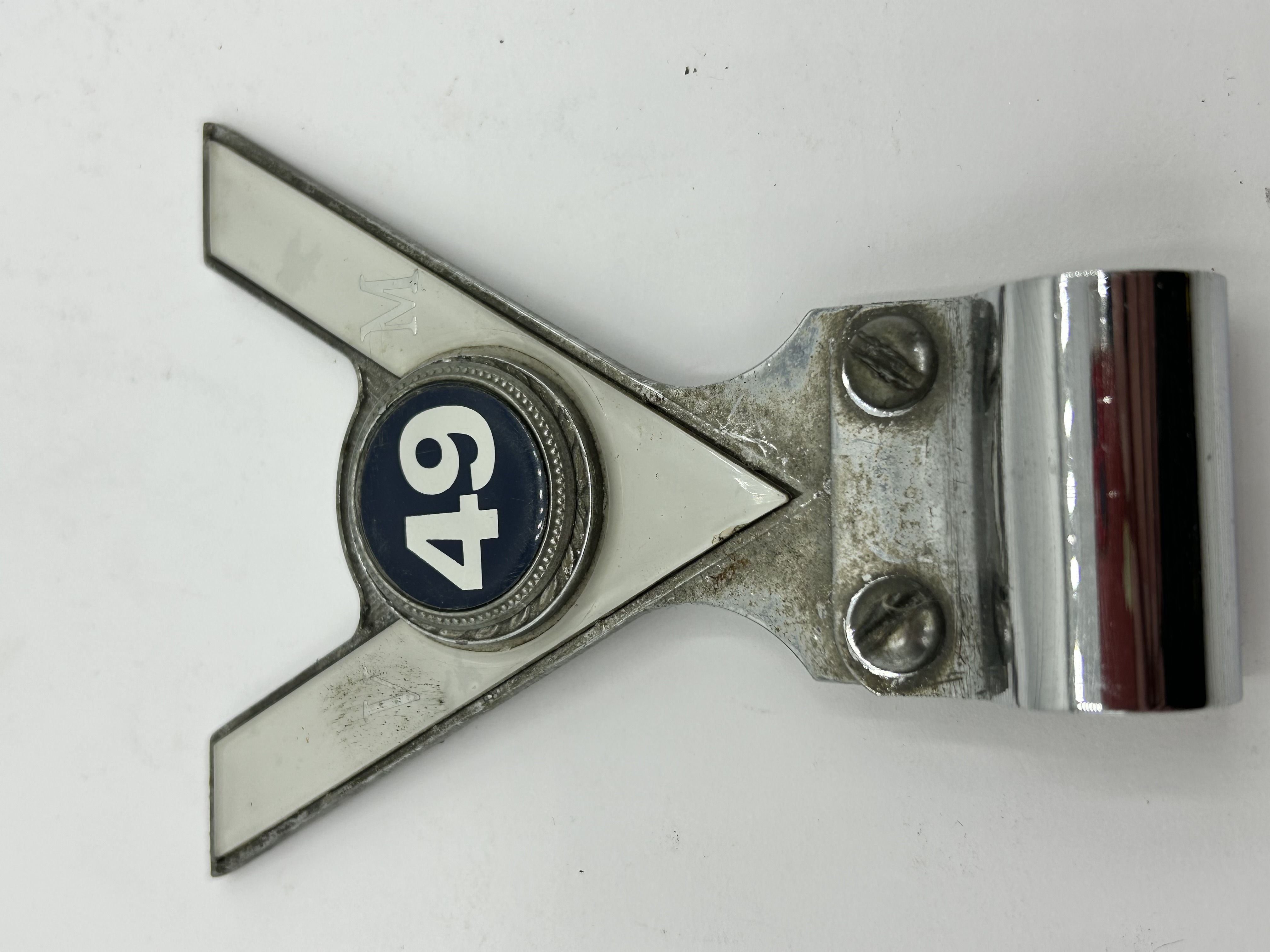 A Veteran Motorists Association 49 Year Club car badge emblem. The piece is constructed from chrome-plated metal with white-inlaid V-shaped arms. A central dark blue circular medallion features the white numeral 49. Embossed letters M and V are visible on the upper and lower arms respectively. The emblem is attached to a cylindrical mounting bracket by two flat-head screws.