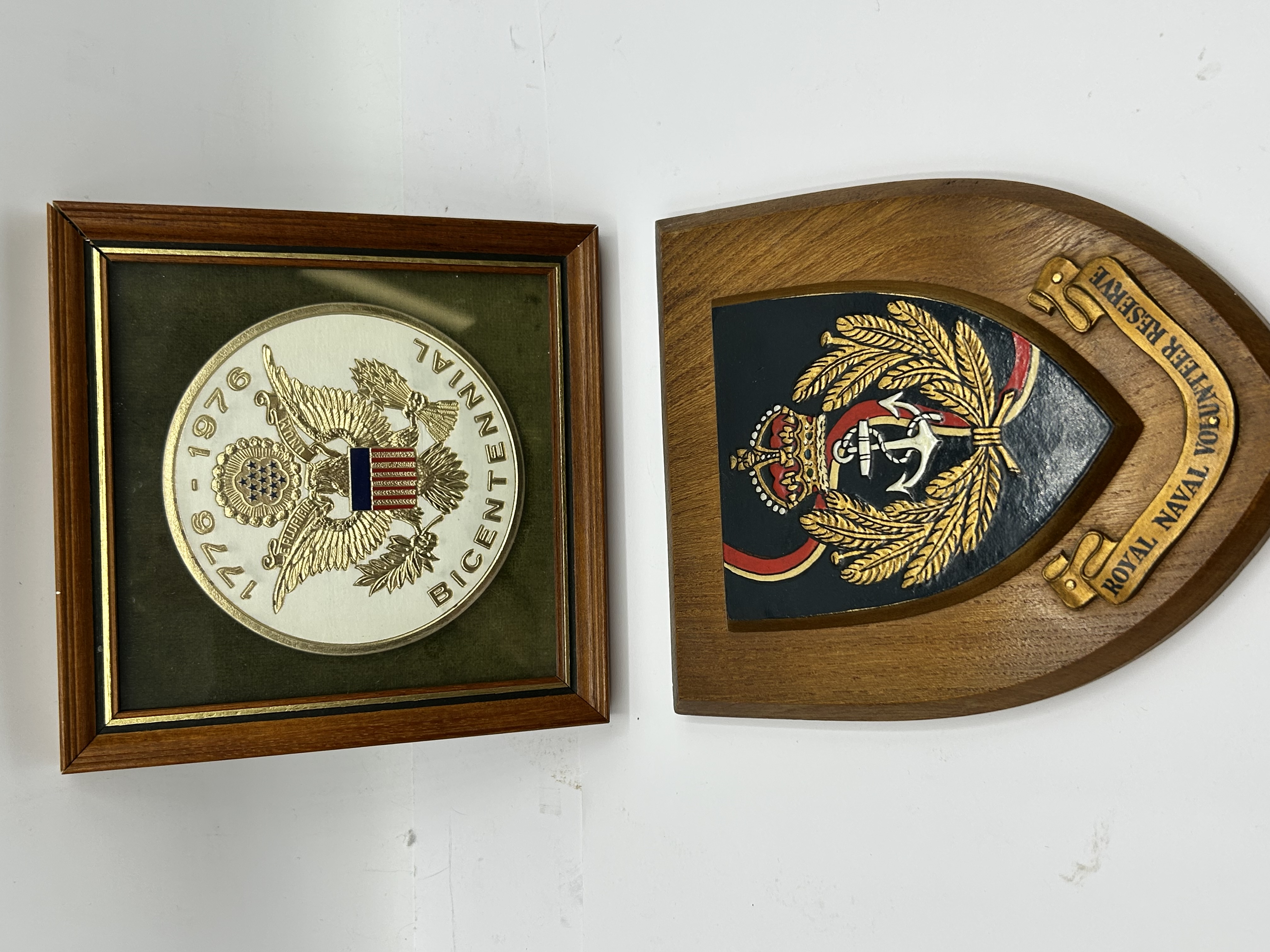A group of two wall plaques comprising a British naval heraldic shield and an American commemorative piece. The first is a shield-shaped wooden plaque for the Royal Naval Volunteer Reserve featuring a dimensional, painted crest with a crown, anchor, and laurel wreath above a gold-toned scroll. The second is a framed United States Bicentennial commemorative piece featuring a gold-toned medallion with the Great Seal and the dates 1776-1976 mounted against a green velvet background in a wood frame.