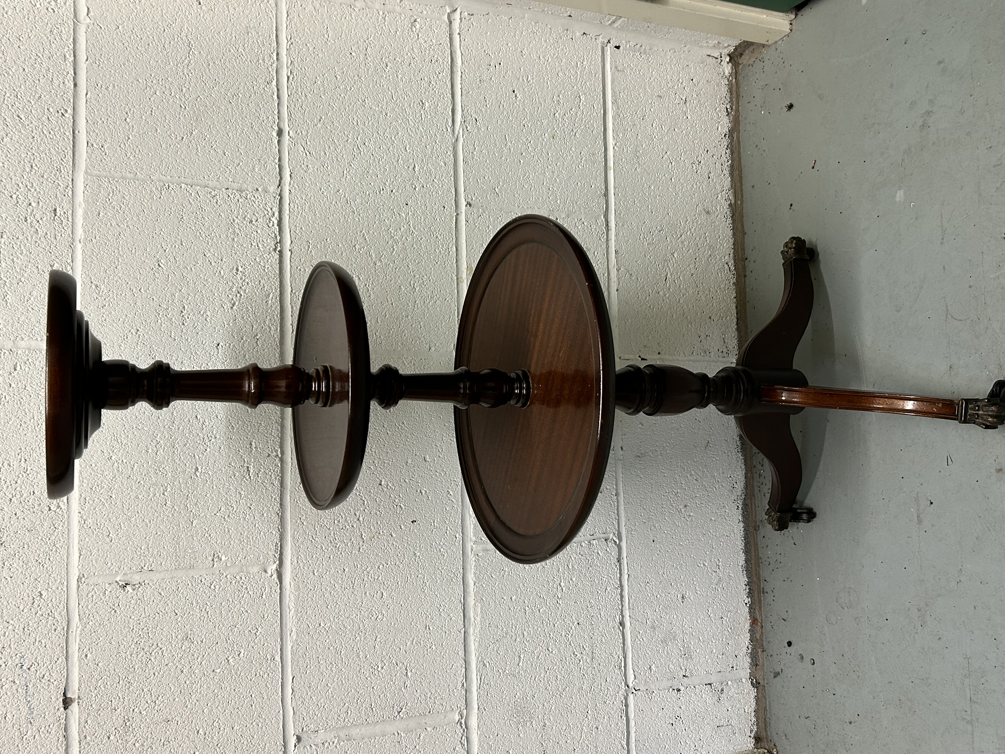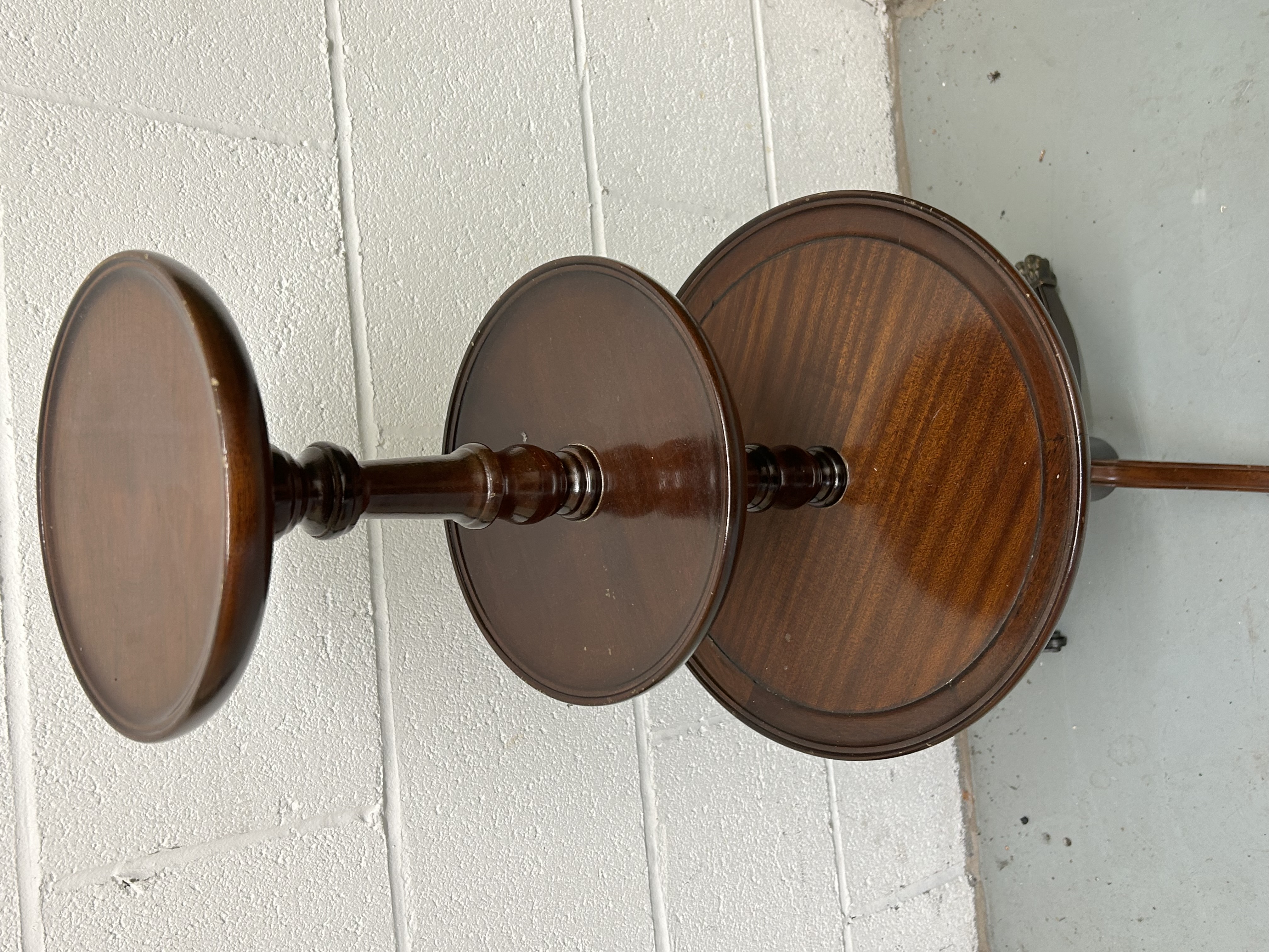 A traditional three tier mahogany dumbwaiter featuring three circular tiers of graduated diameter. The 36 inch tall piece is supported by a central turned pedestal column. The unit stands on a tripod base with reeded out-swept legs, each terminating in decorative brass-toned metal paw feet fitted with casters. The mahogany wood displays a polished finish with visible grain. No maker marks are present.