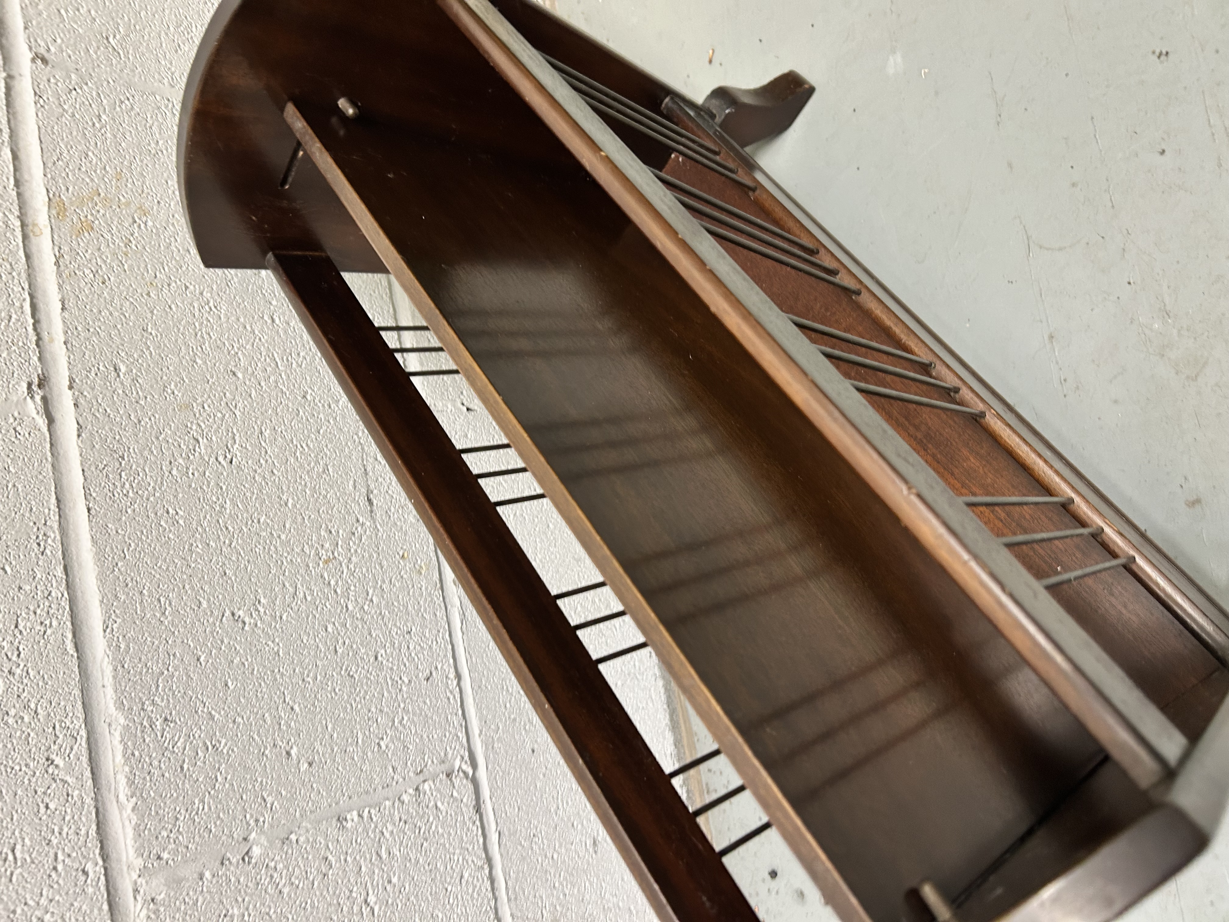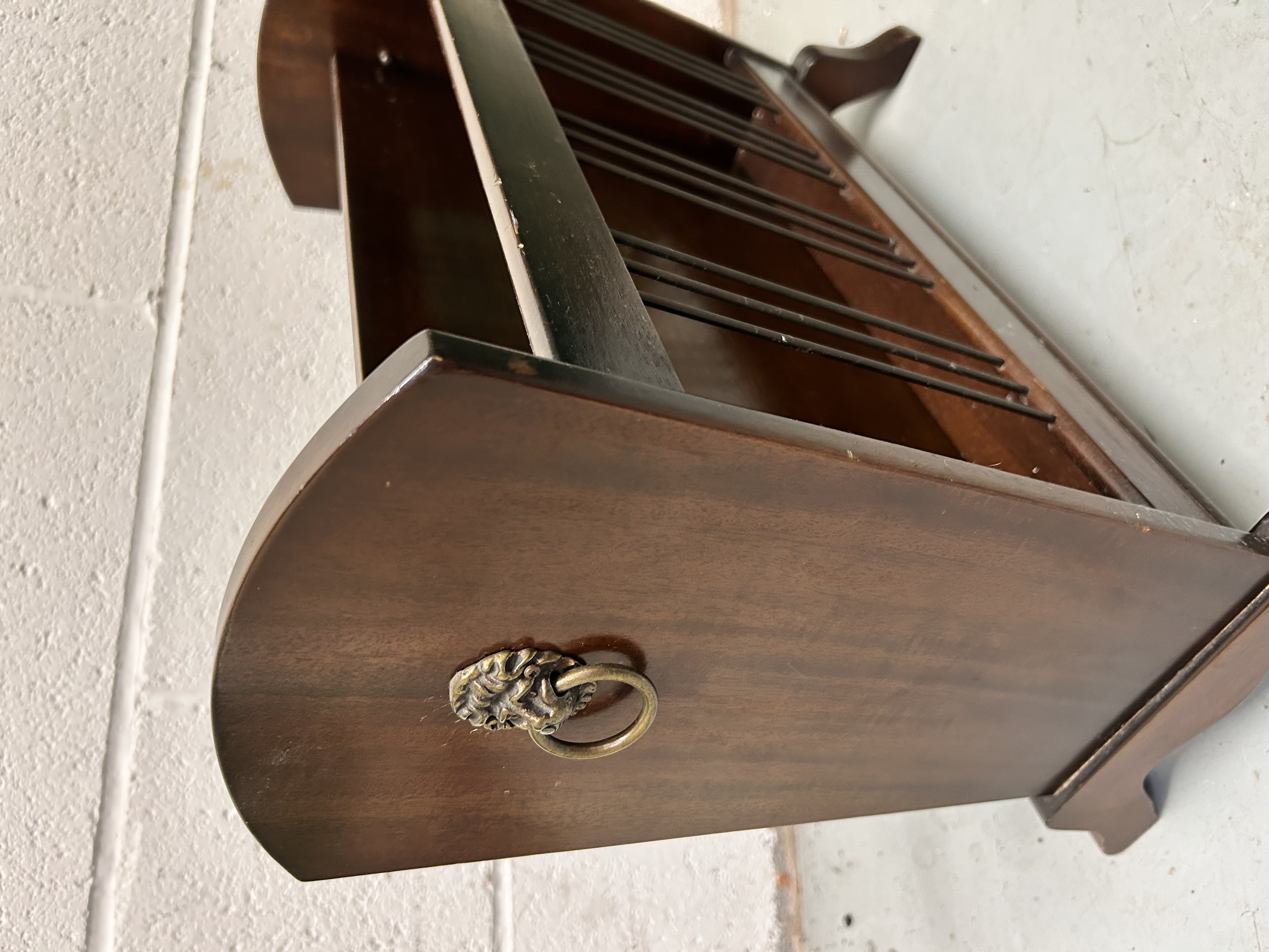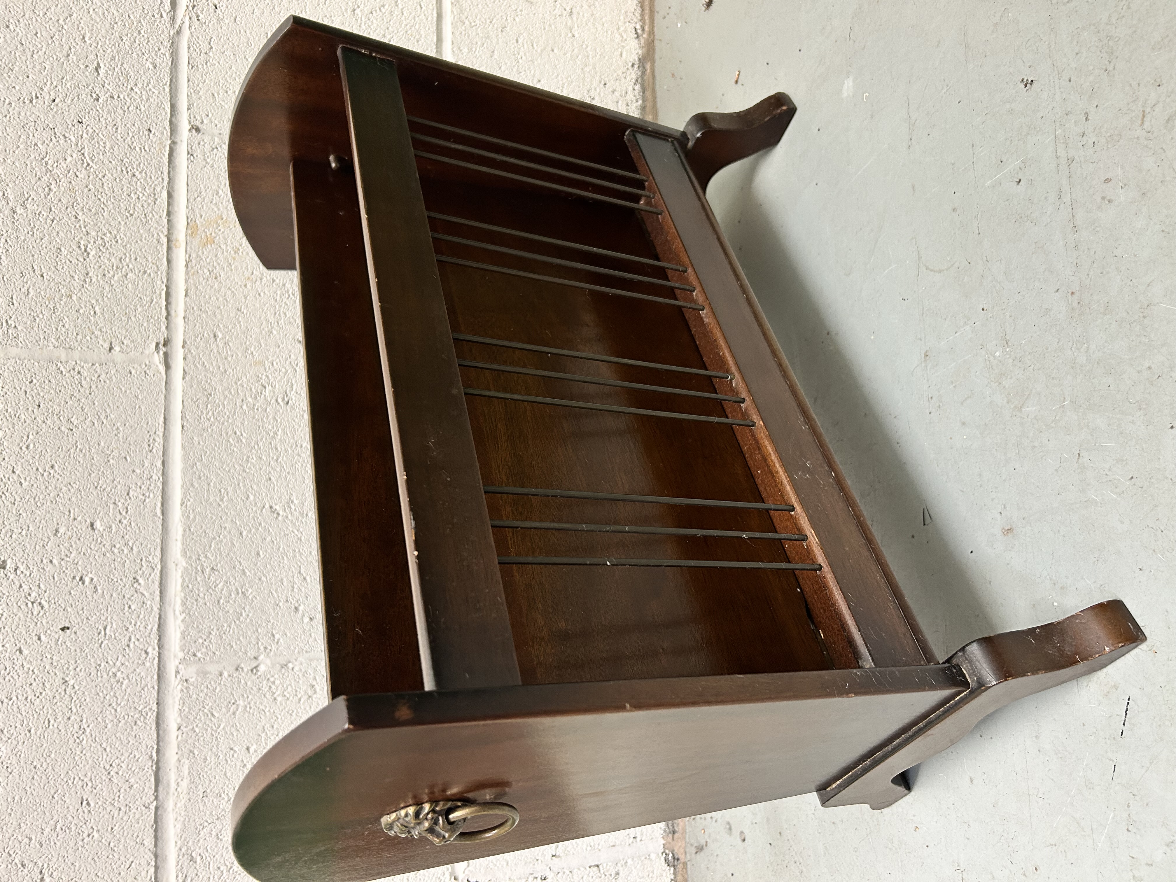 A mid-century style magazine or sheet music rack constructed from wood with a dark mahogany-toned finish. The unit features a 36-inch length and is divided into two storage compartments by a central wooden panel. Each compartment contains multiple thin metal rod dividers for organization. The piece is designed with curved side panels, one of which is adorned with a decorative brass-toned lion’s head ring pull. The structure is supported by four splayed legs with a subtle cabriole curve.