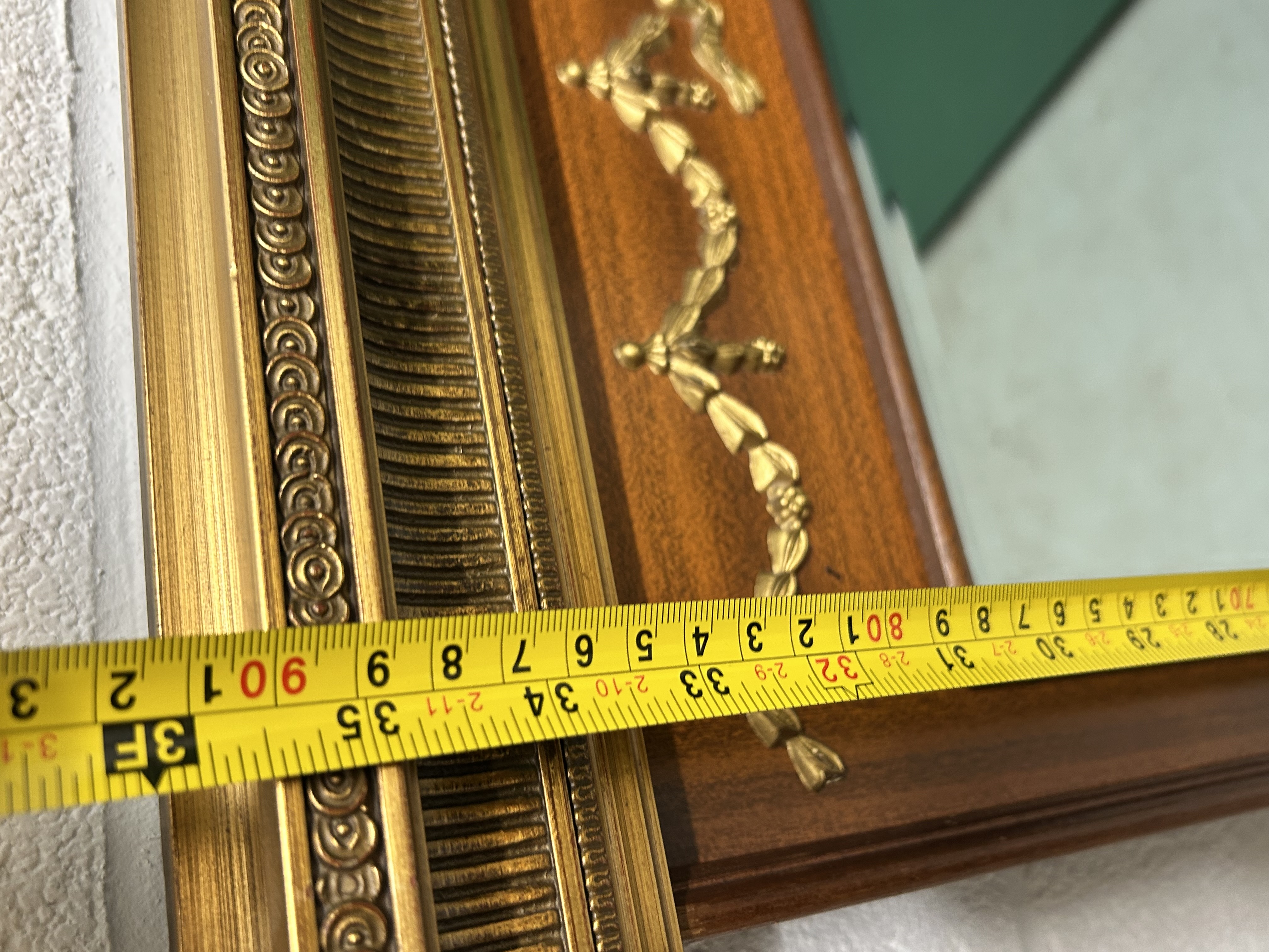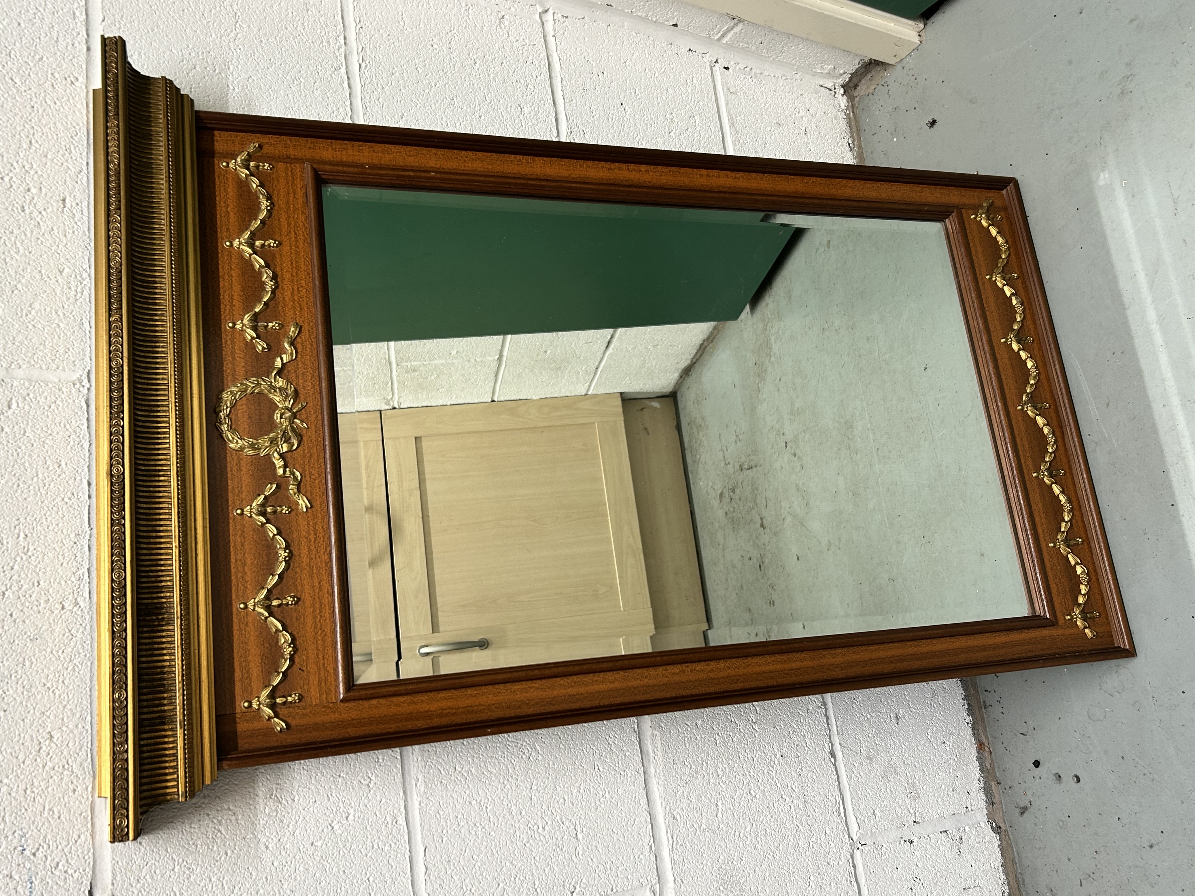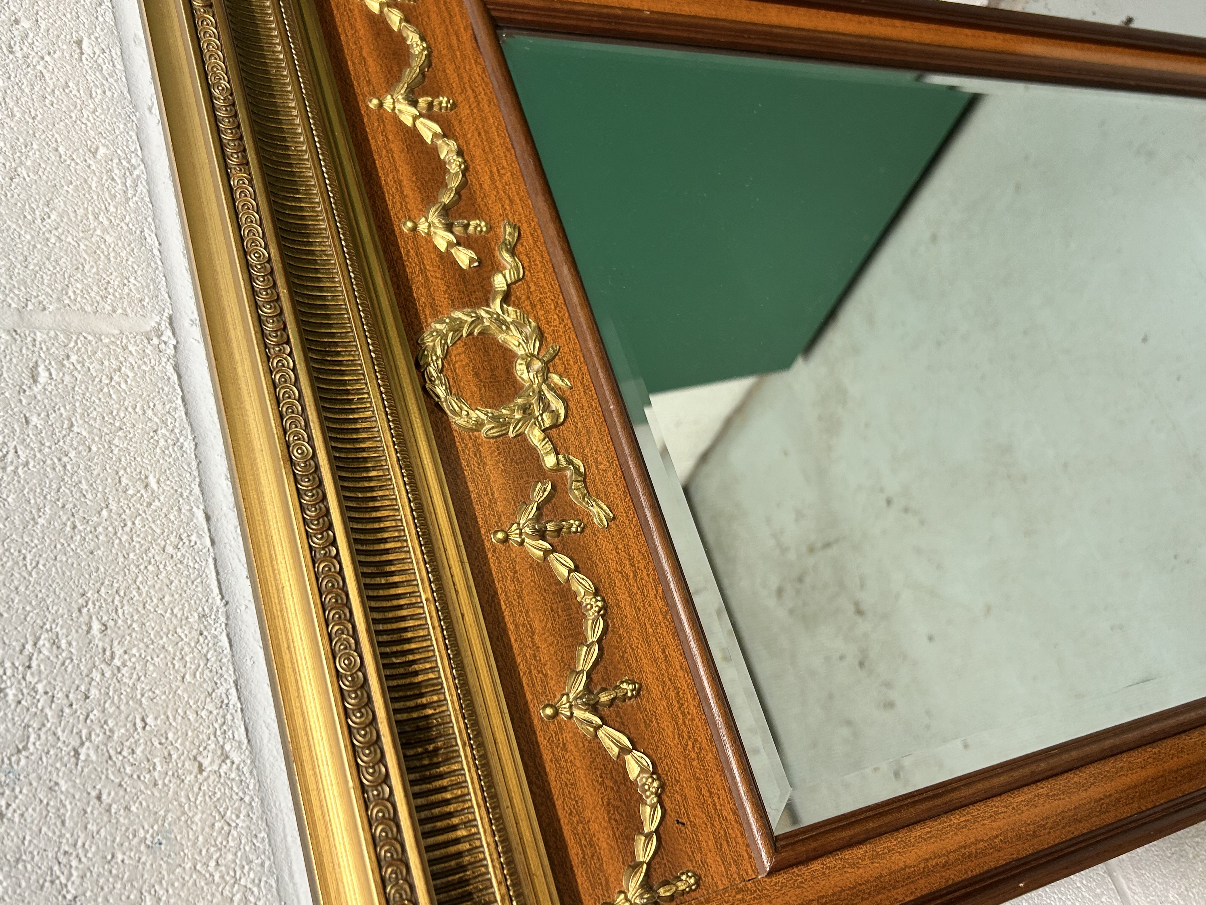 This rectangular wall mirror is constructed with a mahogany frame and features gilded metal or composition appliqués in the Neoclassical taste. The upper section is surmounted by a heavily molded and gilded cornice with scroll and beadwork detailing. Below the cornice, the frame is decorated with classical motifs including a central laurel wreath flanked by floral swags and bows. The beveled mirror plate is set within a simple molded inner border. The side rails are further embellished with vertical foliate swags.