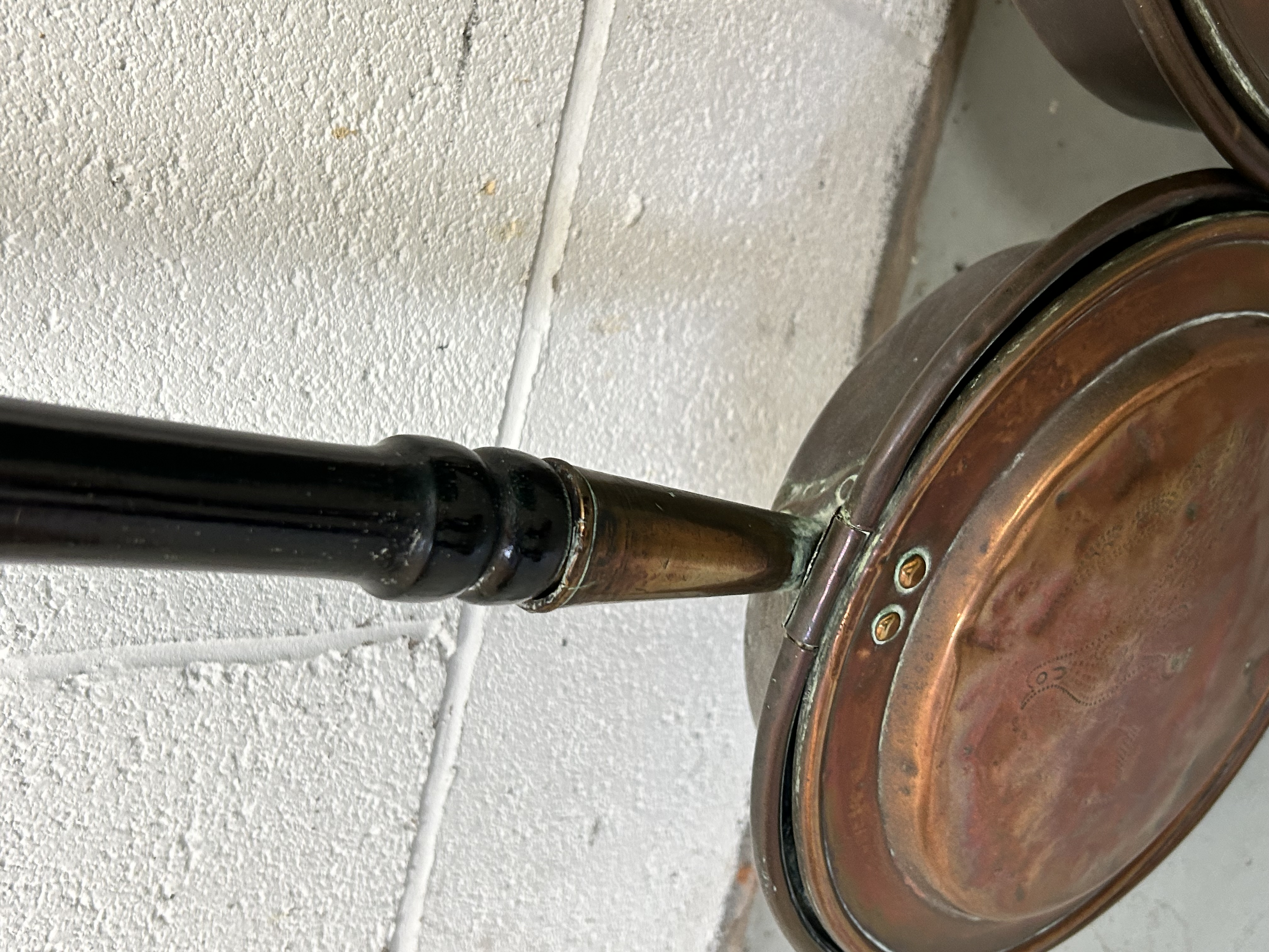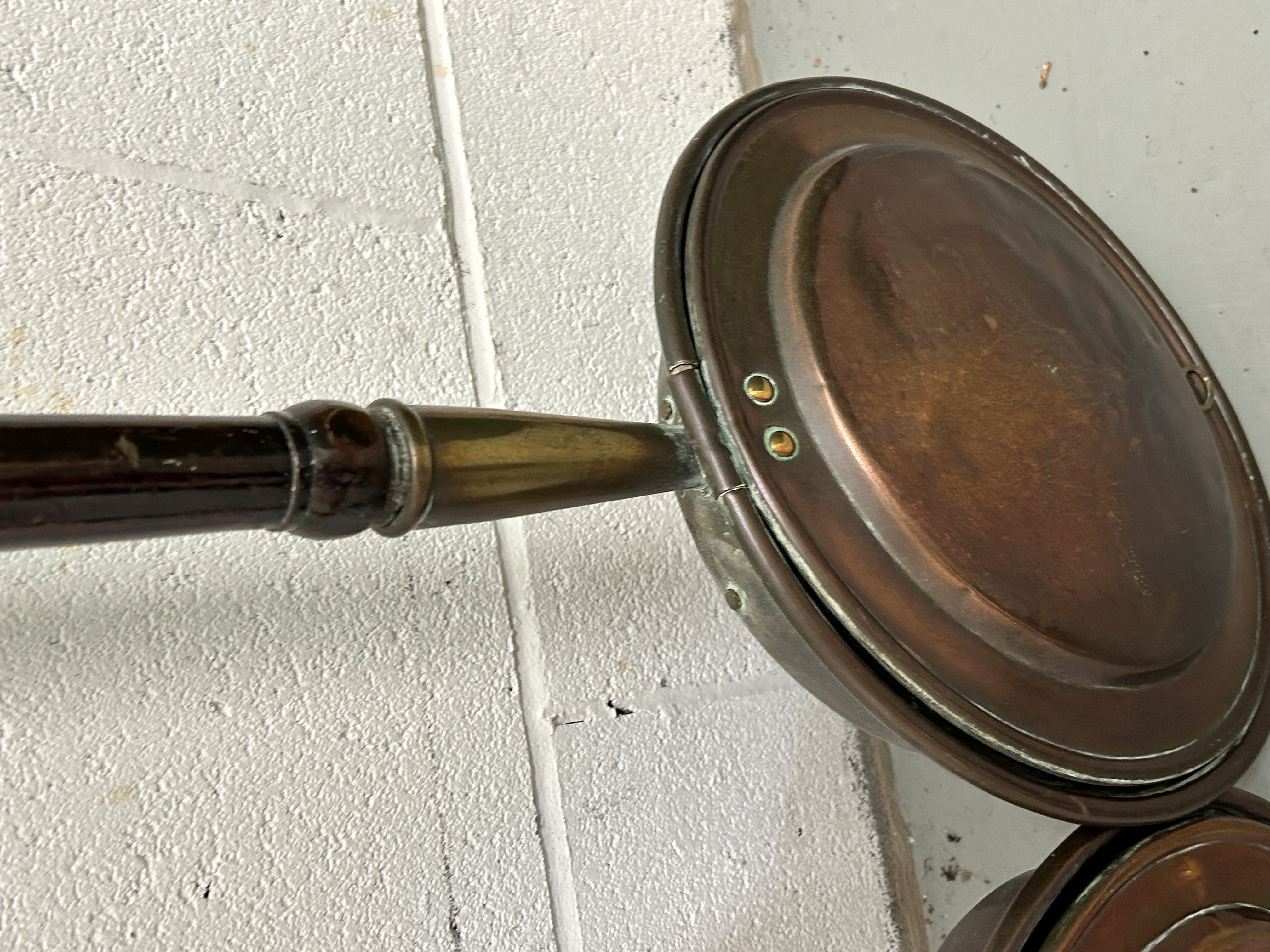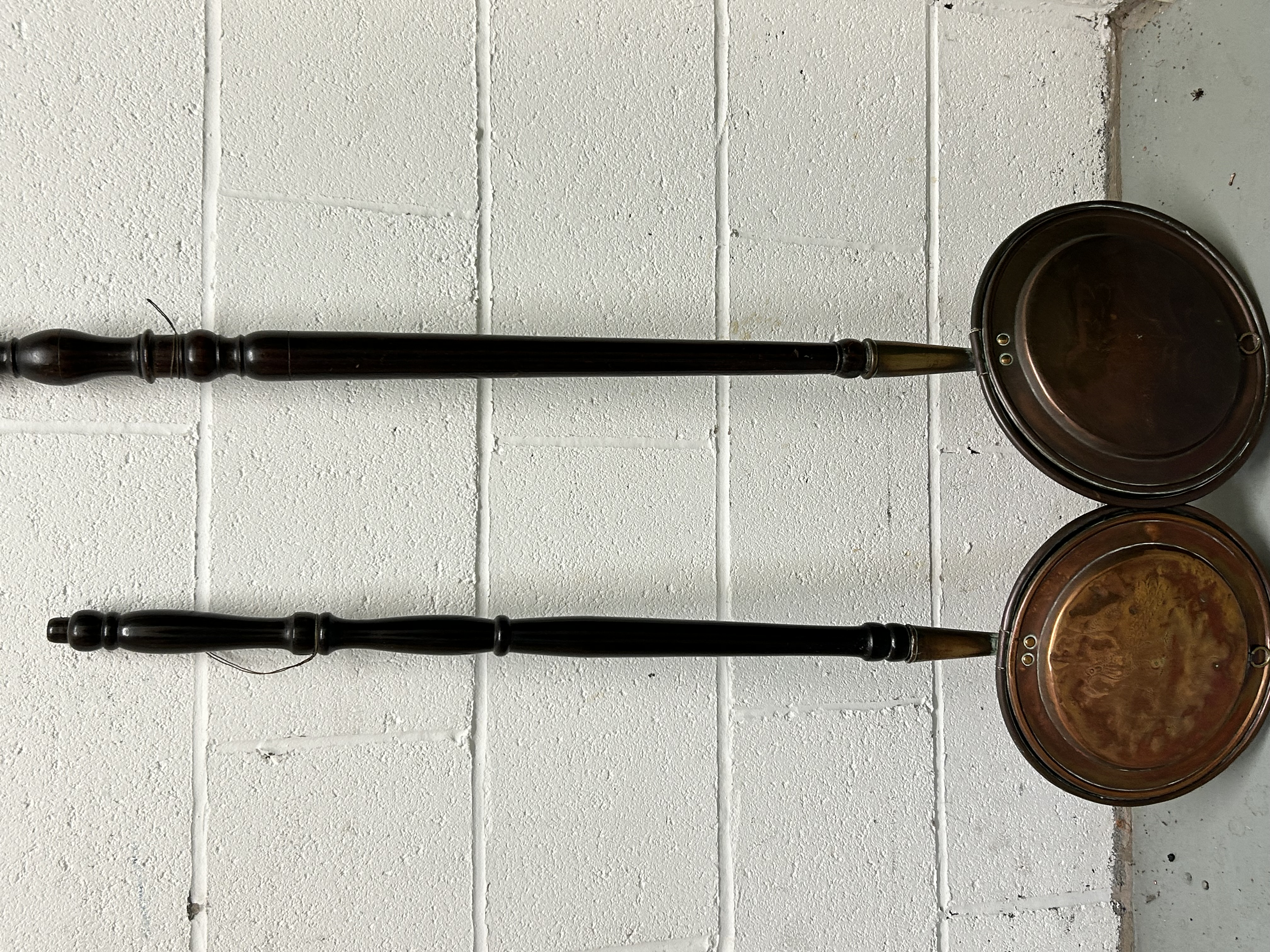 This pair of antique-style bed warmers is constructed with circular copper pans and hinged lids. Each unit is mounted to a long, turned wooden handle featuring a dark finish. One lid displays a faint stippled or punched-dot decorative motif depicting a bird. The pans are secured to the handles with brass ferrules and rivets. The design and materials are consistent with 19th-century utility items.