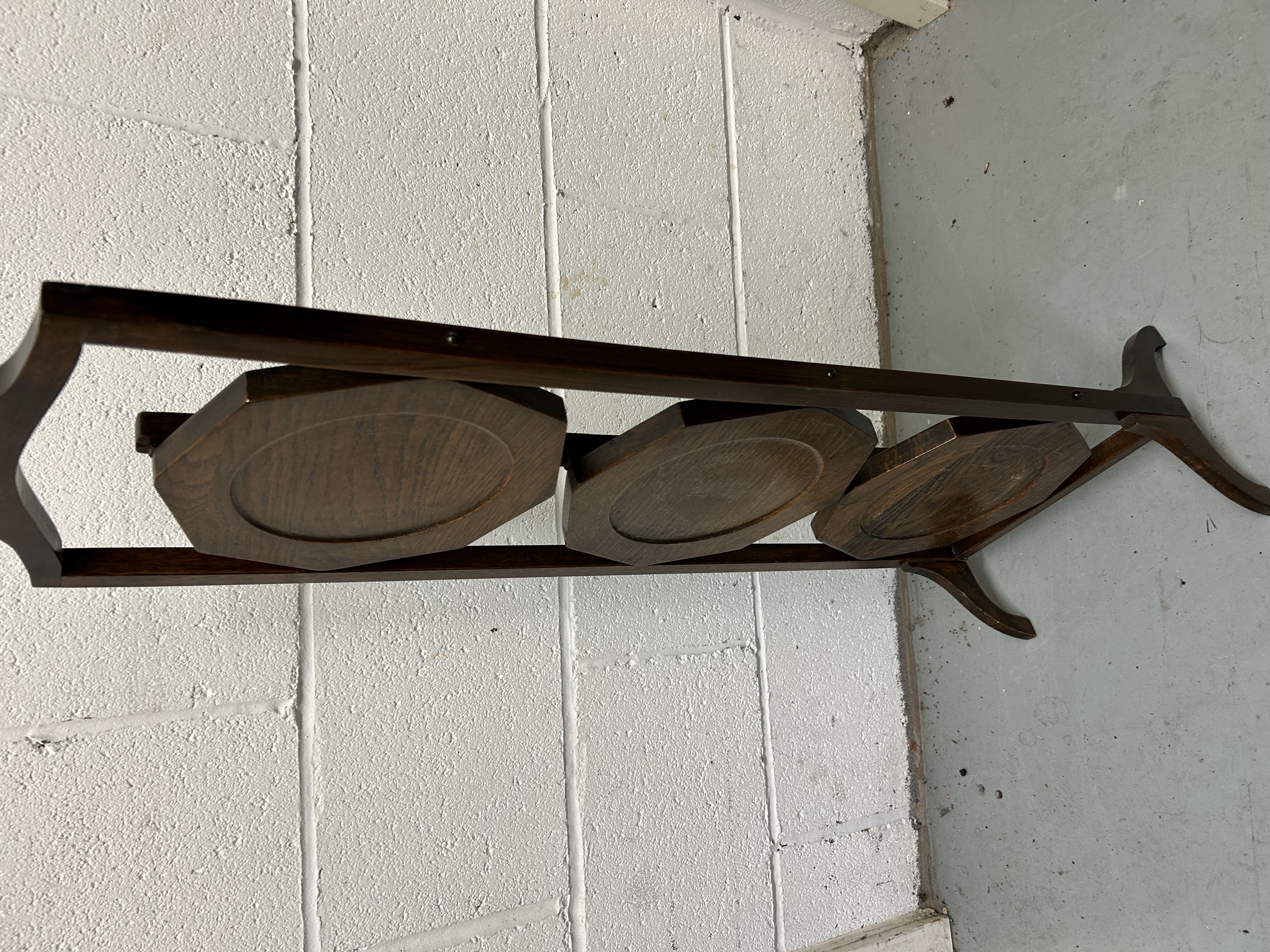 An antique Edwardian mahogany folding cake stand of three-tier construction. The stand features three hexagonal shelves, each designed with a circular recessed center. The frame utilizes a folding mechanism that allows the shelves to collapse flat within the uprights for compact storage. The piece is finished with a shaped decorative handle at the top and splayed, curved legs at the base.