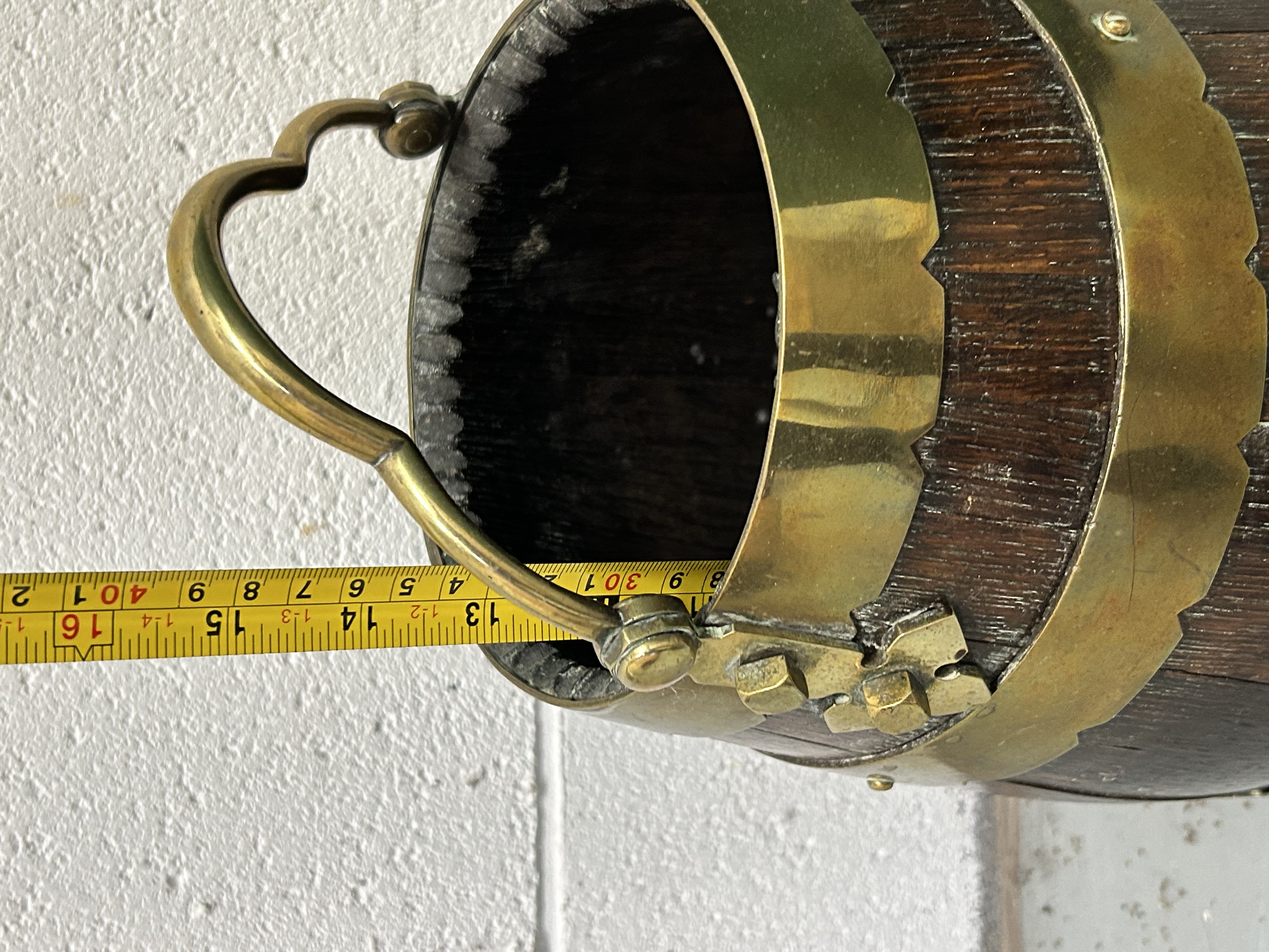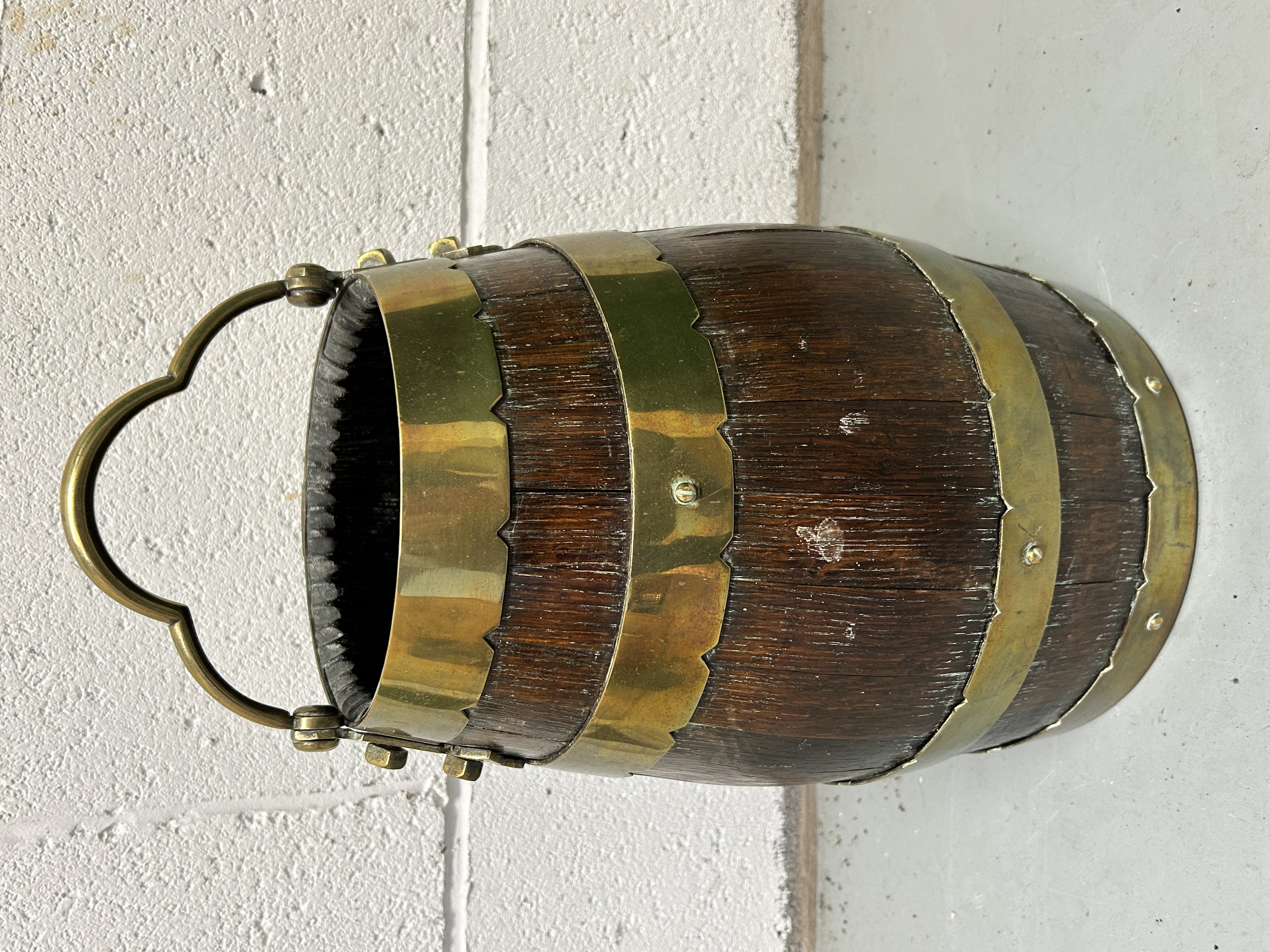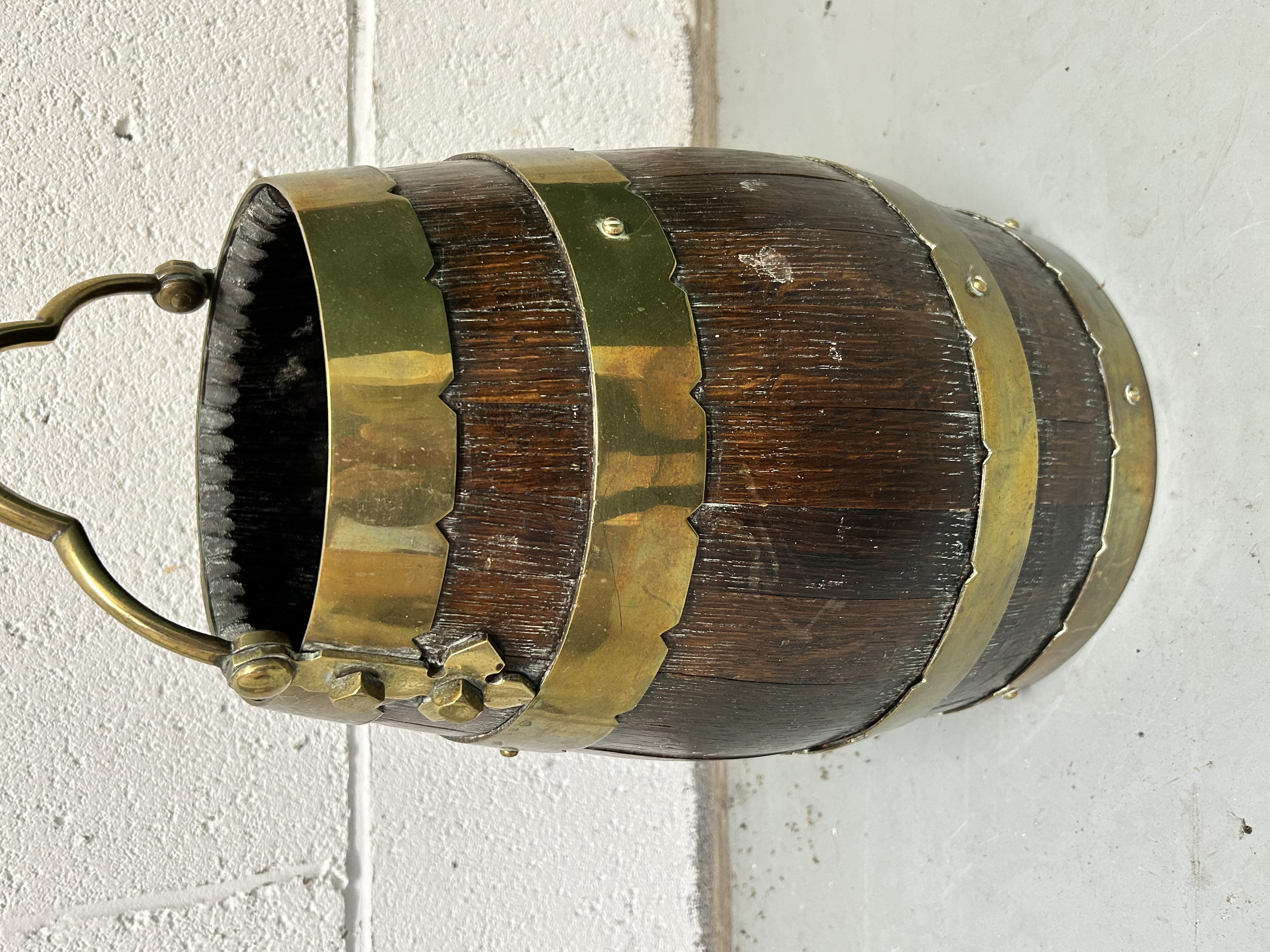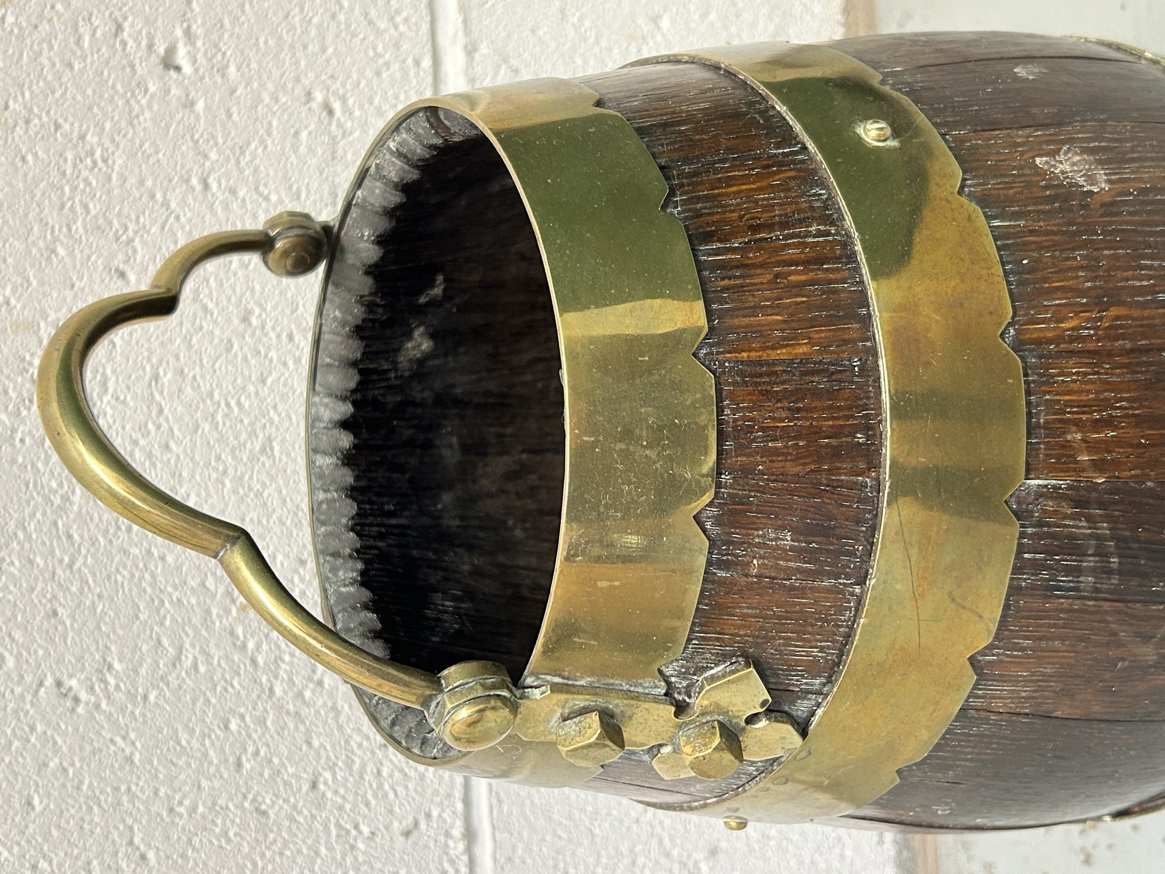 An English brass bound oak barrel bucket of coopered construction, likely intended for use as a coal or peat scuttle. The tapered body is composed of dark-stained oak staves secured by three wide brass bands, each featuring decorative scalloped borders. The bucket is fitted with a substantial brass swing handle with a shaped grip, secured to the sides by ornate brass mounts. The interior is darkened from historical use.