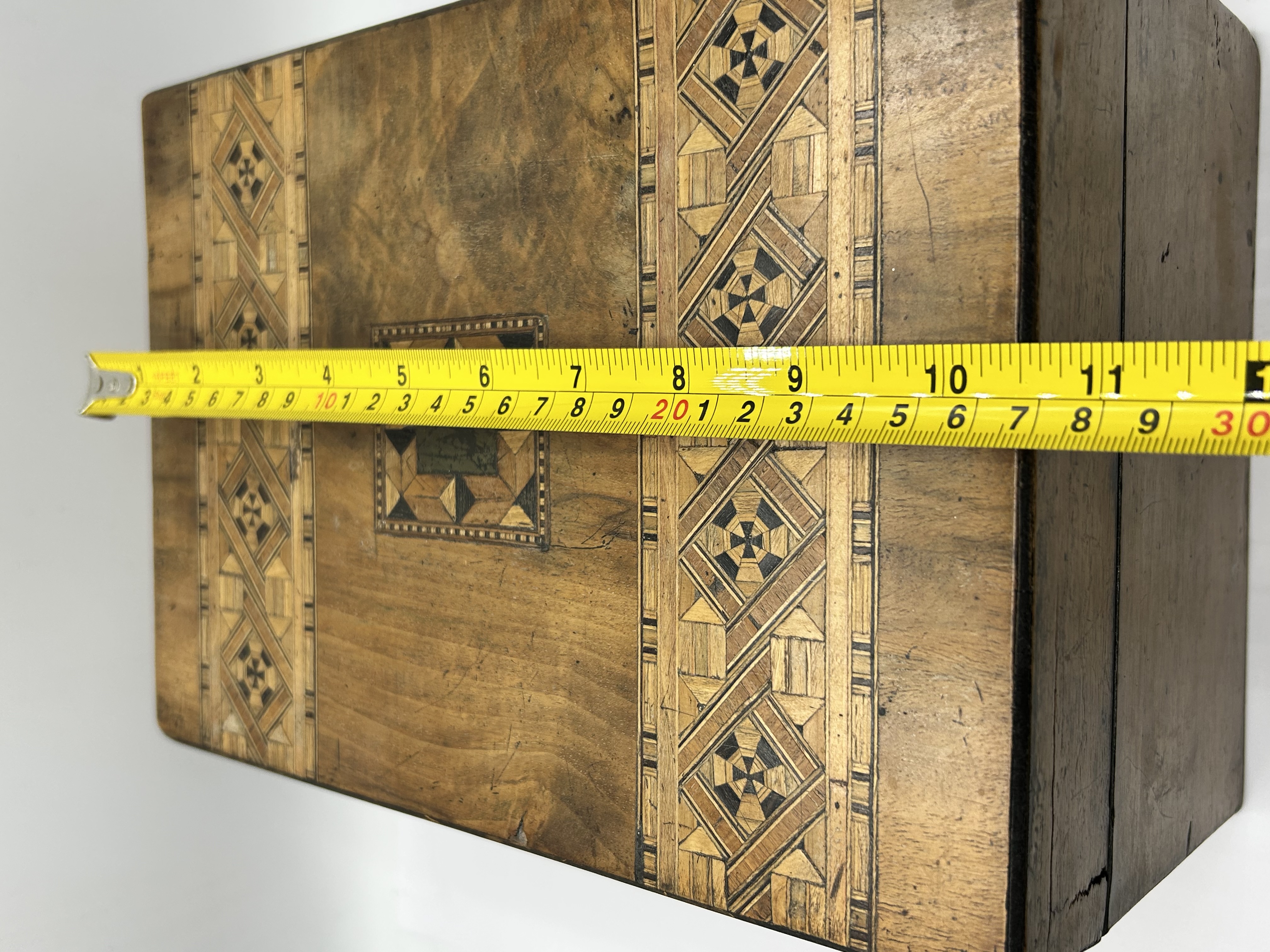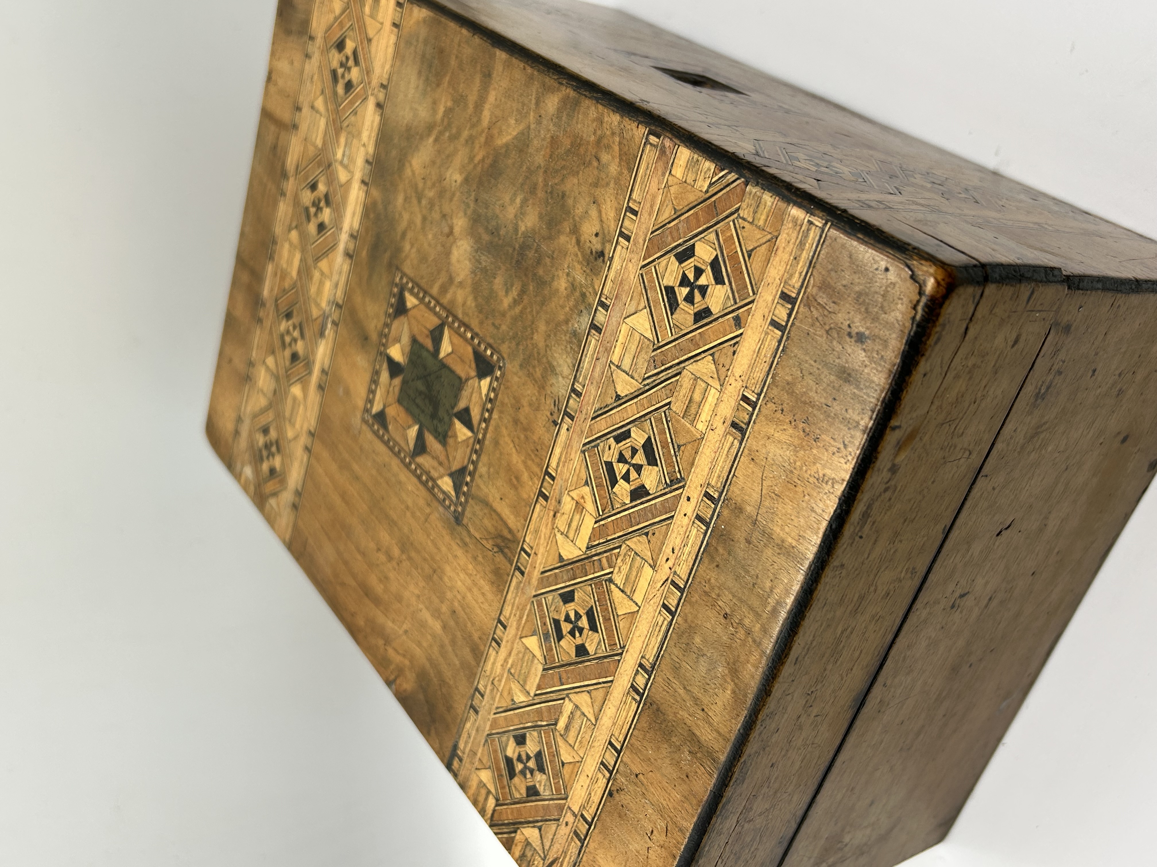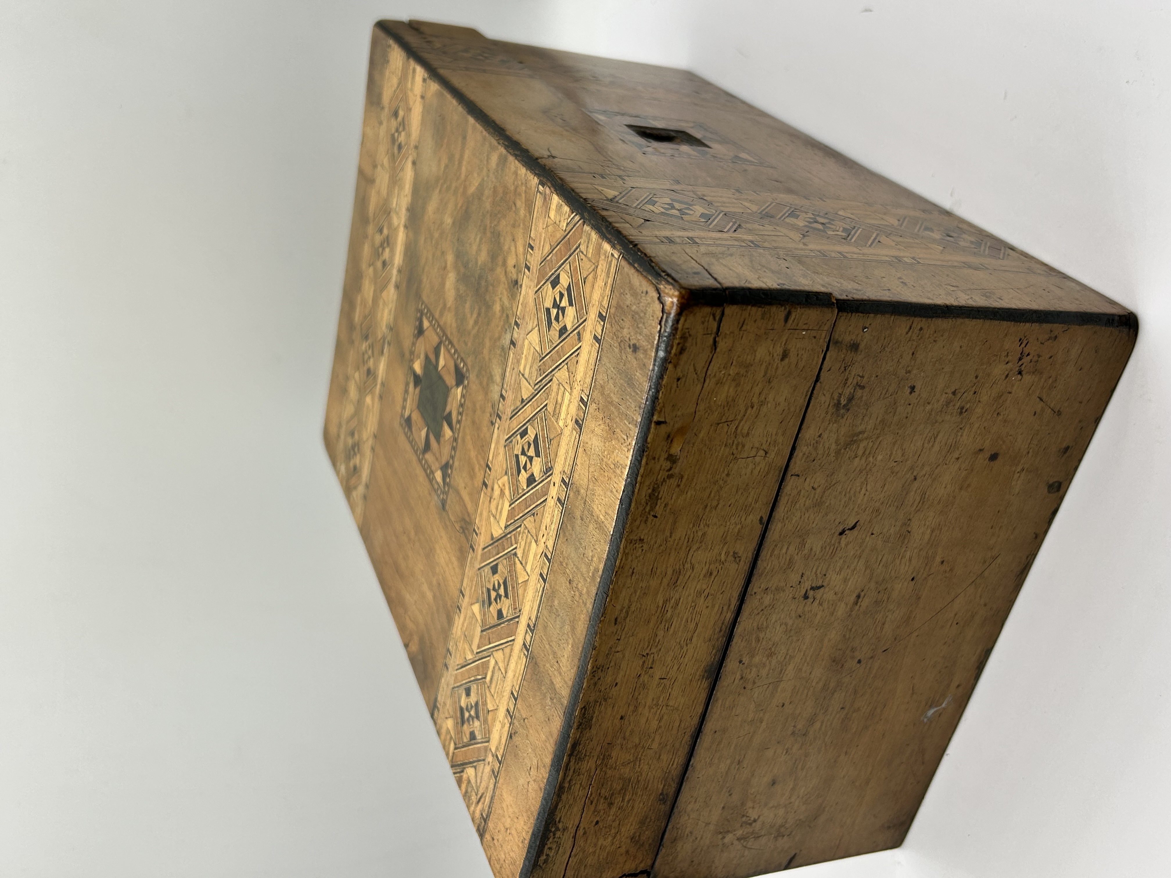 A 19th-century English Victorian Tunbridge ware box crafted from walnut with intricate parquetry inlay. The rectangular wooden structure is decorated on the lid and sides with geometric mosaic patterns, including cross-and-diamond motifs set within banded borders. These decorative elements are composed of various contrasting natural wood veneers. The front face features a square aperture designed for a lock mechanism. The wood surfaces exhibit a warm, aged patina.