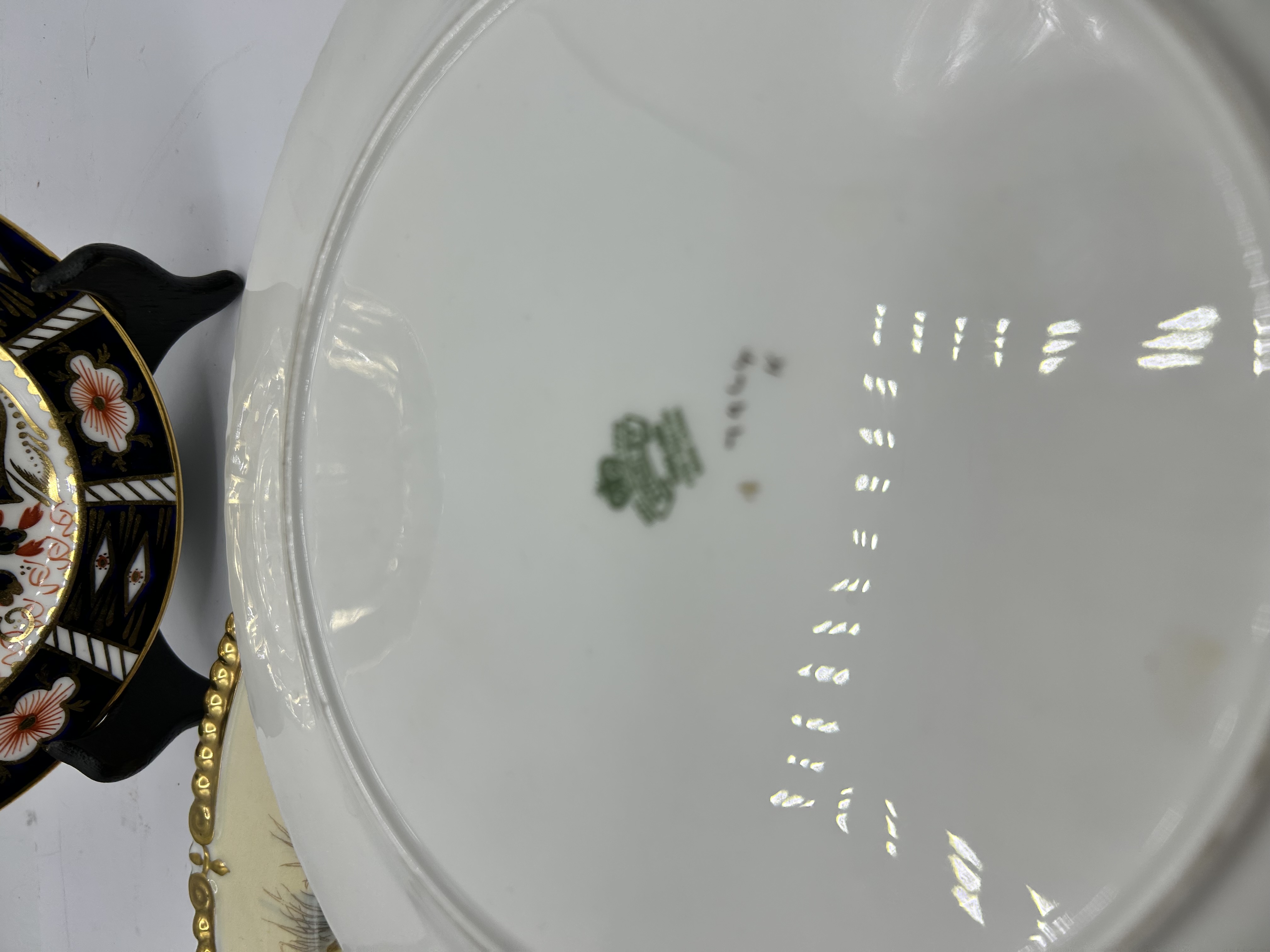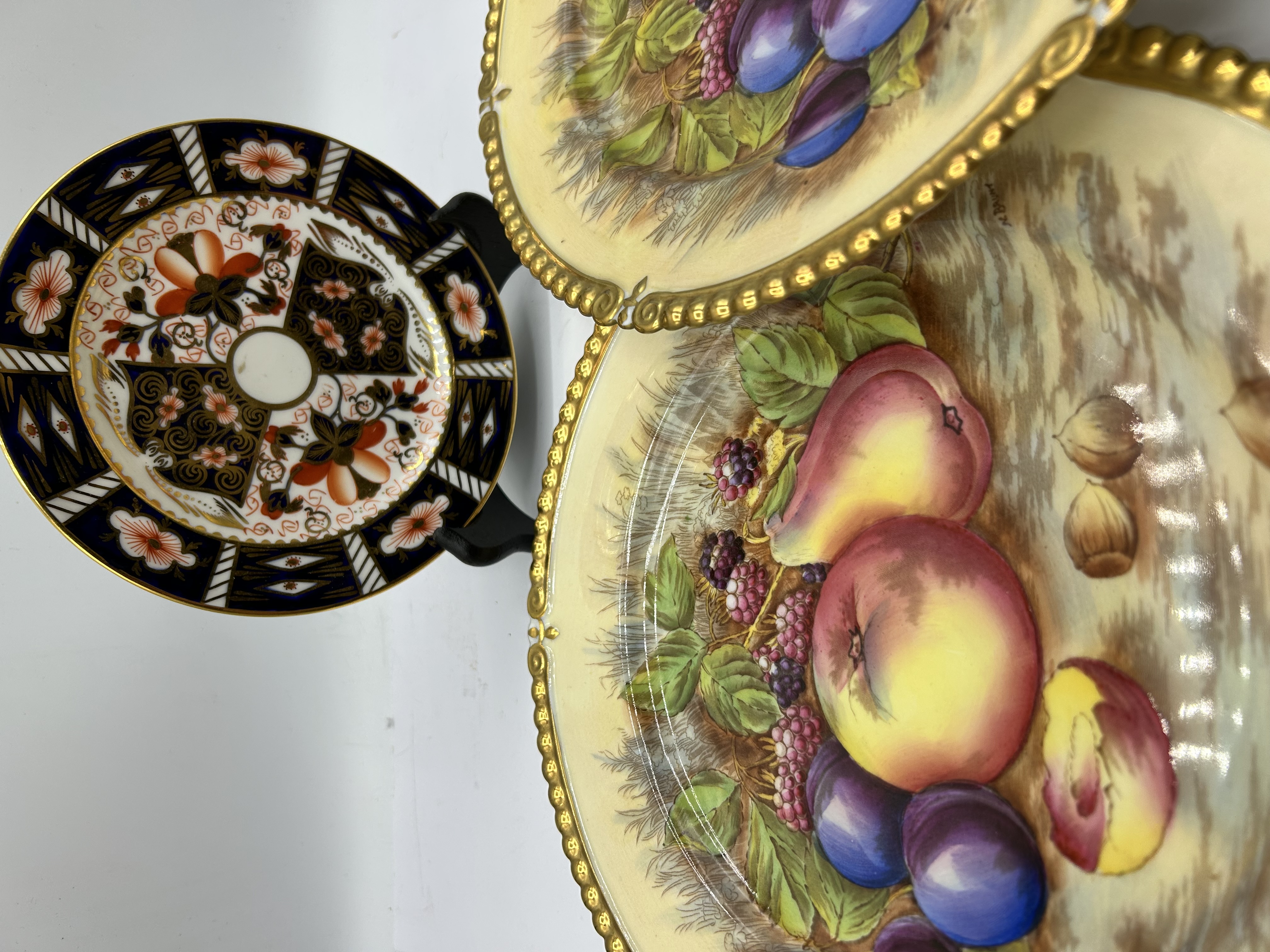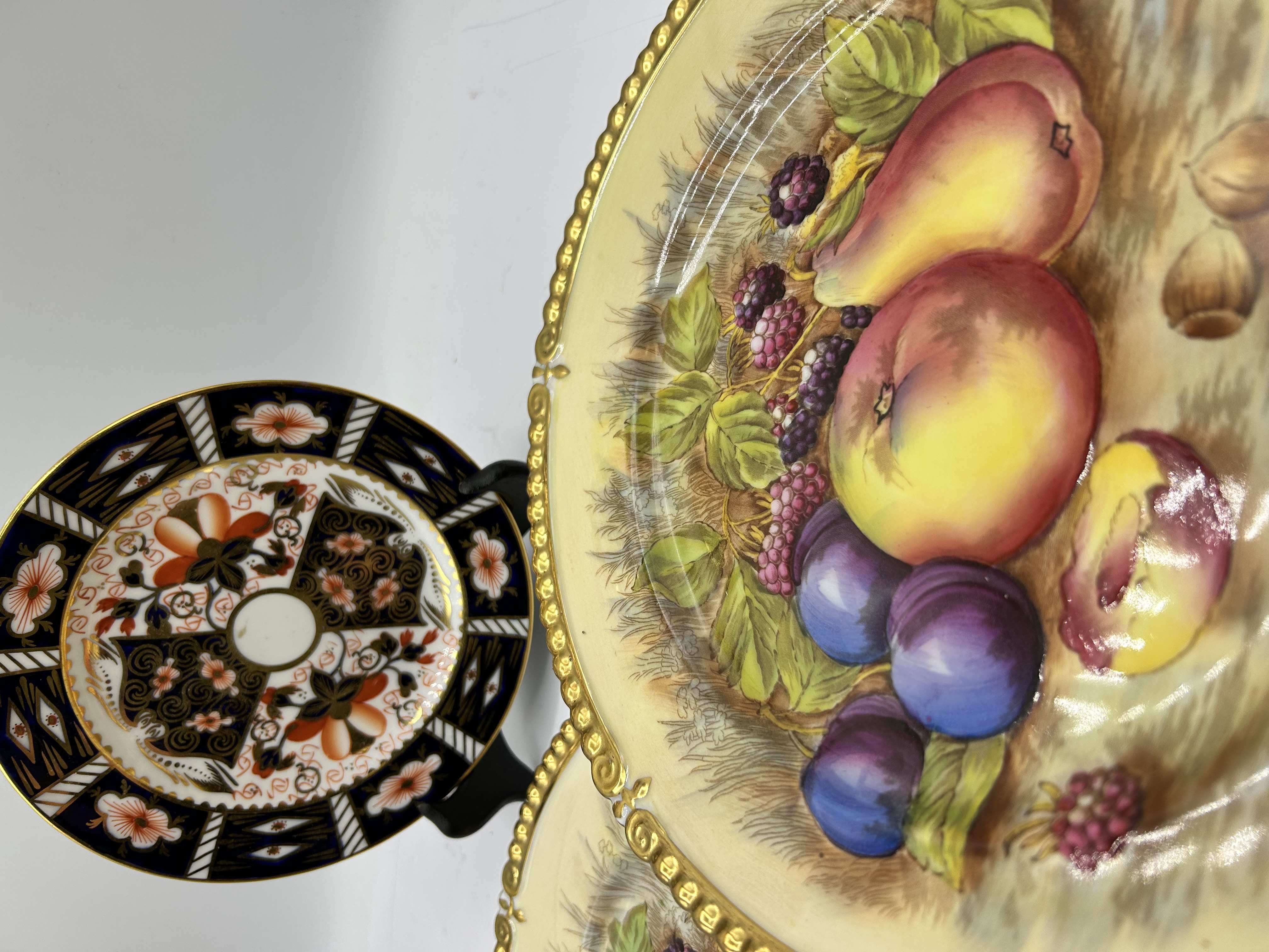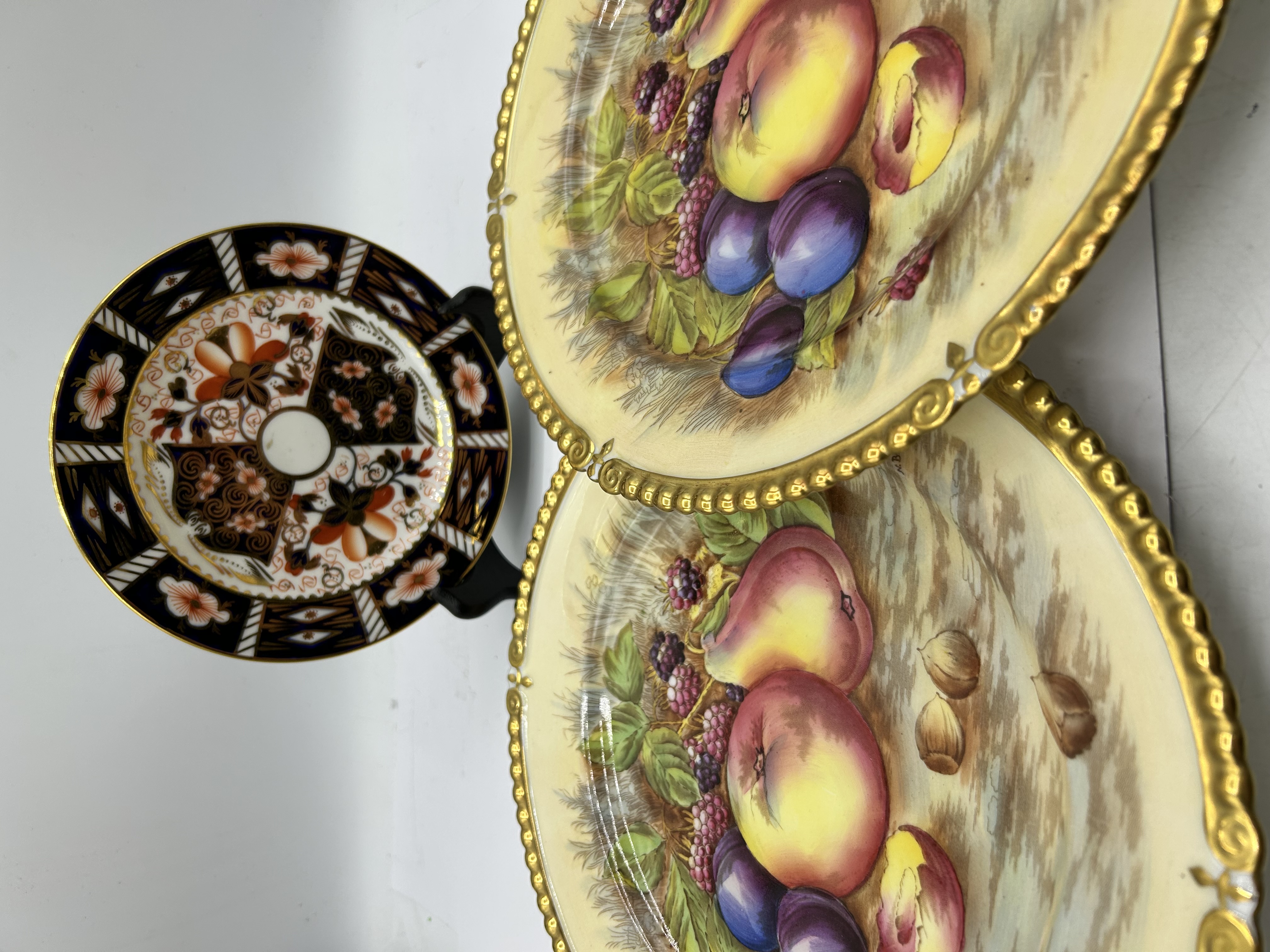 This collection features several fine bone china cabinet plates, primarily in the Aynsley Orchard Gold pattern. These plates are decorated with hand-painted still-life compositions of orchard fruits and berries set against a mossy ground. The fruit-themed plates include signatures for artists N. Brunt and R. Budd. Physical characteristics include cream-colored wells and heavily gilded, scalloped, and gadrooned rims. The group also contains a smaller plate decorated in a traditional Imari style with floral and geometric panels in cobalt blue, iron red, and gilt. Markings on the reverse include a green Royal Worcester factory mark and handwritten pattern numbers.