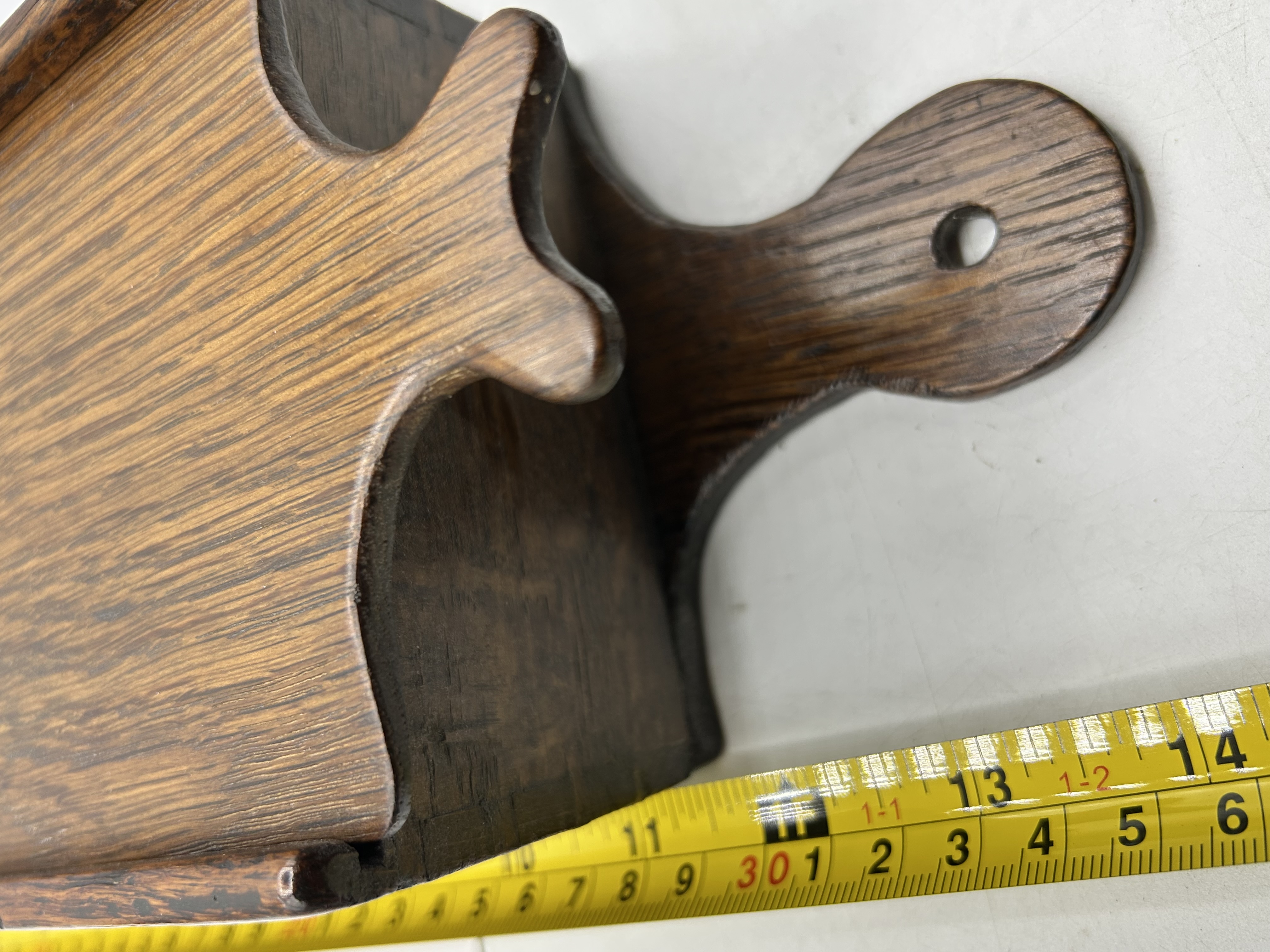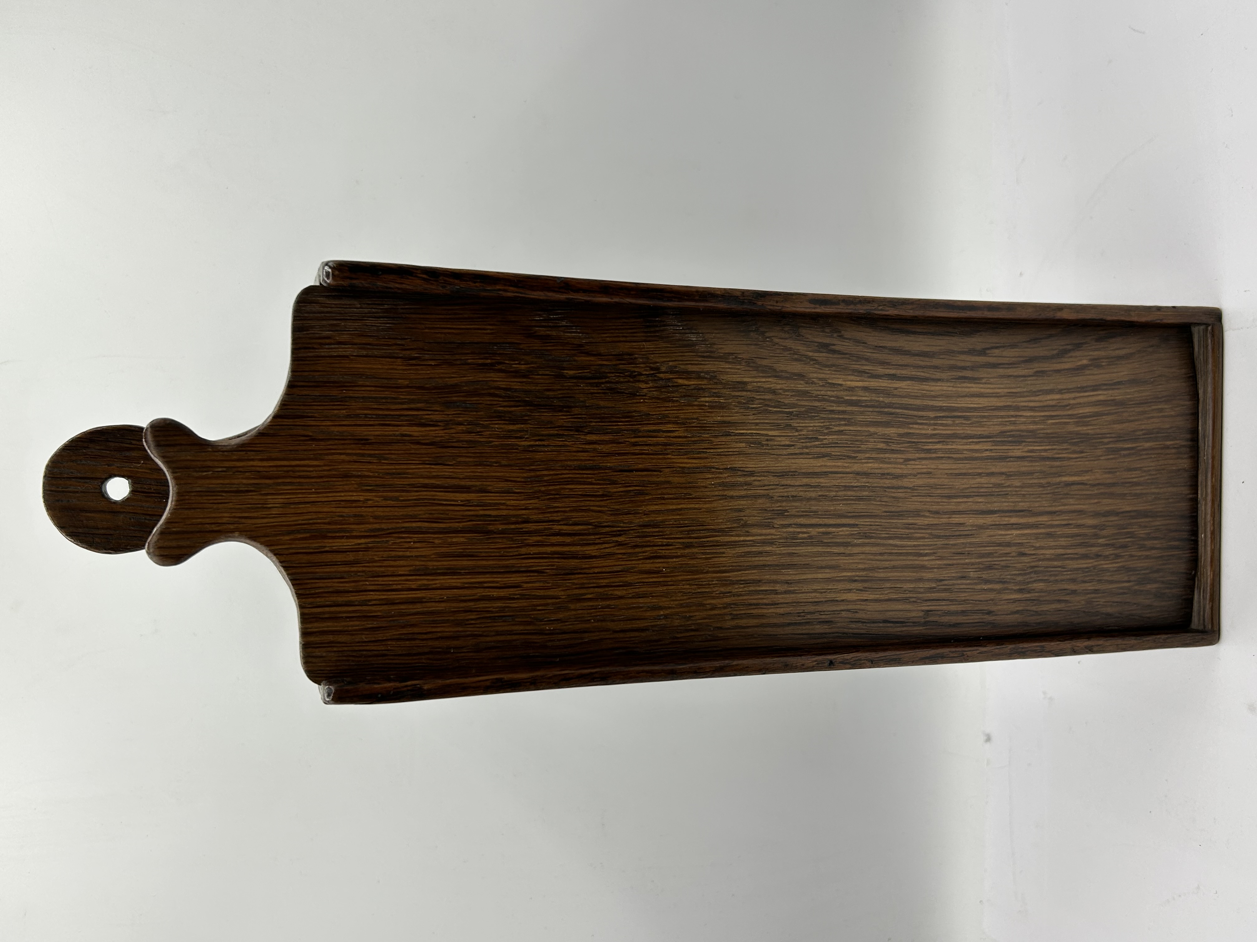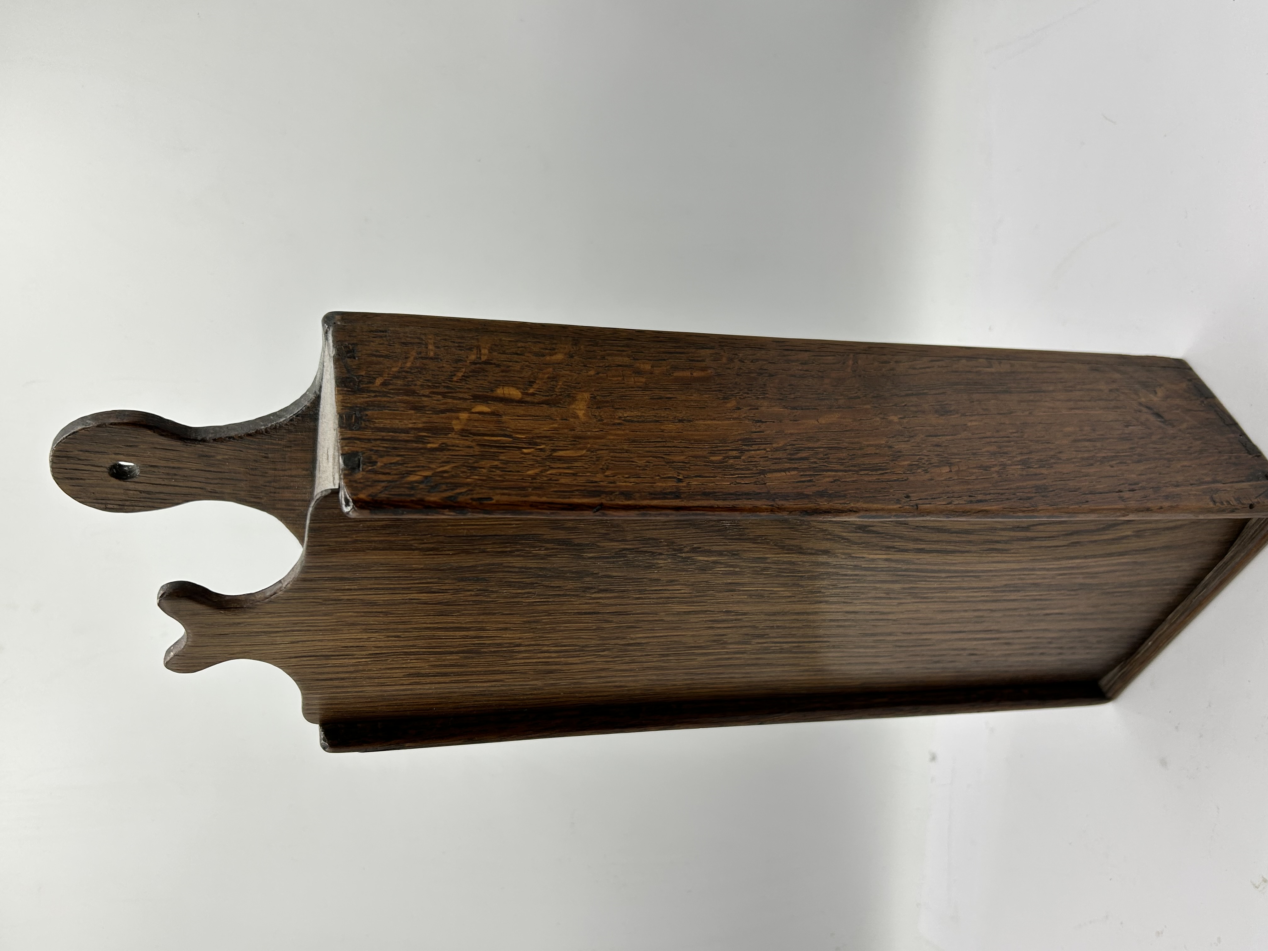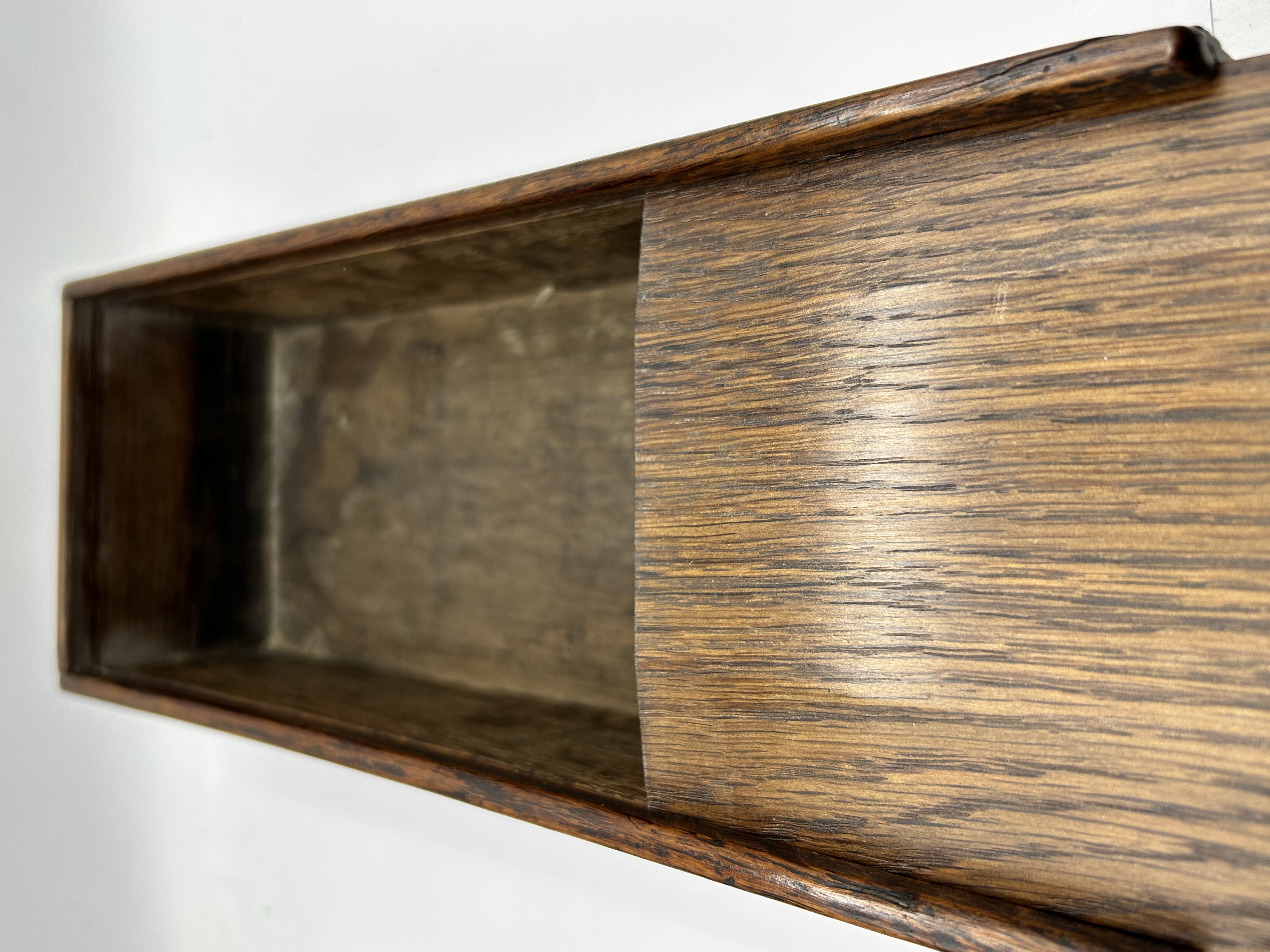 This rectangular oak box features a sliding lid and a dark-stained finish highlighting the wood grain. The construction follows a utilitarian or primitive style, typical of traditional storage containers. The lid includes an integrated carved handle at one end with a circular cutout for wall mounting or hanging. No manufacturer markings are present on the piece.