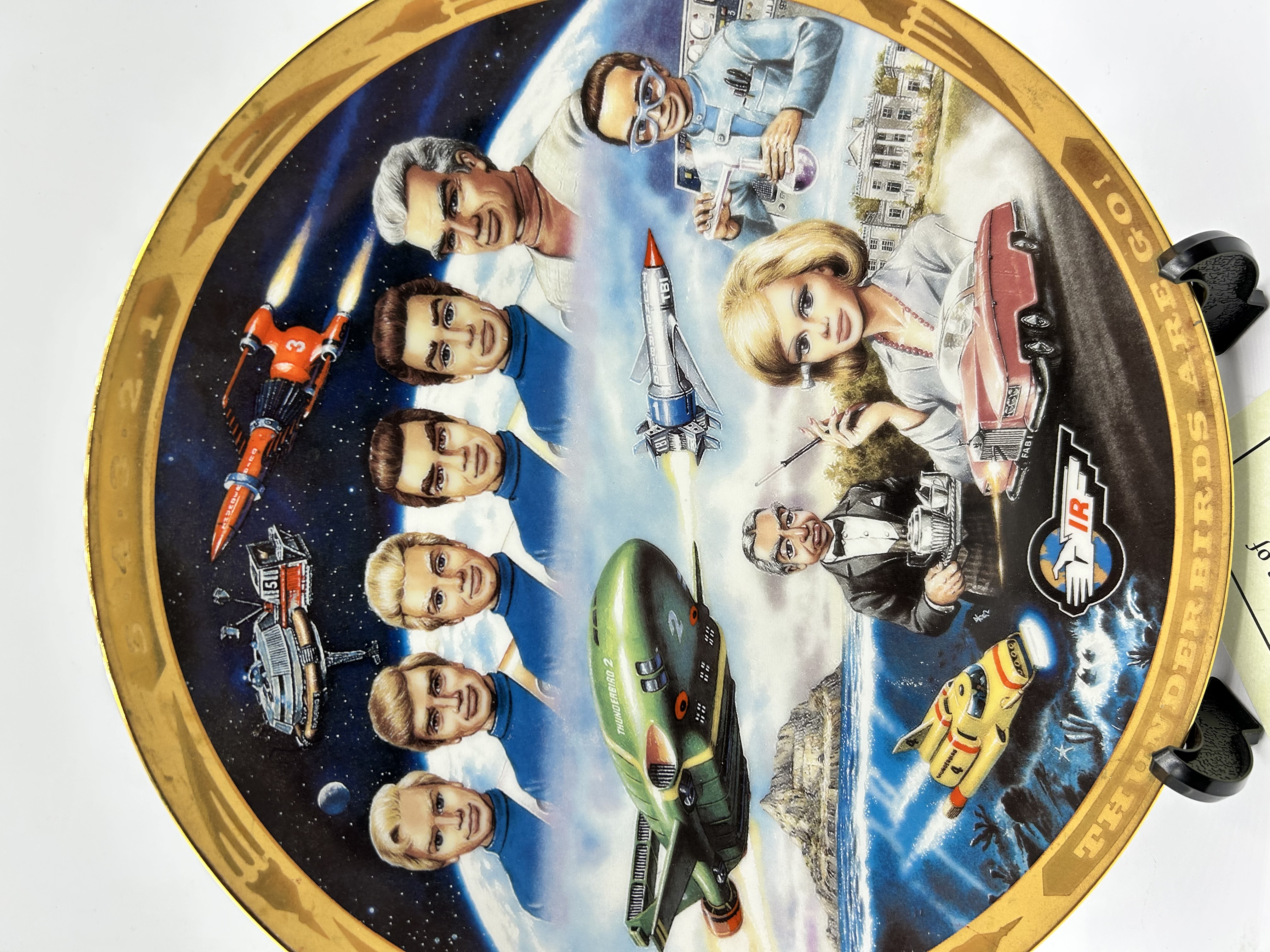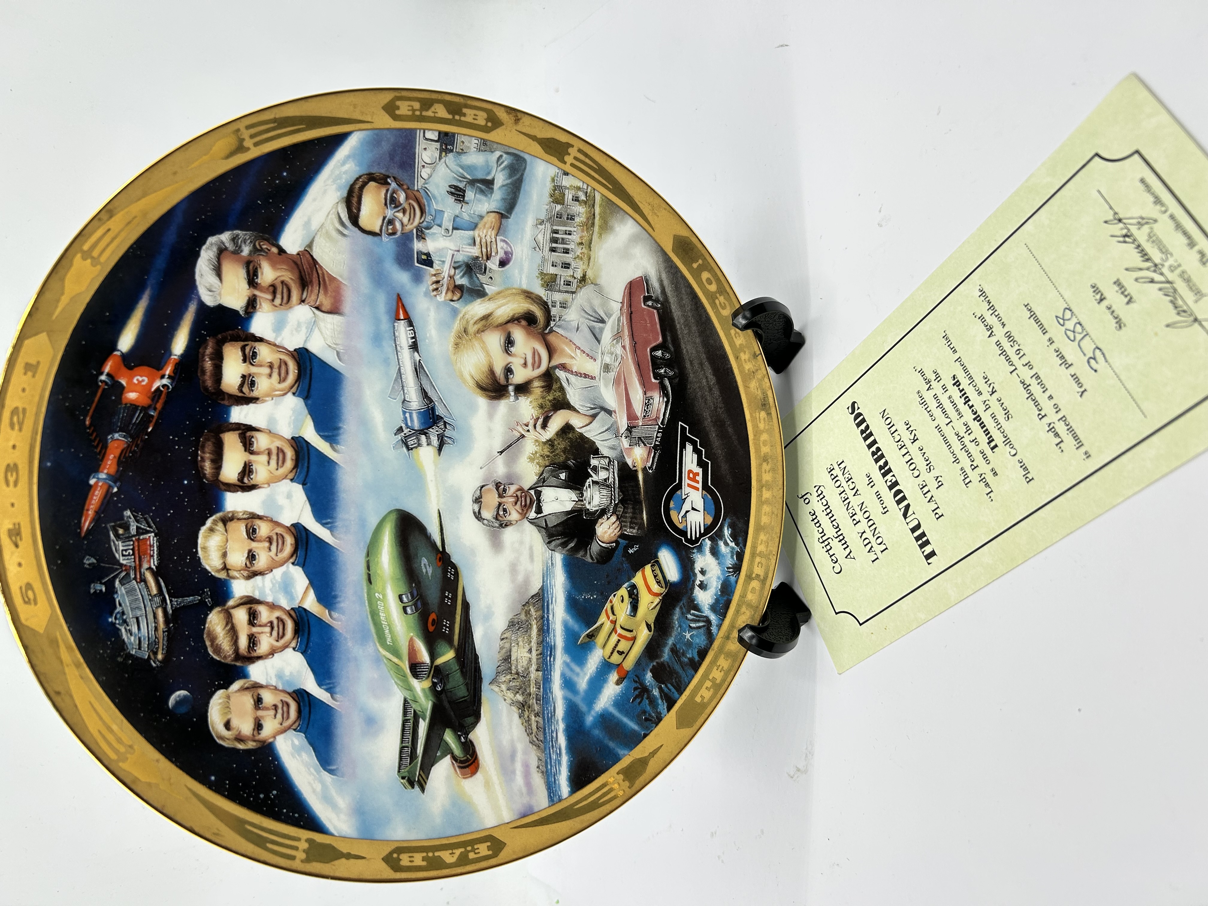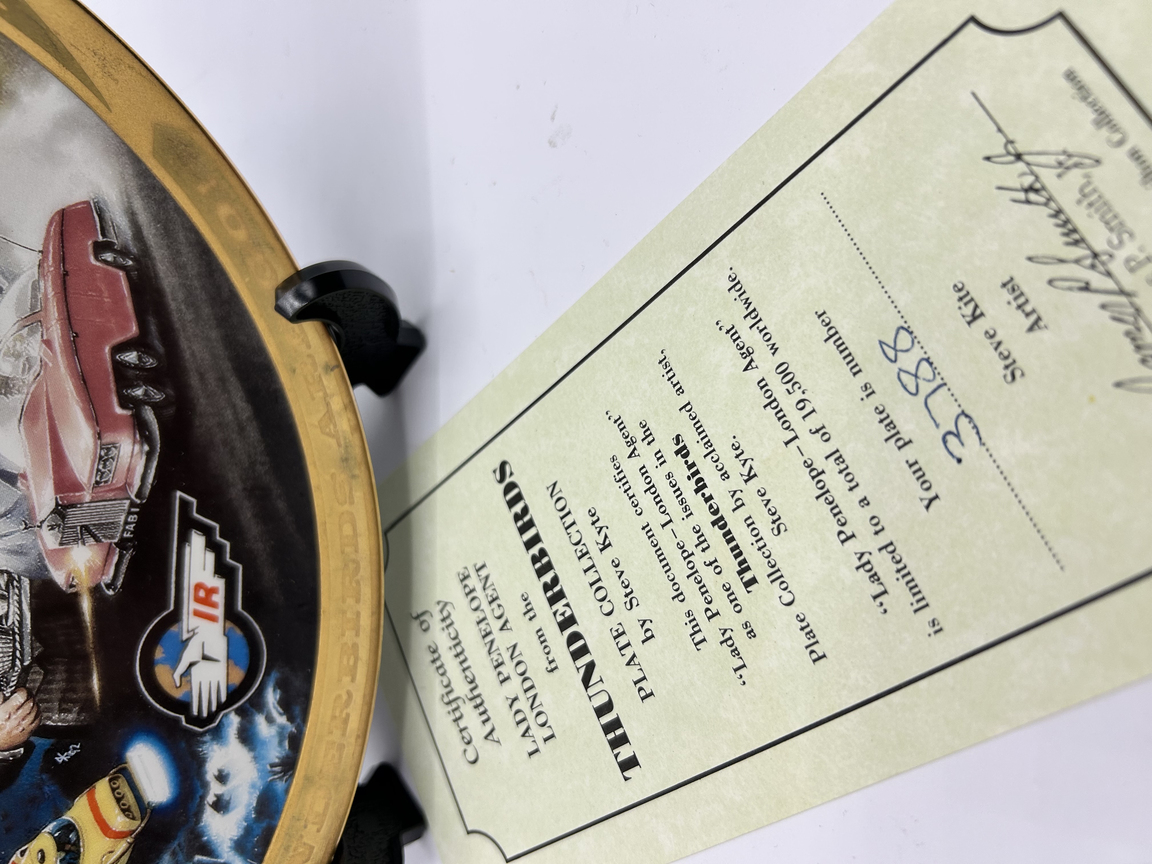 A porcelain collector plate titled Lady Penelope – London Agent from the Thunderbirds Plate Collection by artist Steve Kyte, produced by The Hamilton Collection. The central design features a color montage of characters and vehicles from the Gerry Anderson television series, including Lady Penelope, Parker, the Tracy family, Brains, Thunderbirds 1 through 5, and the FAB 1 vehicle. The plate is finished with a gold-toned border featuring the text F.A.B., a 5 4 3 2 1 countdown, and the phrase THUNDERBIRDS ARE GO!. The item is accompanied by a Certificate of Authenticity identifying it as plate number 3788 from a limited edition of 19,500 worldwide. A black display stand is included.