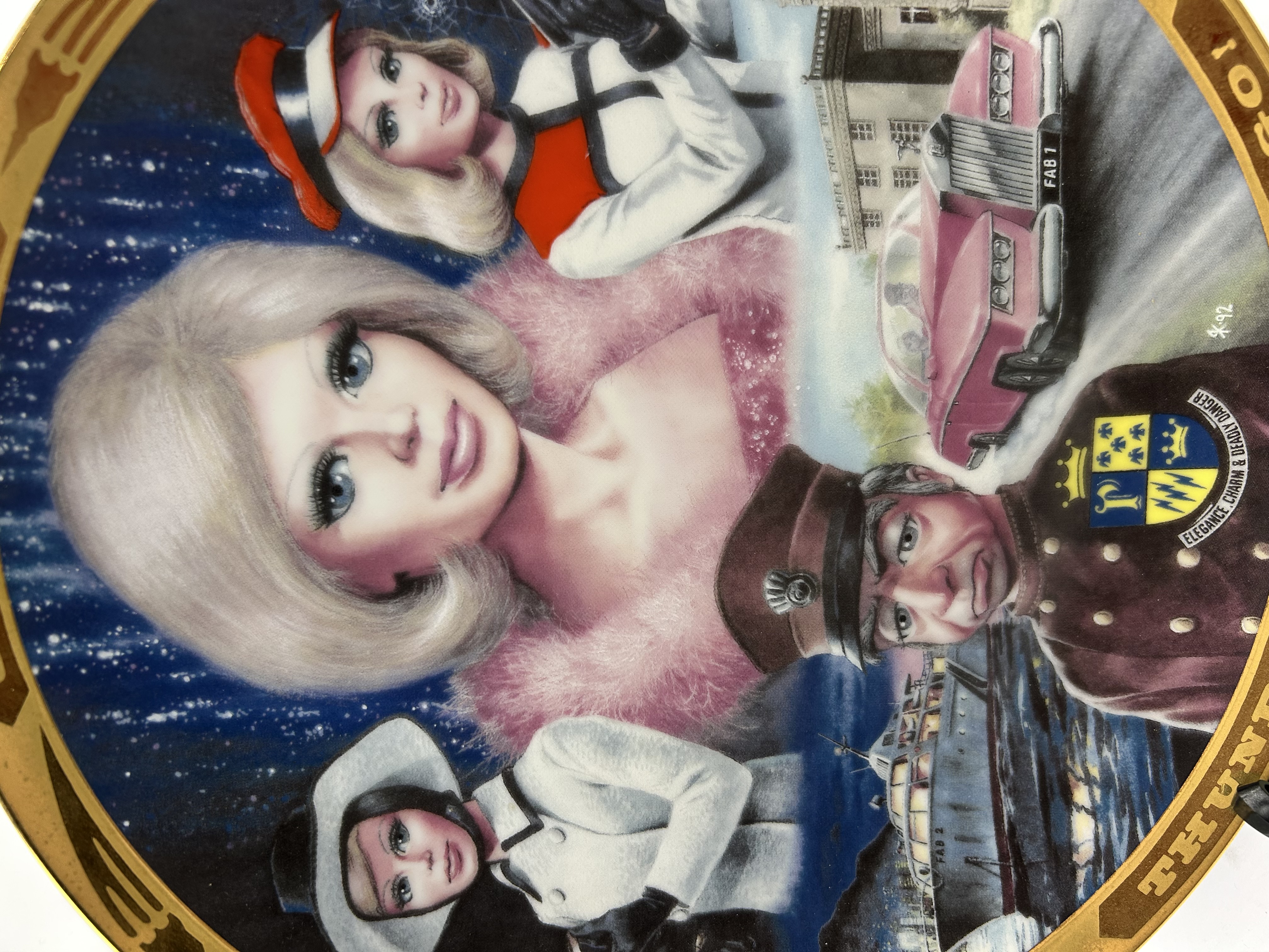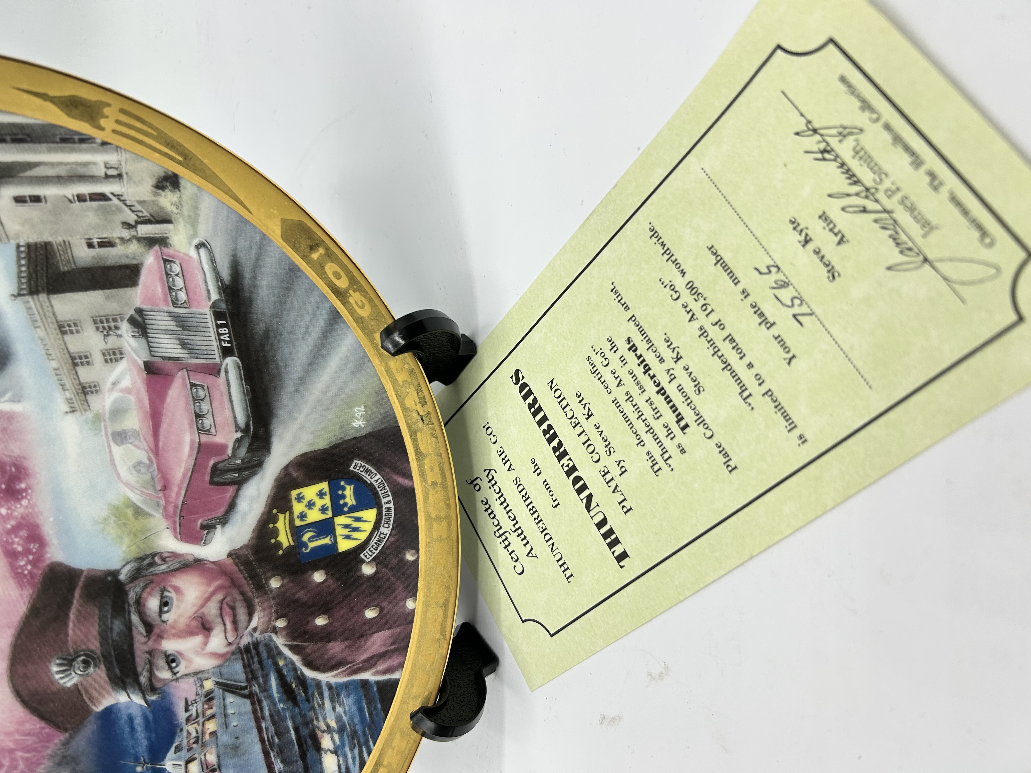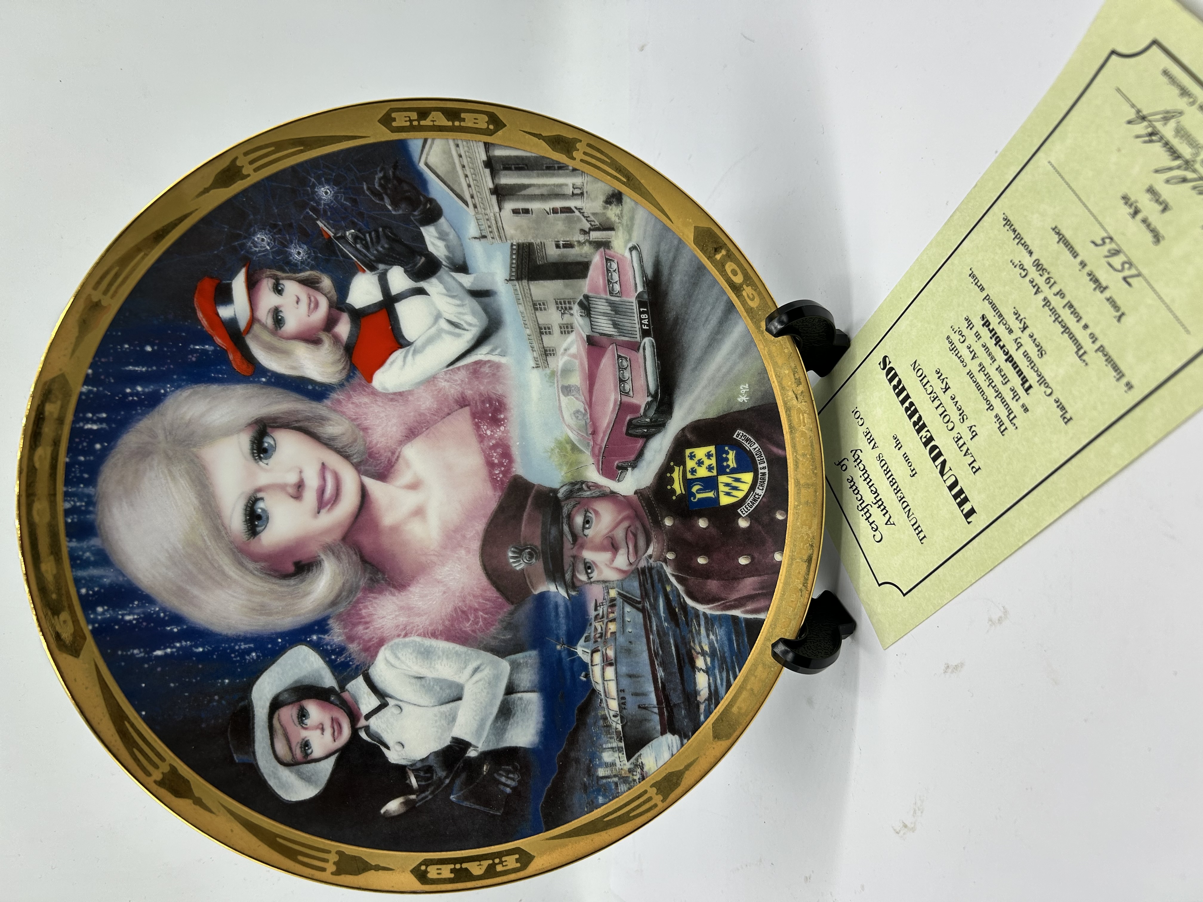 A decorative porcelain collector plate from The Hamilton Collection, titled Thunderbirds Are Go! Plate Collection. This item features original artwork by artist Steve Kyte, signed and dated SK 92 within the design. The central motif depicts a color montage of characters and vehicles from the Gerry Anderson television series, including Lady Penelope, Parker, and the FAB 1 vehicle. The plate is finished with a gold-tone gilded rim featuring the text F.A.B. and THUNDERBIRDS ARE GO! alongside stylized rocket icons. Accompanied by an original Certificate of Authenticity from The Hamilton Collection, identifying this as the first issue in the series, plate number 7565 from a limited edition of 19,500. The plate is presented on a black display stand.
