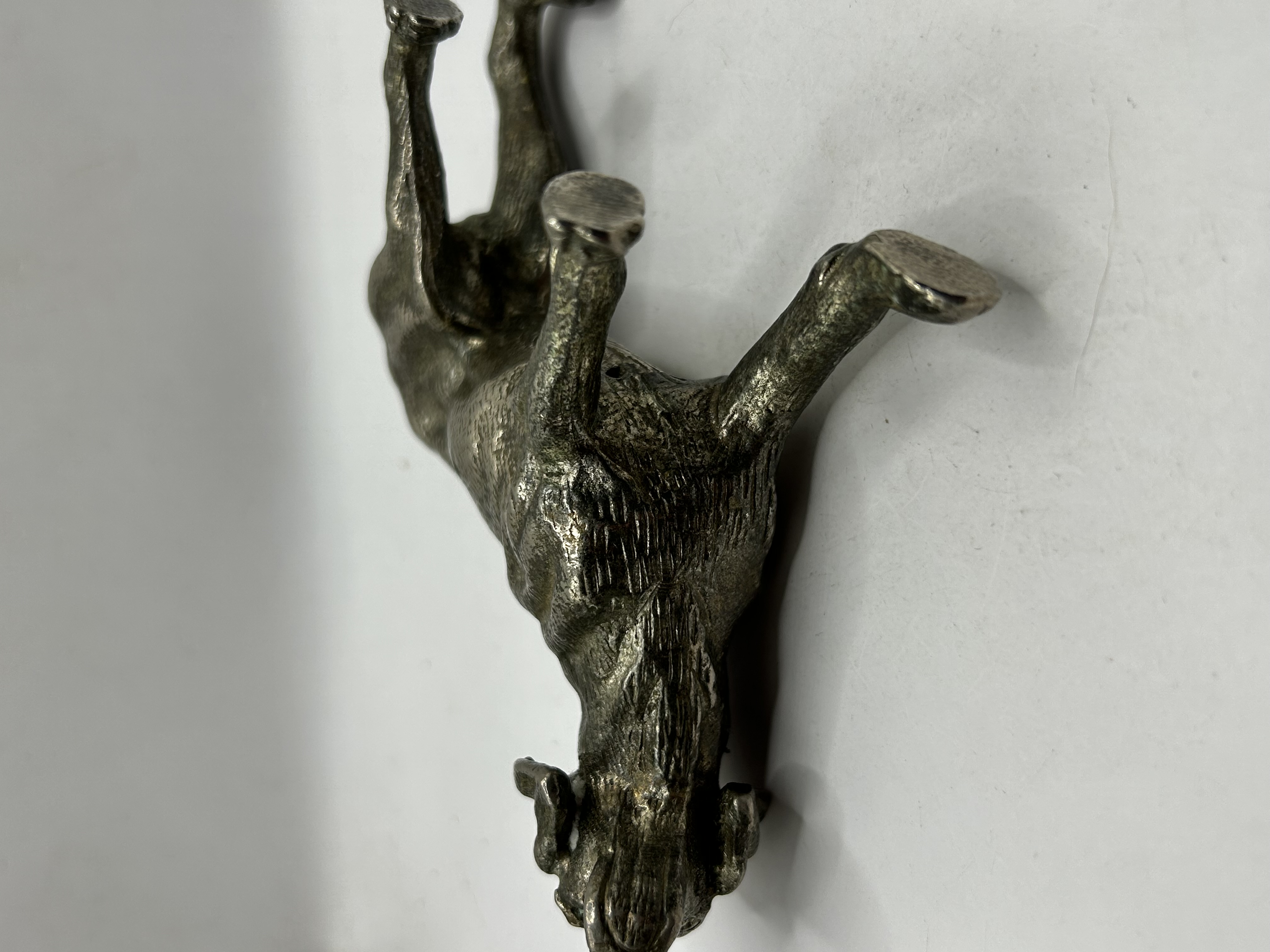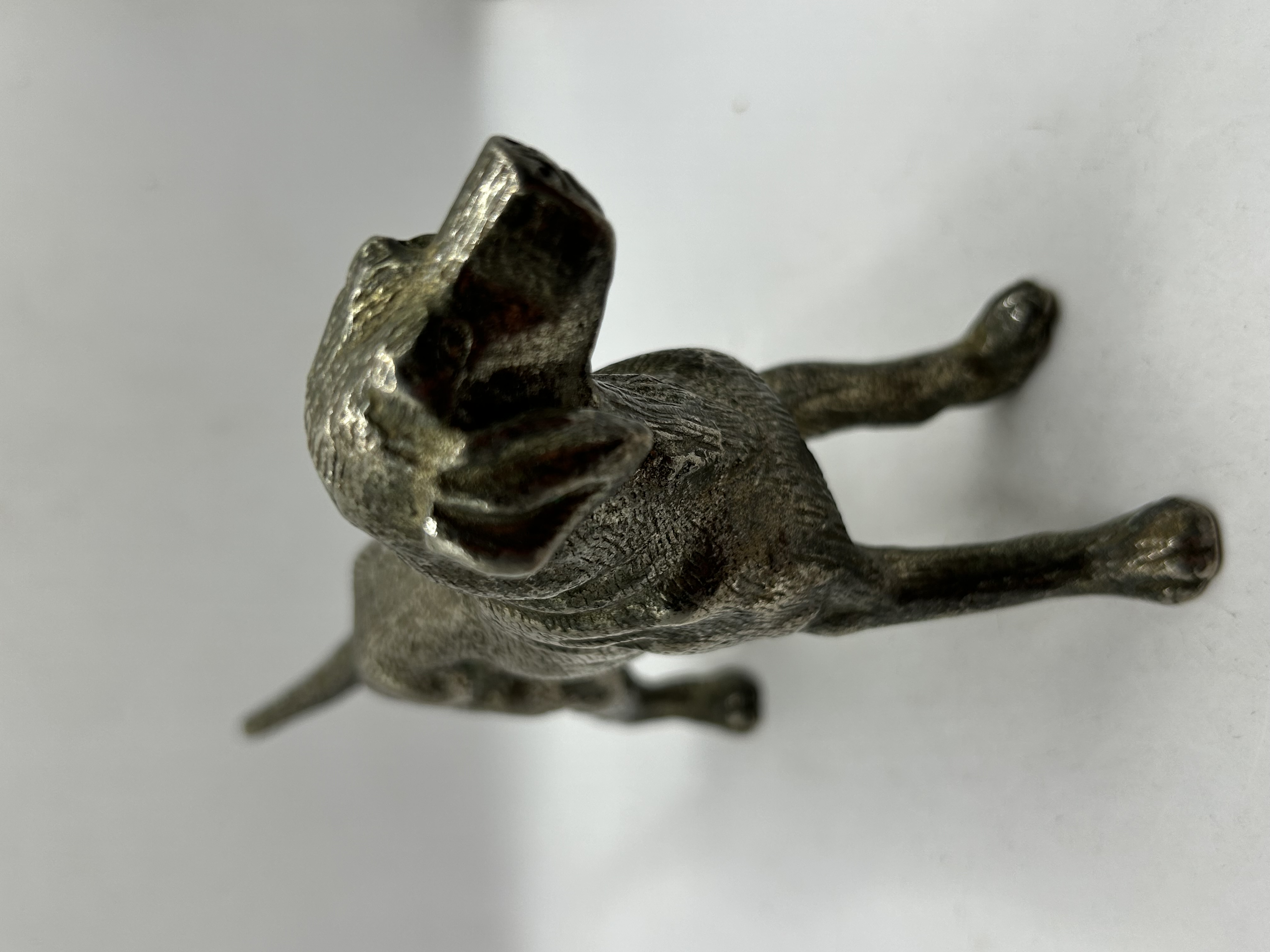 A miniature metal figurine depicting a sporting dog, likely a pointer, in a standing alert pose. The figure is cast from a silvery-grey white metal with a textured surface detailing the animal’s coat and musculature. A partially legible stamp reading GERMANY is located on the underside of one paw. The object features a developed patina with darker oxidation visible in the recessed areas.
