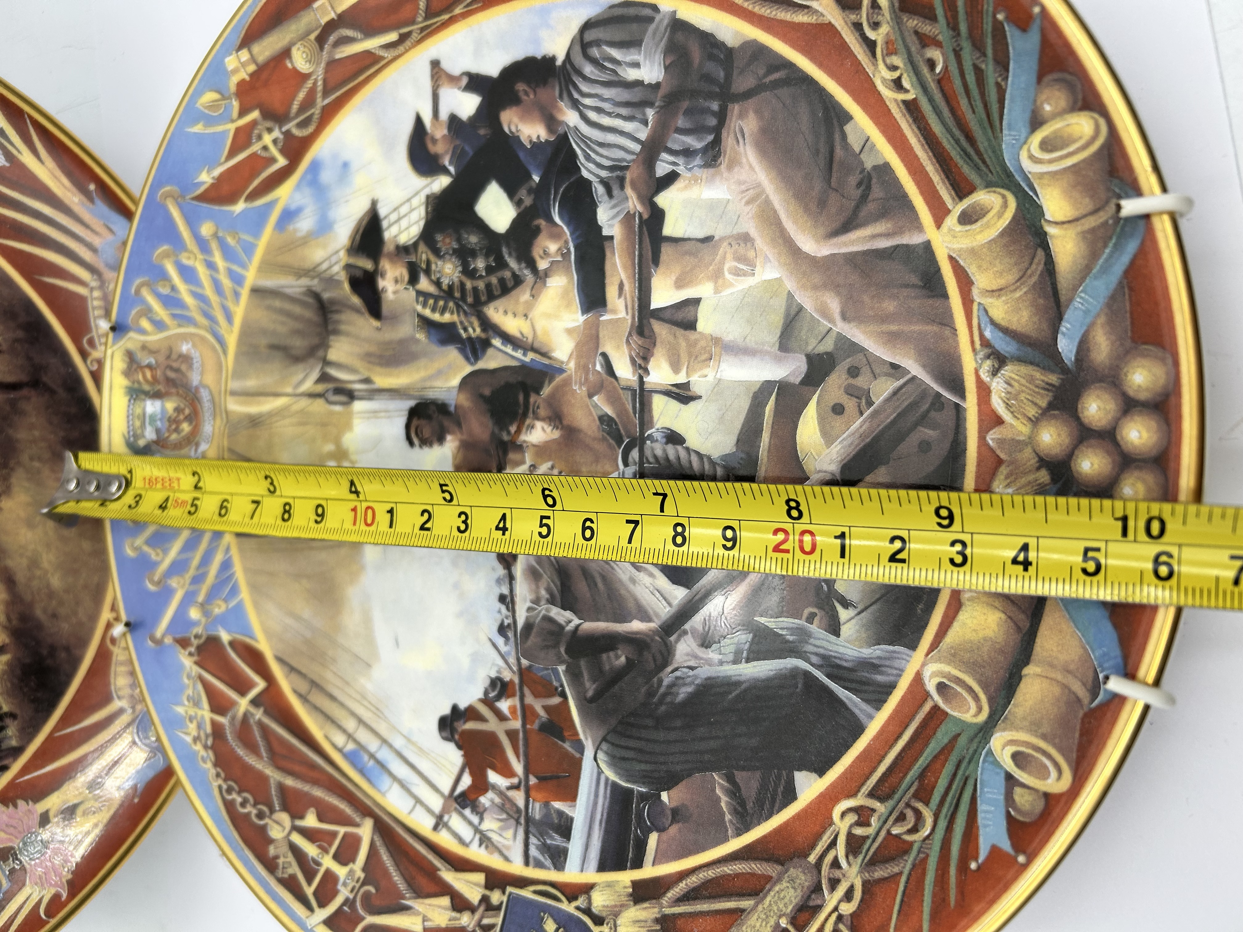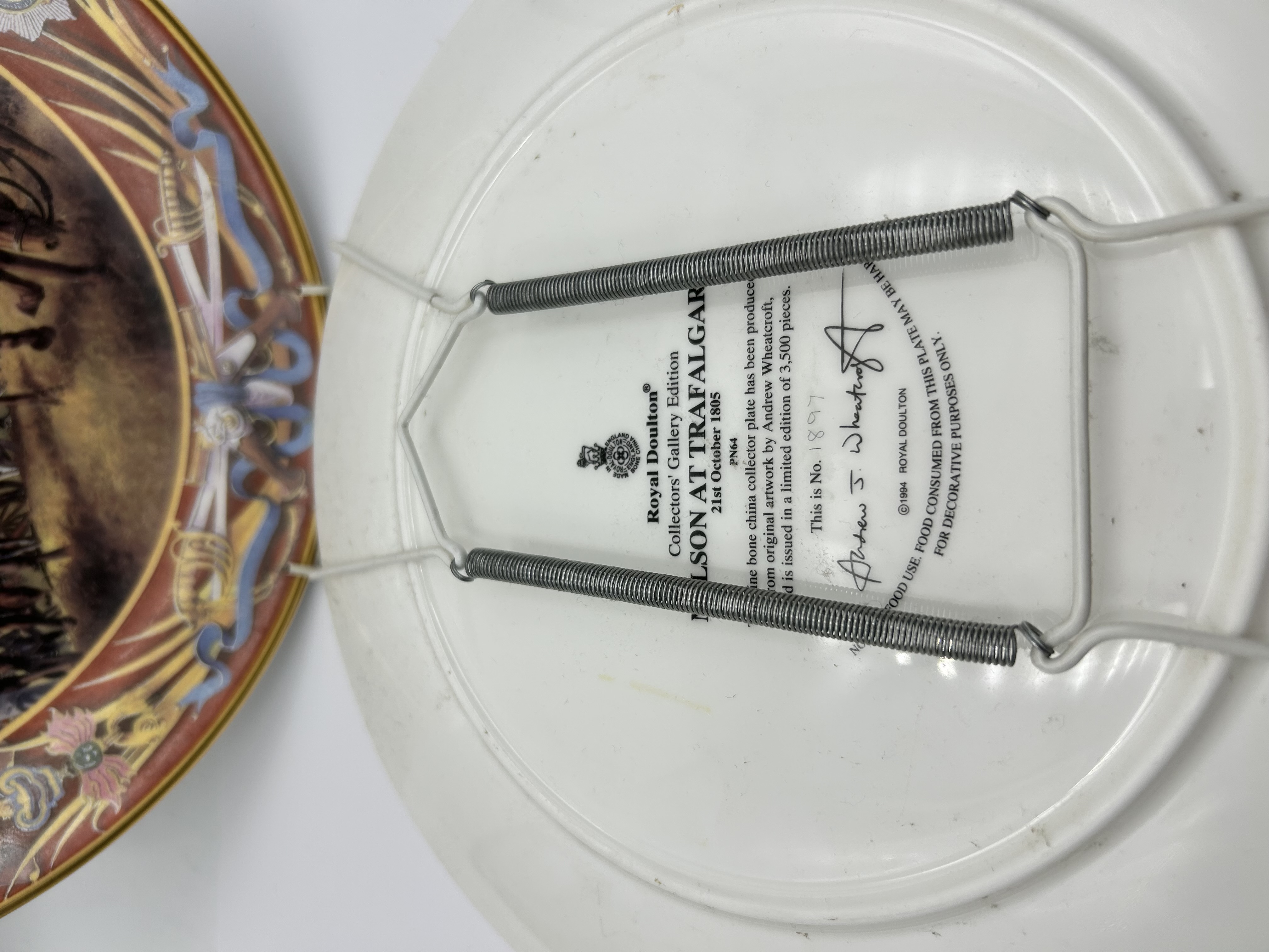 A pair of Royal Doulton fine bone china cabinet plates from the Collectors Gallery Edition series. The lot includes two plates featuring central transfer-printed illustrations by artist Andrew Wheatcroft, titled Nelson at Trafalgar and Wellington at Waterloo. The Nelson at Trafalgar plate depicts the naval engagement of October 21, 1805, while the Wellington at Waterloo plate depicts the Duke of Wellington on horseback. Both plates feature ornate borders incorporating heraldic crests, national flags, and thematic motifs such as anchors, cannons, and weaponry, finished with a gilt rim. The reverse of the Nelson at Trafalgar plate bears the Royal Doulton lion and crown backstamp, the series title, the artist signature, and the date 1994. It is marked as number 1897 from a limited edition of 3,500 pieces. Both items are fitted with spring-tensioned wire wall hangers.
