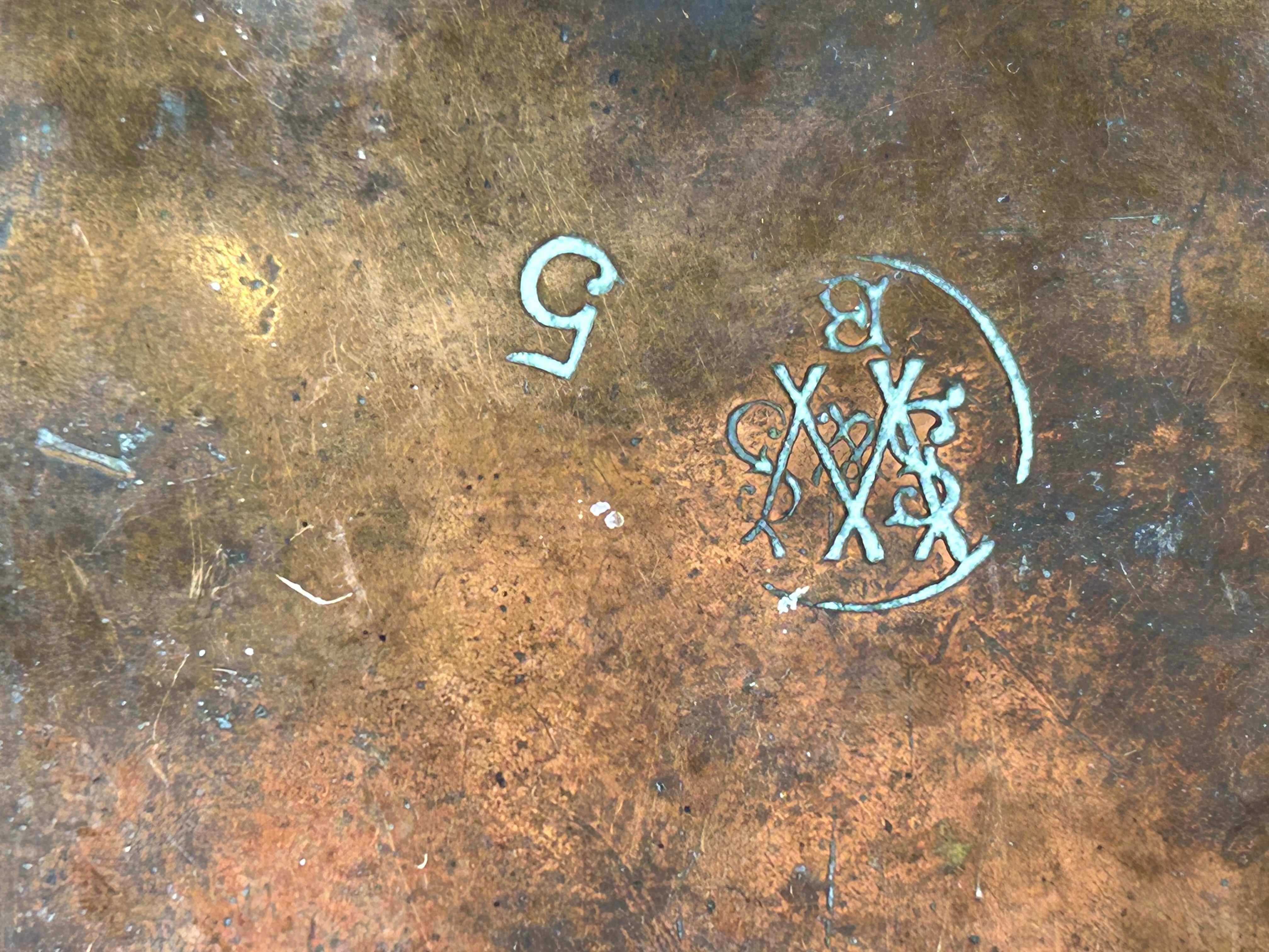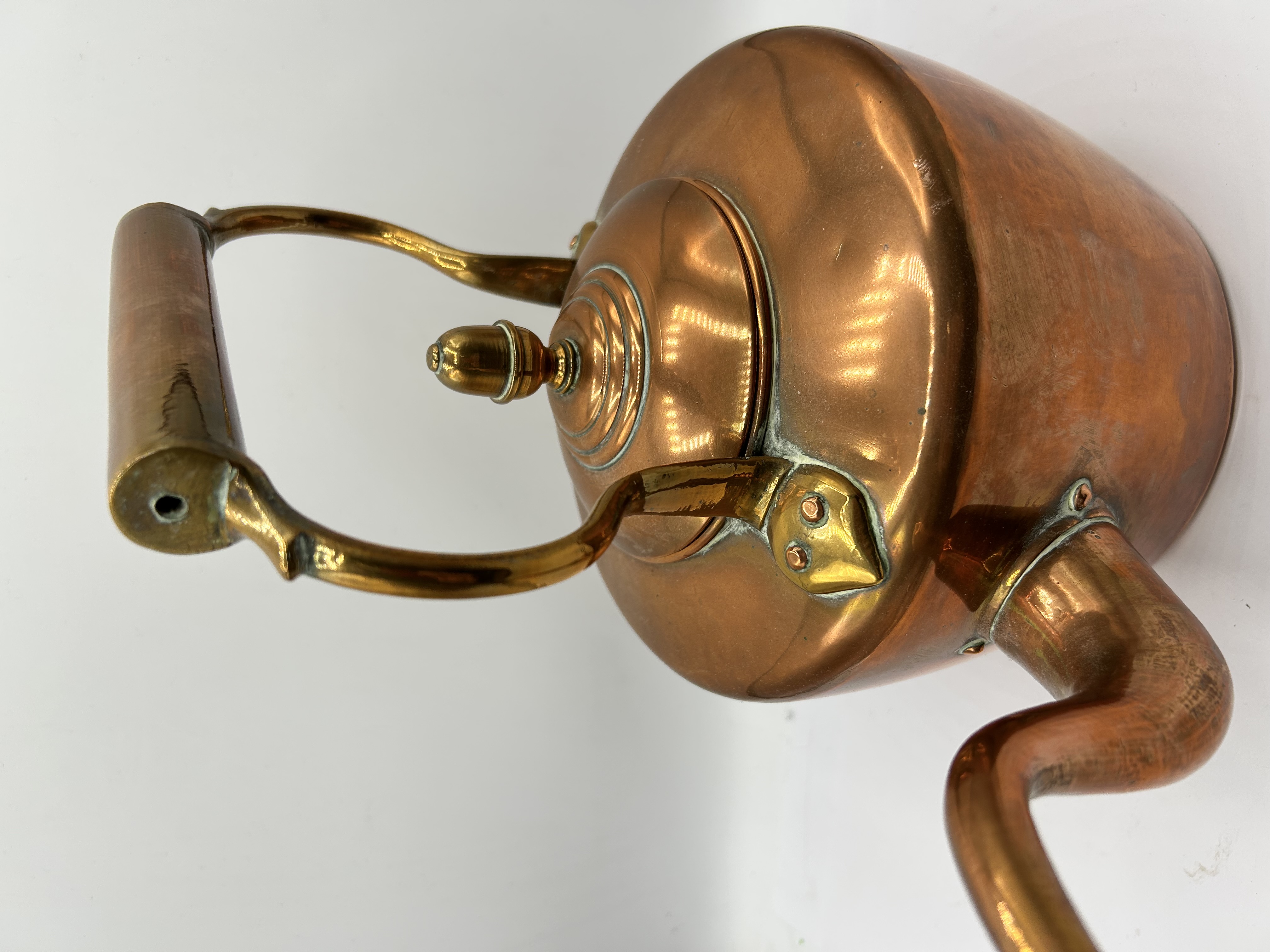 A George III copper kettle featuring a cylindrical body and a gooseneck spout. The construction incorporates a copper body and handle grip with brass handle supports. The kettle is fitted with a domed lid and a brass finial. Copper rivets are visible at the spout and handle attachment points. The metal surface is stamped with a numeral 5 and a circular maker’s mark or monogram featuring stylized, overlapping letters.