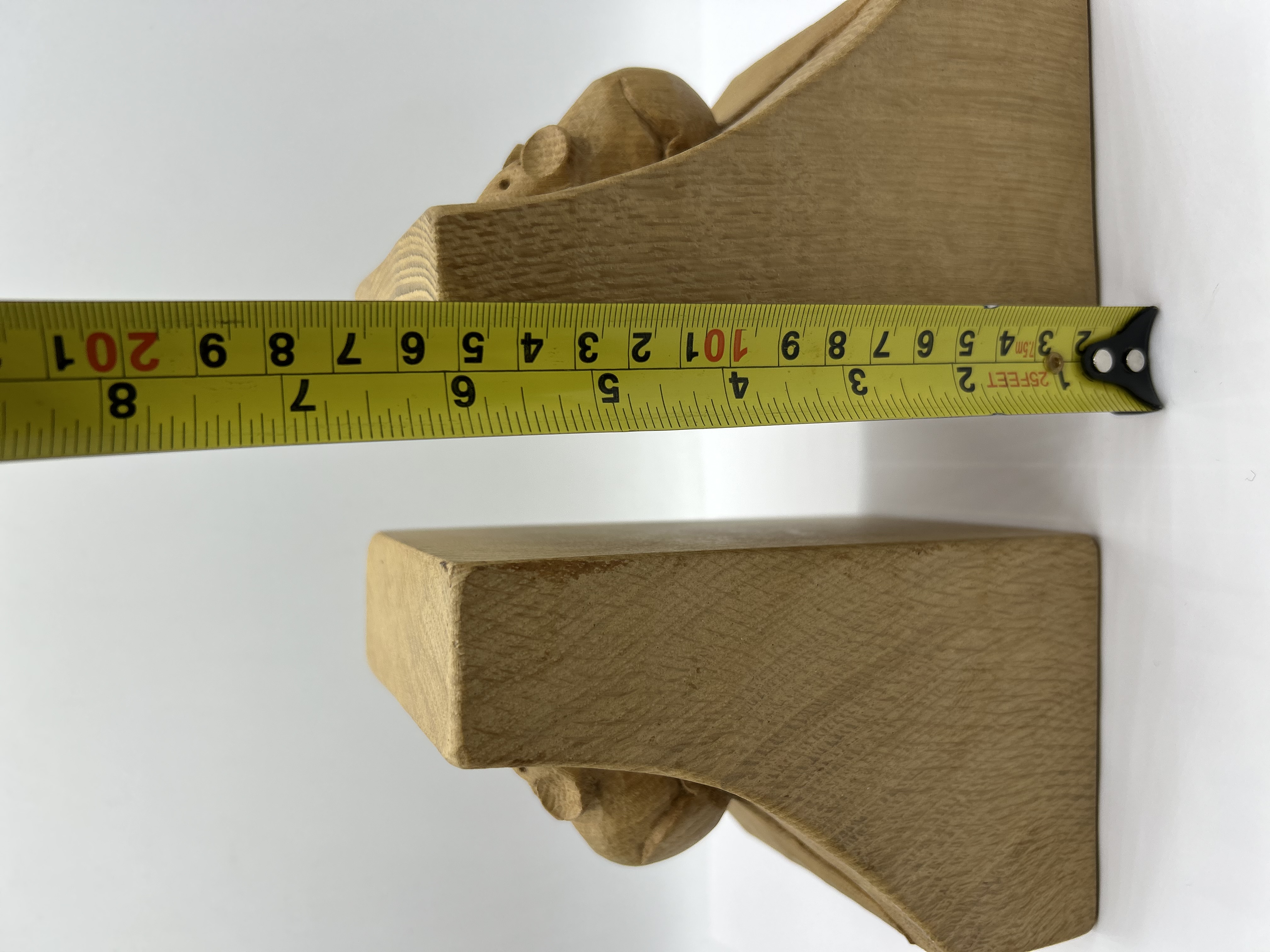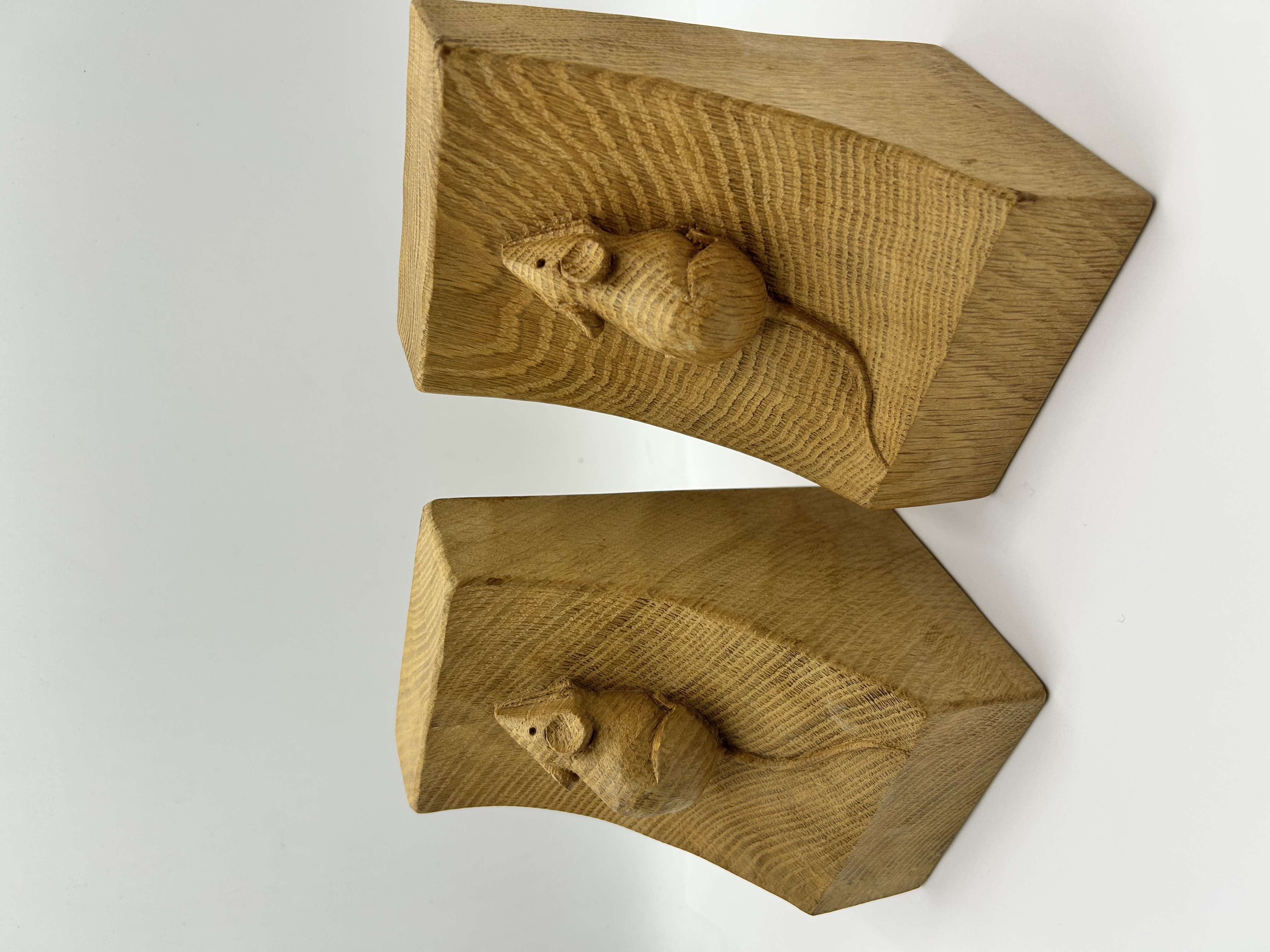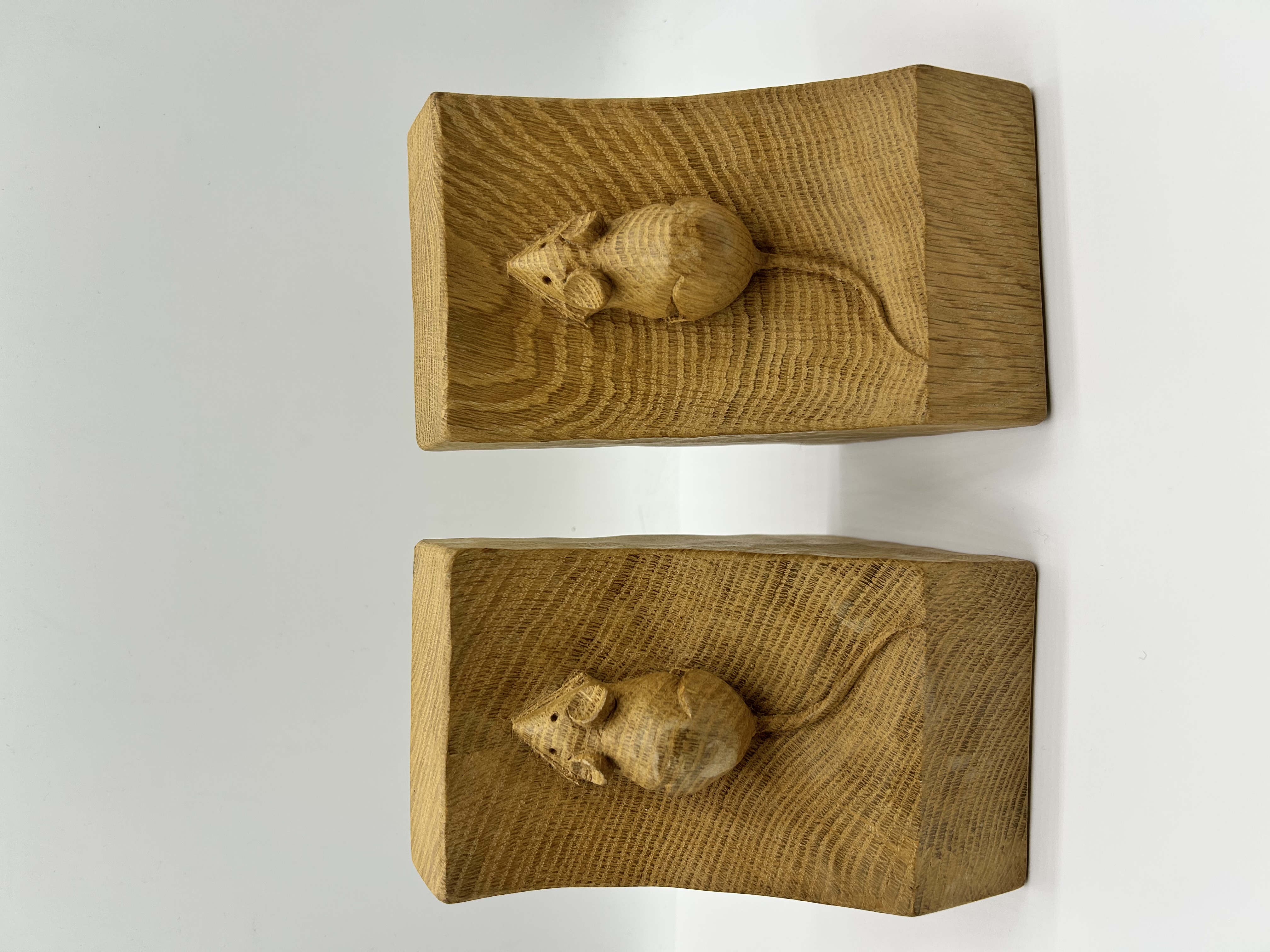 A pair of hand-carved oak bookends from the workshop of Robert Mouseman Thompson of Kilburn. Each bookend is crafted from solid oak and features the signature relief-carved mouse on the concave front face. The pieces exhibit an adzed finish and a polished surface.