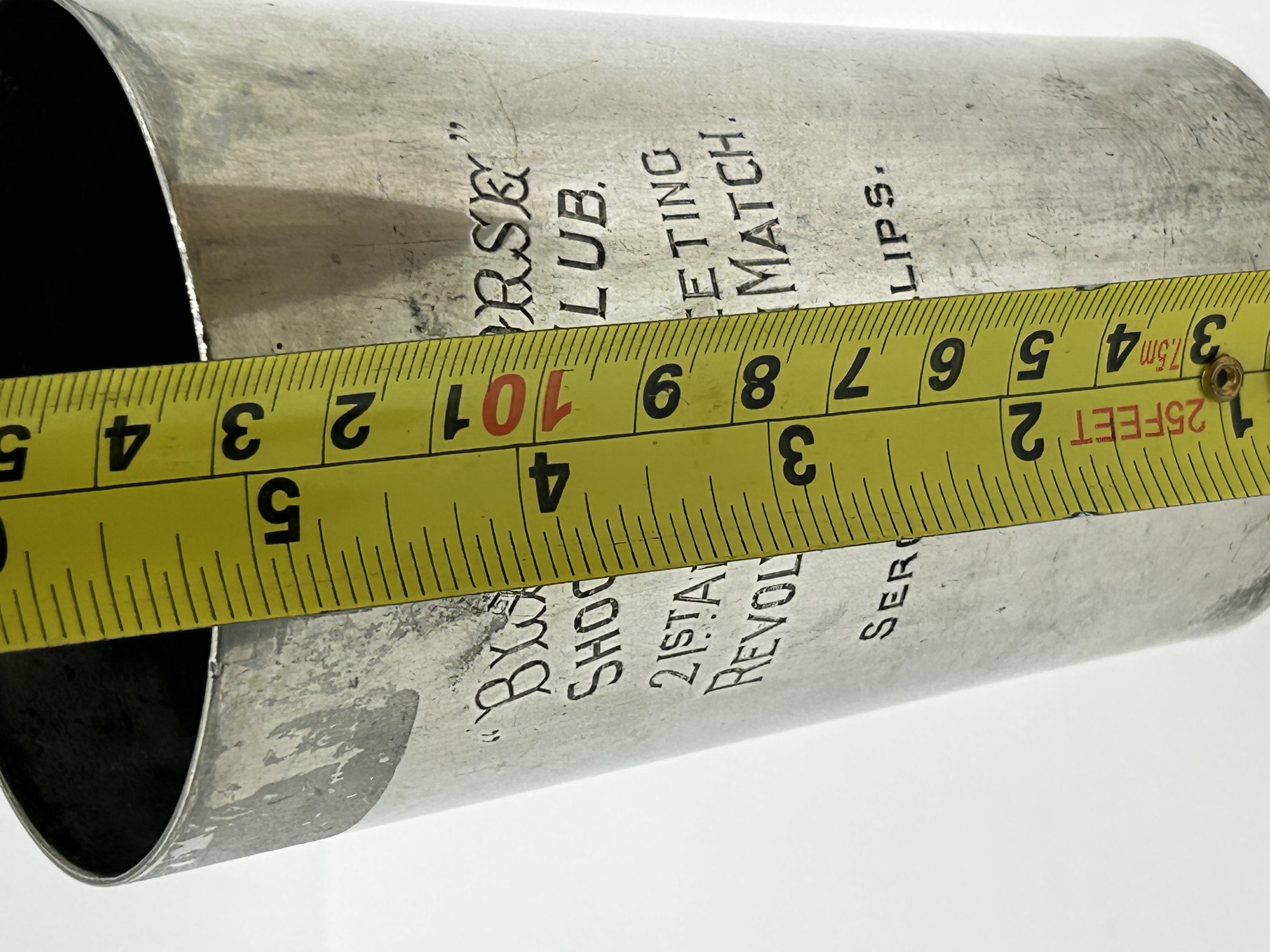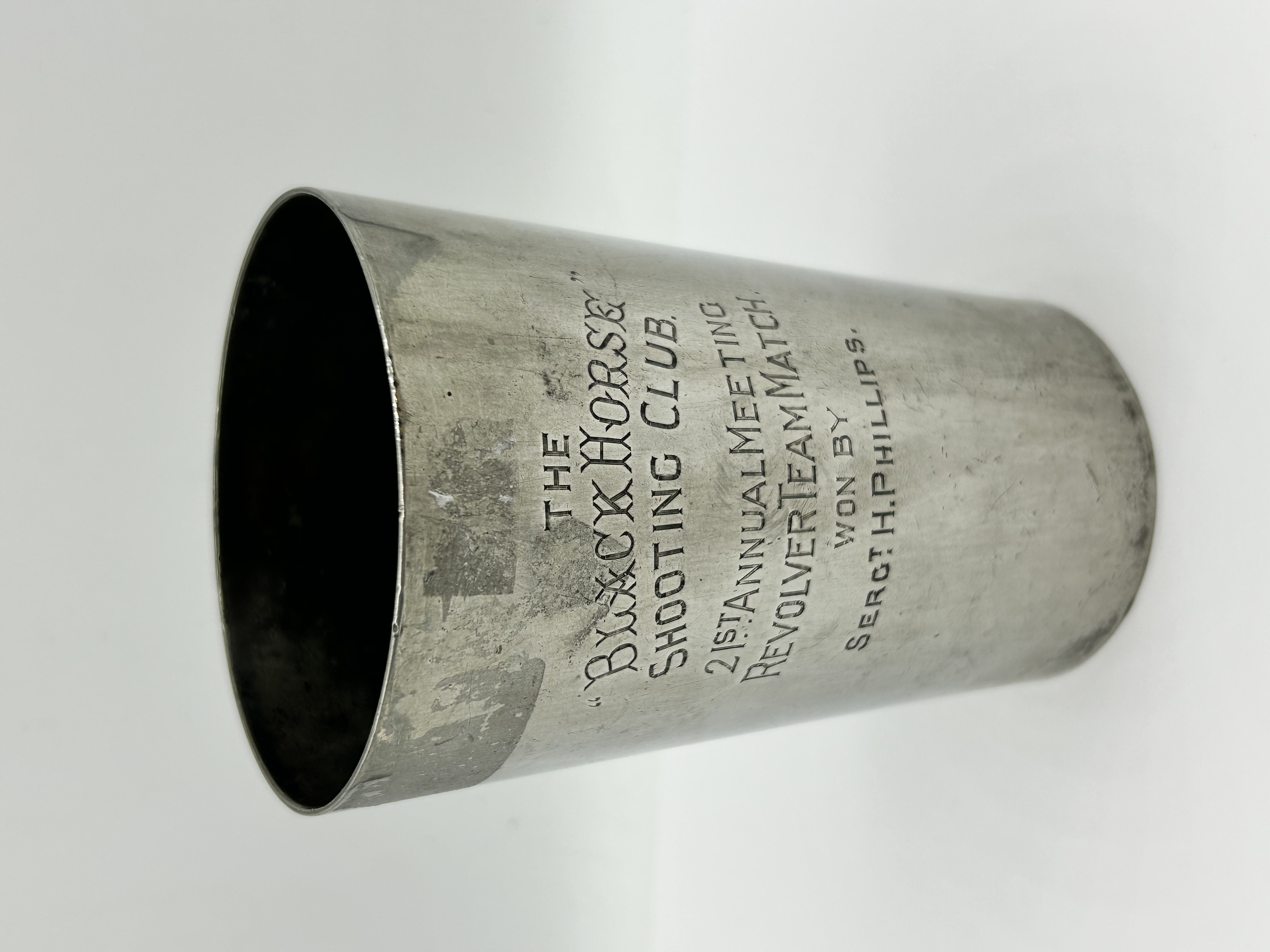 A tapered cylindrical trophy beaker produced by Mappin & Webb of Sheffield and London. The item is composed of electroplated Britannia metal. The front is engraved with the inscription THE BLACK HORSE SHOOTING CLUB / 21ST ANNUAL MEETING / REVOLVER TEAM MATCH / WON BY / SERG.T H. PHILLIPS. The base is stamped with the maker mark MAPPIN & WEBB ELECTRO BRITANNIA METAL PLATE SHEFFIELD & LONDON and includes a hand-scratched inventory mark.