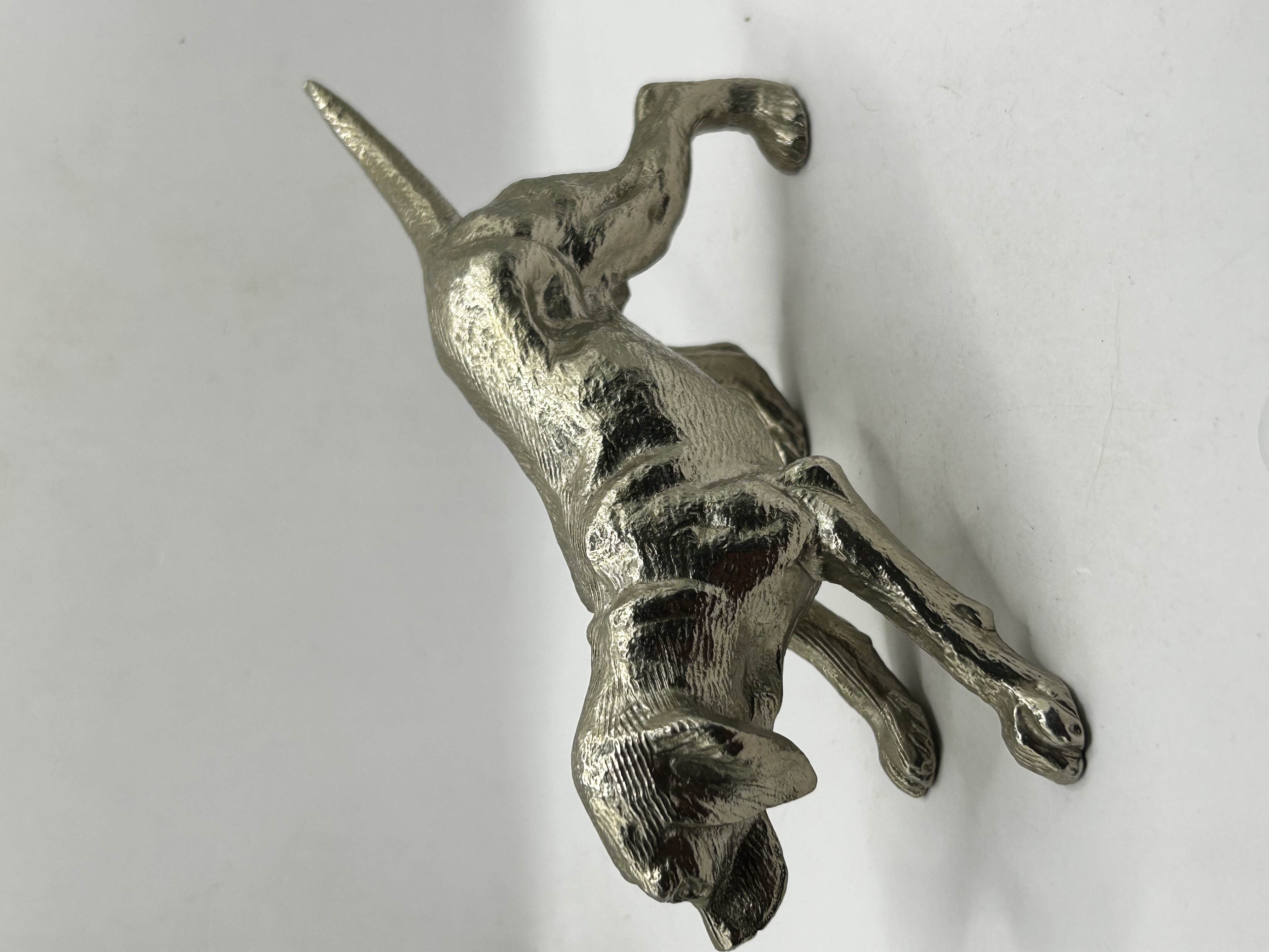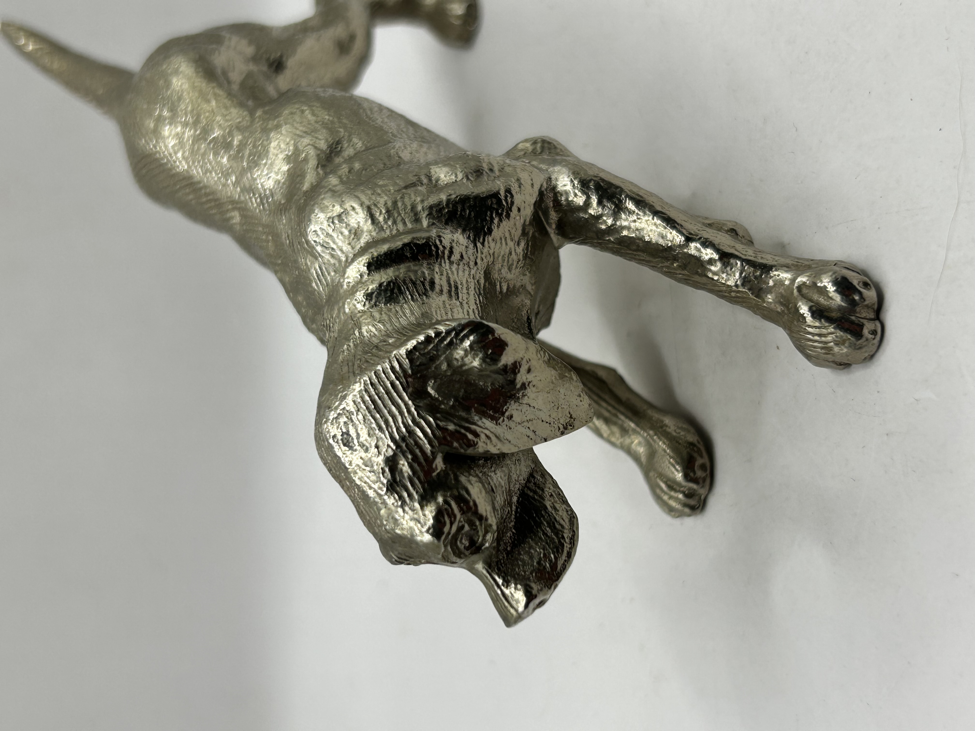 A cast silver-toned metal figurine modeled as a Labrador Retriever in a standing, alert pose. The sculpture features a naturalistic textured surface to represent fur and is finished in a bright, polished silver color. The item is modeled in the round with attention to anatomical detail. No maker’s marks or hallmarks are visible.