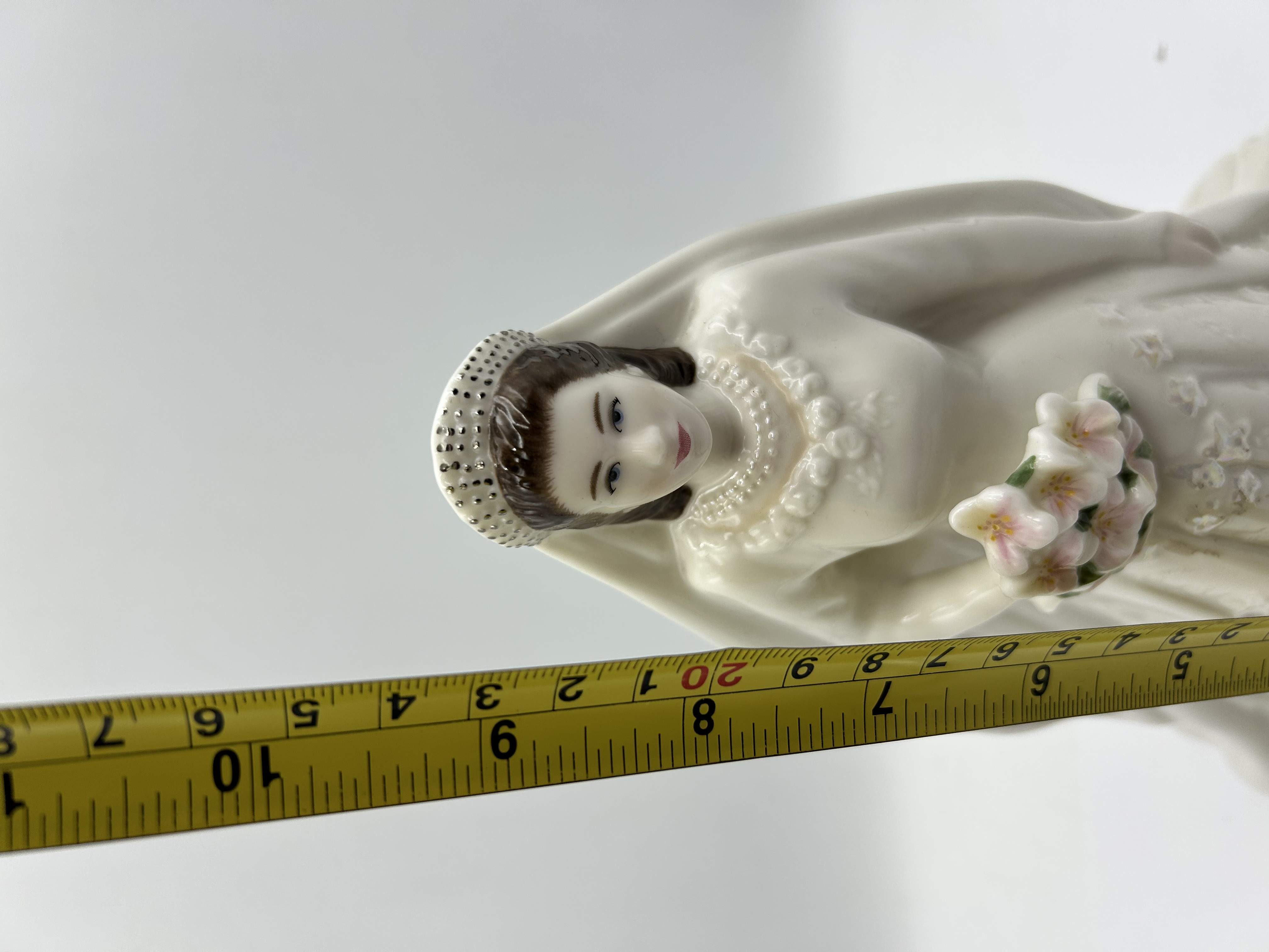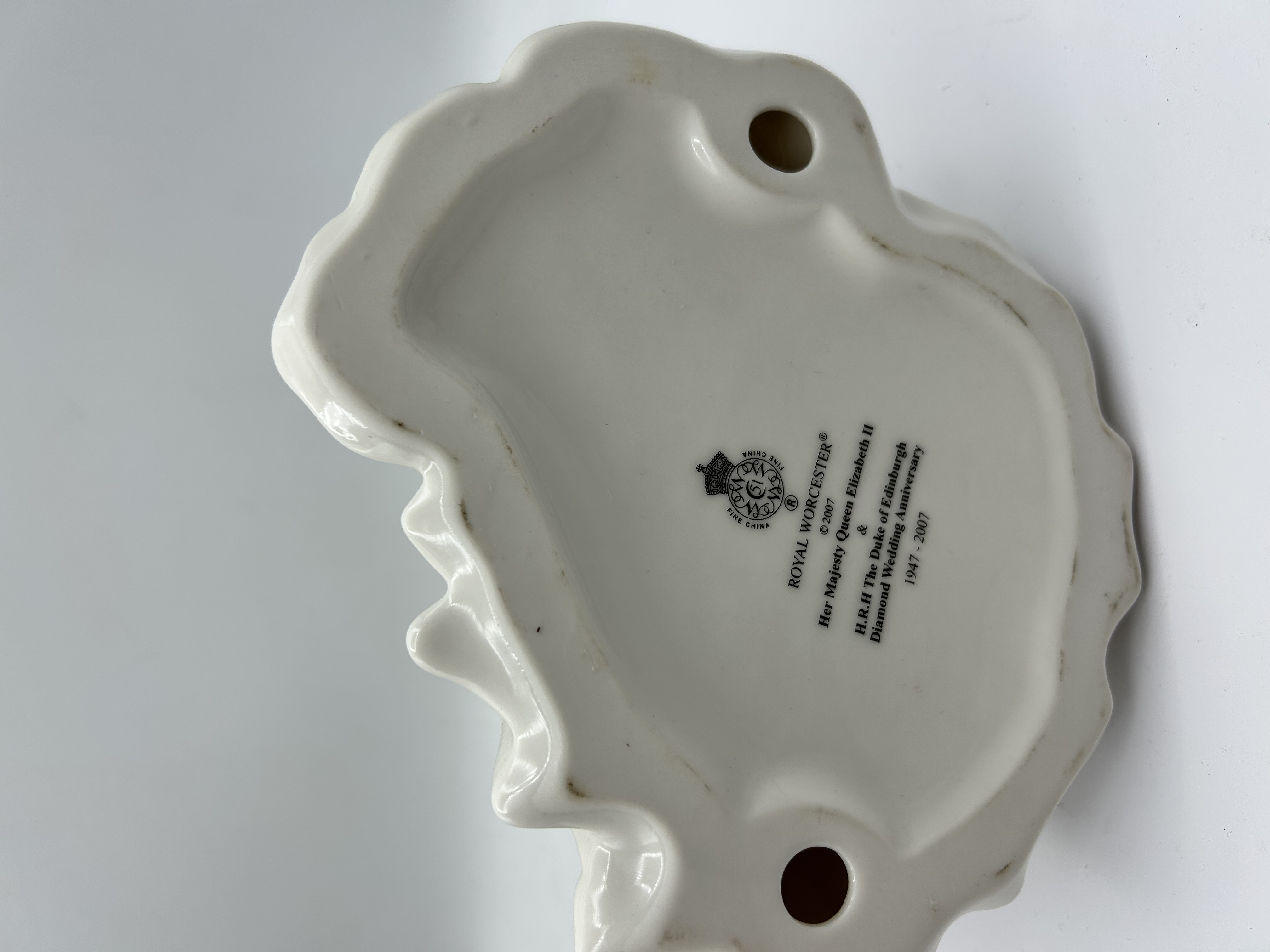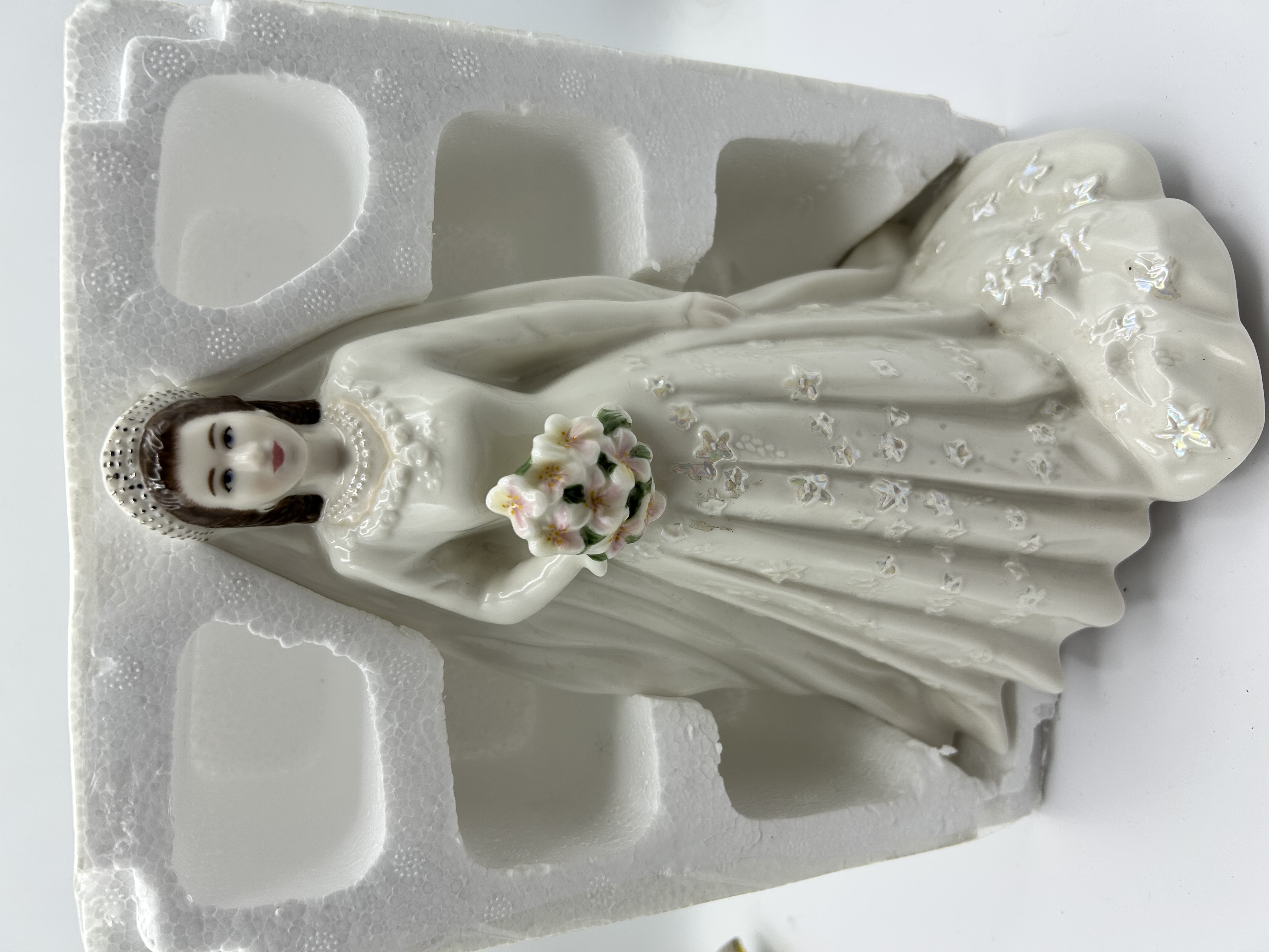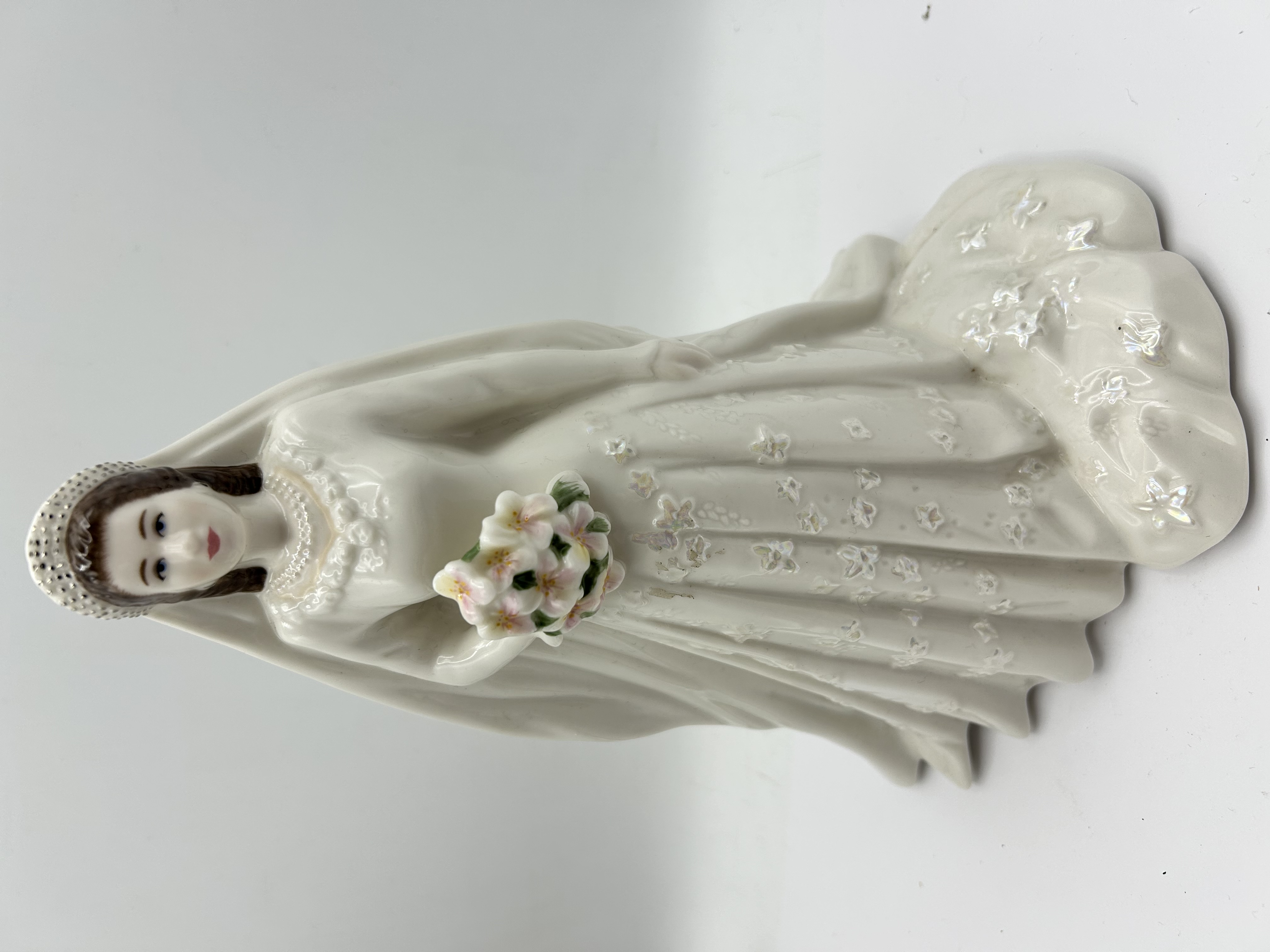 Royal Worcester fine bone china figurine produced in 2007 to commemorate the Diamond Wedding Anniversary of Her Majesty Queen Elizabeth II and H.R.H. The Duke of Edinburgh (1947-2007). The figure depicts the Queen in her wedding gown, featuring molded floral embroidery with iridescent accents, a beaded tiara with an integrated veil, and a bouquet of pink and white flowers. The underside of the base bears the official Royal Worcester maker’s mark and a commemorative inscription. The item includes its original custom-molded styrofoam packaging.