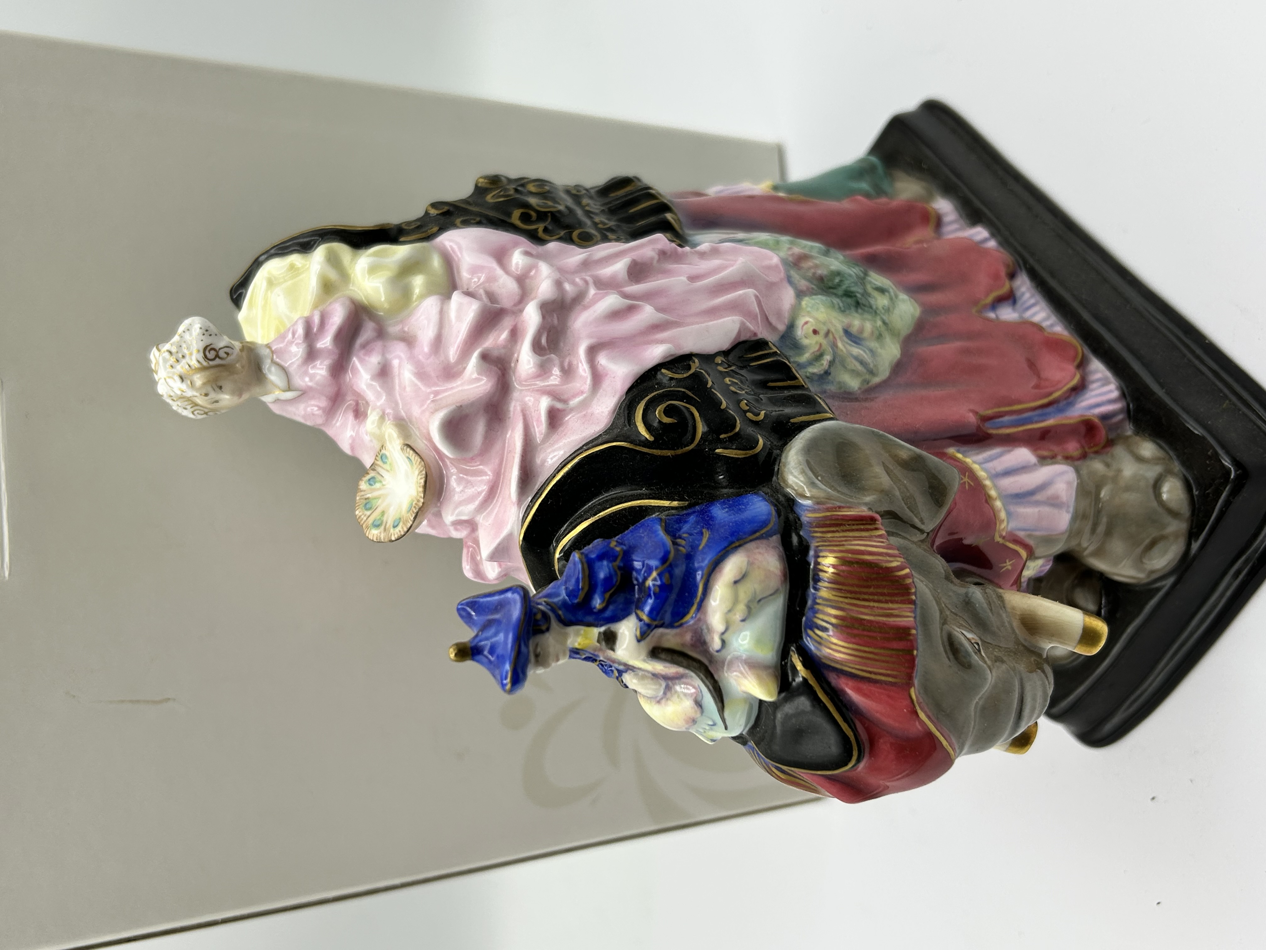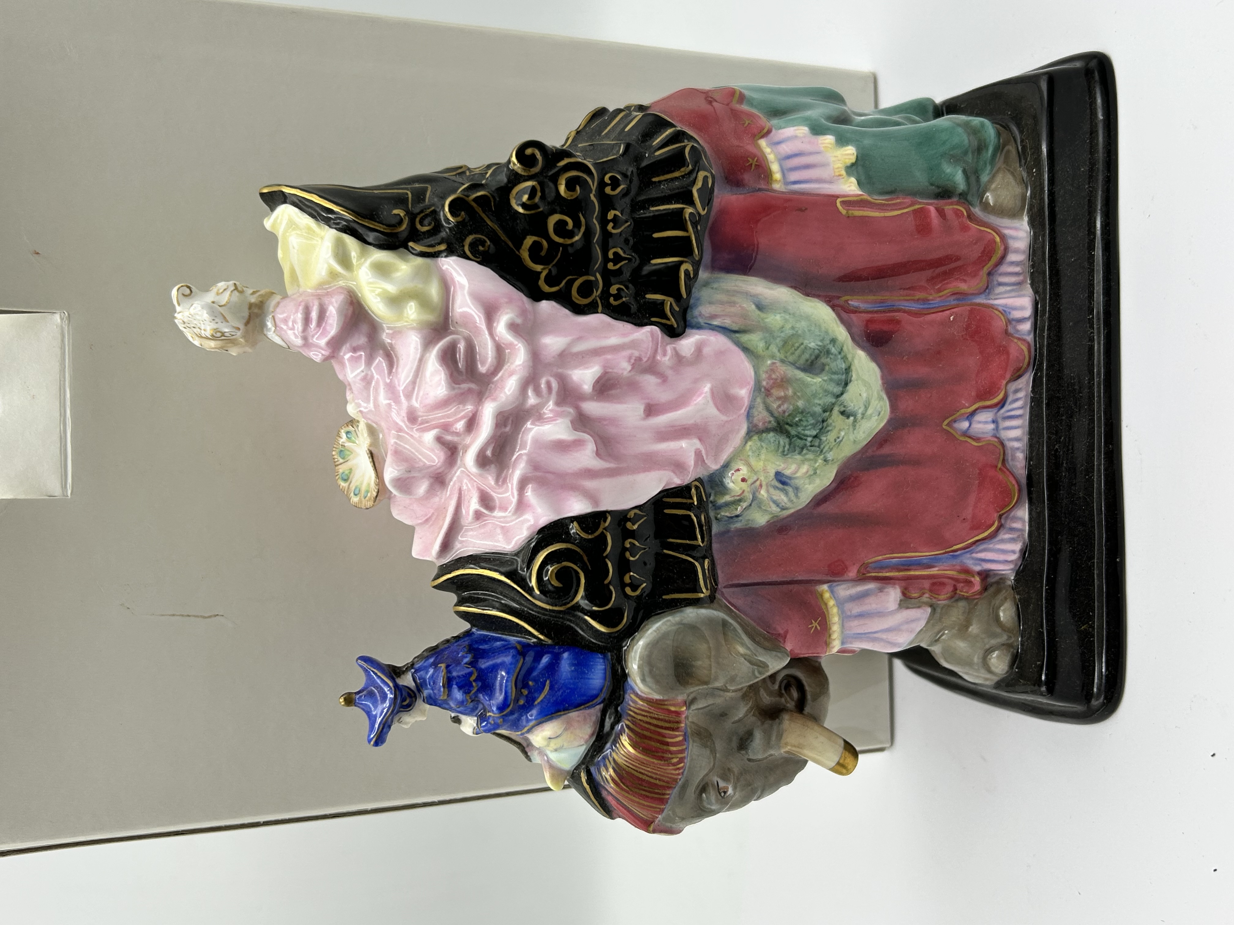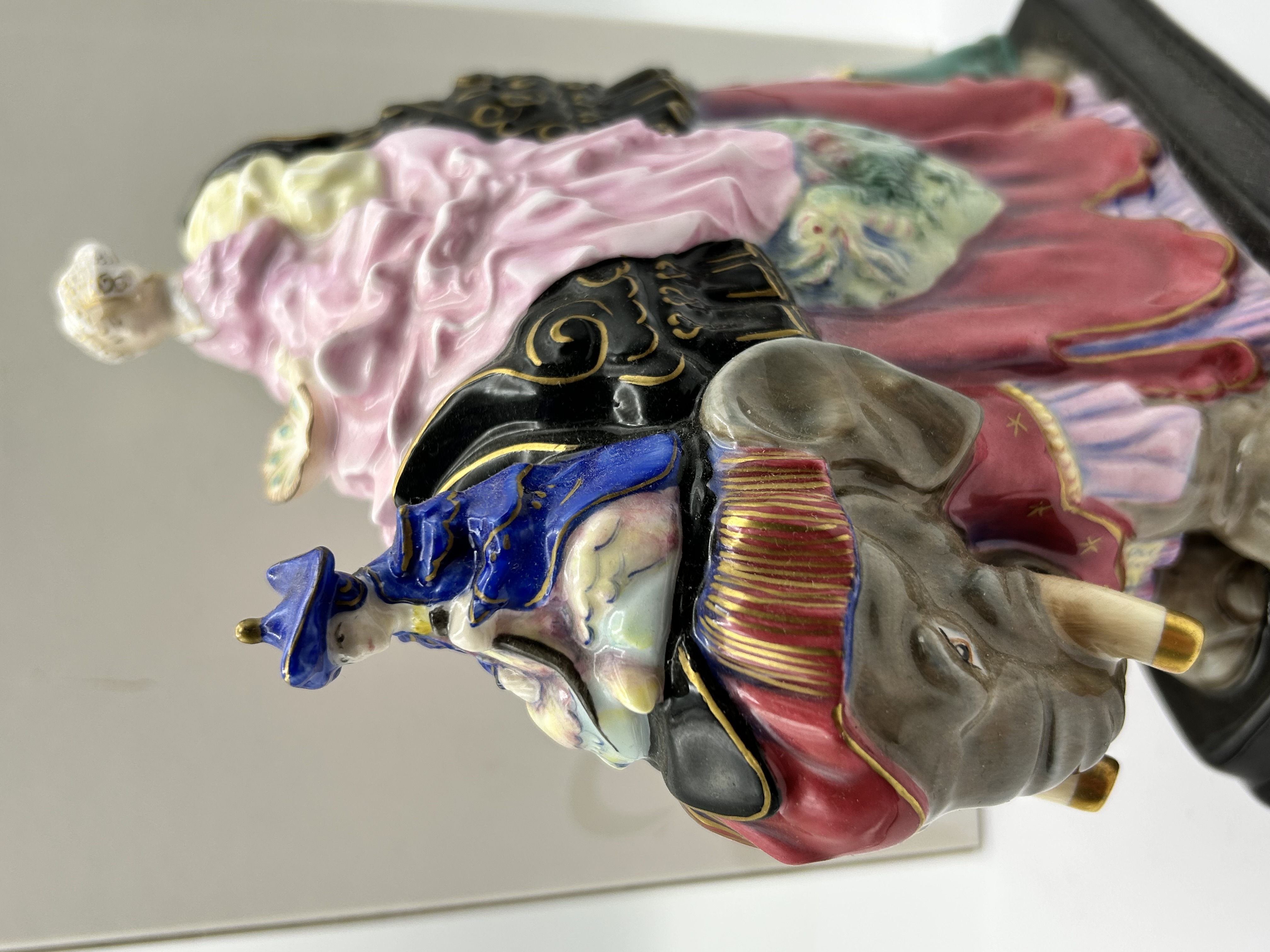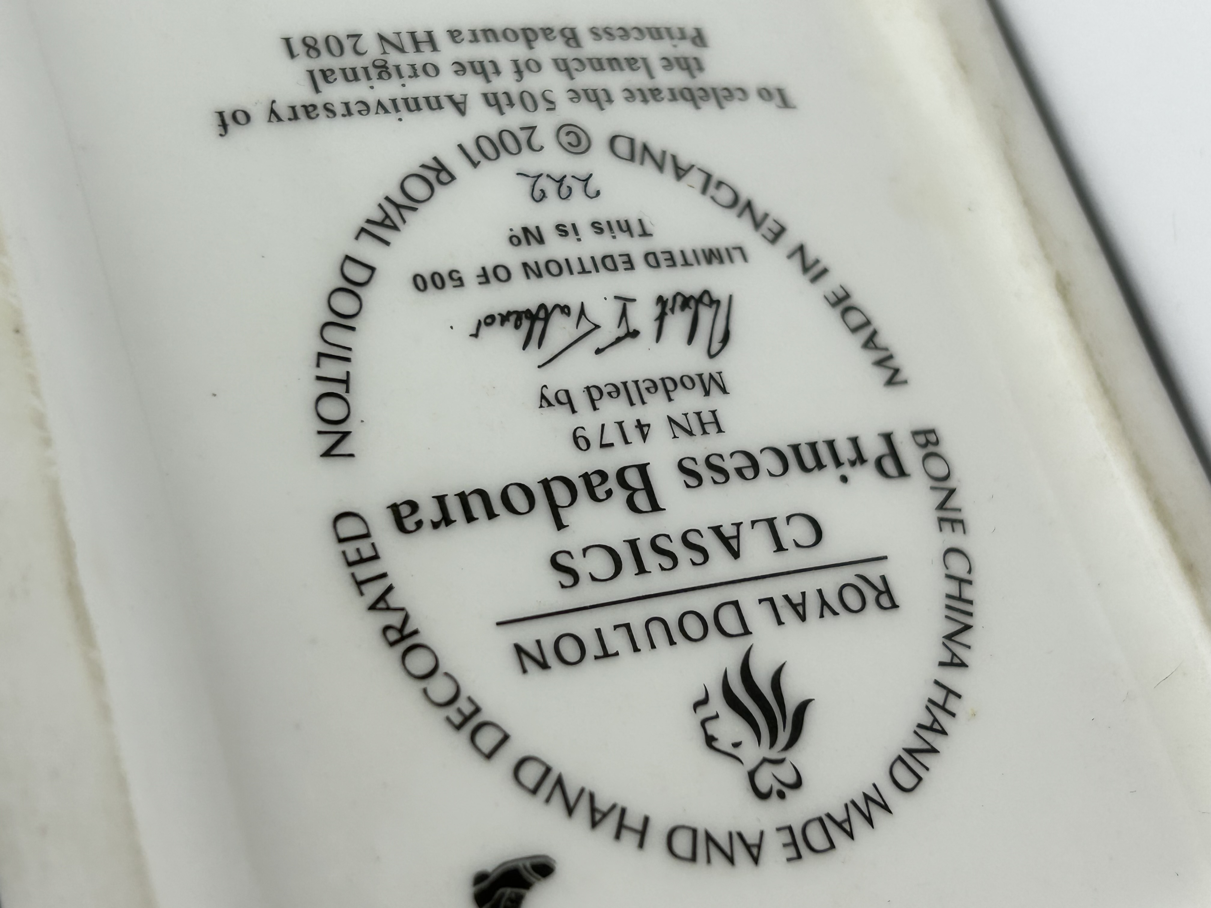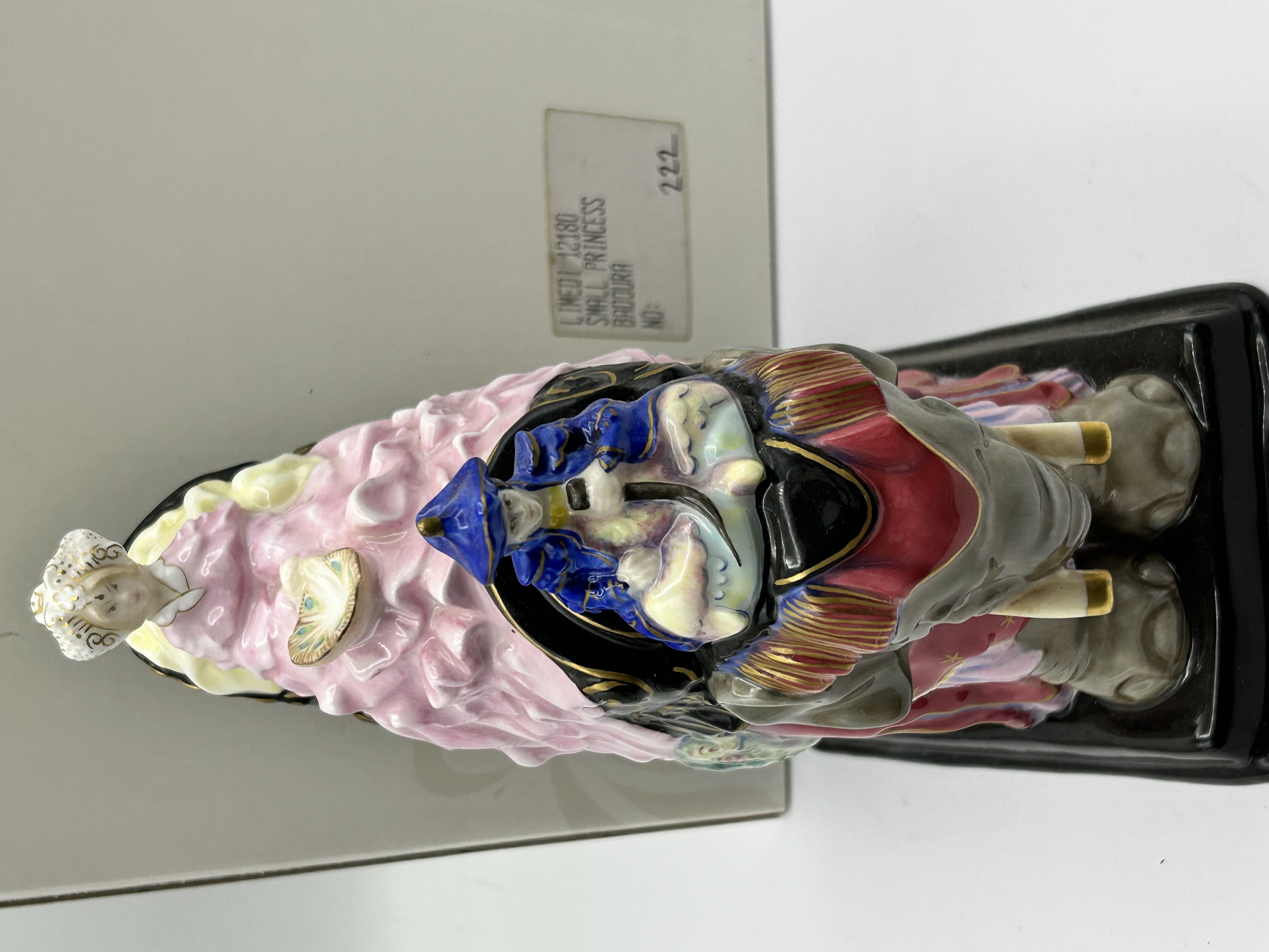 A Royal Doulton Princess Badoura hand-decorated bone china figurine, model HN4179. This piece was modeled by Robert I. Tabbenor and issued in 2001 to commemorate the 50th anniversary of the original 1952 design. The figurine depicts a princess in voluminous pink robes and ornate headwear seated atop a gray elephant with decorative red and gold caparisons. An attendant figure is positioned forward on the elephant’s neck. The work is set on an integral rectangular black base and features a palette of pink, blue, red, and gold accents. The underside is fully marked with the Royal Doulton logo, title, modeler’s name, and is hand-numbered 222 from a limited edition of 500.