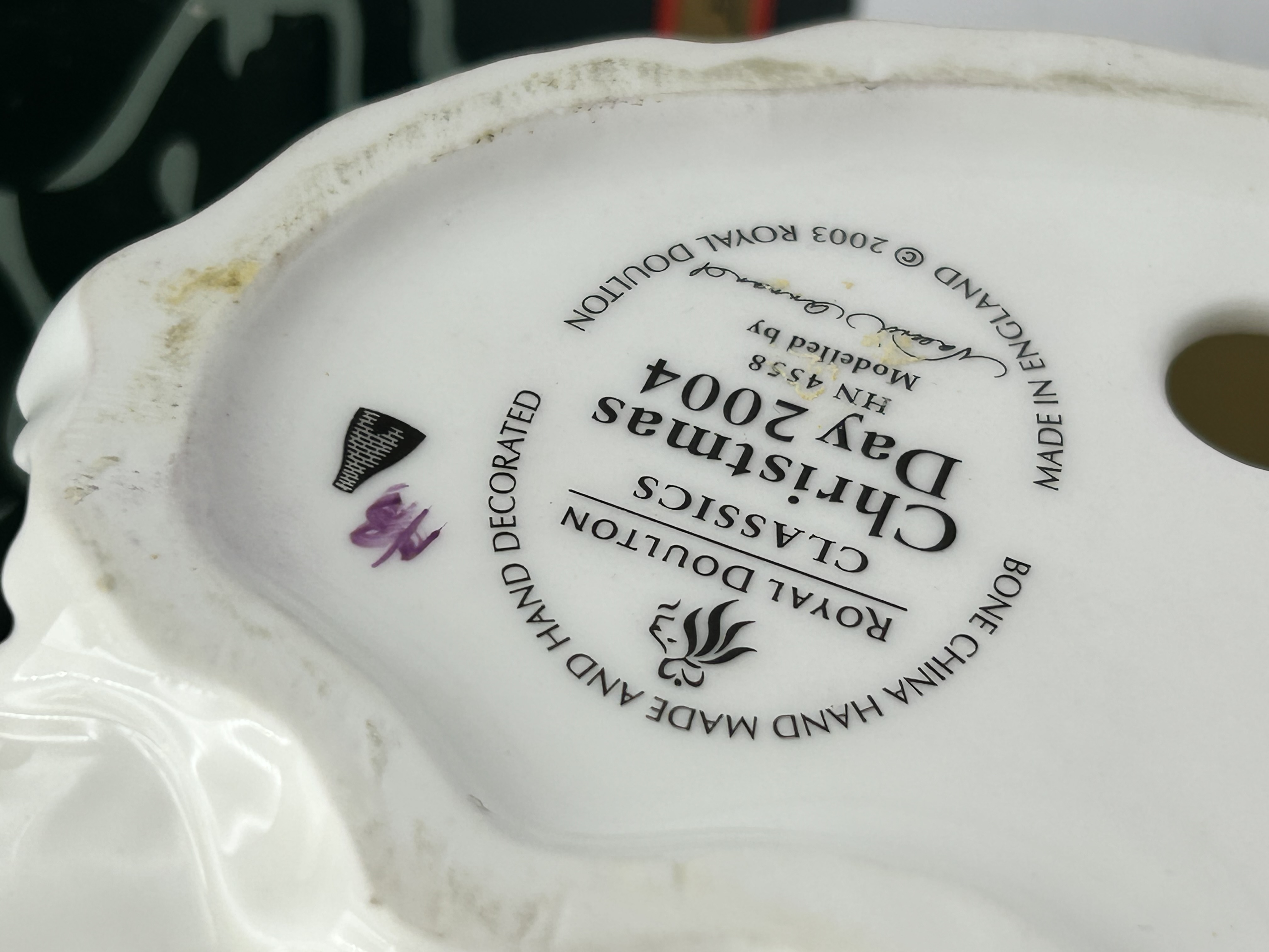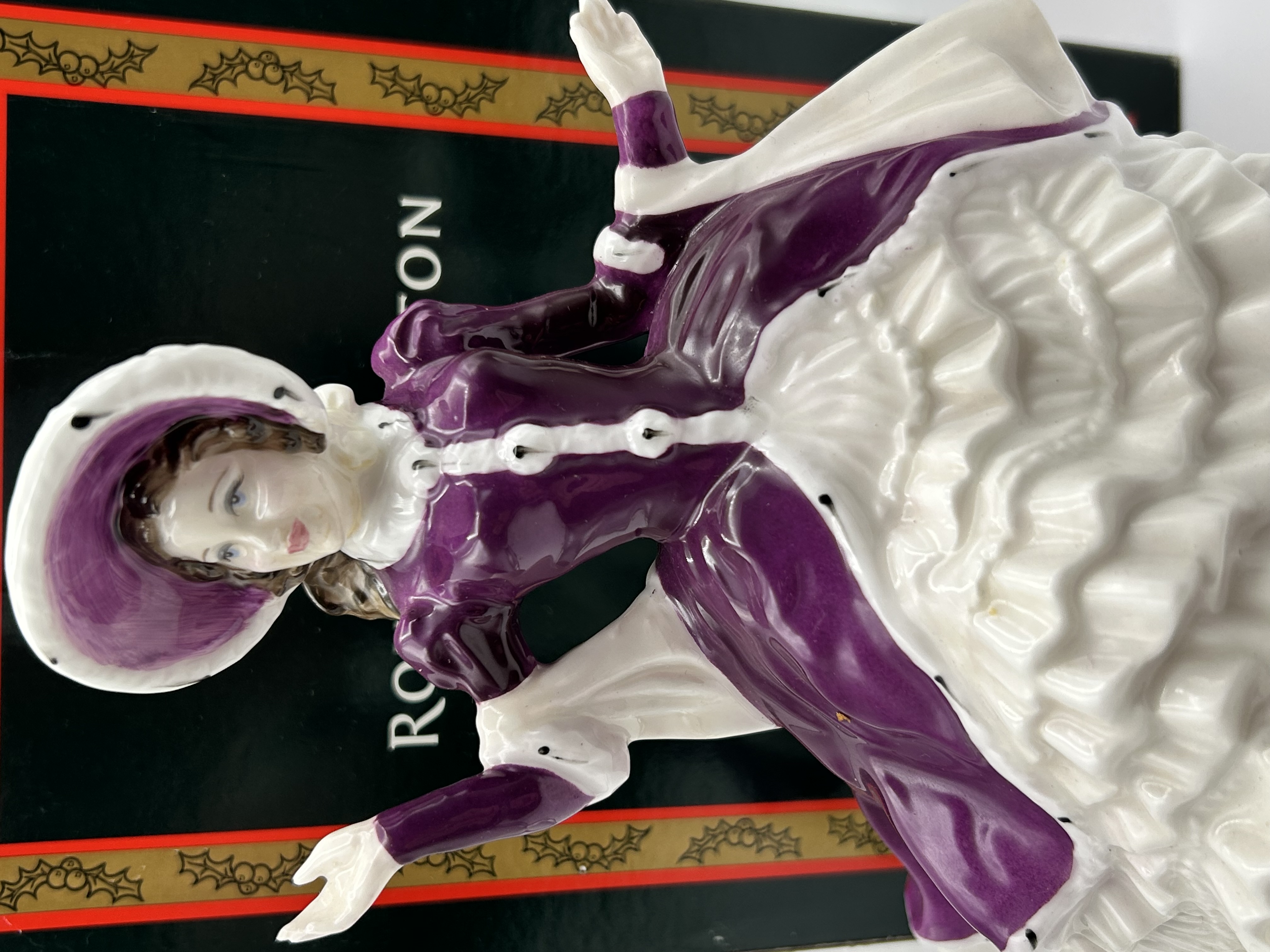 A Royal Doulton bone china figurine titled Christmas Day 2004, model number HN 4558. This hand-made and hand-decorated piece was modeled by Valerie Annand and manufactured in England. The figure depicts a woman in Victorian-style attire, wearing a wide-brimmed purple hat and a matching purple bodice over an expansive, tiered white ruffled skirt. The underside of the base features the official Royal Doulton Classics backstamp, including the copyright date of 2003 and the 2004 series designation. The item is accompanied by its original branded cardboard box featuring a holly border.