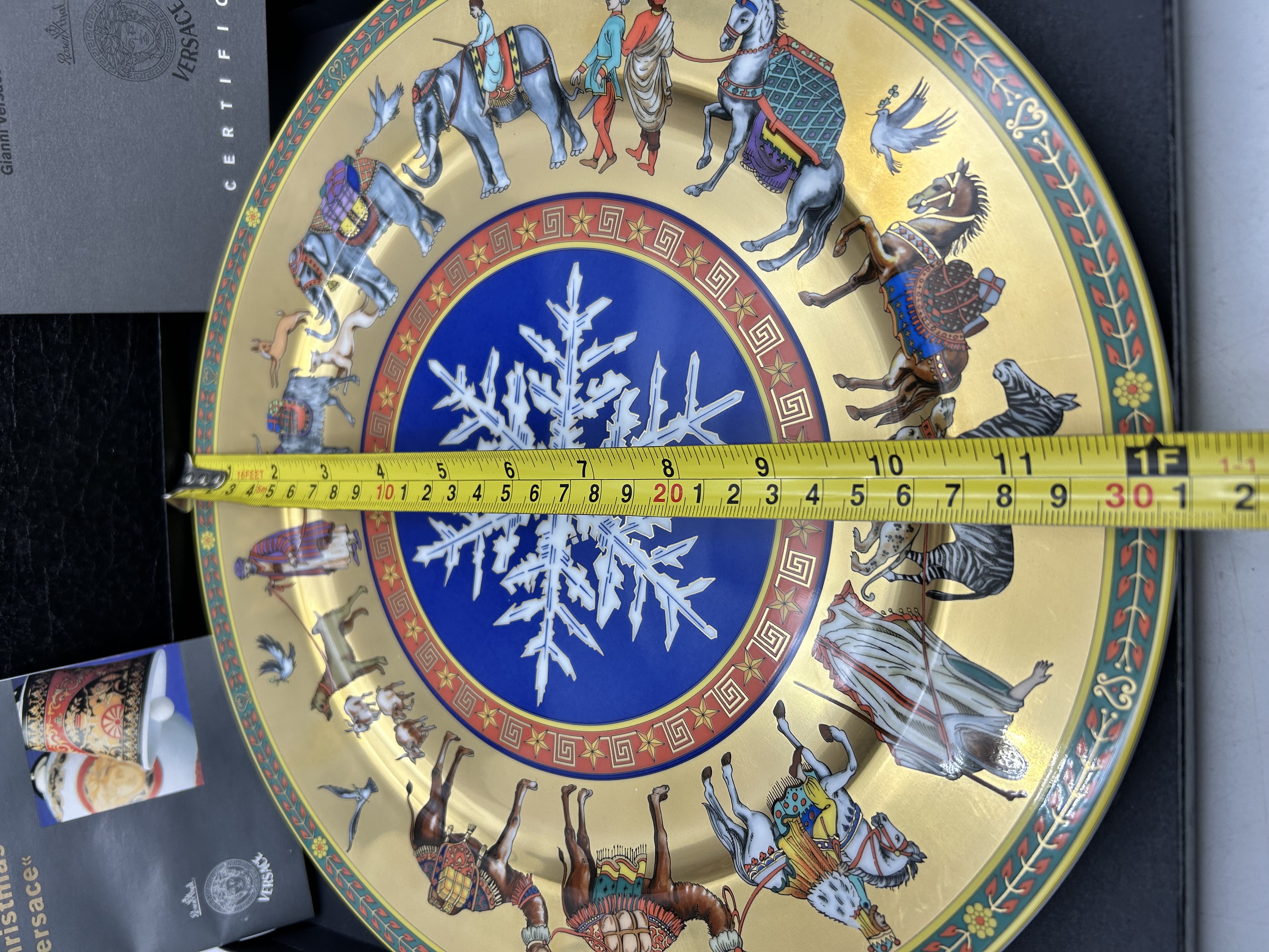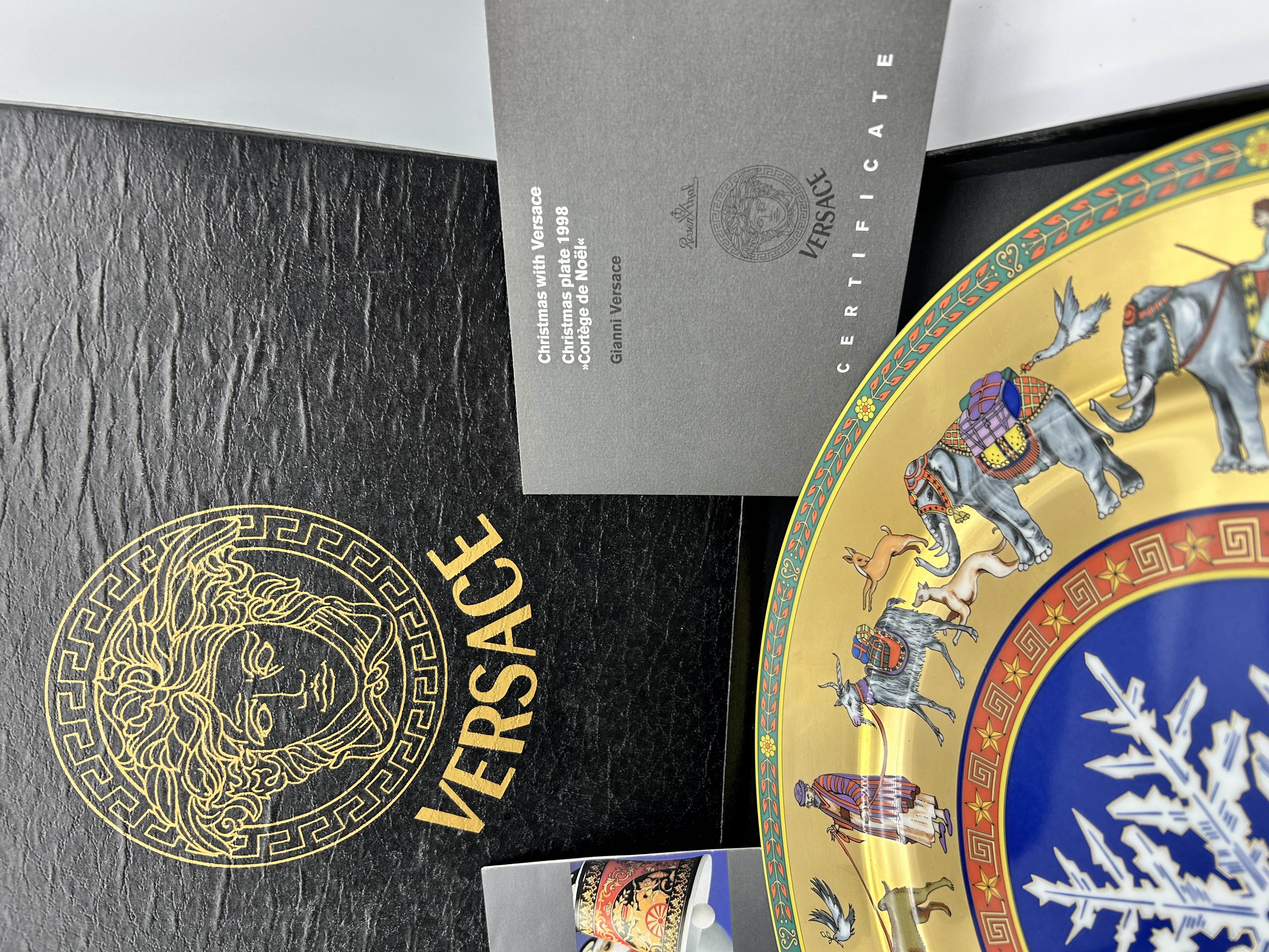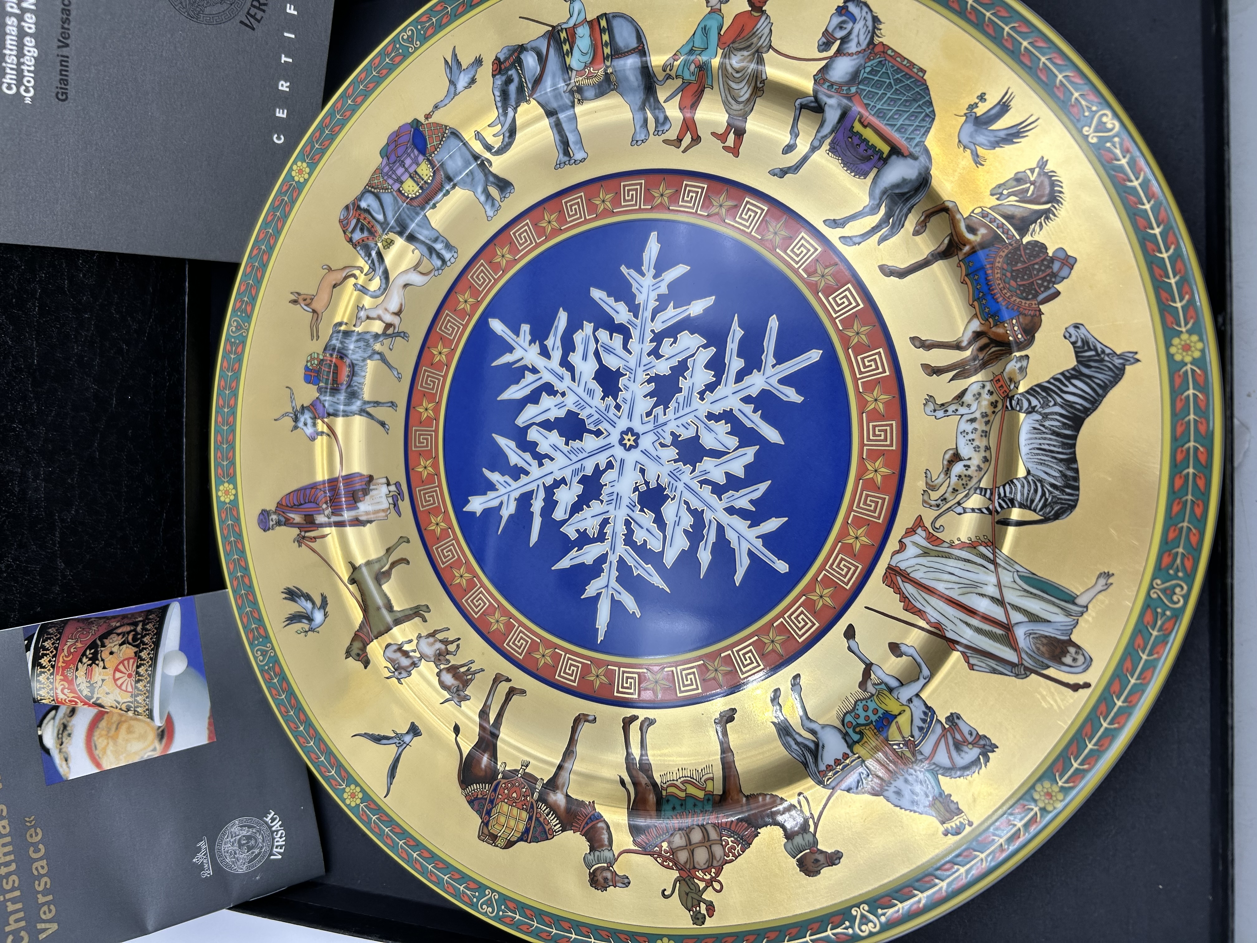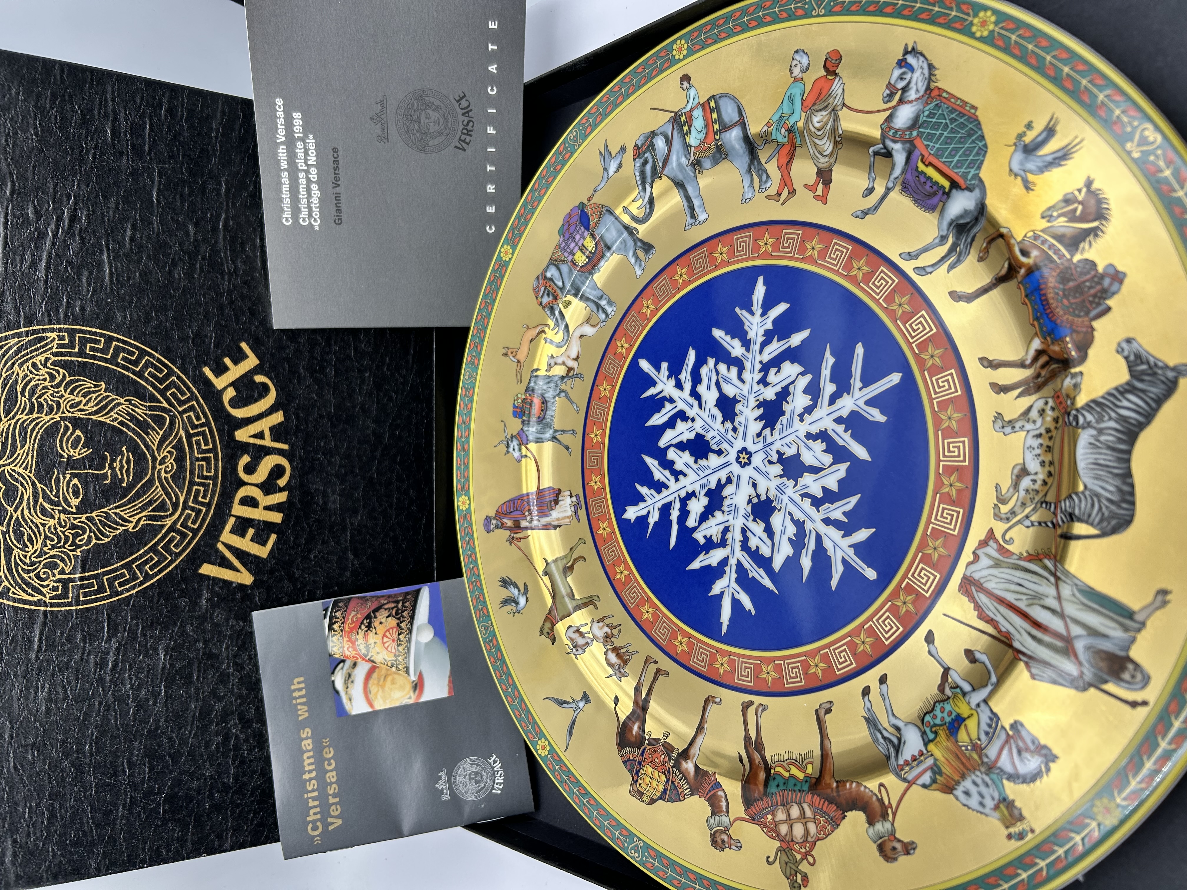 A Rosenthal for Versace porcelain collector plate from the 1998 Christmas with Versace collection titled Cortege de Noel. The plate features a central white snowflake medallion set against a vibrant blue ground, enclosed by a red border with gold-toned Greek key and star motifs. The wide rim depicts a polychrome processional frieze of various animals including elephants, camels, zebras, and horses alongside figures in decorative dress, all set upon a gold-toned field. The outer edge is finished with a green and red floral vine border. The item is accompanied by its original black presentation box featuring the gold Medusa head logo, a certificate of authenticity, and supplemental literature.
