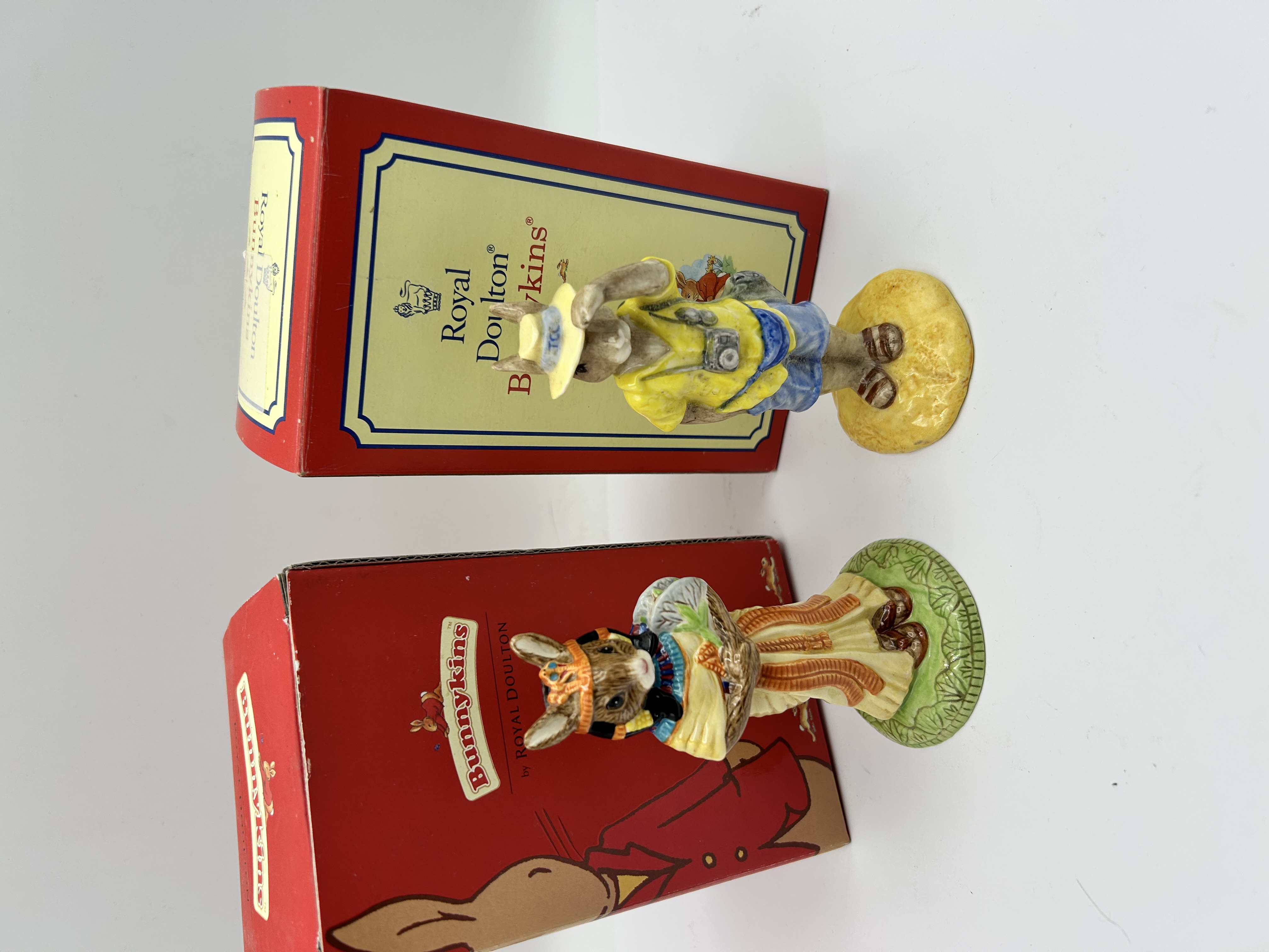 A pair of hand-painted porcelain figurines from the Royal Doulton Bunnykins collection, accompanied by their original cardboard packaging. The first figurine is identified as Tourist Bunnykins, reference DB190, issued in 1998. It depicts a rabbit character dressed in a yellow shirt, blue shorts, and a sun hat, with a camera accessory suspended from its neck. The second figurine is an anthropomorphic rabbit in Egyptian-inspired costume, wearing a traditional crown and collar while carrying a basket of produce. Both items are set upon integral circular bases. The accompanying red and cream boxes feature the Royal Doulton Bunnykins logo and illustrative graphics.