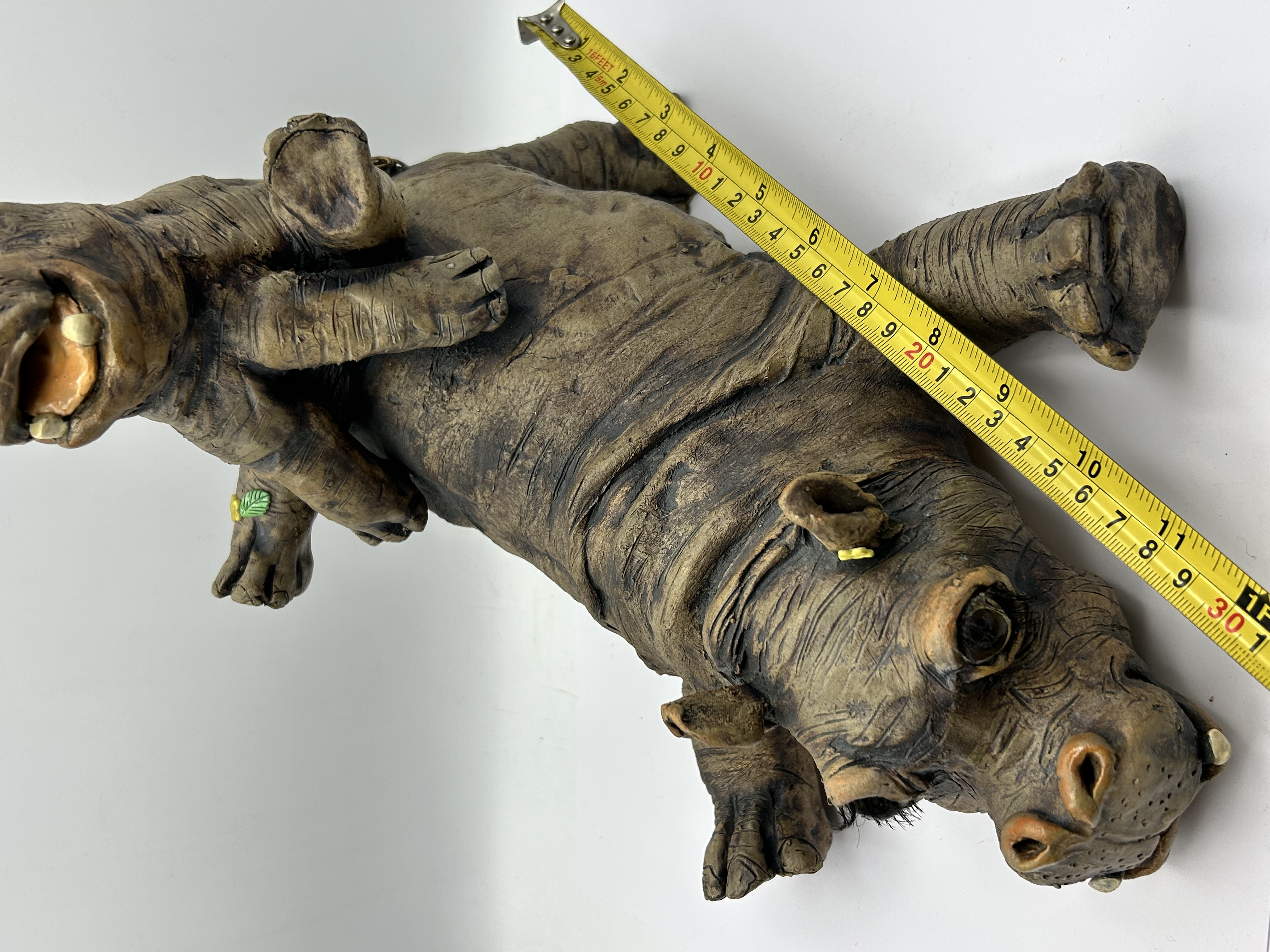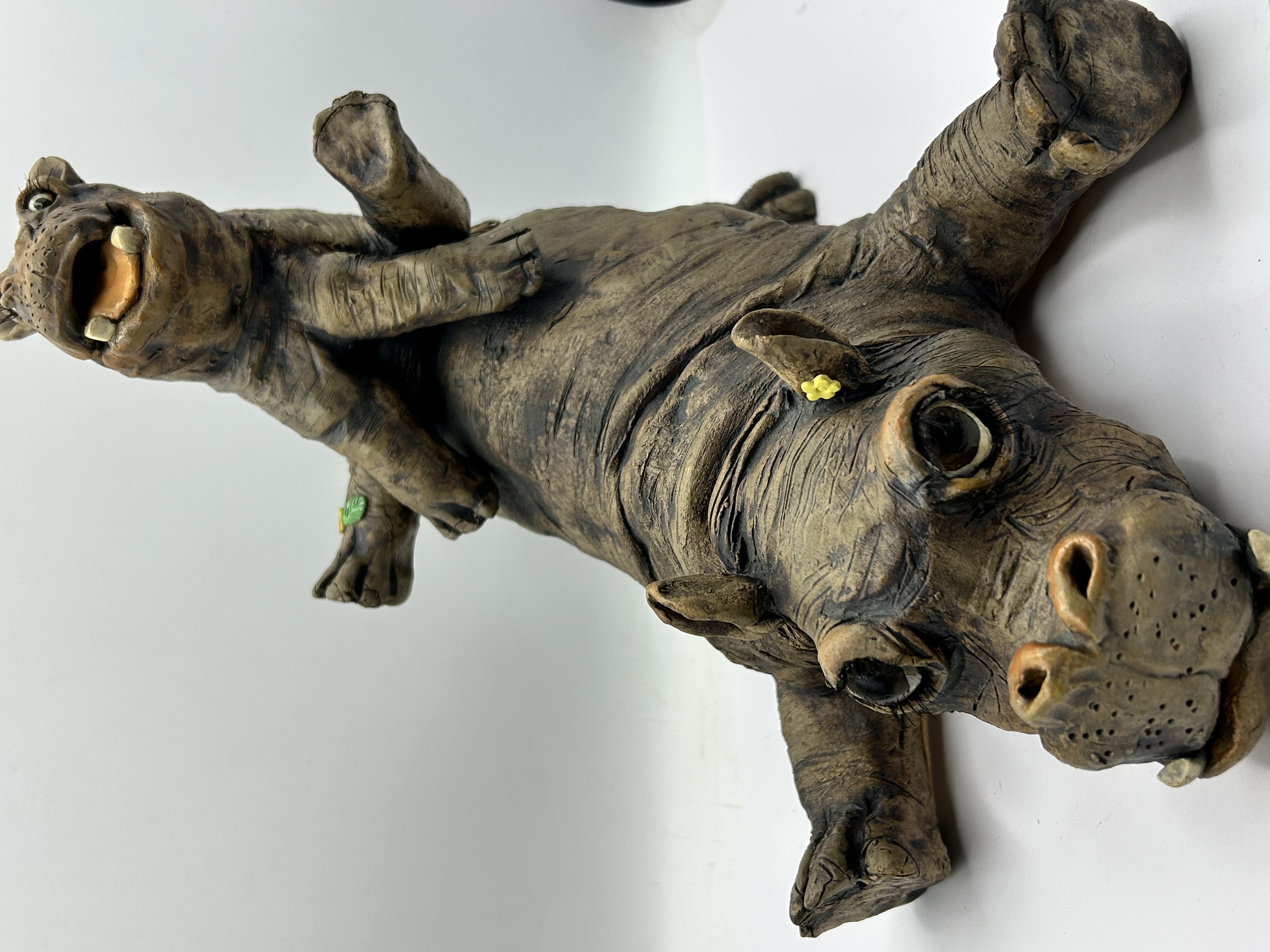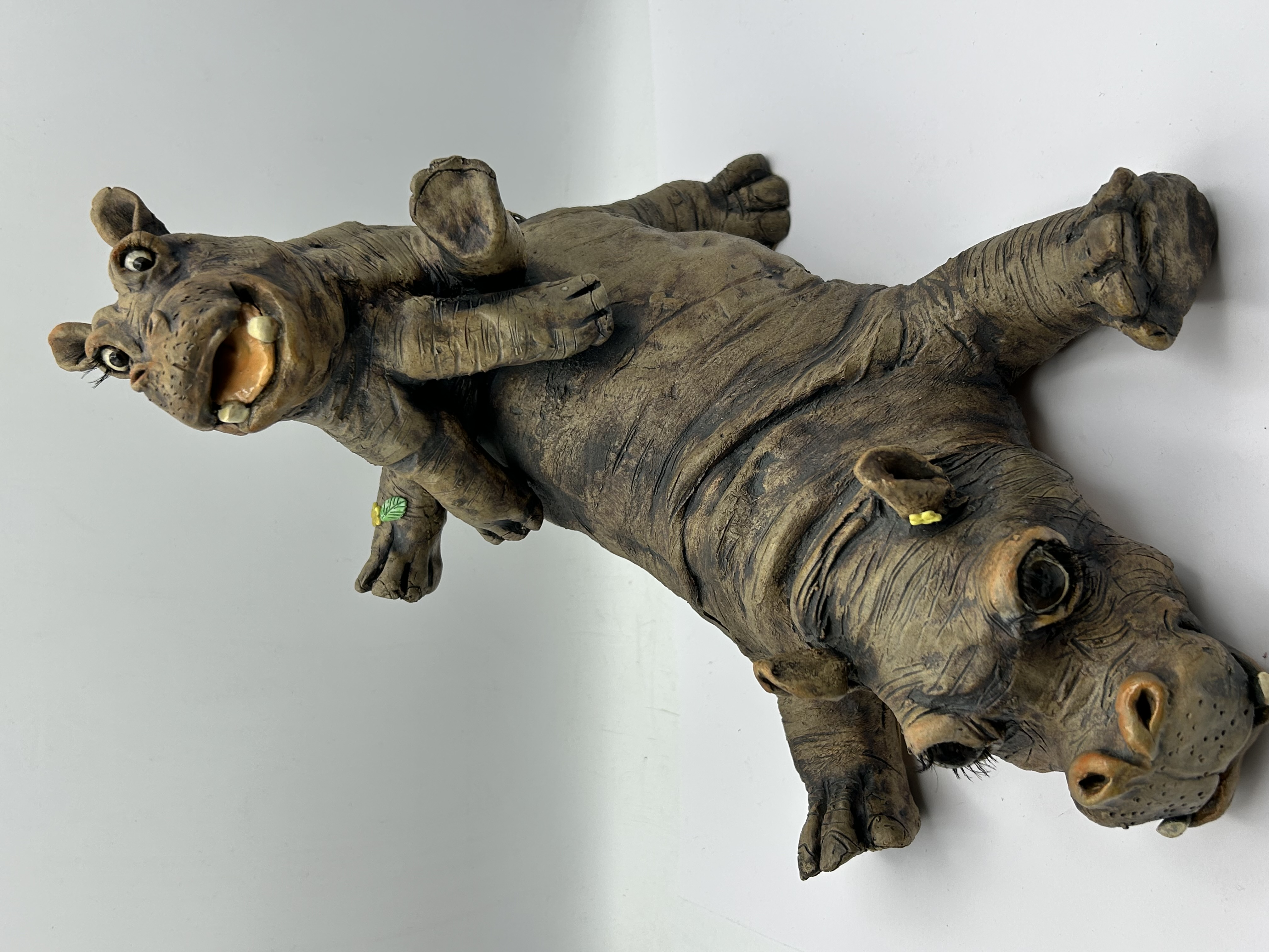 A contemporary sculpture from the Country Artists A Breed Apart collection, specifically the Wallow pattern. This piece depicts two hippopotamuses in a playful, stacked arrangement, with the larger animal lying on its back and supporting the smaller animal on its underside. The sculpture is rendered in a textured, matte, earth-toned stoneware mimicking the natural folds and creases of hippopotamus skin. Details include open mouths with visible teeth, large inset eyes with applied eyelashes, a yellow floral element by one ear, and a green leaf-shaped detail on a limb.