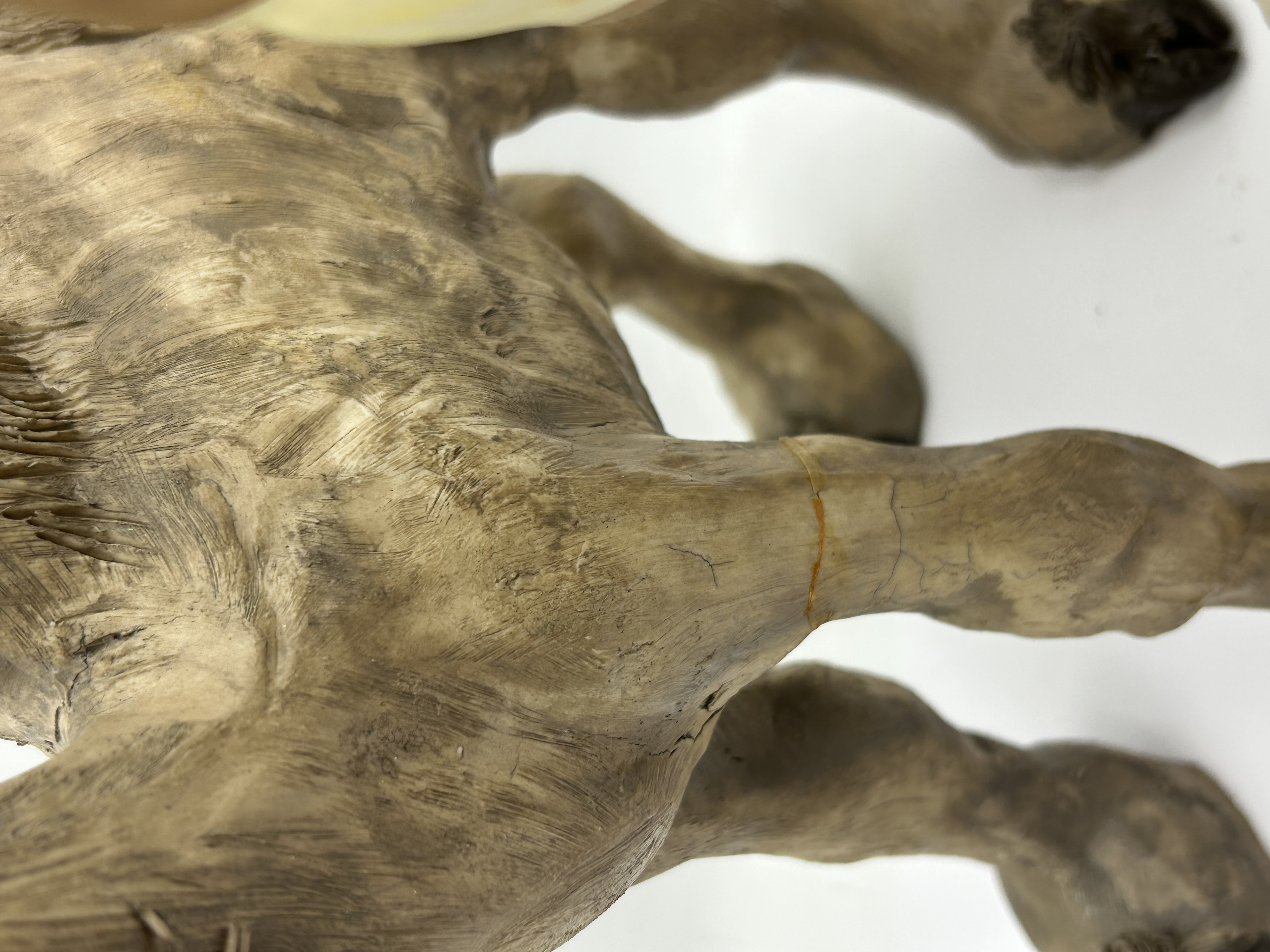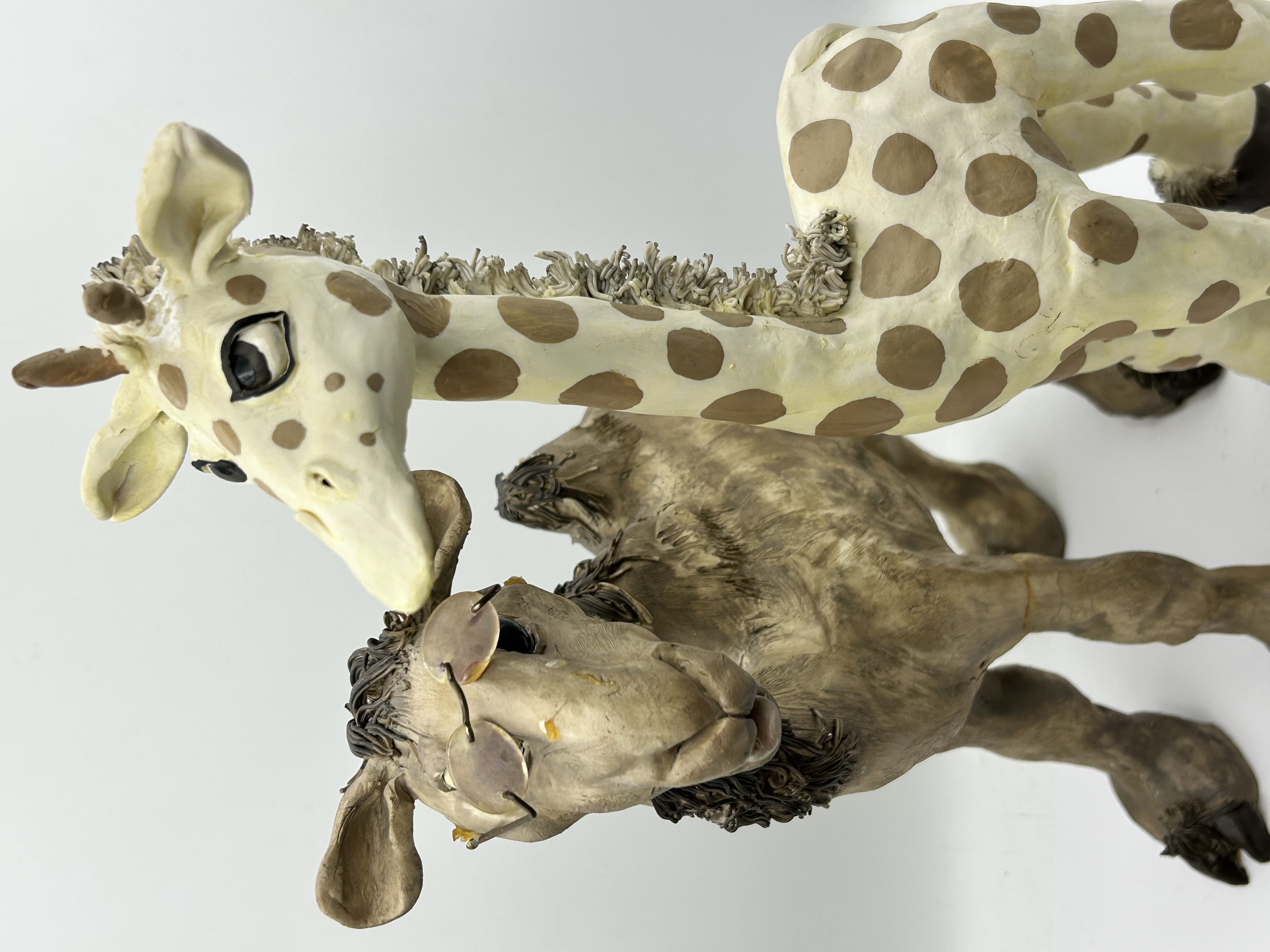 Two contemporary animal sculptures crafted from a painted composite or resin material. The group includes a giraffe with a cream-colored body and brown spots, alongside a second animal figure featuring wire-rimmed glasses. Both pieces exhibit detailed texturing, specifically in the stylized, ruffled manes and fur-like details on the legs. The figures are rendered in a whimsical style with expressive facial features. No maker marks or signatures are visible.
