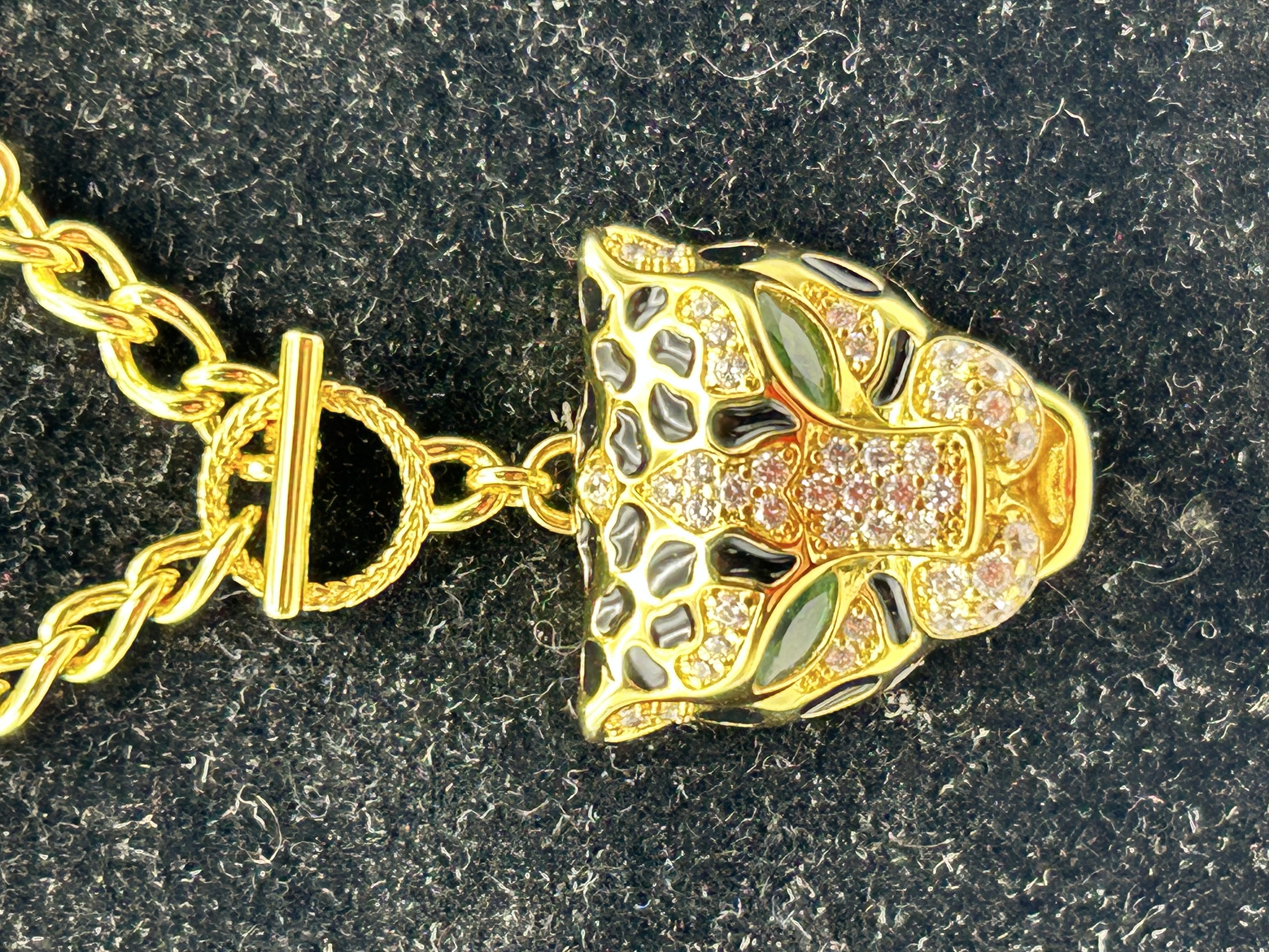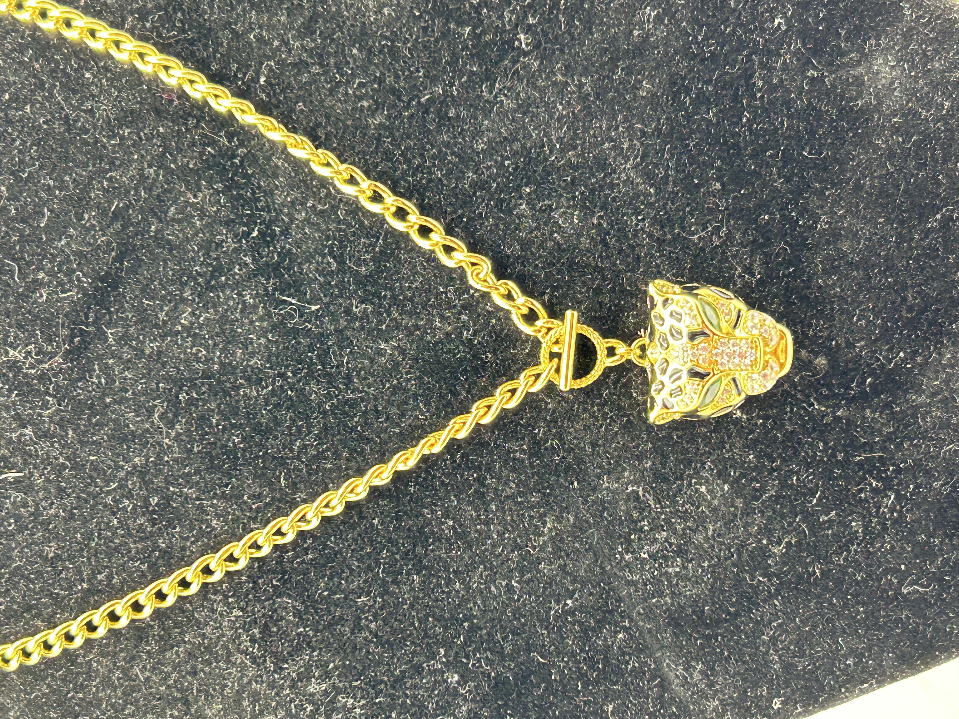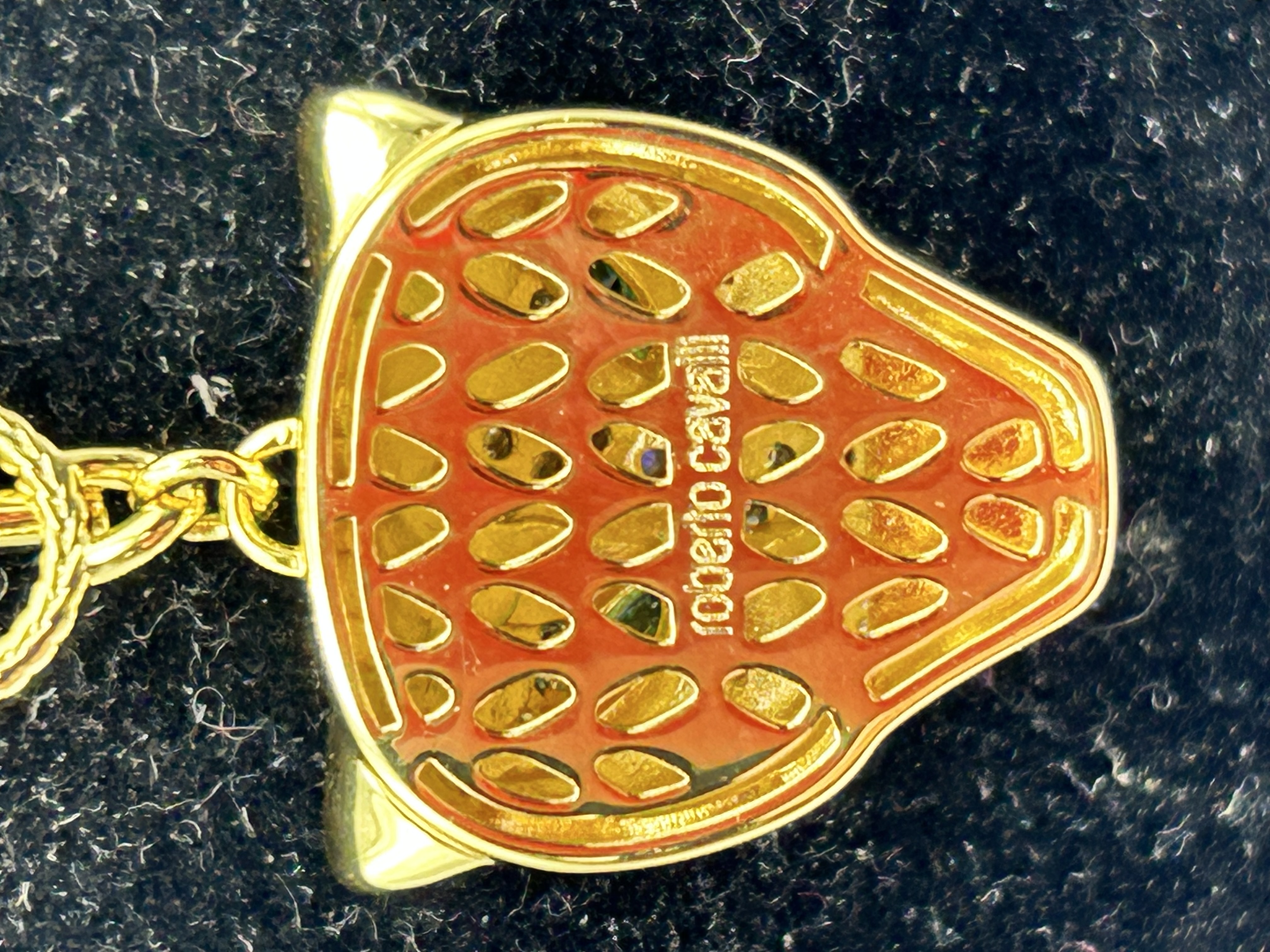 A Roberto Cavalli gold-tone costume jewelry necklace featuring a stylized leopard head pendant. The pendant is decorated with black enamel spots, green-toned navette-shaped eyes, and sections of pave-set clear crystals. The reverse of the pendant is finished with orange-toned enamel and bears the stamped mark roberto cavalli. The piece is suspended from a thick-link gold-tone chain and is secured with a decorative front-facing toggle clasp featuring a rope-texture detail on the ring.