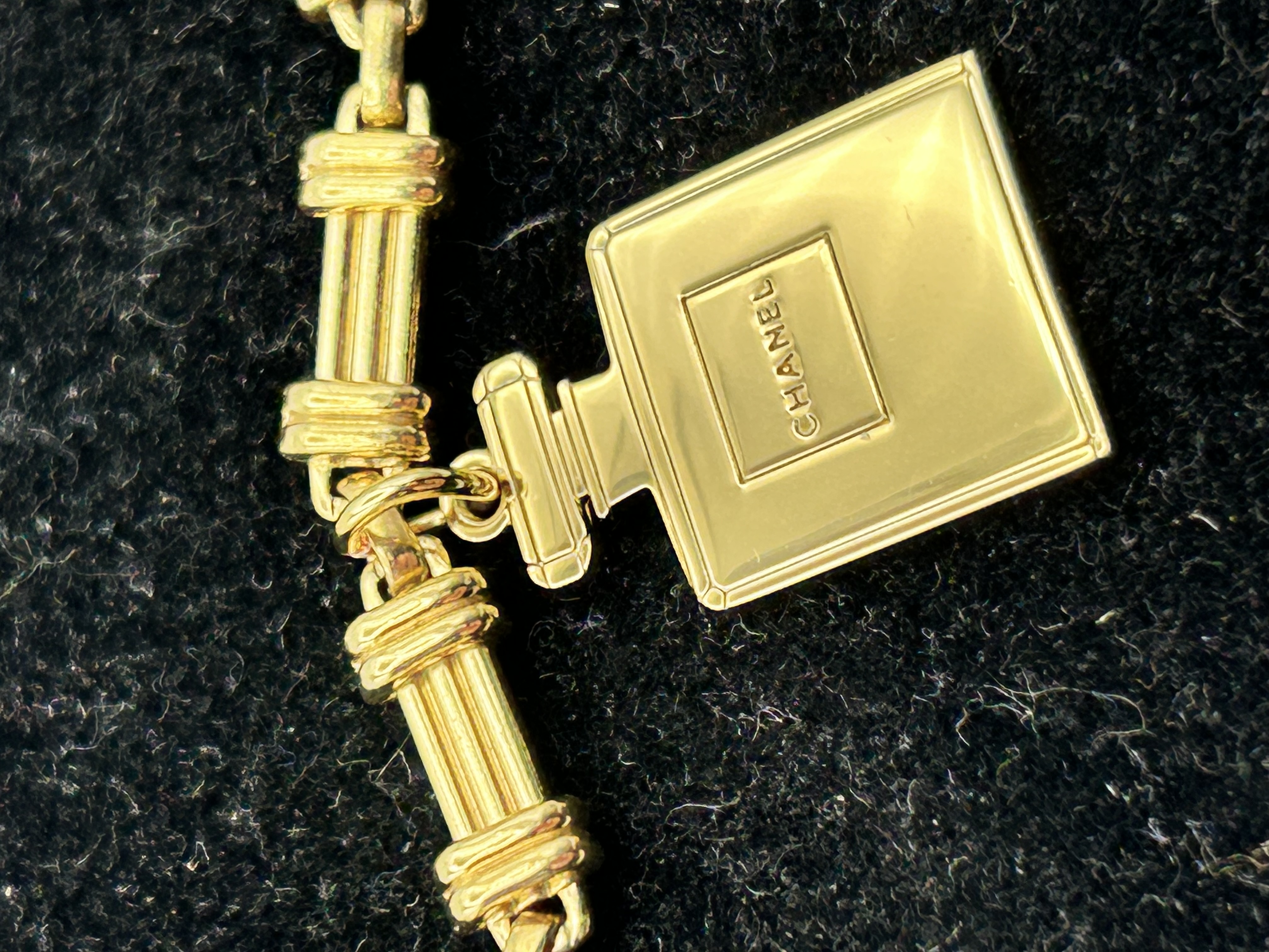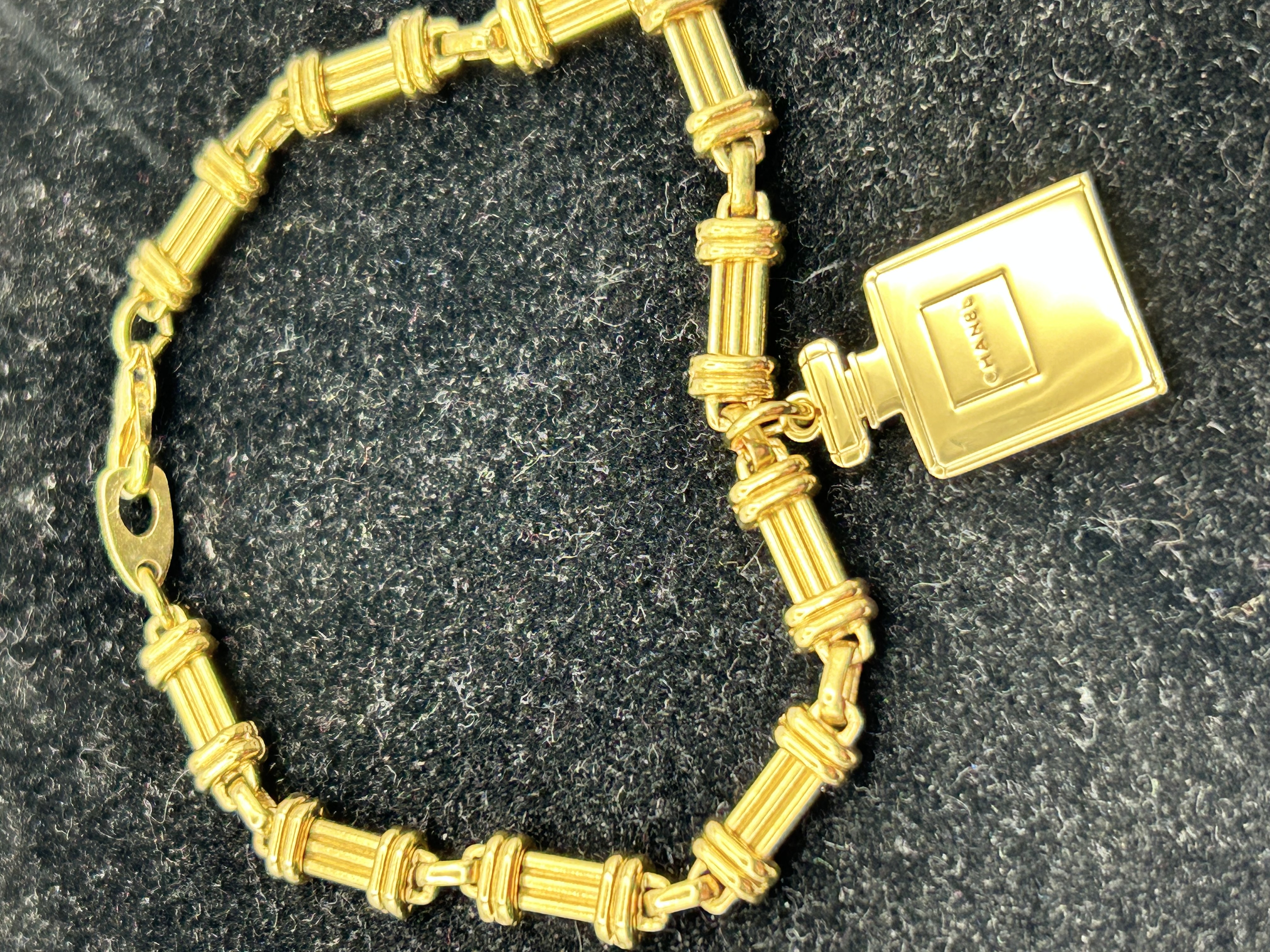 A Chanel gold-tone metal costume jewelry bracelet. The piece features a chain of ridged, cylindrical links. A pendant charm in the form of a perfume bottle is attached to the chain, embossed with the text CHANEL on the front face. The bracelet is secured with a lobster claw clasp and a flat, oval jump ring.